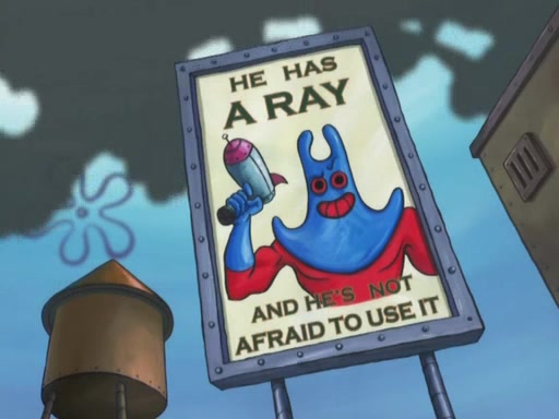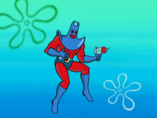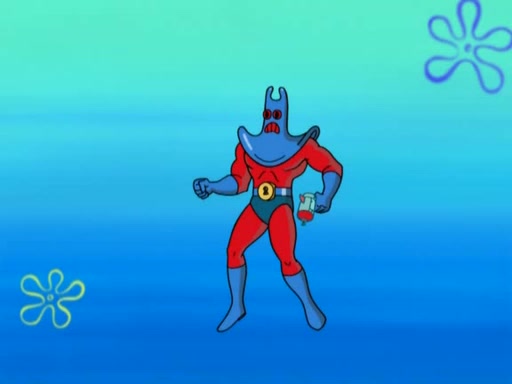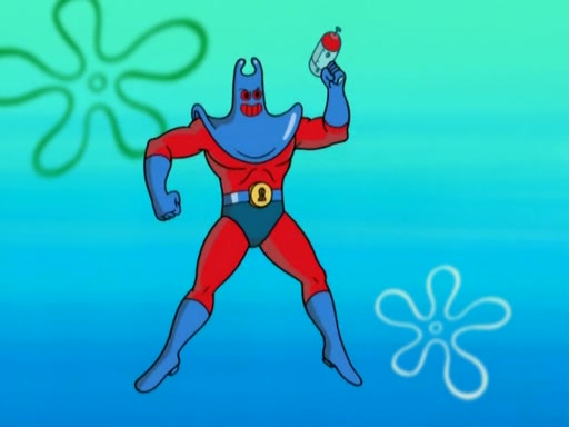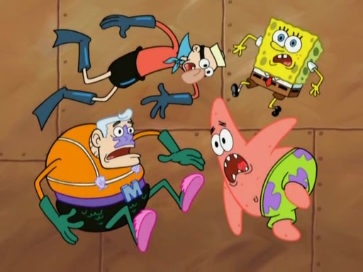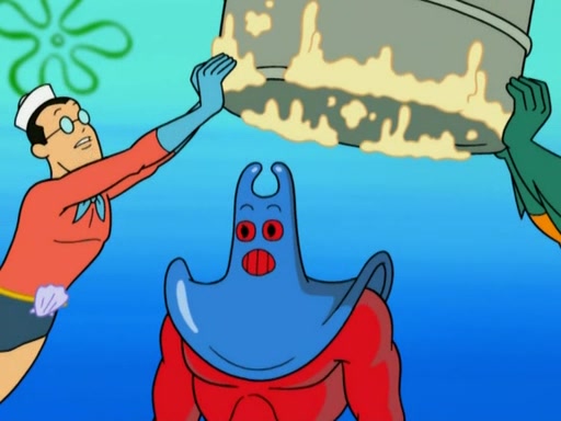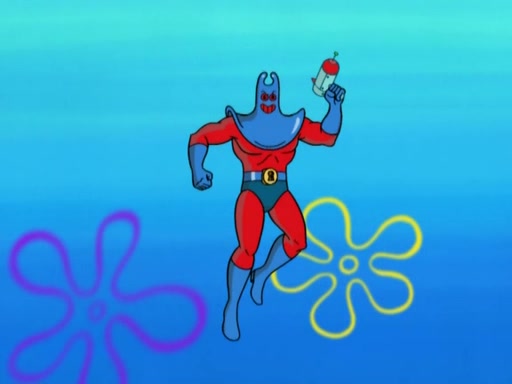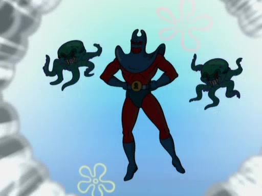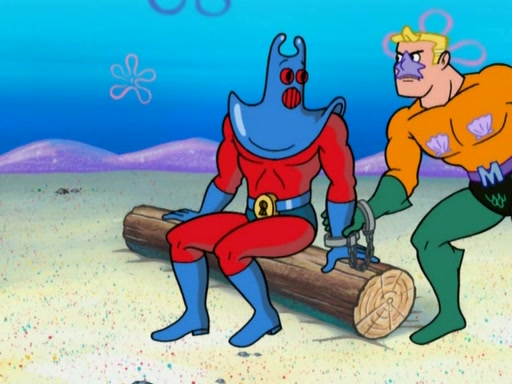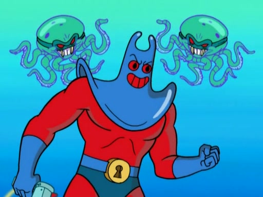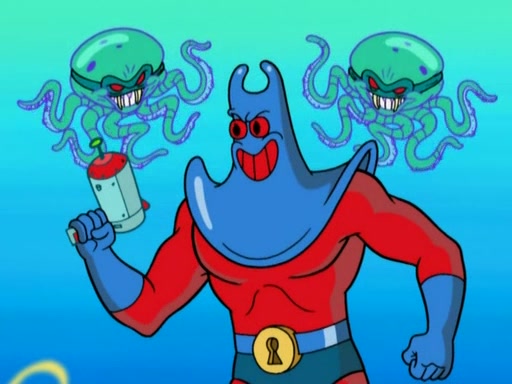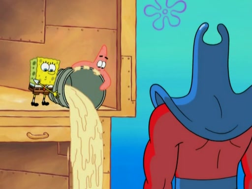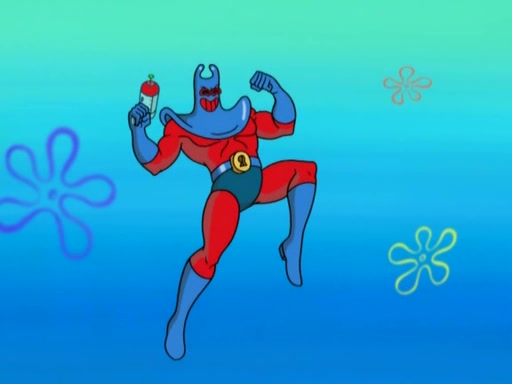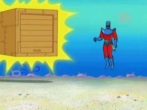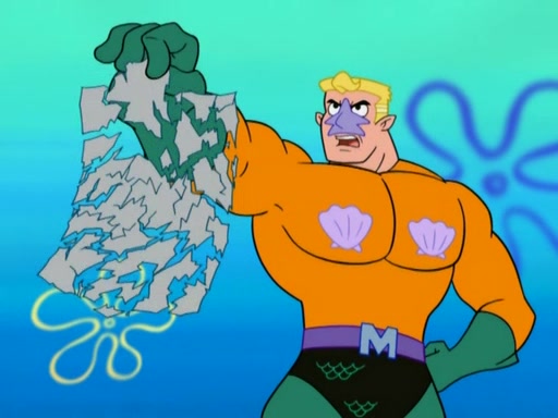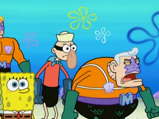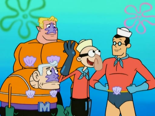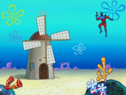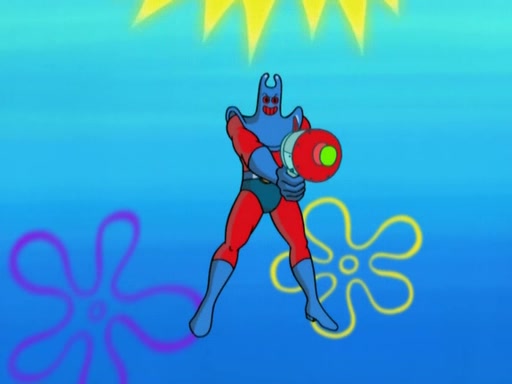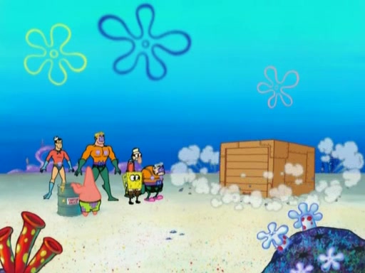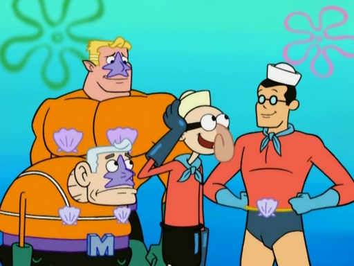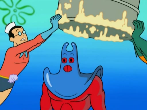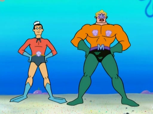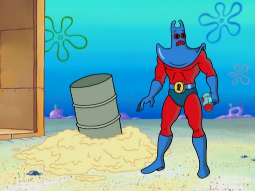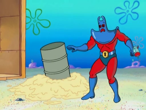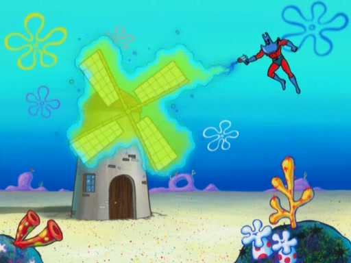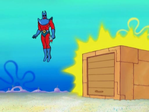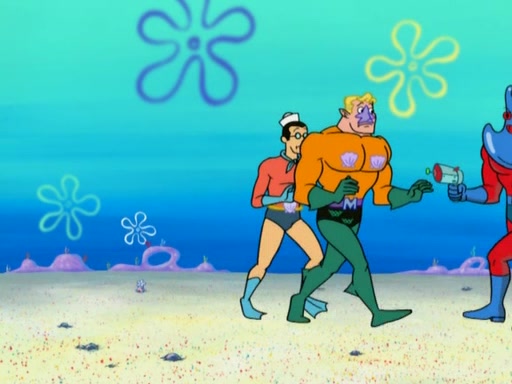 Another one pops to Man Ray's left with Mermaid Man and Barnacle Boy leaping out of it exclaiming, "Up, up and away!" They both fall headfirst into the ground. Another one appears above of the previous warehouse with the superheroes. SpongeBob and Patrick appear and throw a batch of tartar sauce over the fallen superheroes from the previous warehouse.