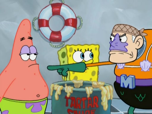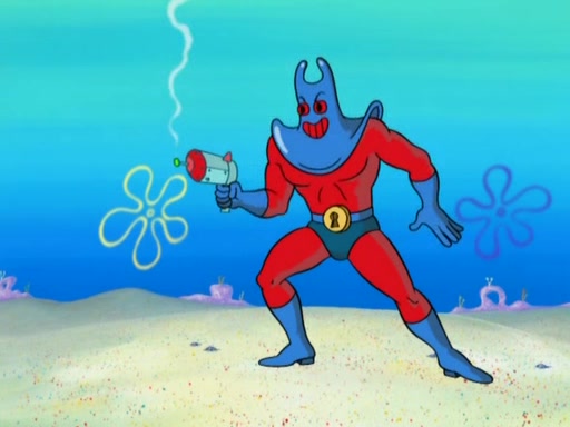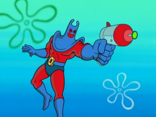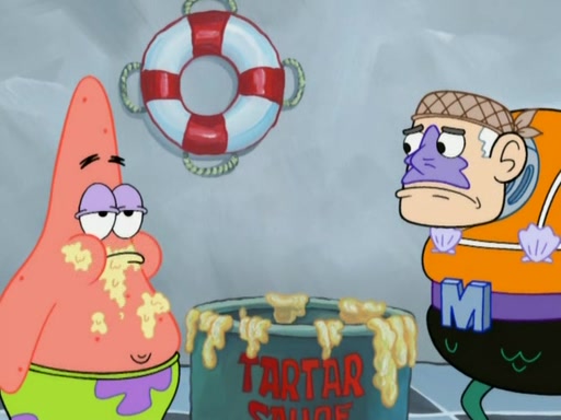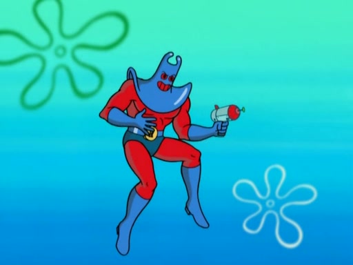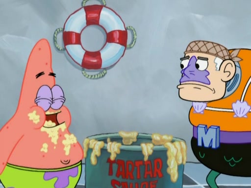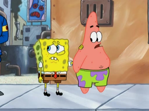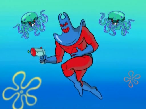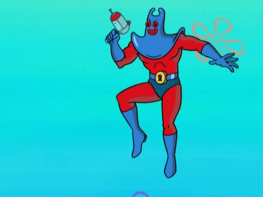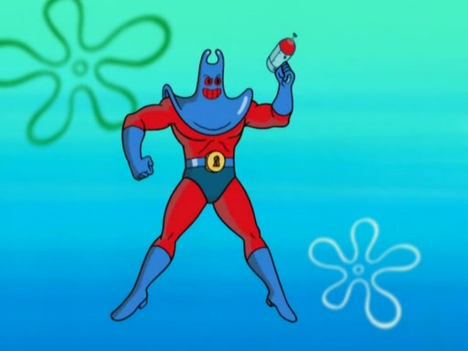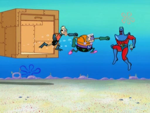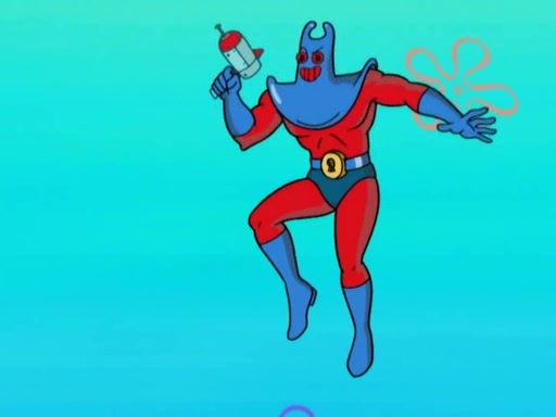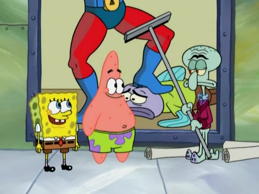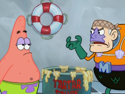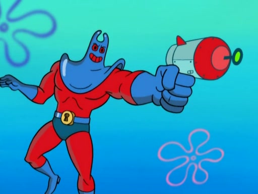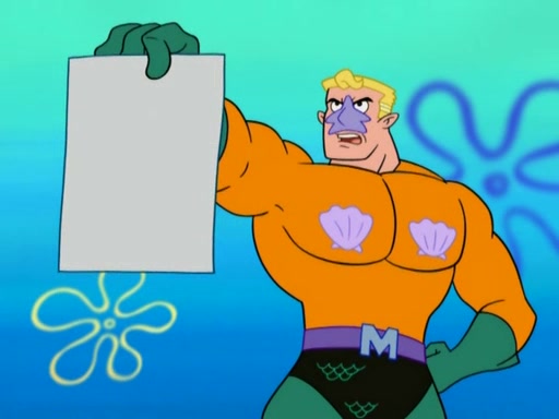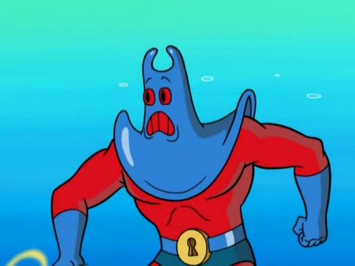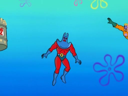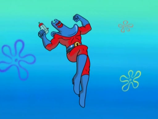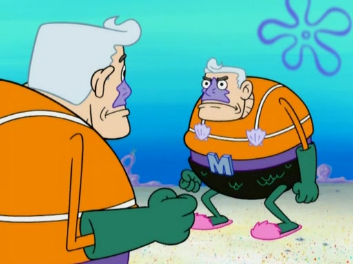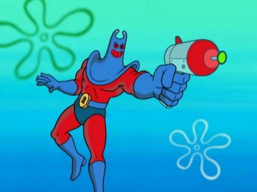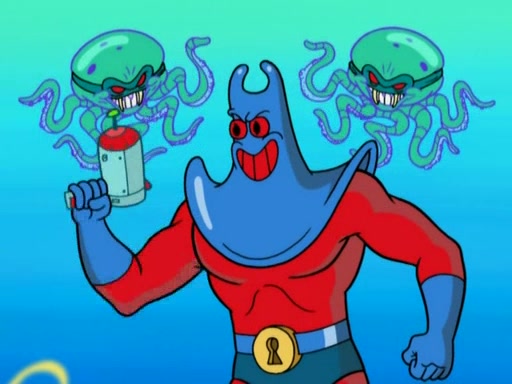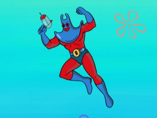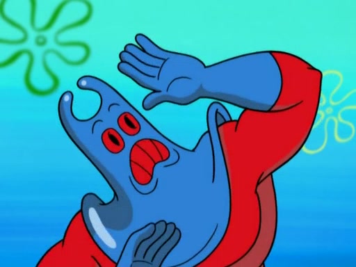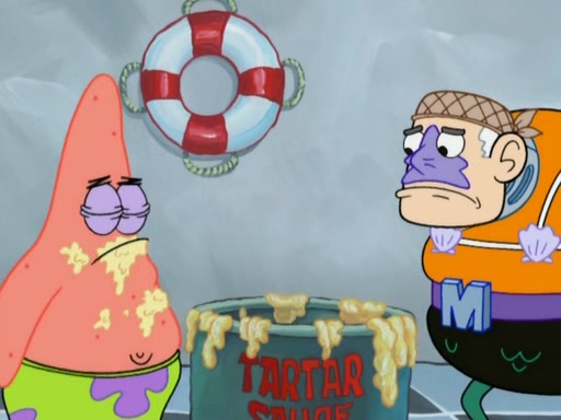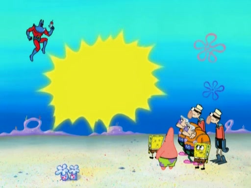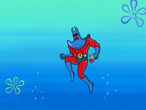 Another one pops to Man Ray's left with Mermaid Man and Barnacle Boy leaping out of it exclaiming, "Up, up and away!" They both fall headfirst into the ground. Another one appears above of the previous warehouse with the superheroes. SpongeBob and Patrick appear and throw a batch of tartar sauce over the fallen superheroes from the previous warehouse.