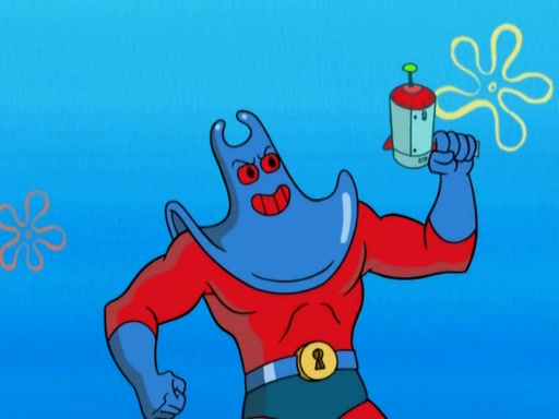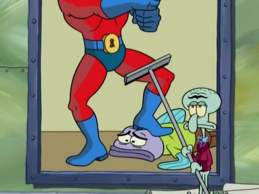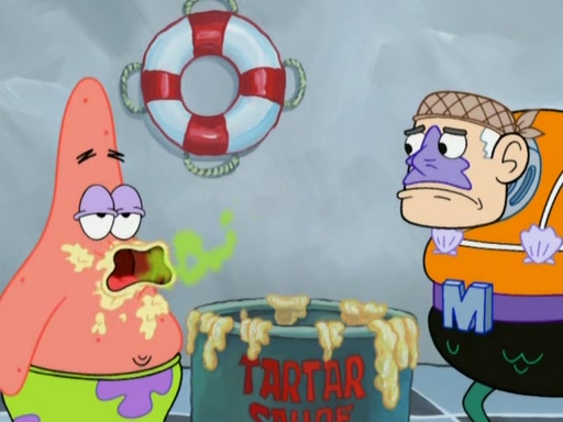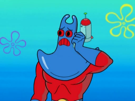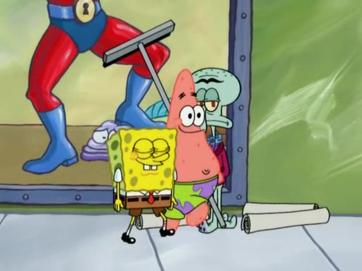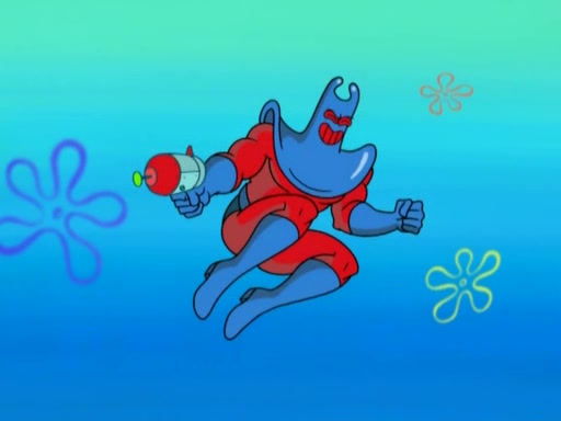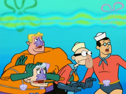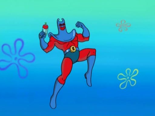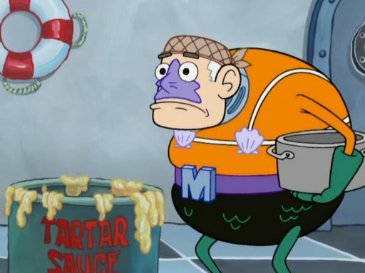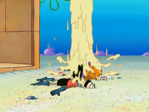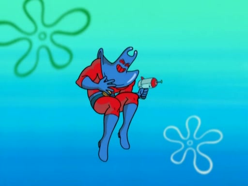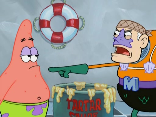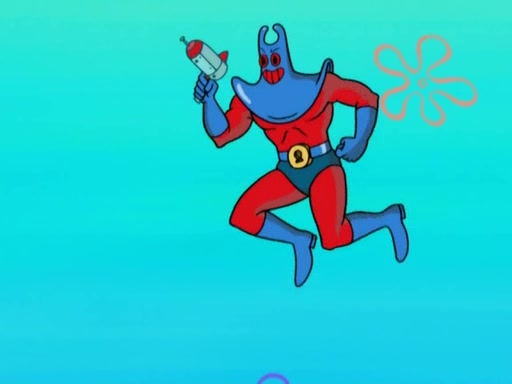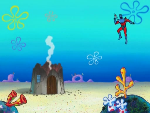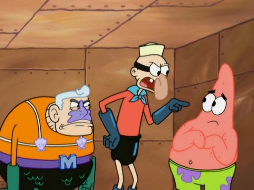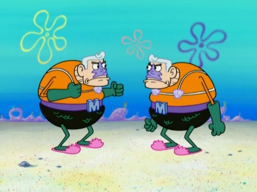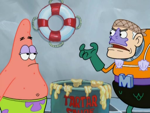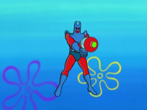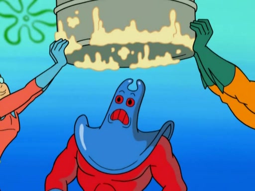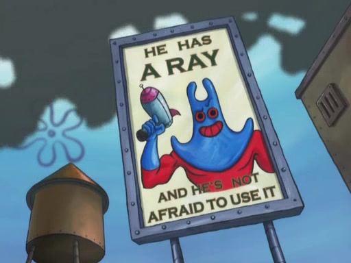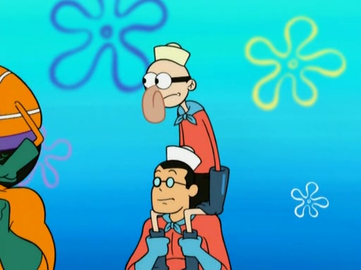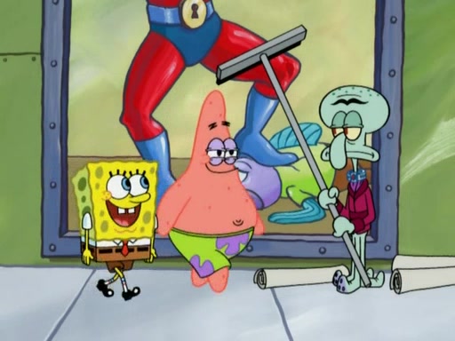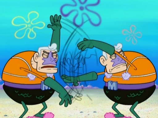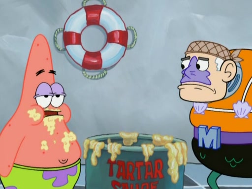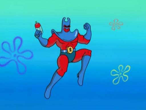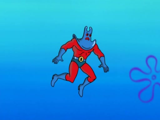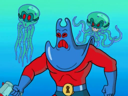 Another one pops to Man Ray's left with Mermaid Man and Barnacle Boy leaping out of it exclaiming, "Up, up and away!" They both fall headfirst into the ground. Another one appears above of the previous warehouse with the superheroes. SpongeBob and Patrick appear and throw a batch of tartar sauce over the fallen superheroes from the previous warehouse.