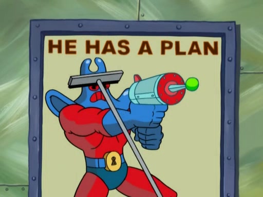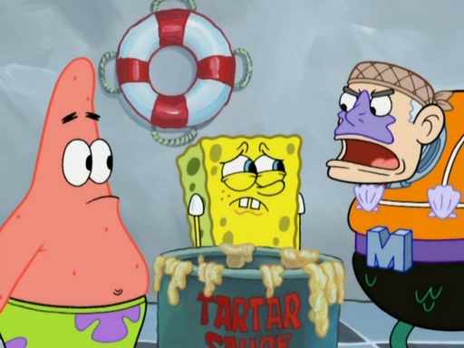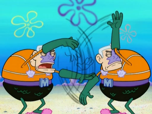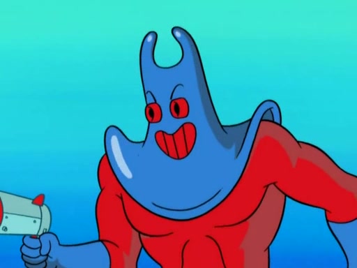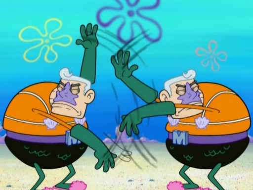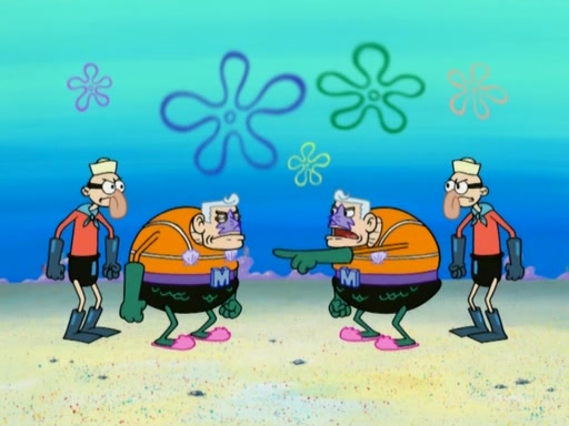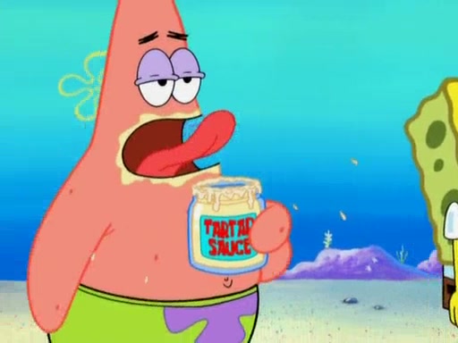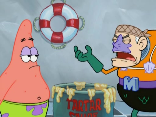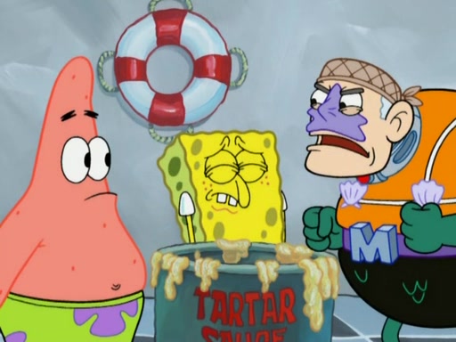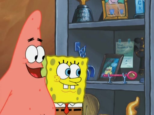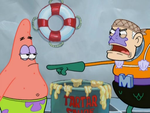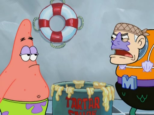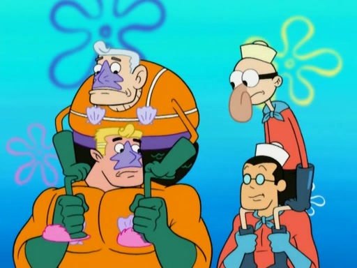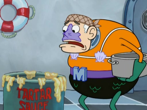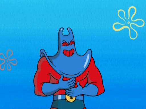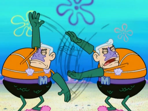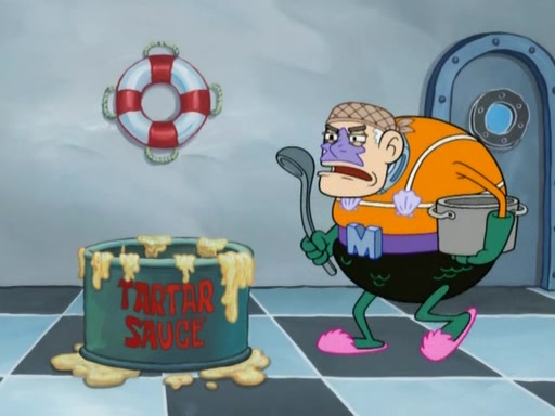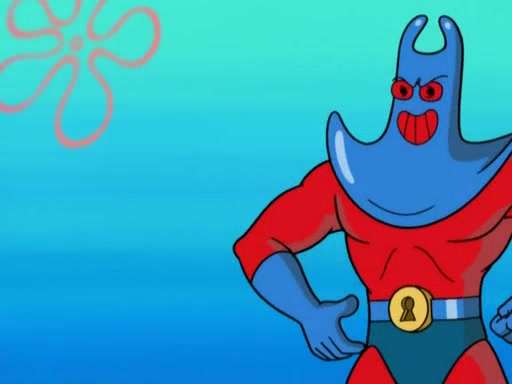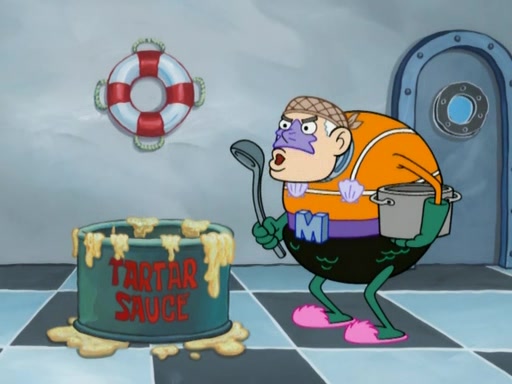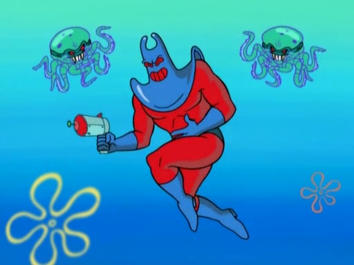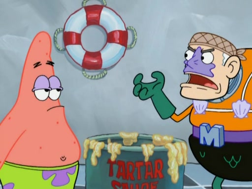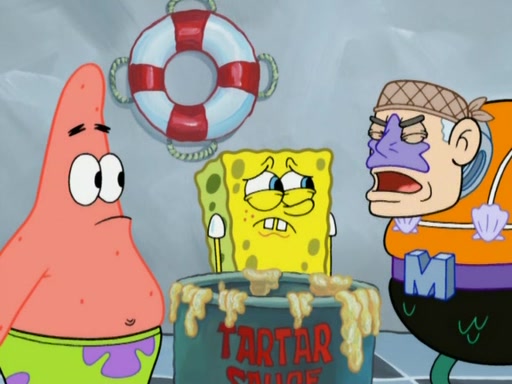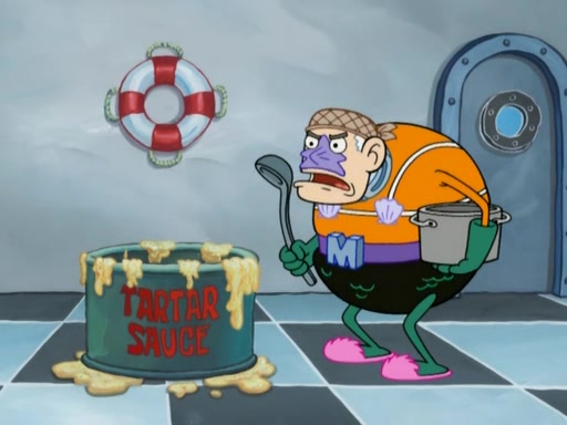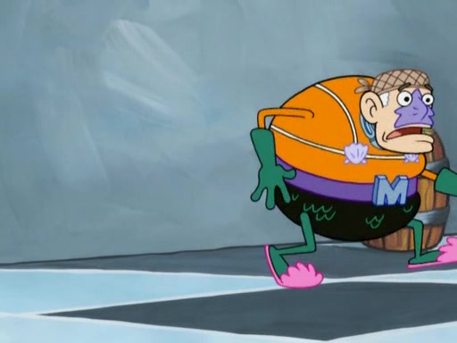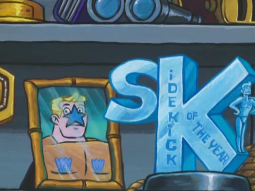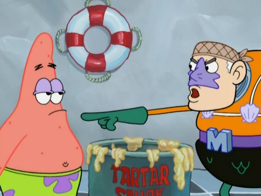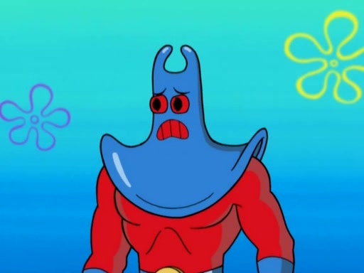 Another one pops to Man Ray's left with Mermaid Man and Barnacle Boy leaping out of it exclaiming, "Up, up and away!" They both fall headfirst into the ground. Another one appears above of the previous warehouse with the superheroes. SpongeBob and Patrick appear and throw a batch of tartar sauce over the fallen superheroes from the previous warehouse.