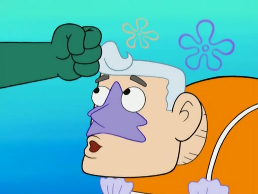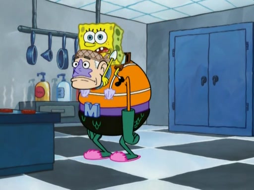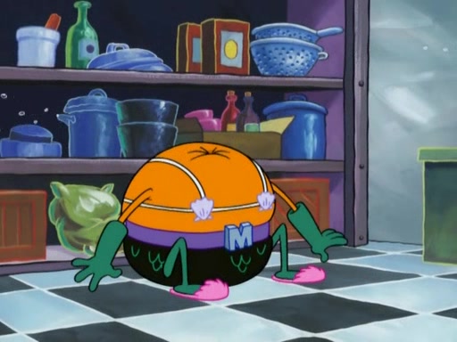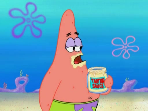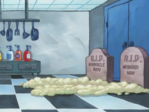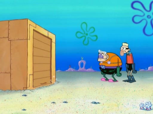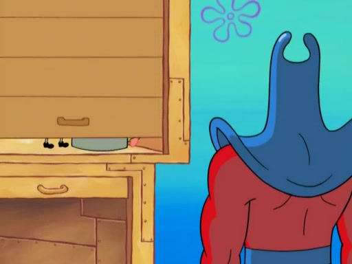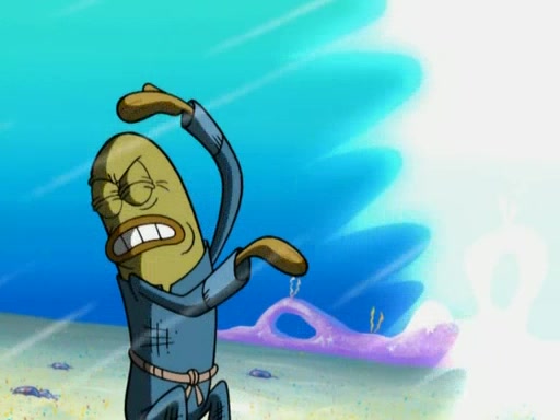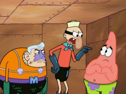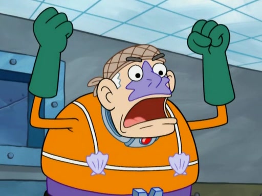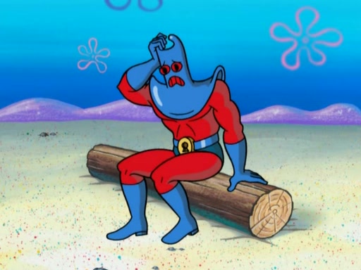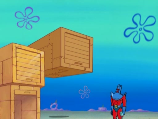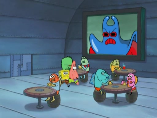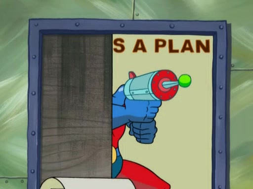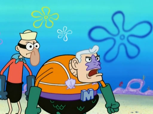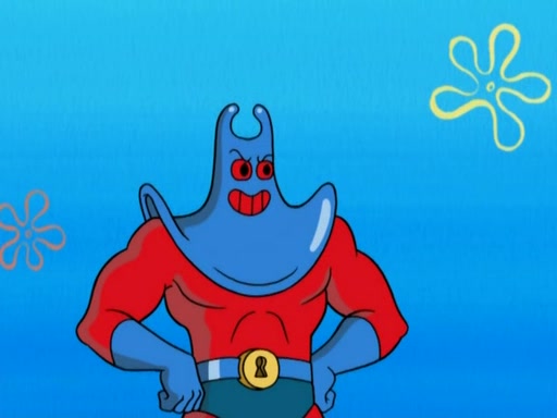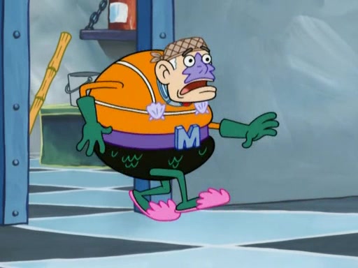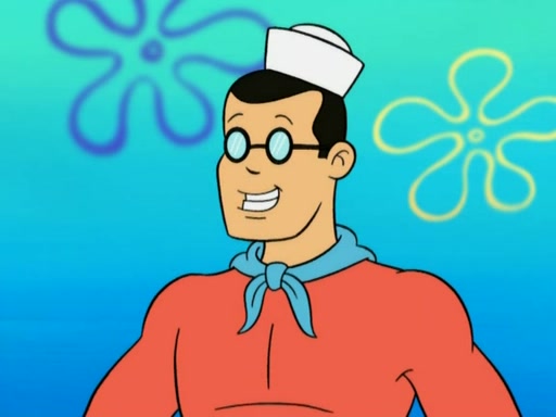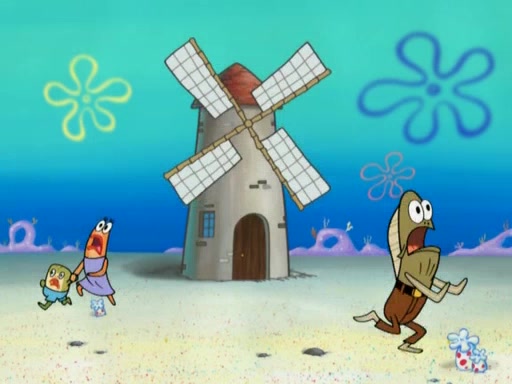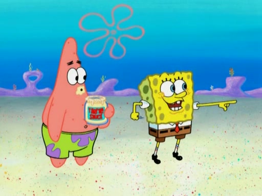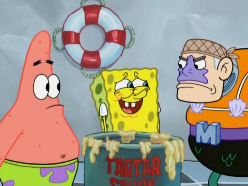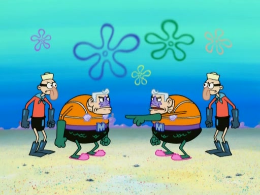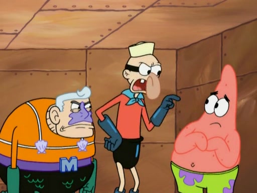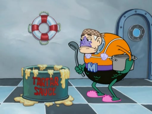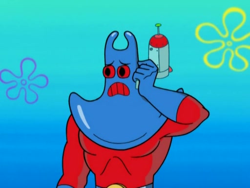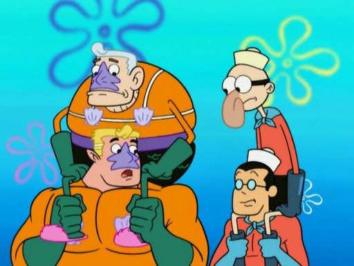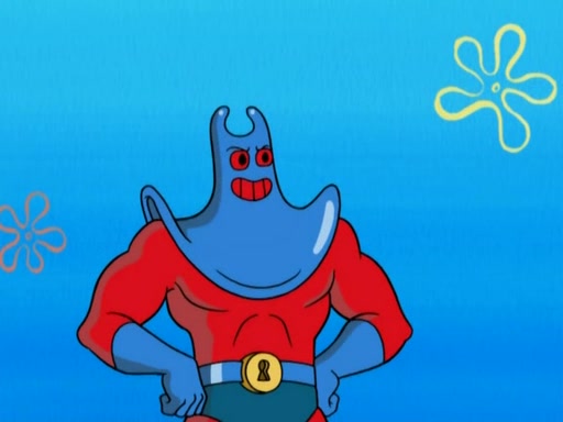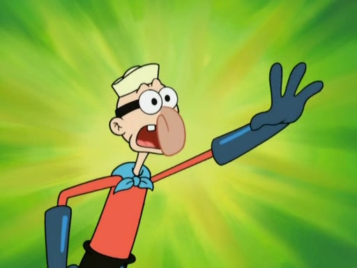 Another one pops to Man Ray's left with Mermaid Man and Barnacle Boy leaping out of it exclaiming, "Up, up and away!" They both fall headfirst into the ground. Another one appears above of the previous warehouse with the superheroes. SpongeBob and Patrick appear and throw a batch of tartar sauce over the fallen superheroes from the previous warehouse.
