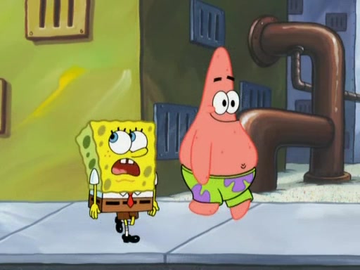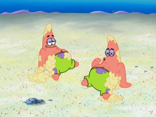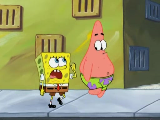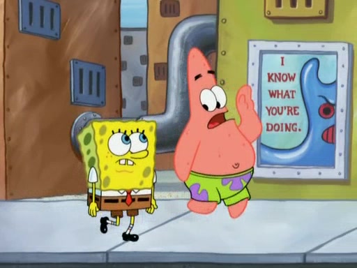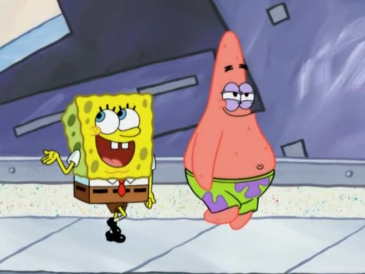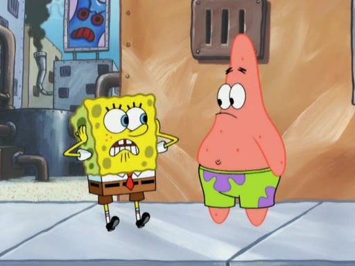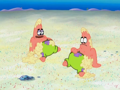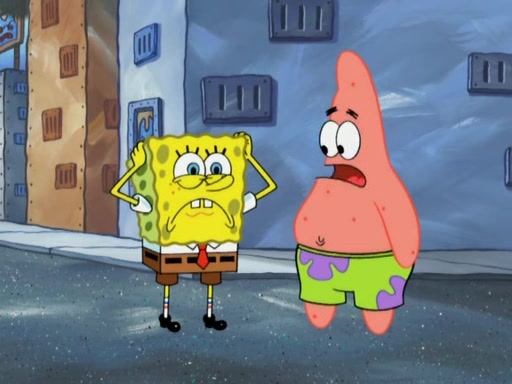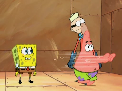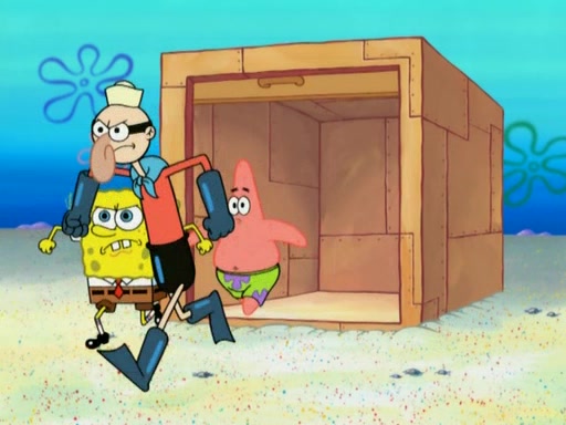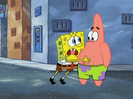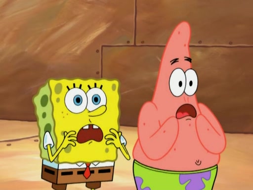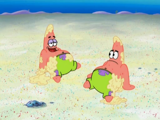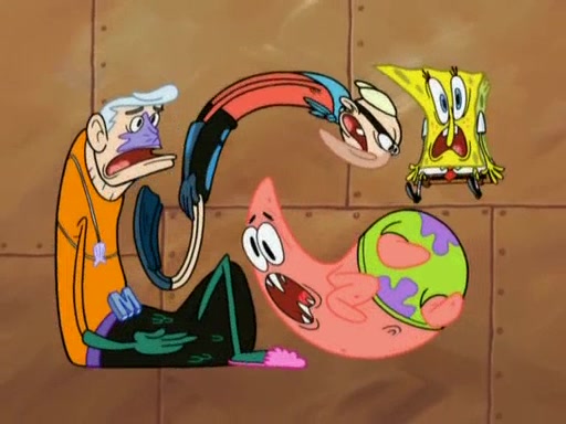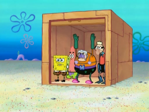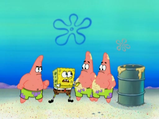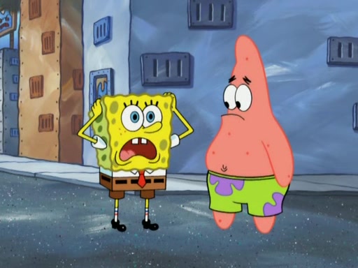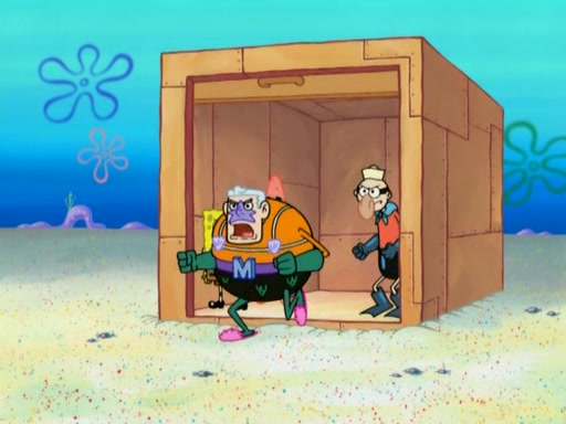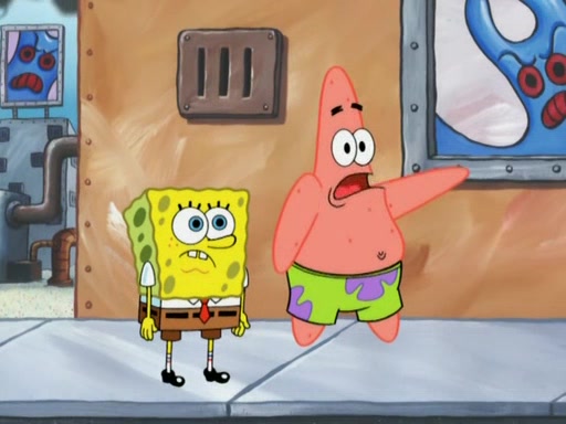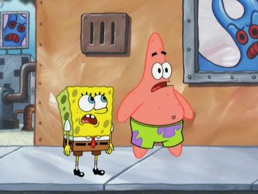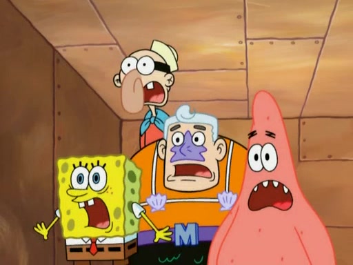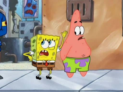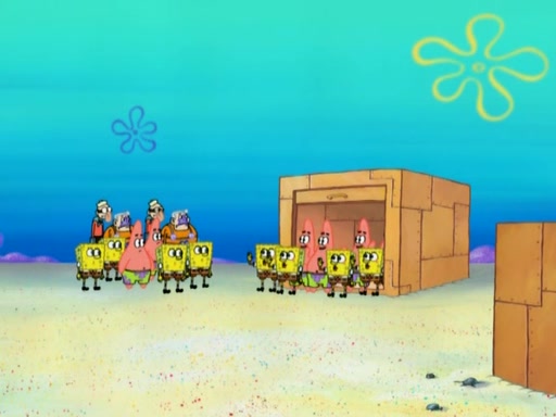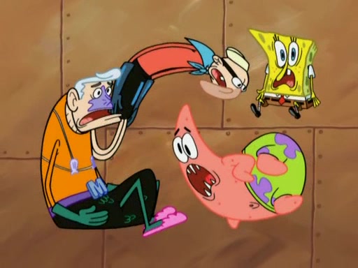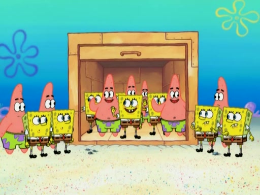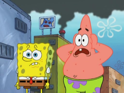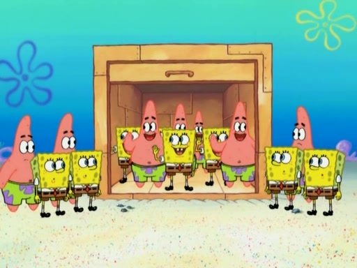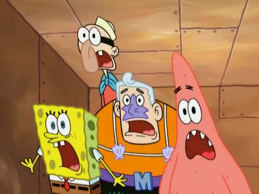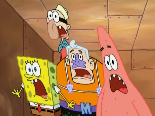 SpongeBob and Patrick from a different time period emerge from the warehouse screaming "Patrick, don't eat the tartar sauce!" Another warehouse appears above of Man Ray and out fall SpongeBob and Patrick. Yet another one appears with SpongeBob saying to Patrick "I told you we had to go back further!"