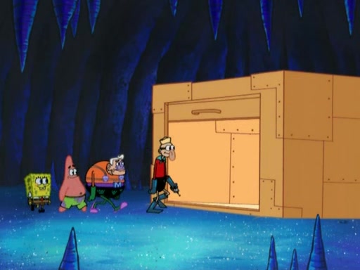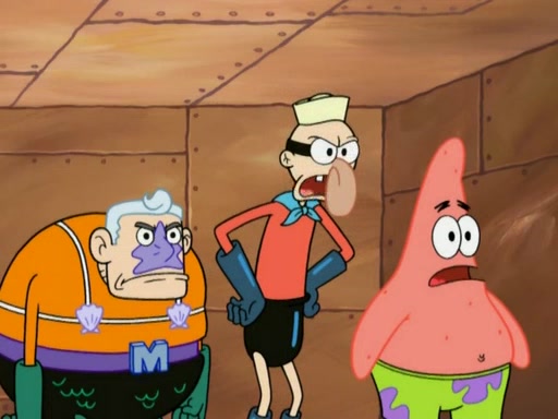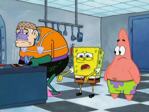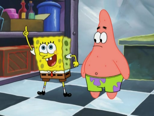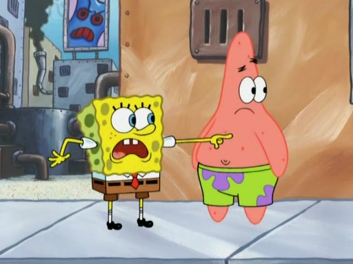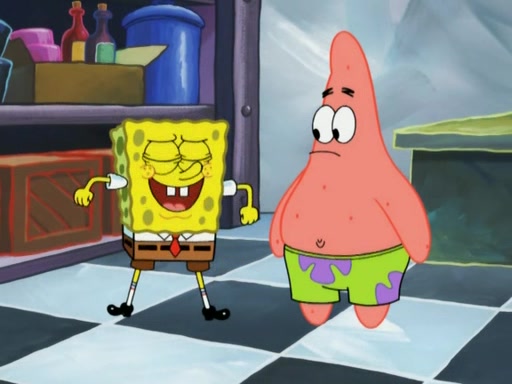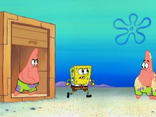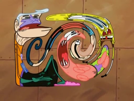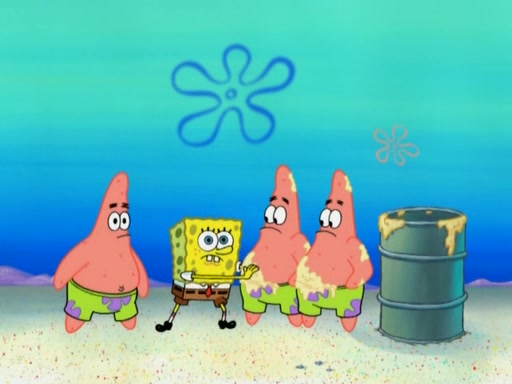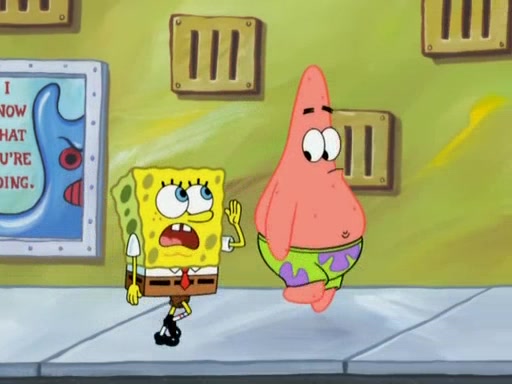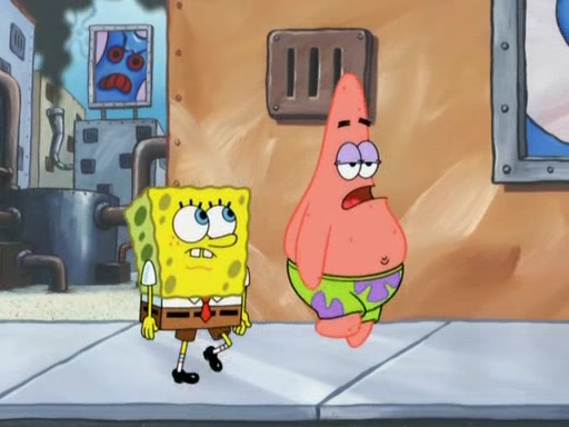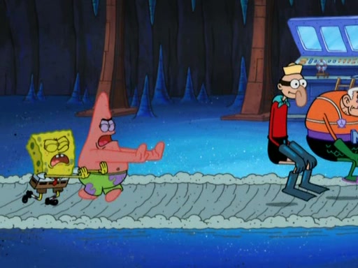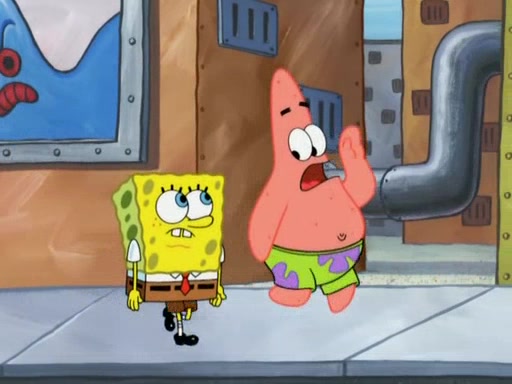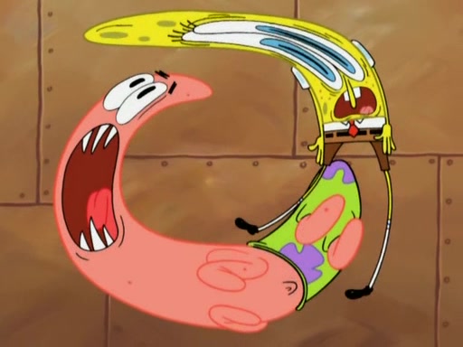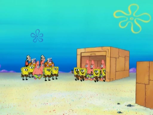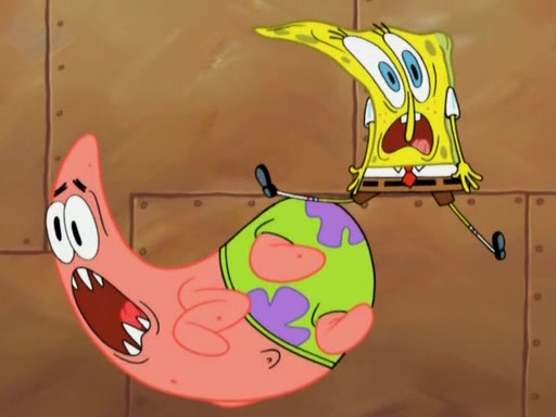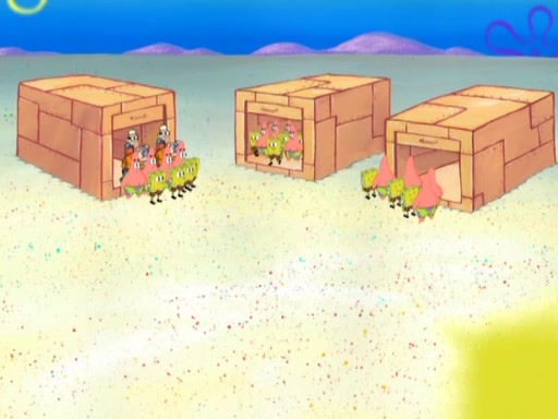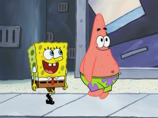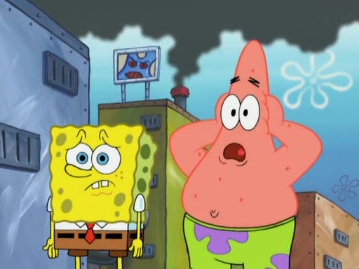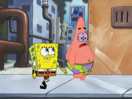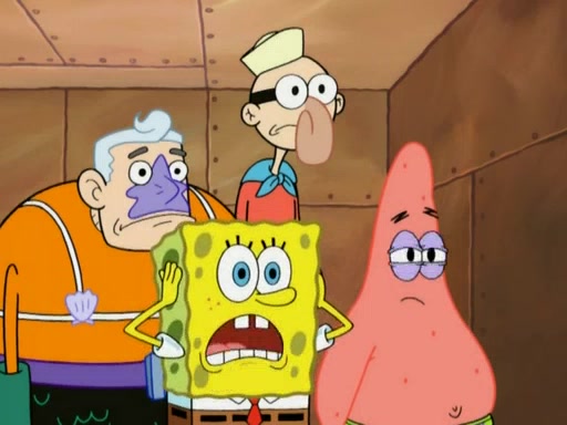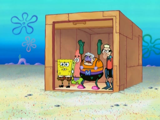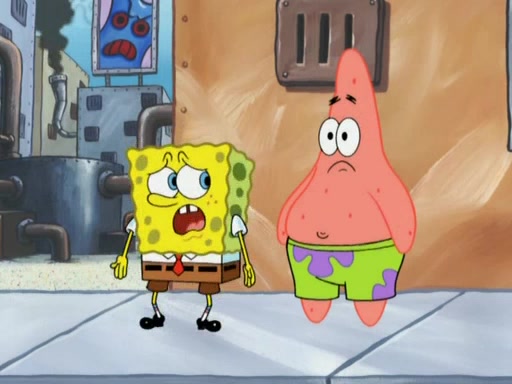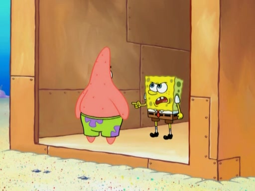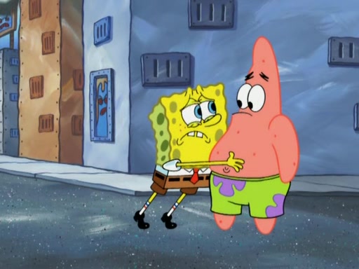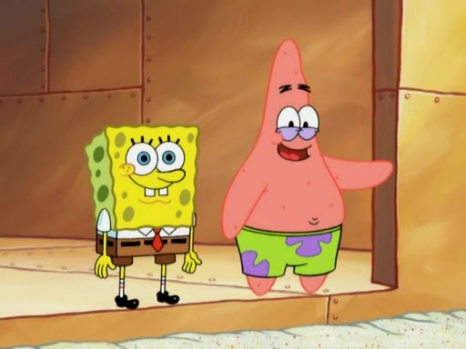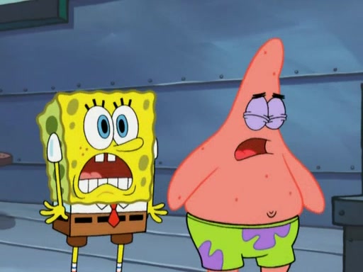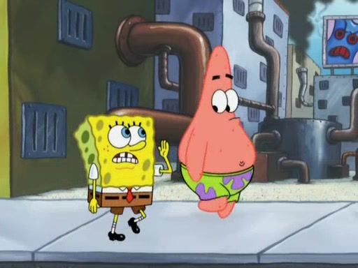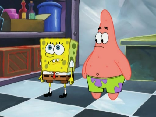 SpongeBob and Patrick from a different time period emerge from the warehouse screaming "Patrick, don't eat the tartar sauce!" Another warehouse appears above of Man Ray and out fall SpongeBob and Patrick. Yet another one appears with SpongeBob saying to Patrick "I told you we had to go back further!"