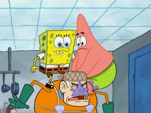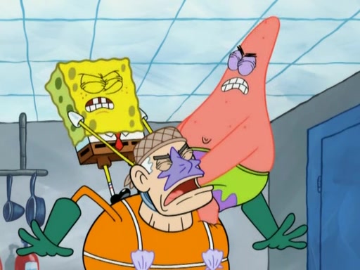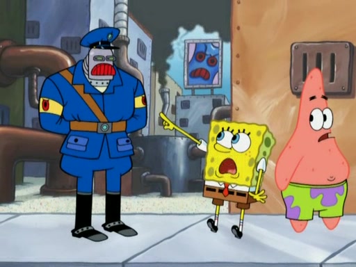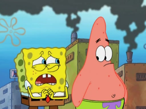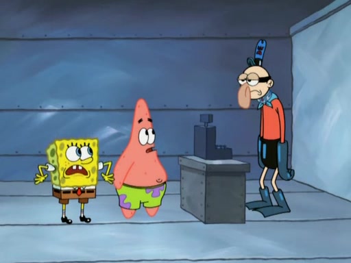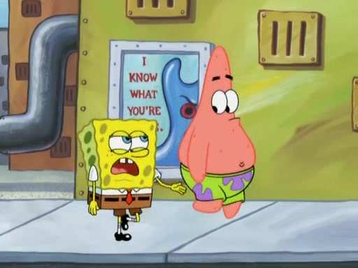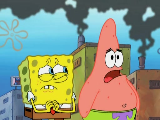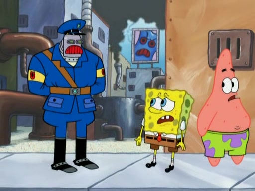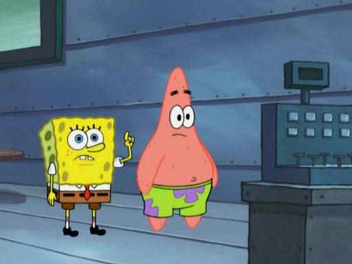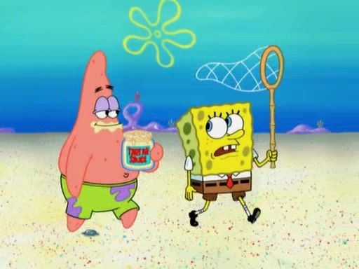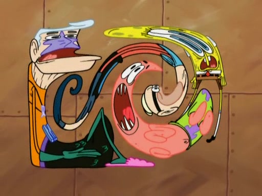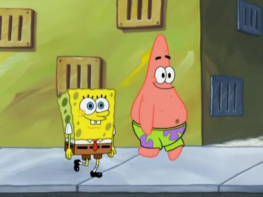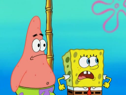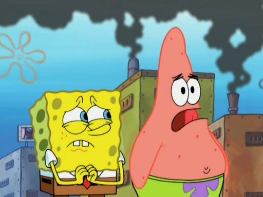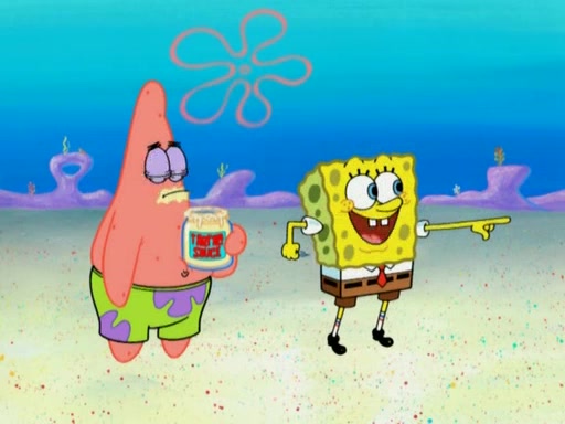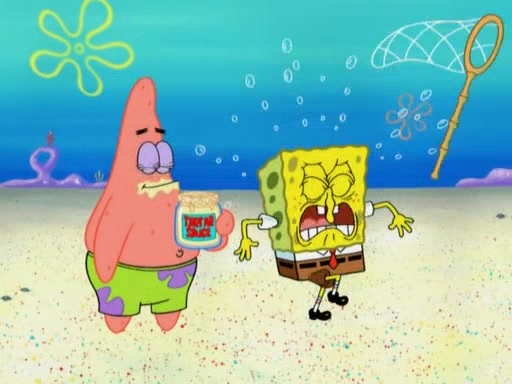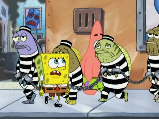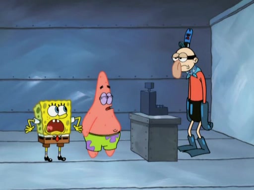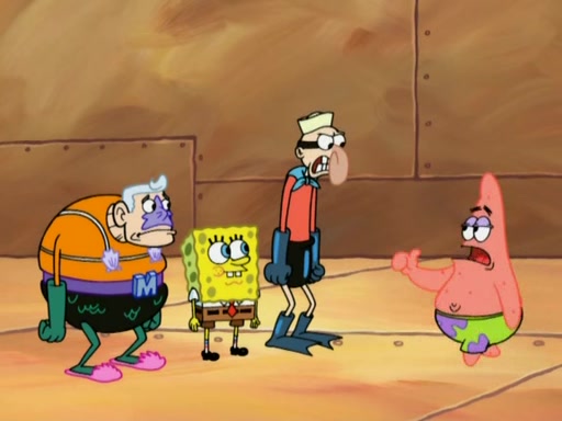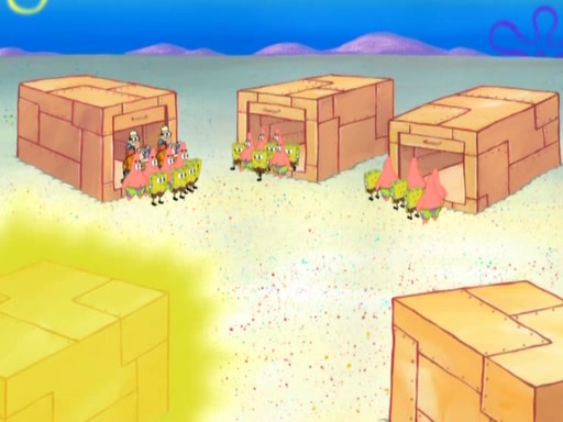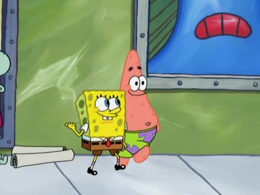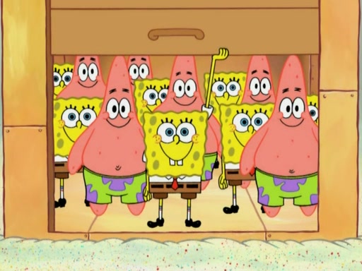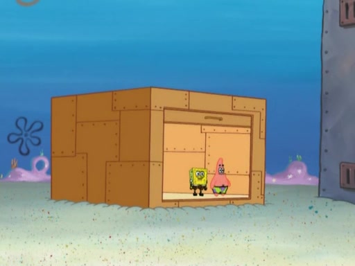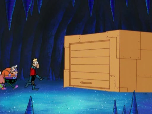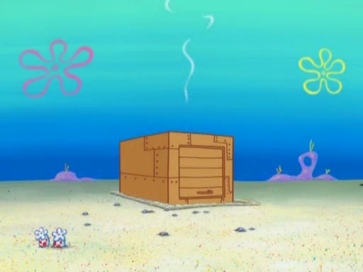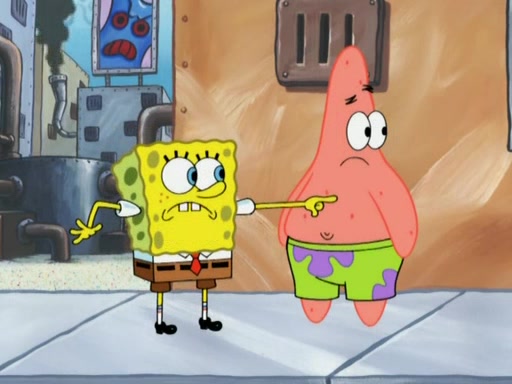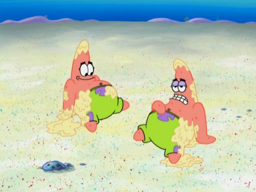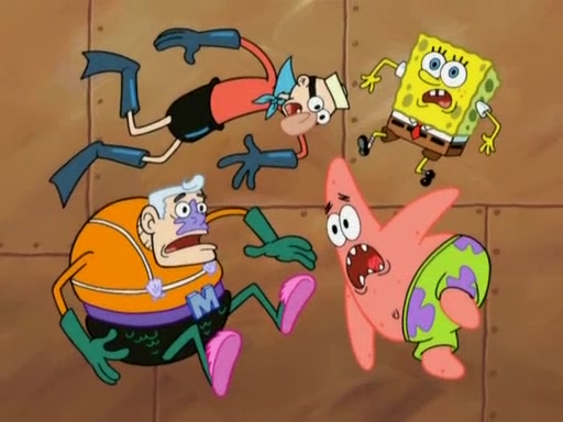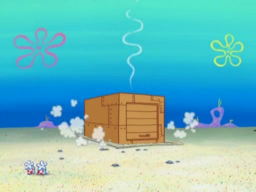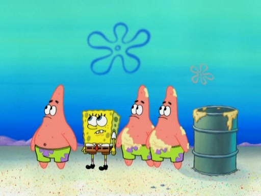 SpongeBob and Patrick from a different time period emerge from the warehouse screaming "Patrick, don't eat the tartar sauce!" Another warehouse appears above of Man Ray and out fall SpongeBob and Patrick. Yet another one appears with SpongeBob saying to Patrick "I told you we had to go back further!"