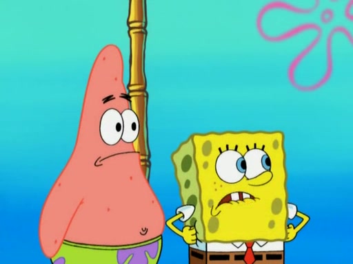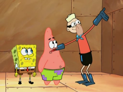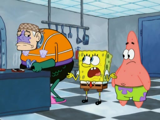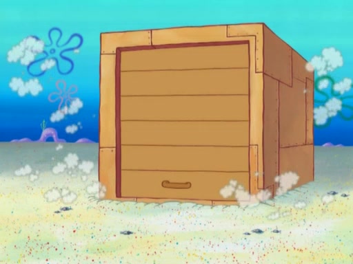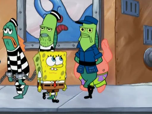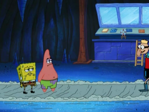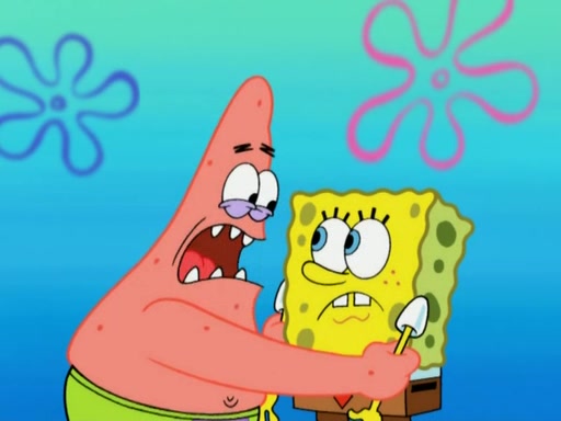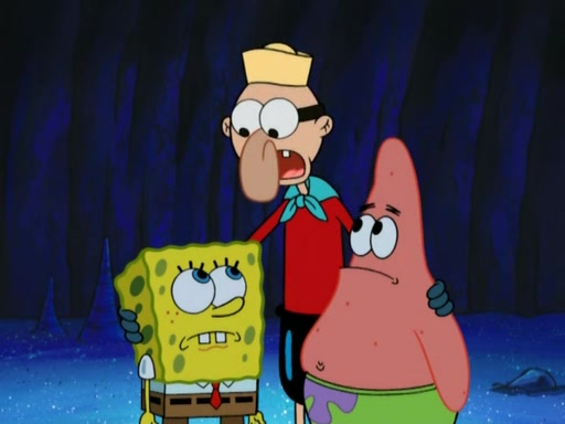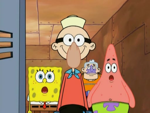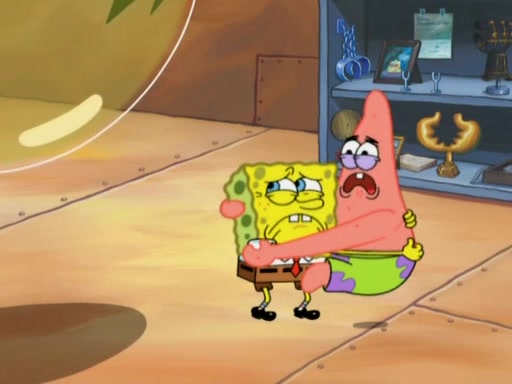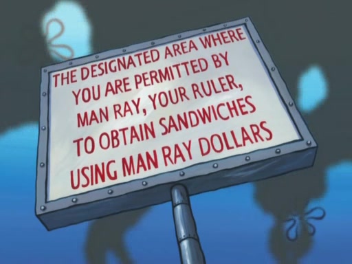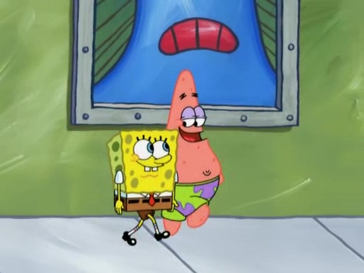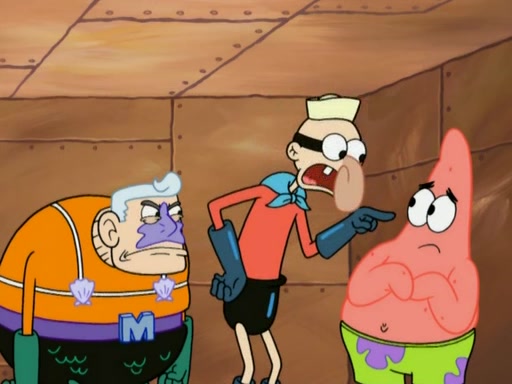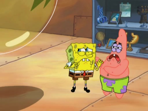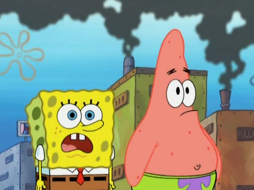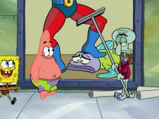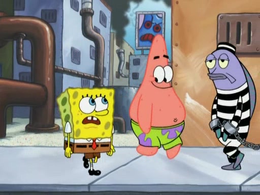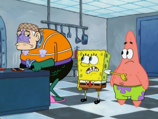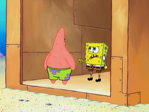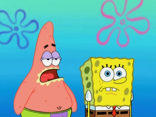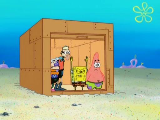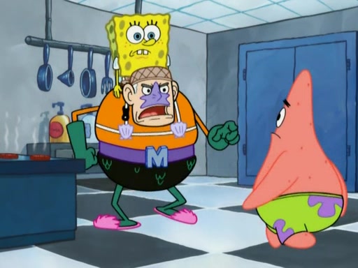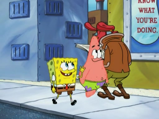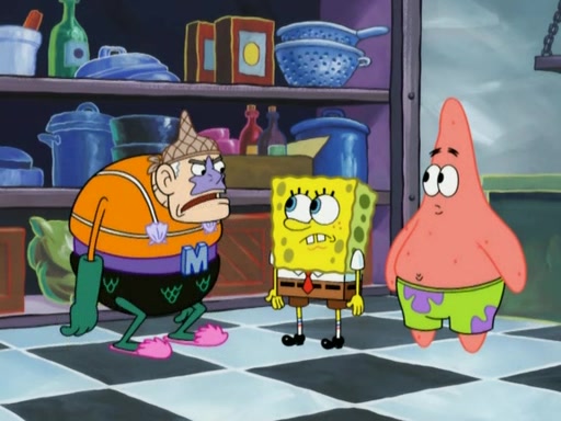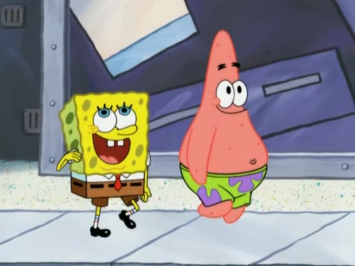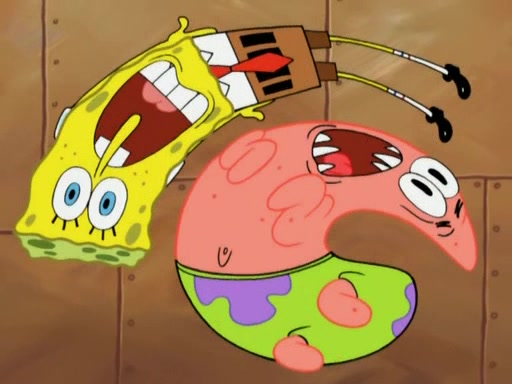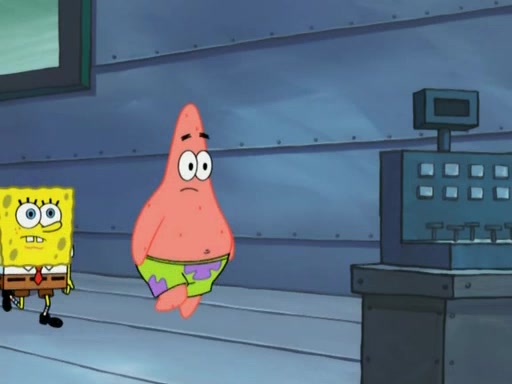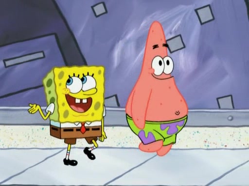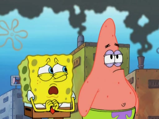 SpongeBob and Patrick from a different time period emerge from the warehouse screaming "Patrick, don't eat the tartar sauce!" Another warehouse appears above of Man Ray and out fall SpongeBob and Patrick. Yet another one appears with SpongeBob saying to Patrick "I told you we had to go back further!"