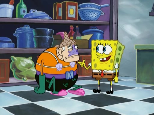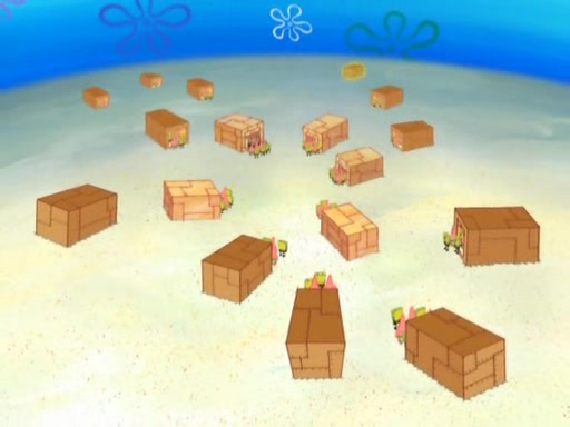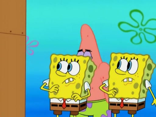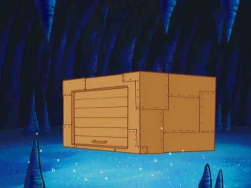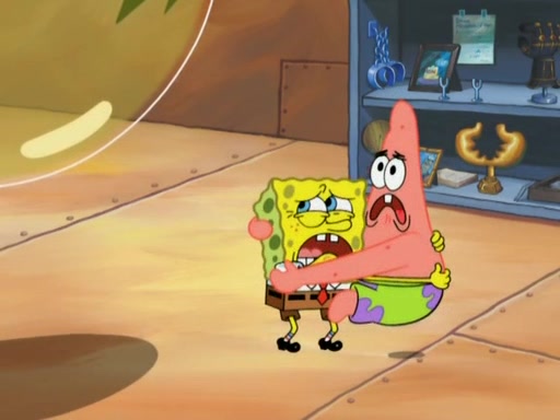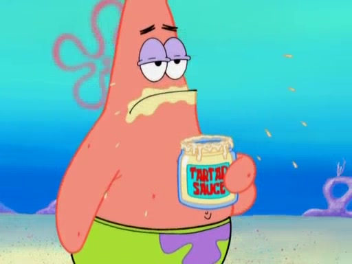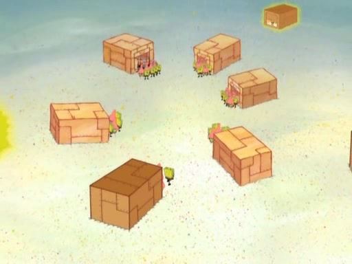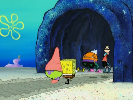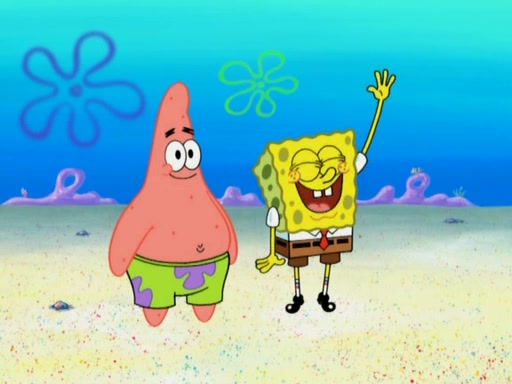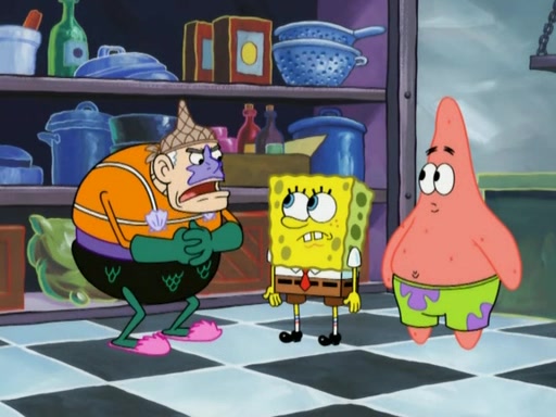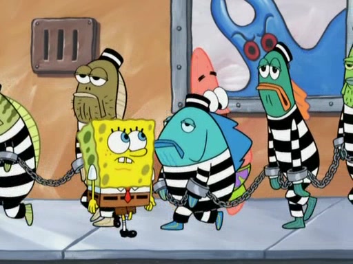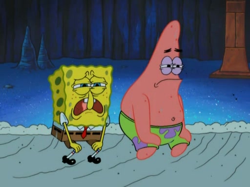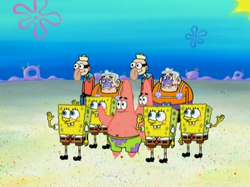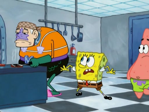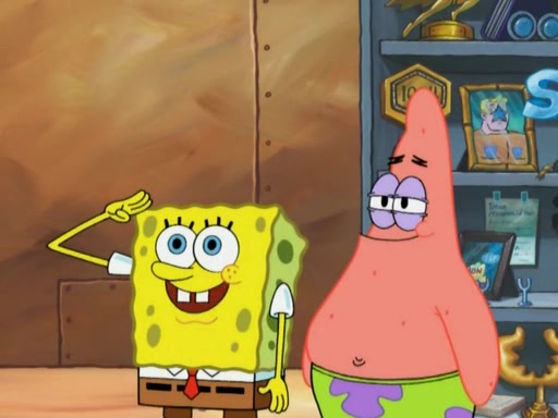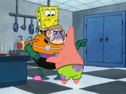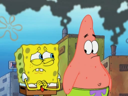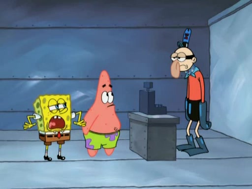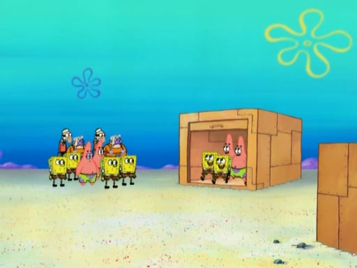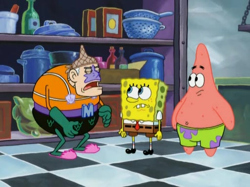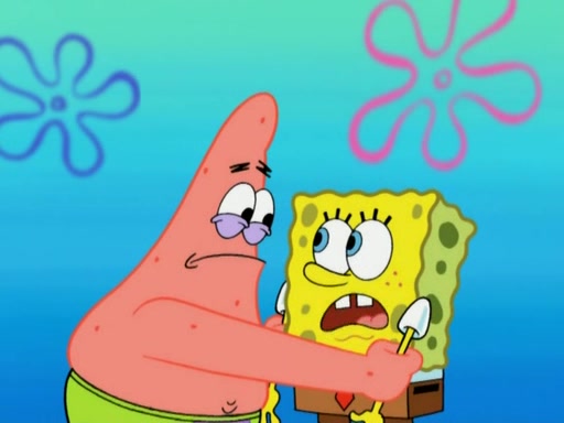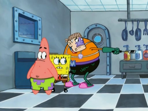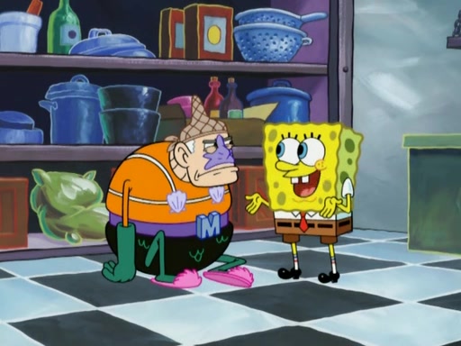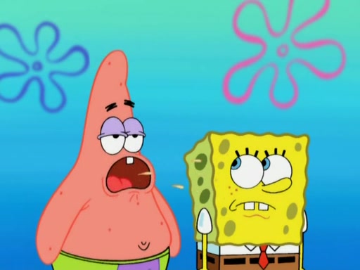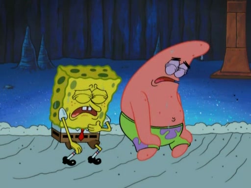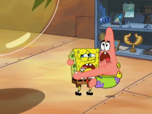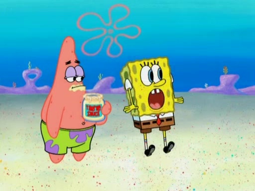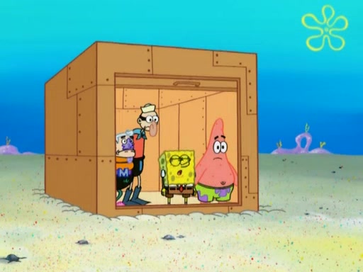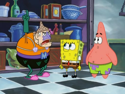 SpongeBob and Patrick from a different time period emerge from the warehouse screaming "Patrick, don't eat the tartar sauce!" Another warehouse appears above of Man Ray and out fall SpongeBob and Patrick. Yet another one appears with SpongeBob saying to Patrick "I told you we had to go back further!"