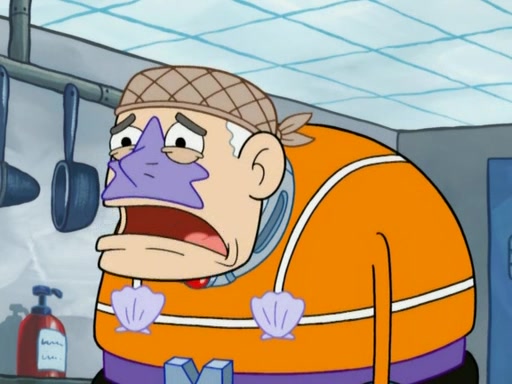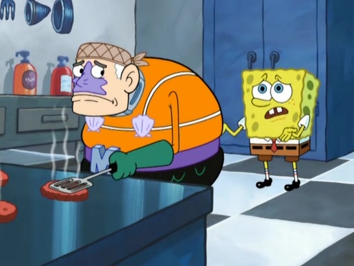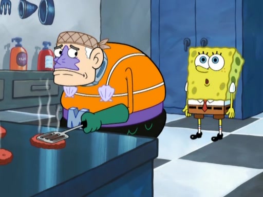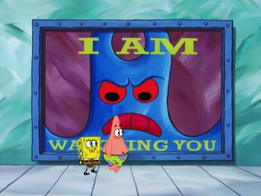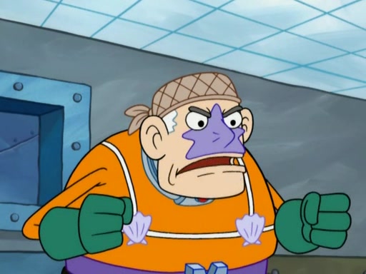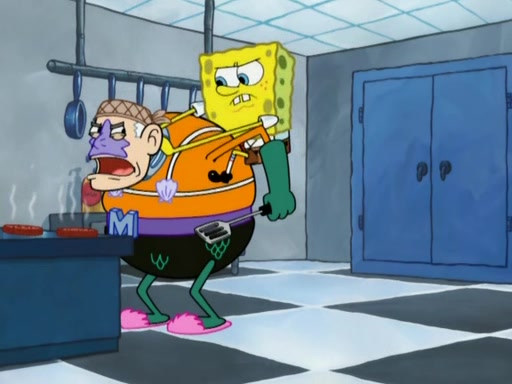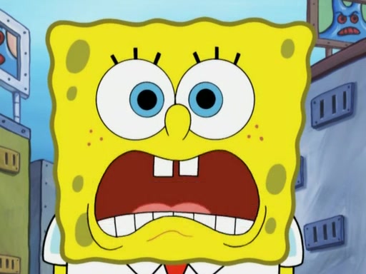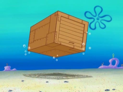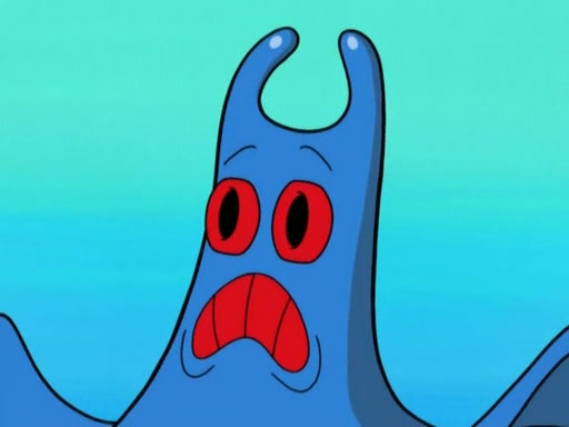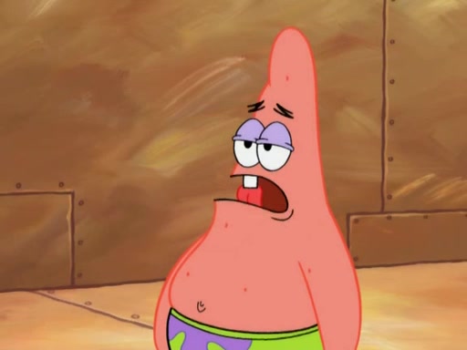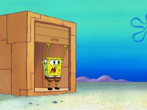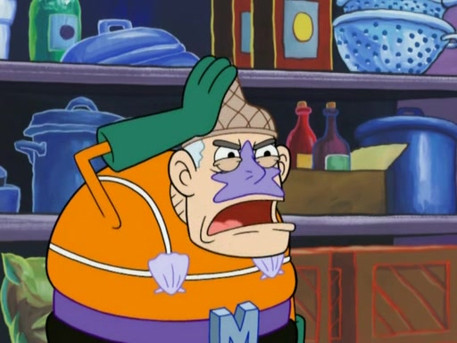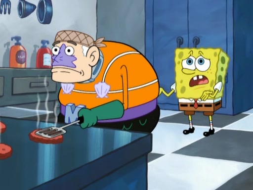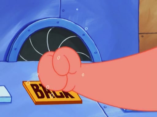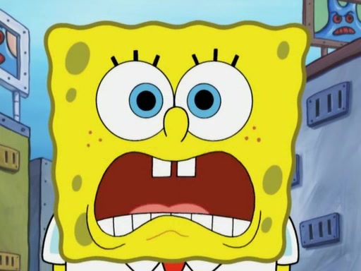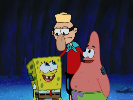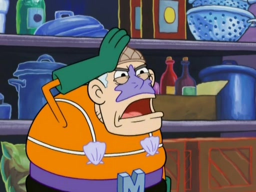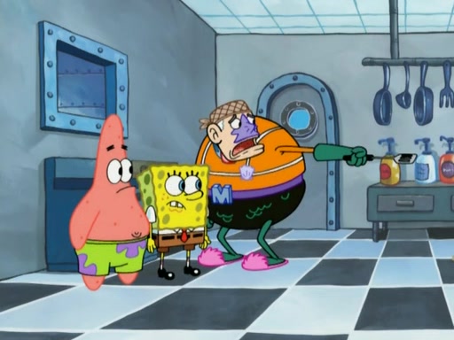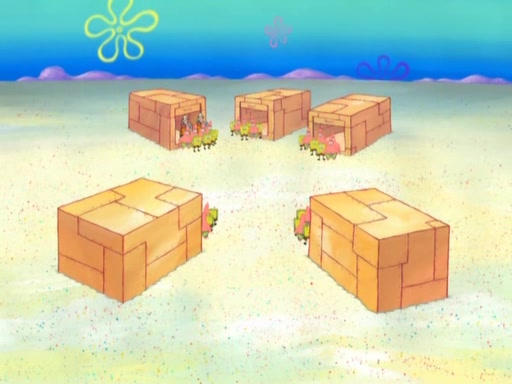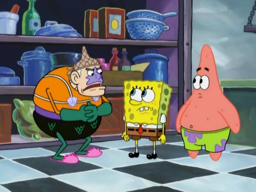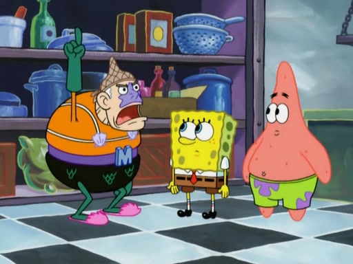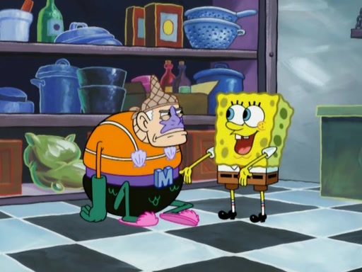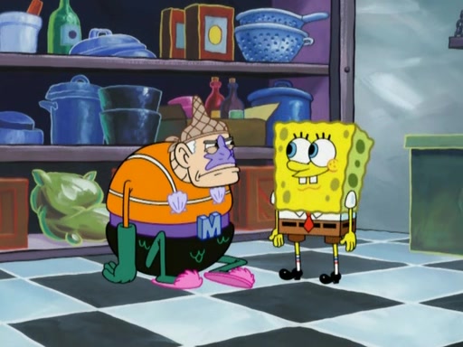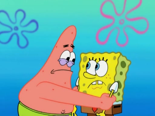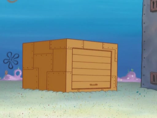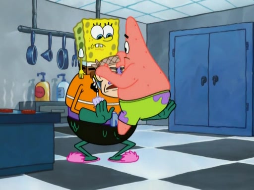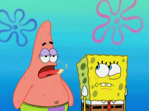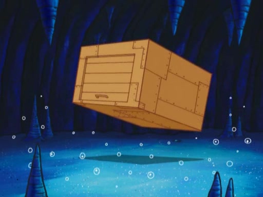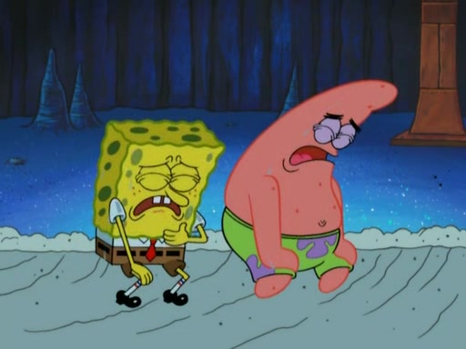 SpongeBob and Patrick from a different time period emerge from the warehouse screaming "Patrick, don't eat the tartar sauce!" Another warehouse appears above of Man Ray and out fall SpongeBob and Patrick. Yet another one appears with SpongeBob saying to Patrick "I told you we had to go back further!"