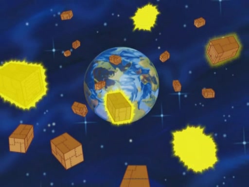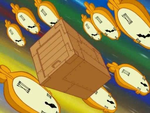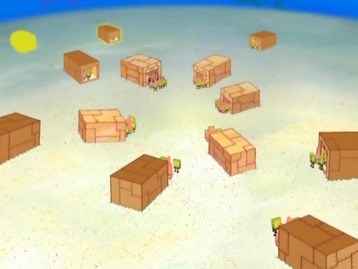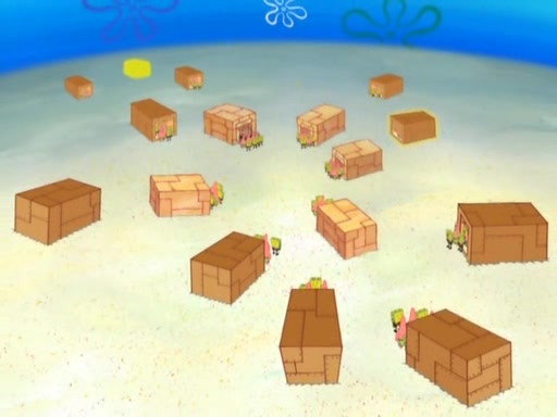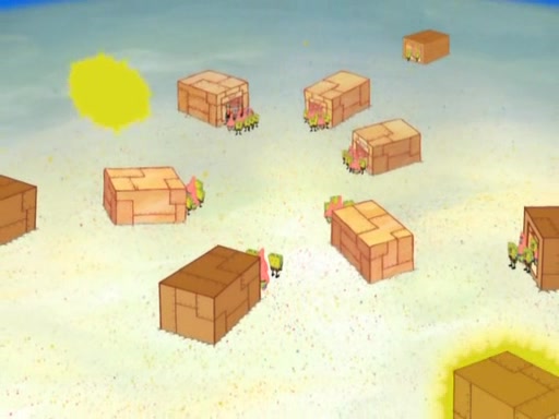 Another one appears next to the pair of warehouses. Man Ray flies out of it, destroys it, says, "I took care of your blasted time machine!" and leaves. All of the warehouses appearing in random locations confuses Man Ray. Man Ray sits down on a log and thinks about what is happening, but gets arrested by the superheroes. Then all of a sudden, many warehouses appear all over the planet, all of them containing multiple copies of SpongeBob and Patrick.
