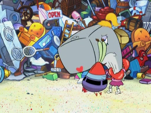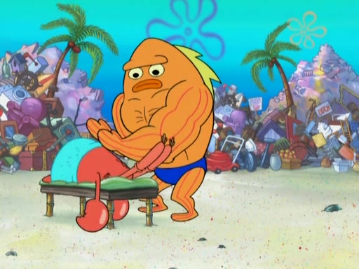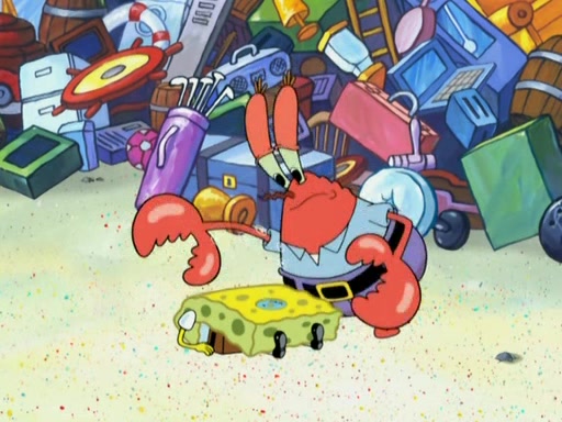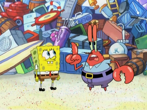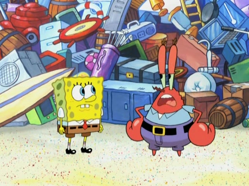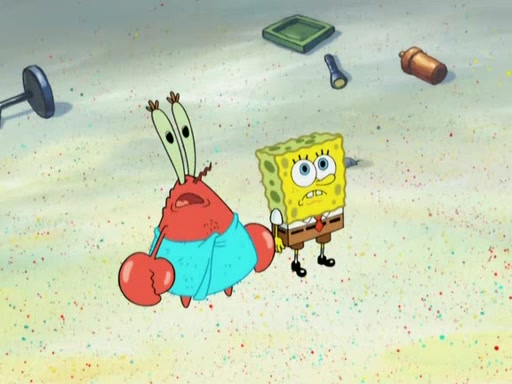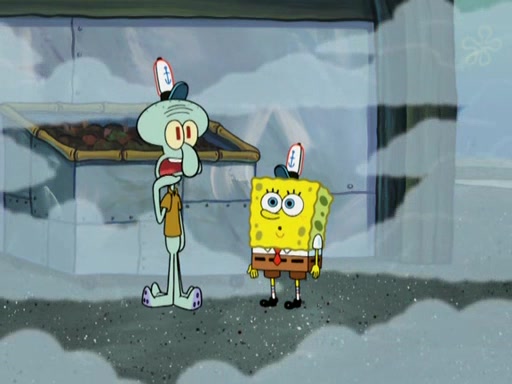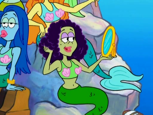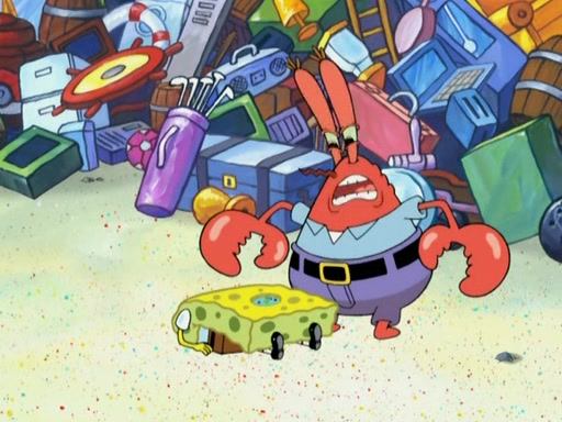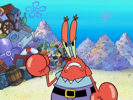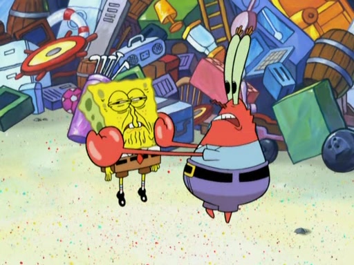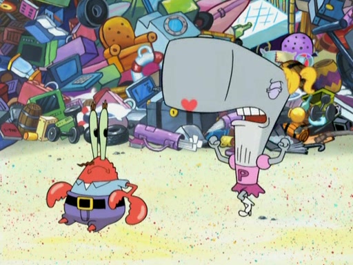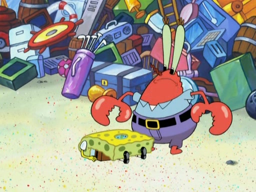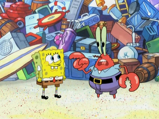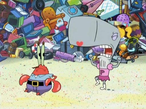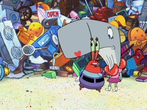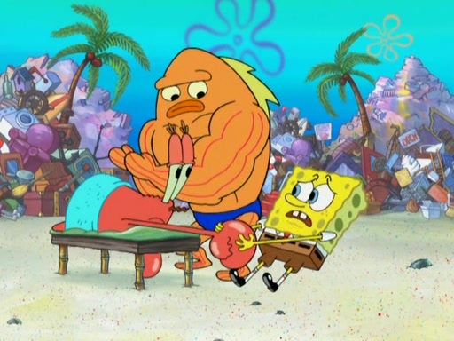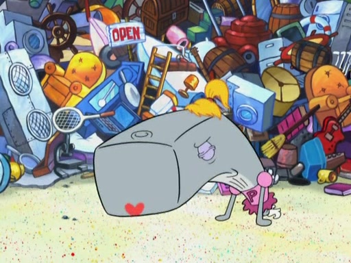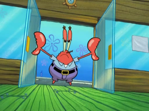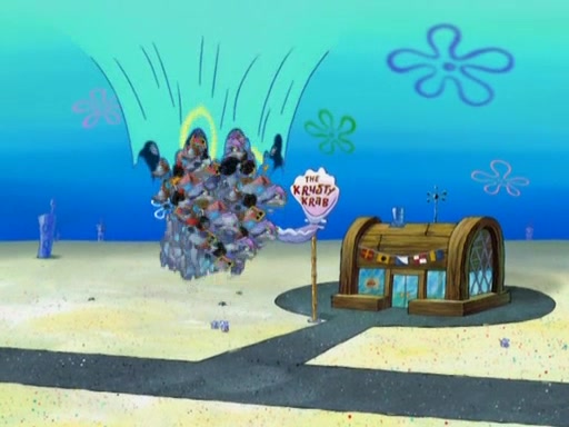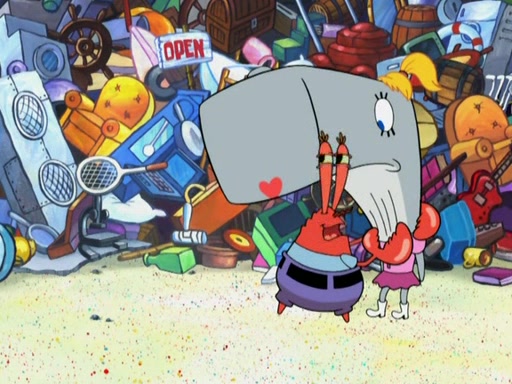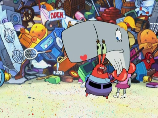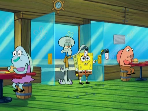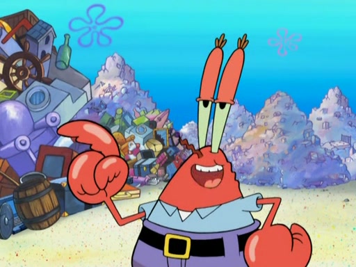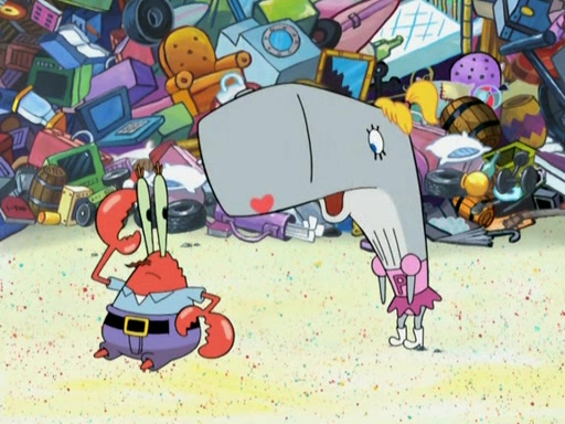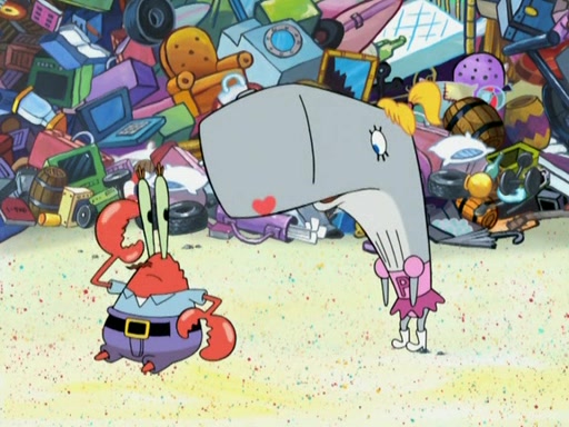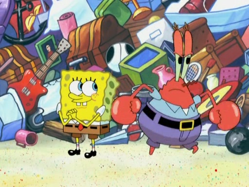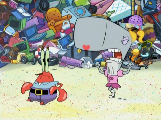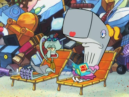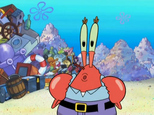 Pearl and Squidward relax, Mr. Krabs looks for change, and SpongeBob and Patrick look for the mermaids. The mermaid quintet only knows how to "surround themselves with cool new stuff" whenever they feel like. They call SpongeBob's dilemma "TNOP" (totally not our problem). SpongeBob then quickly says upon return, "Unfortunately, I was unable to get the information from the aauugh," and being noticeably tired, he simply collapses. Mr. Krabs realizes SpongeBob desperately needs a Krabby Patty. He finds one and feeds it to SpongeBob. He then wonders who made that Krabby Patty. Suspecting that Plankton might have stolen the formula, Mr. Krabs intends on getting back to the Krusty Krab as soon as possible.