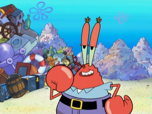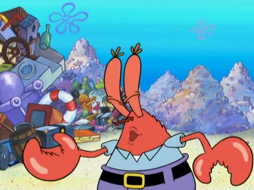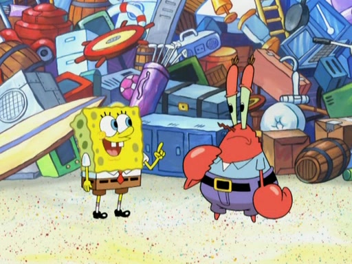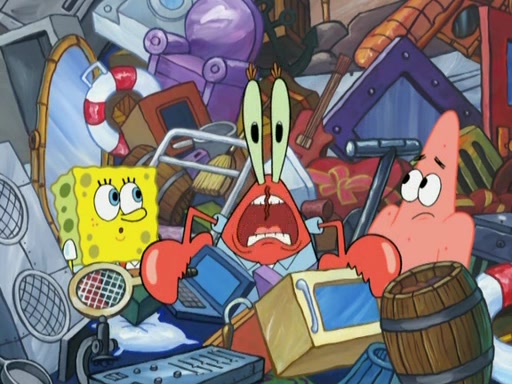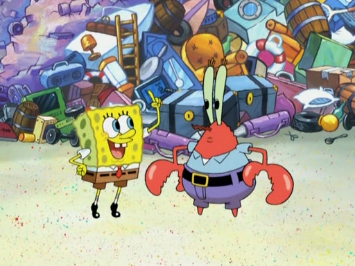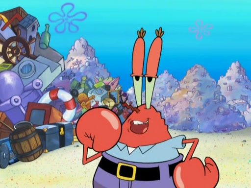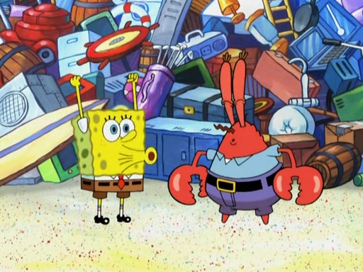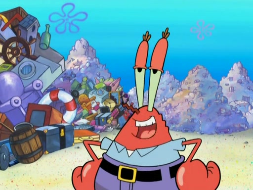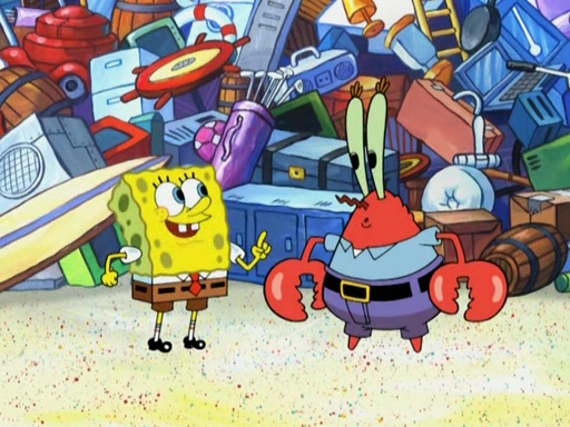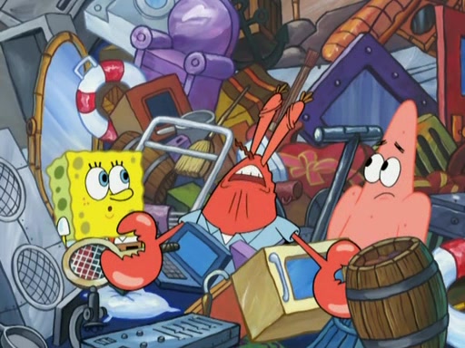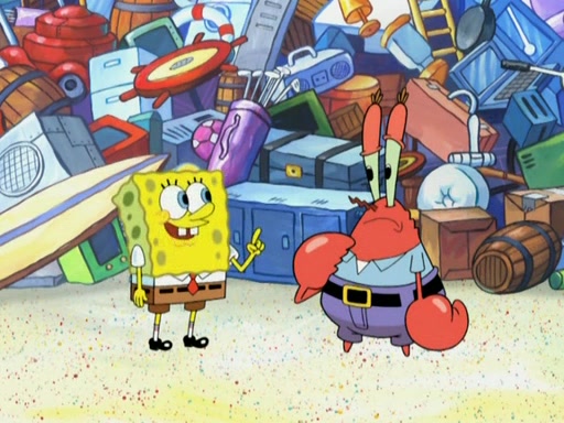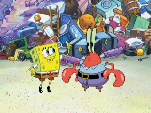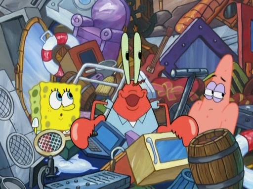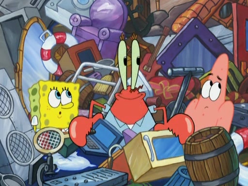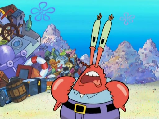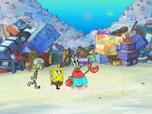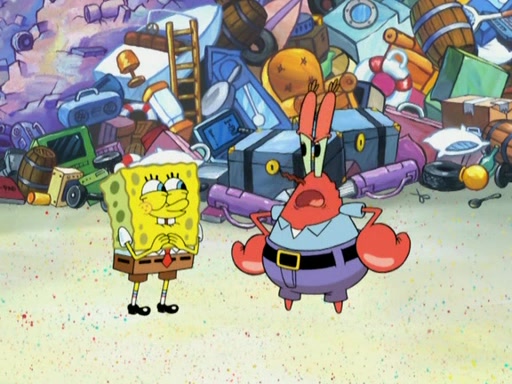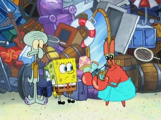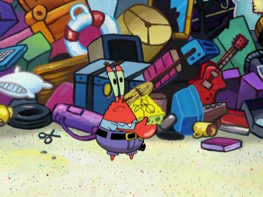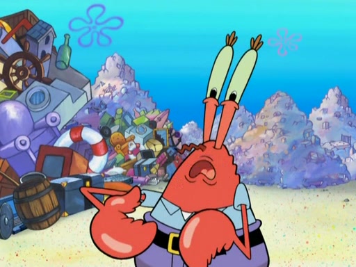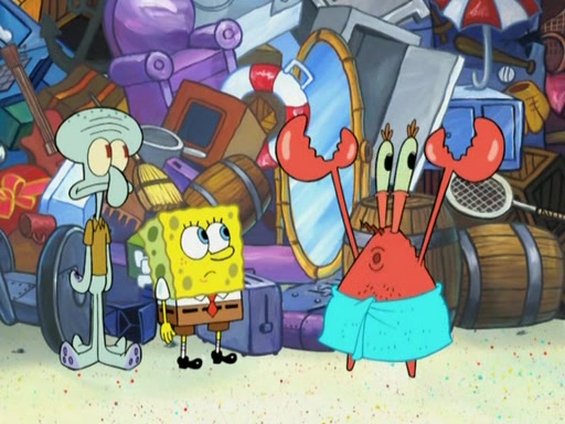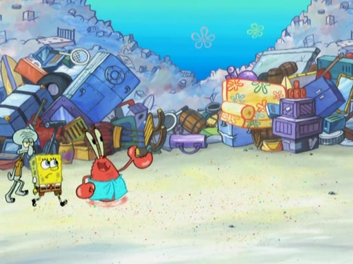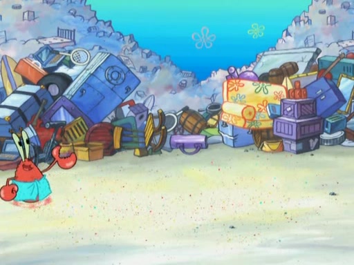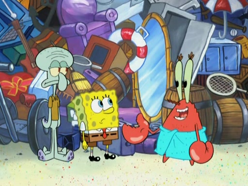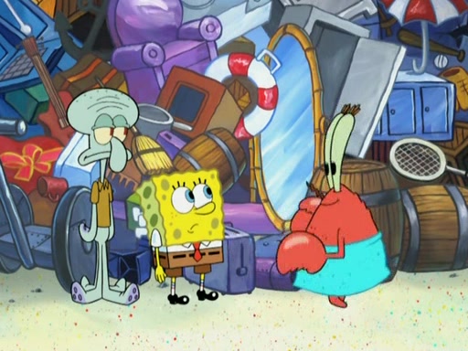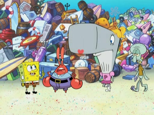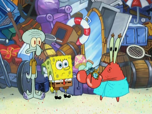 One night in Bikini Bottom, a mysterious fog appears and the voices of mermaids are heard. That morning, SpongeBob realizes his alarm clock, Gary's shell, Squidward's clarinet, Patrick's cuff links, and Mr. Krabs are missing. While investigating, SpongeBob, Squidward, and Patrick are sucked into the triangle. They find Mr. Krabs, who tells them that he loves all the piles of "resellable stuff." He realizes that Pearl is left alone at the Krusty Krab with all his money, but she gets transported to the triangle too.