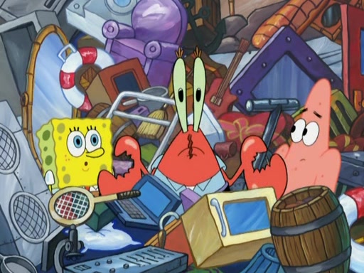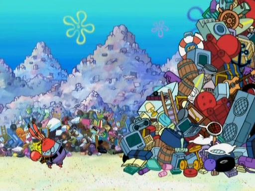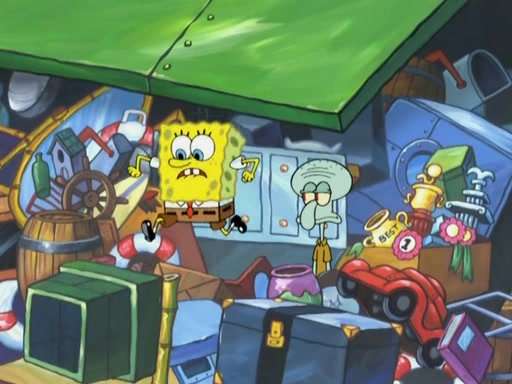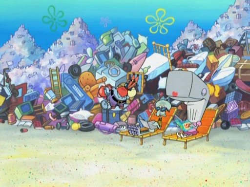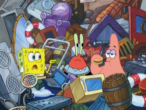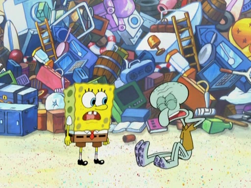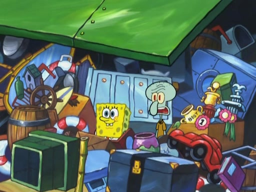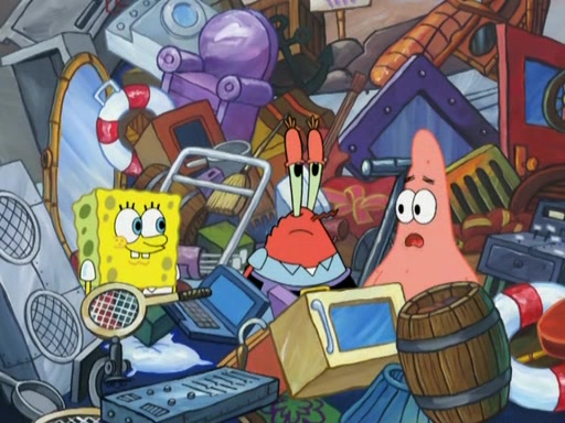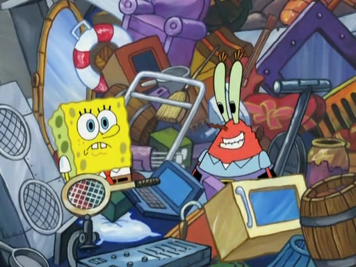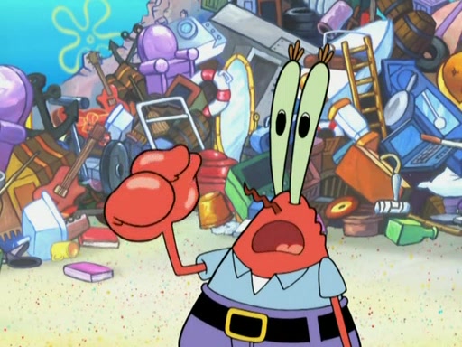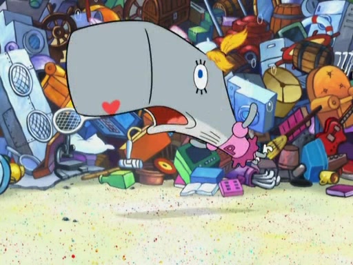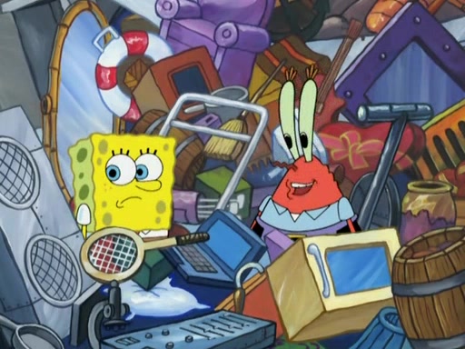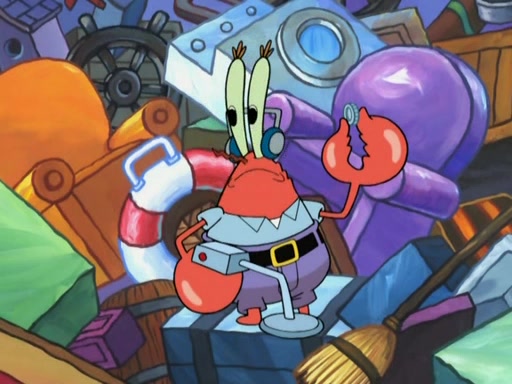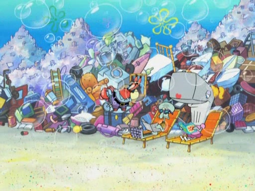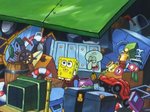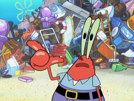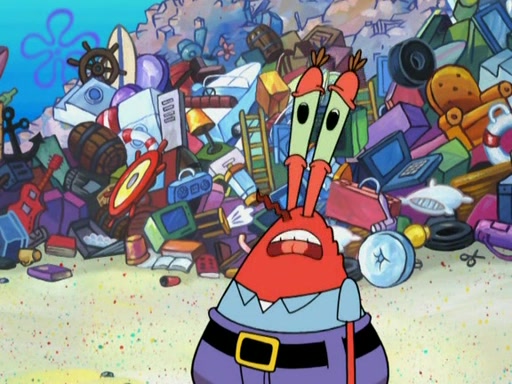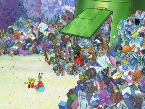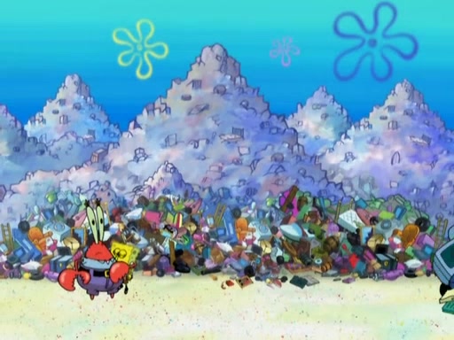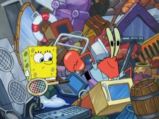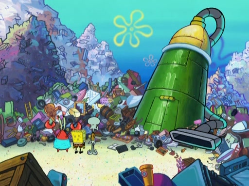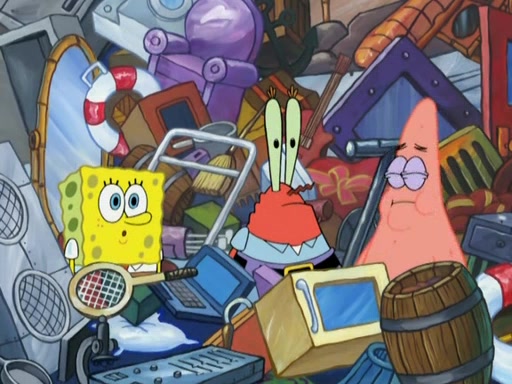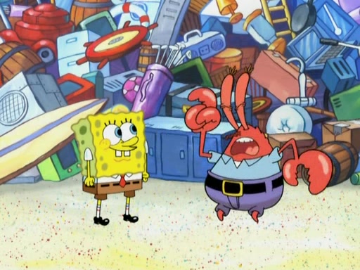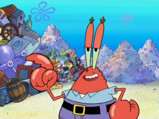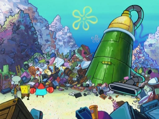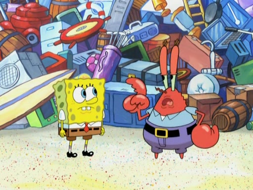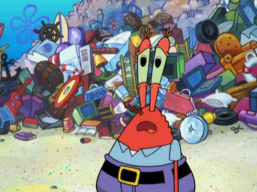 One night in Bikini Bottom, a mysterious fog appears and the voices of mermaids are heard. That morning, SpongeBob realizes his alarm clock, Gary's shell, Squidward's clarinet, Patrick's cuff links, and Mr. Krabs are missing. While investigating, SpongeBob, Squidward, and Patrick are sucked into the triangle. They find Mr. Krabs, who tells them that he loves all the piles of "resellable stuff." He realizes that Pearl is left alone at the Krusty Krab with all his money, but she gets transported to the triangle too.