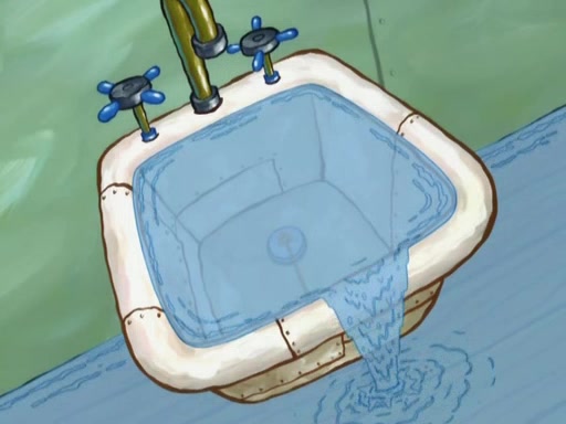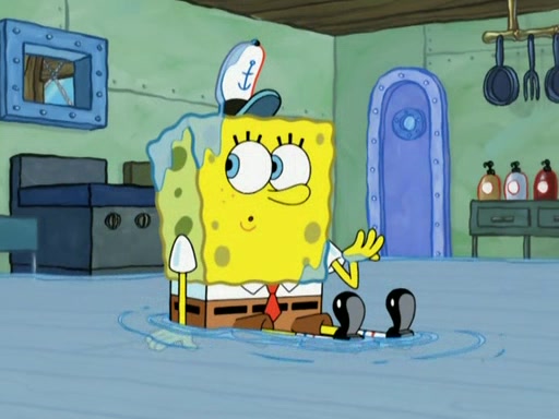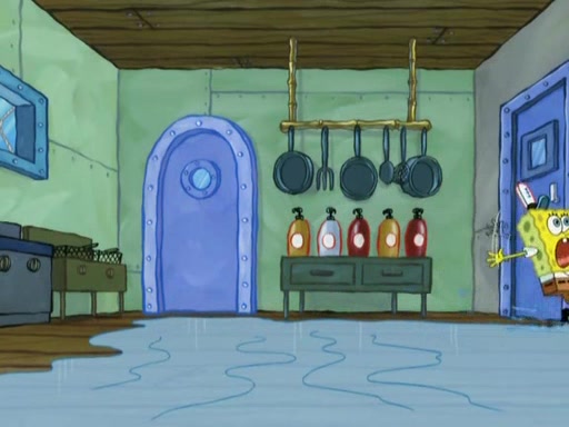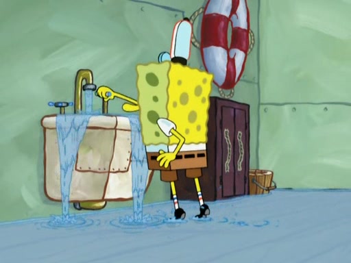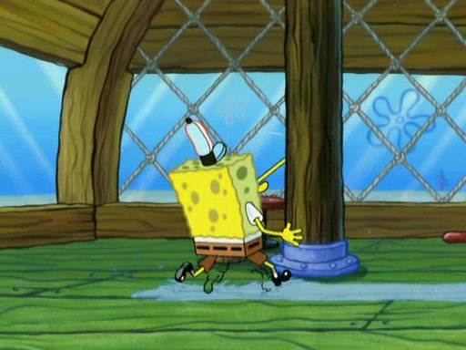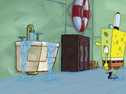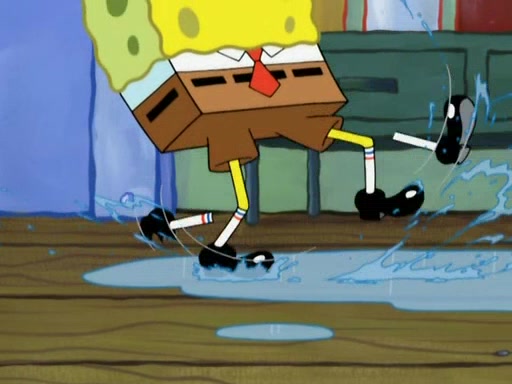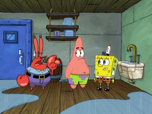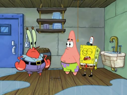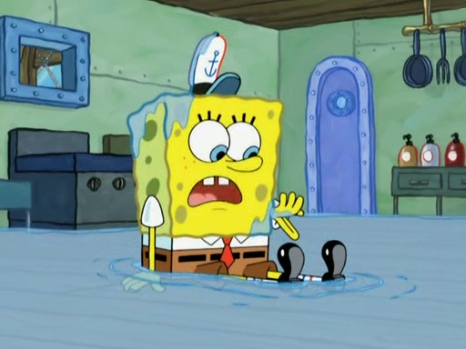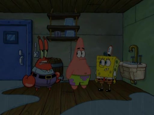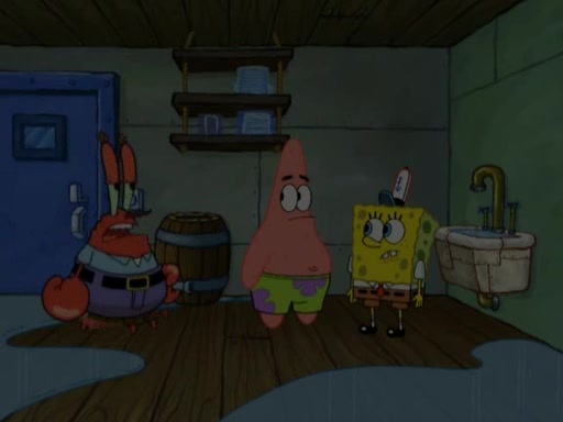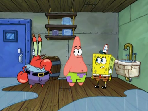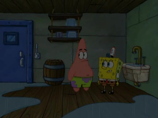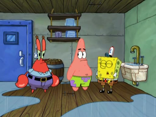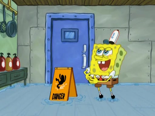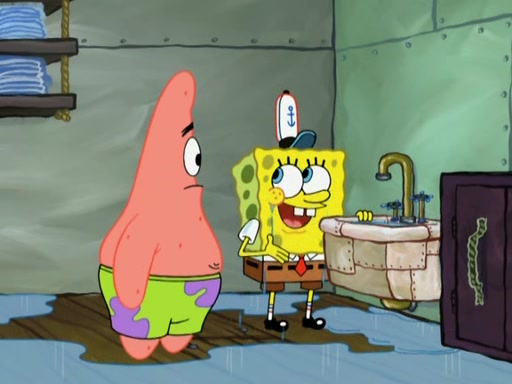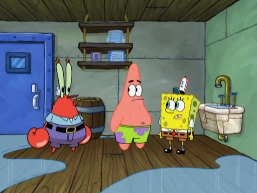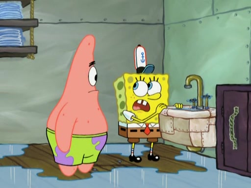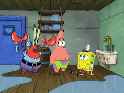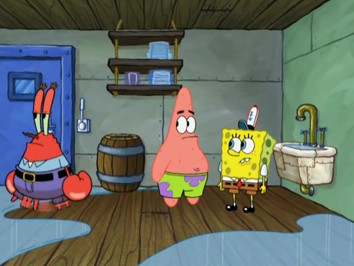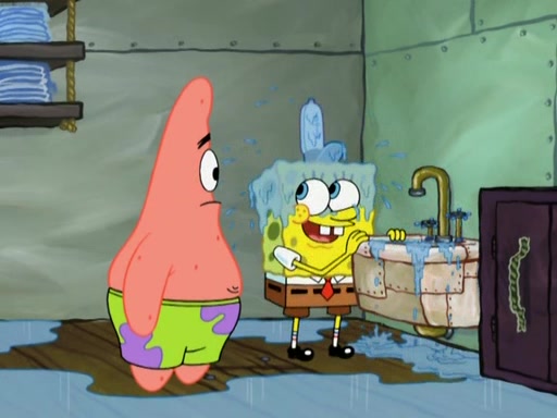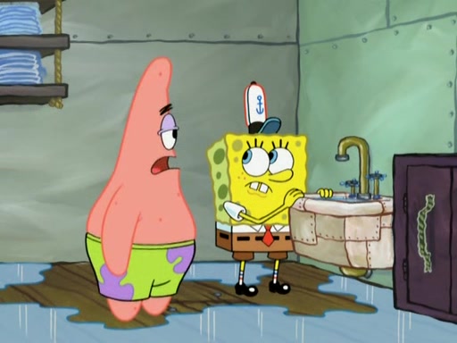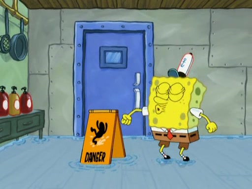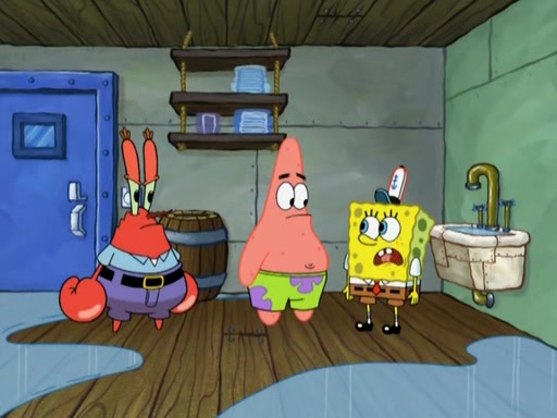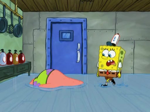 One day in Bikini Bottom, SpongeBob wipes the grill with a sponge (made from part of his own tongue) at the Krusty Krab. He proclaims that it is freshly clean and tries to convince a customer to eat a Krabby Patty that was on the grill. When SpongeBob went back inside to cook that patty, the customer asks Squidward why he doesn't want a Krabby Patty, and he replies that he has seen what SpongeBob cleans the grill with. It goes back to SpongeBob, who is on his way to the freezer for a patty when he slips on a puddle of water. Upon closer inspection, SpongeBob observes that the flood is coming from the sink, which is clogged with water. As he is trying to figure out how to unclog the drain, Patrick comes in and slips, but because he was his normal clumsy self.