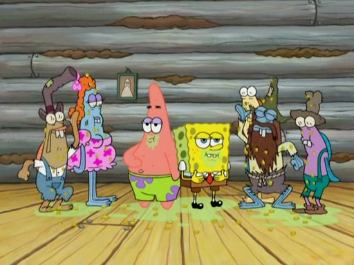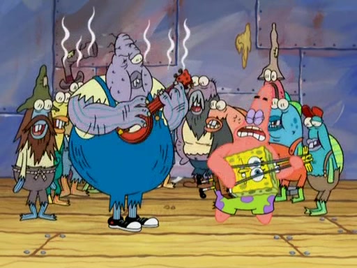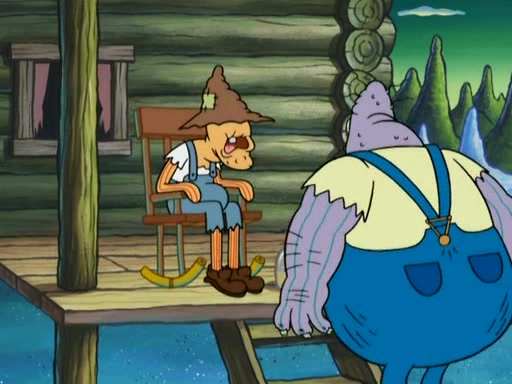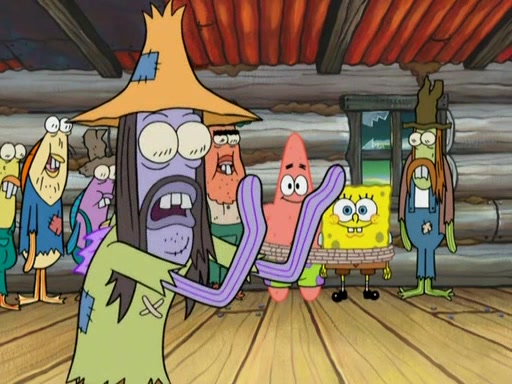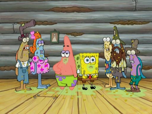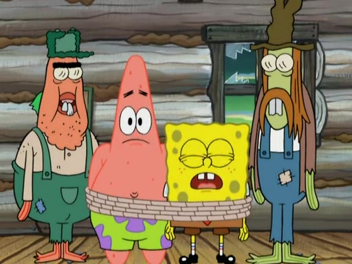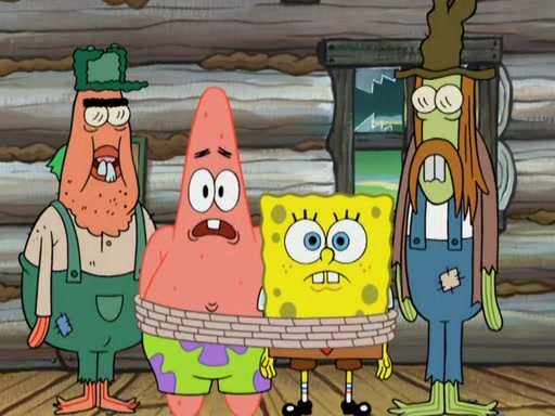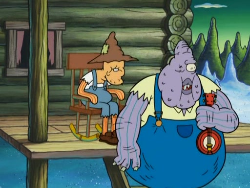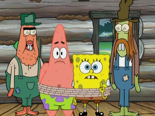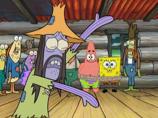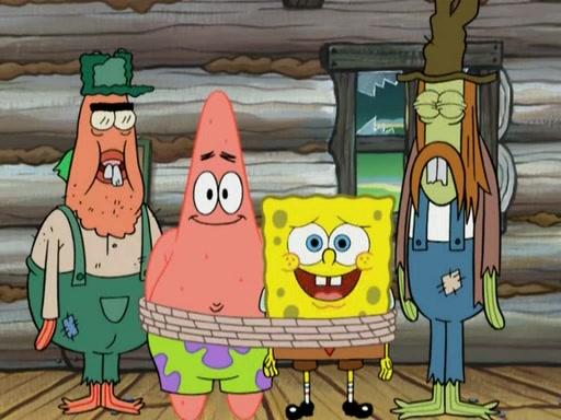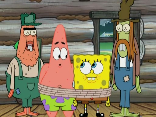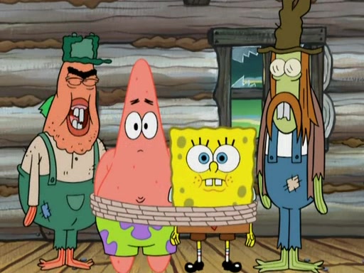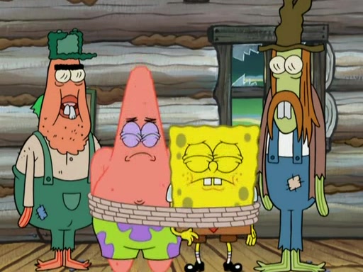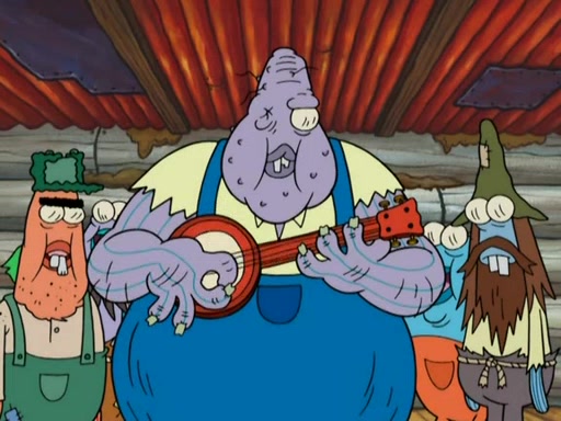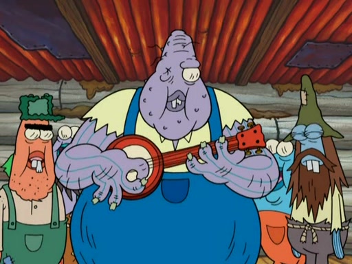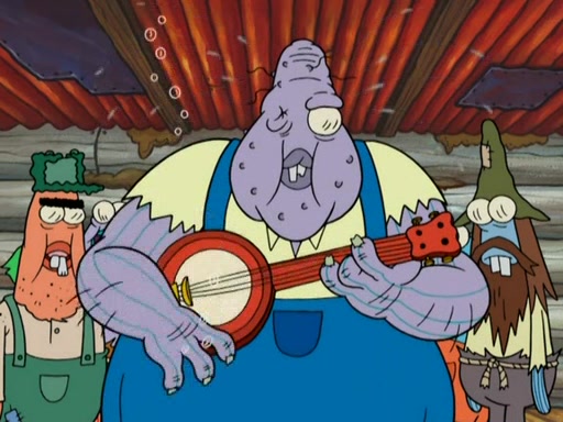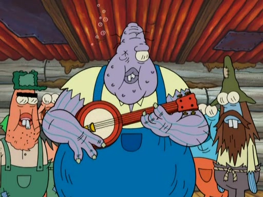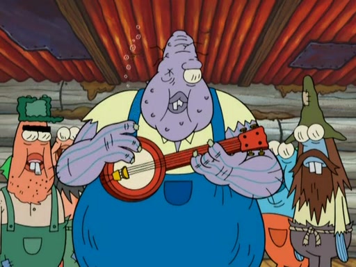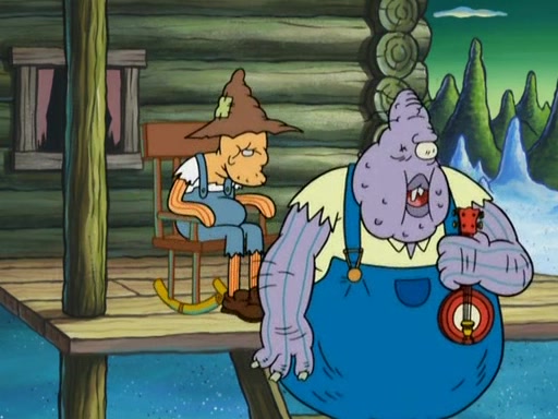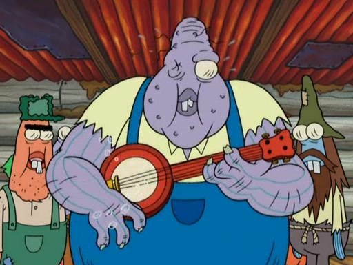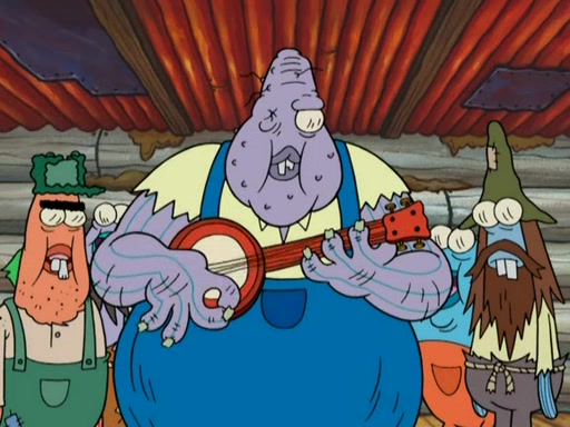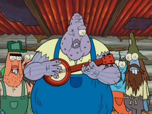 They continue chasing the jellyfish. They don't watch where they are going and accidentally fall off a cliff, falling way down to a county-like village and land on a port-a-potty. Many of the trenchbillies gang up on SpongeBob and Patrick and capture them with a rope. They take them to Ma Angler, who says that they are "awful purdy." Ma Angler orders them to an initiation. SpongeBob and Patrick question them and Ma Angler sentences them to a series of challenges, being: a banjo contest, "hootin" and hollering" contest, and a wrestling match. SpongeBob and Patrick win the first two competitions but decline to the wrestling match, claiming that "they don't like to wrestle." Ma Angler is surprised and asks them what they like to do for fun. SpongeBob claims that they like to jellyfish. They show the trenchbillies how to jellyfish and collide, once again. Ma Angler enjoys this. The trenchbillies laugh at them and call them dumb. Ma Angler certifies them as official honorary trenchbillies and gives them novelty teeth.