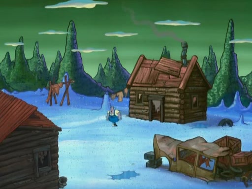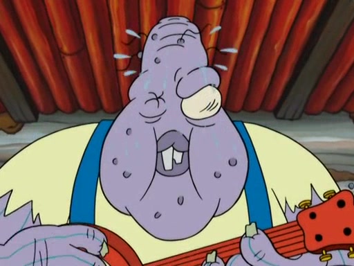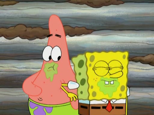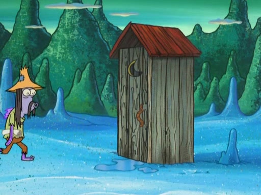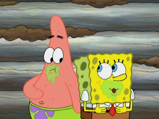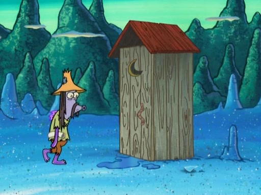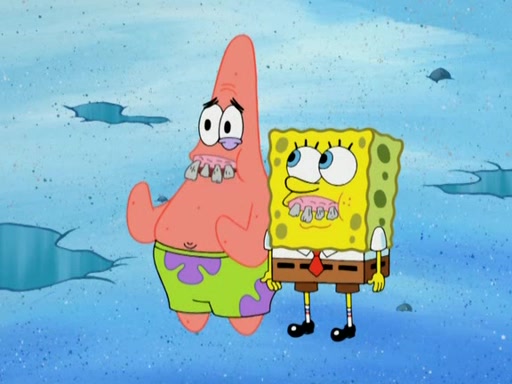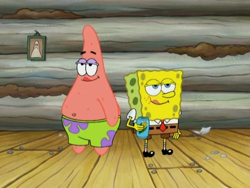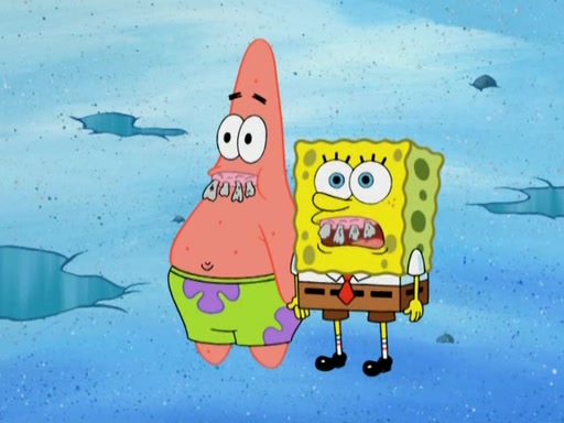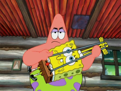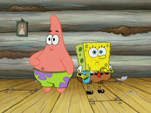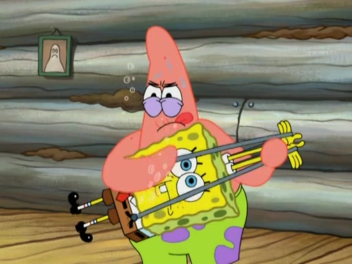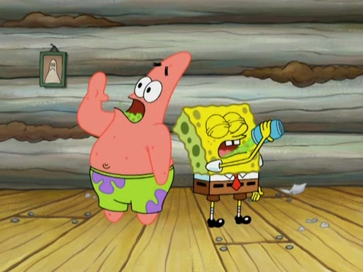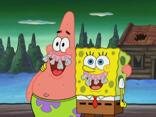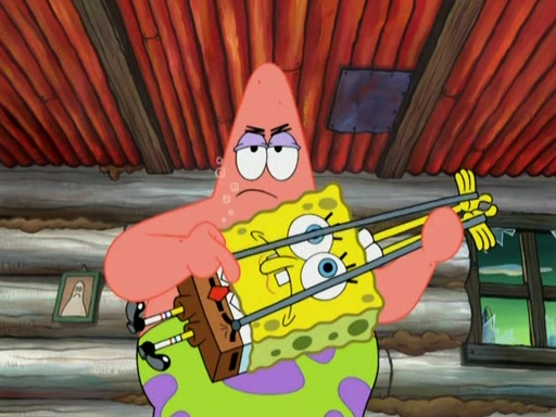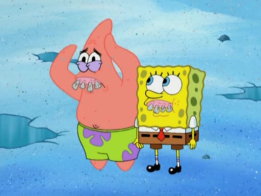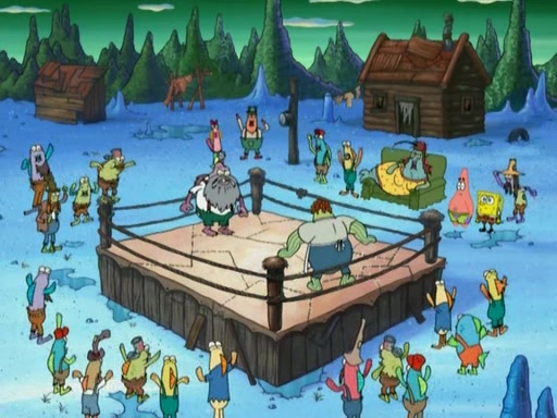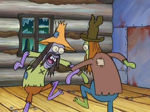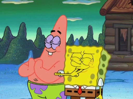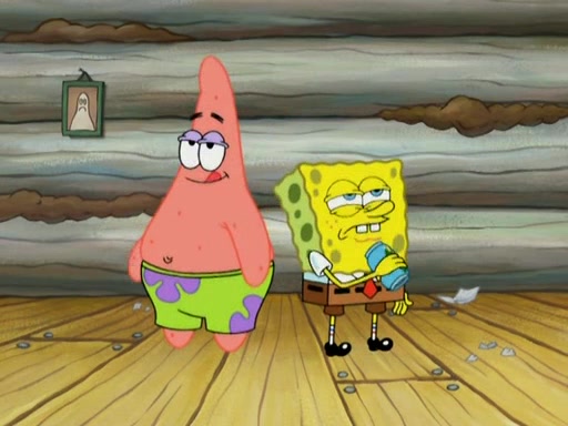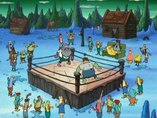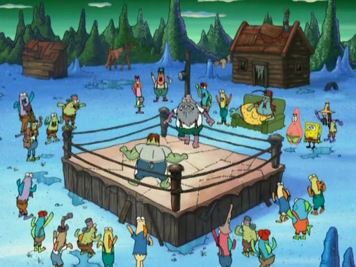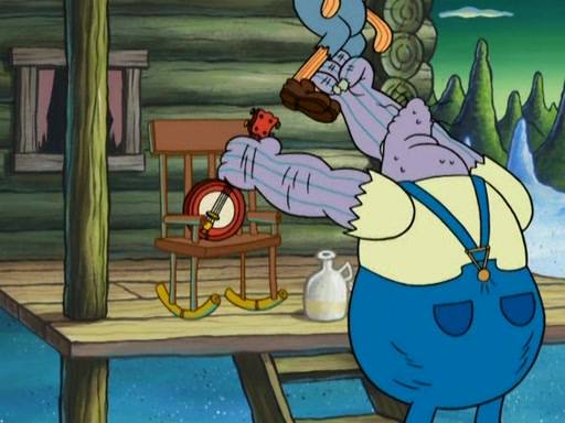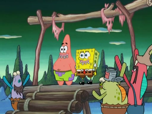 They continue chasing the jellyfish. They don't watch where they are going and accidentally fall off a cliff, falling way down to a county-like village and land on a port-a-potty. Many of the trenchbillies gang up on SpongeBob and Patrick and capture them with a rope. They take them to Ma Angler, who says that they are "awful purdy." Ma Angler orders them to an initiation. SpongeBob and Patrick question them and Ma Angler sentences them to a series of challenges, being: a banjo contest, "hootin" and hollering" contest, and a wrestling match. SpongeBob and Patrick win the first two competitions but decline to the wrestling match, claiming that "they don't like to wrestle." Ma Angler is surprised and asks them what they like to do for fun. SpongeBob claims that they like to jellyfish. They show the trenchbillies how to jellyfish and collide, once again. Ma Angler enjoys this. The trenchbillies laugh at them and call them dumb. Ma Angler certifies them as official honorary trenchbillies and gives them novelty teeth.