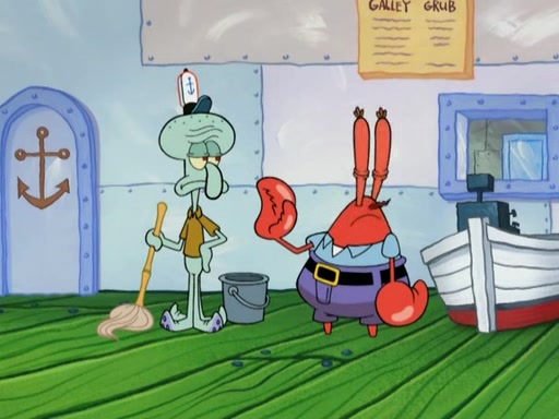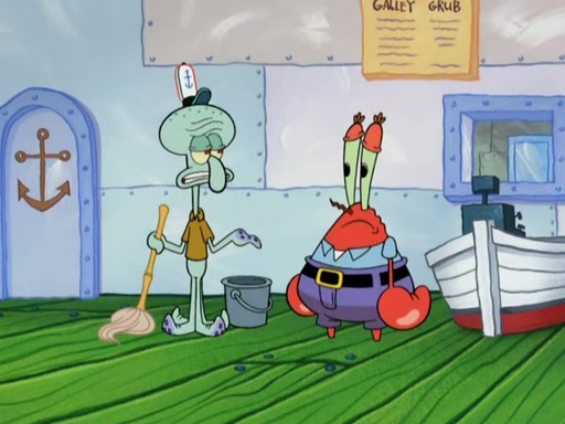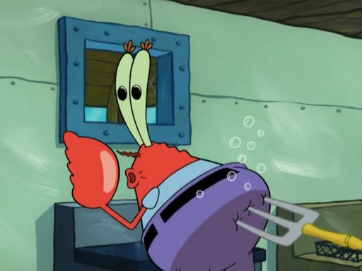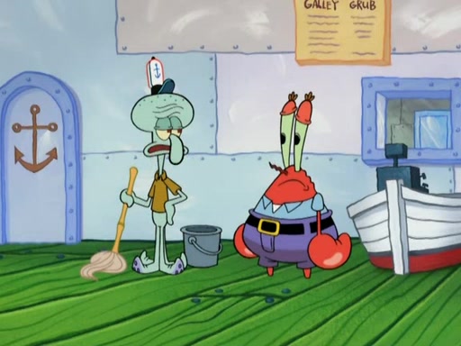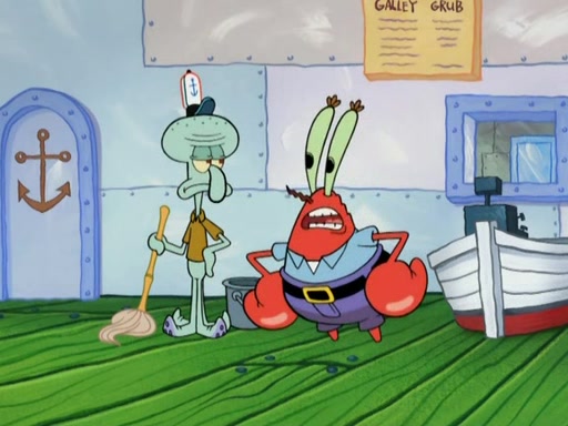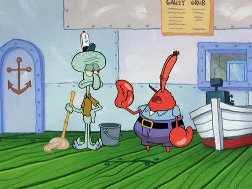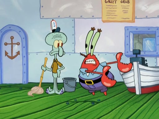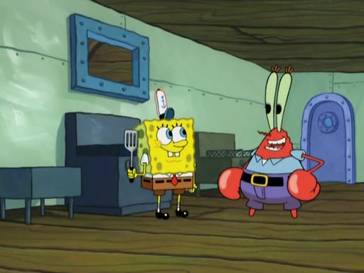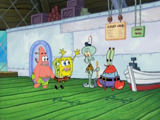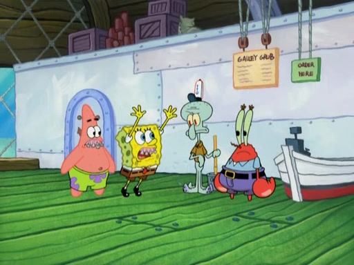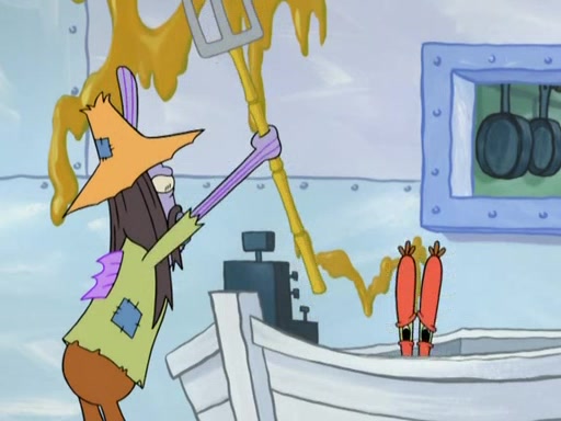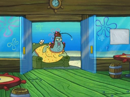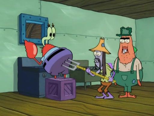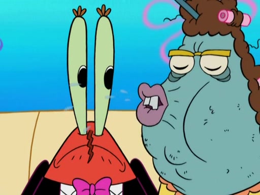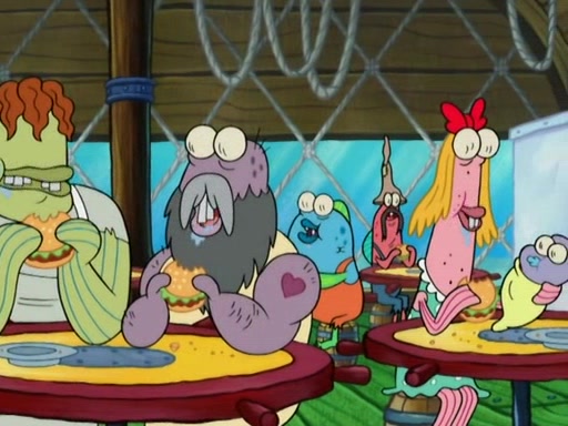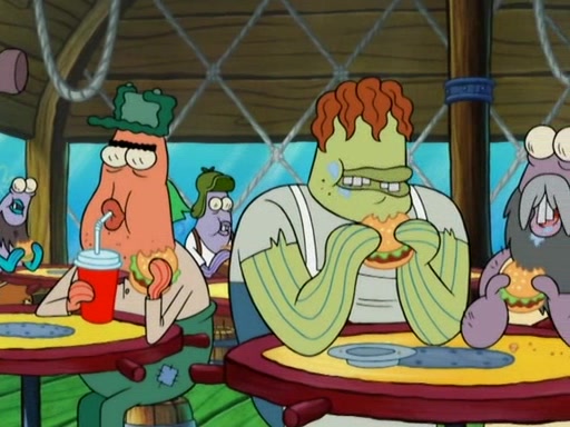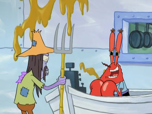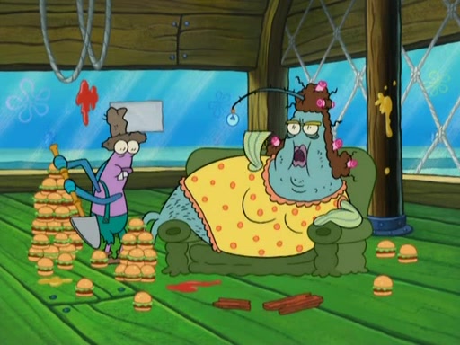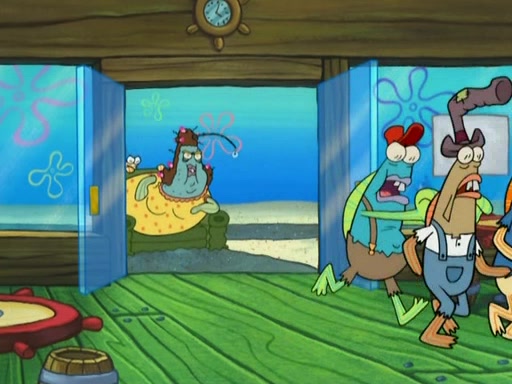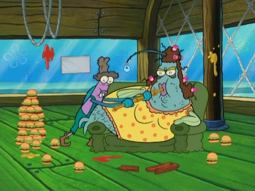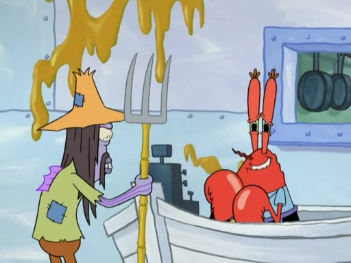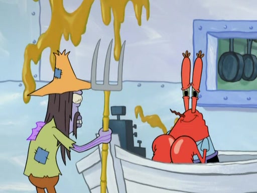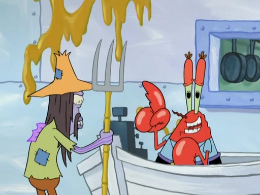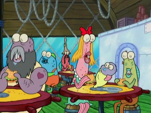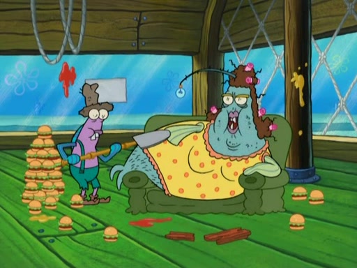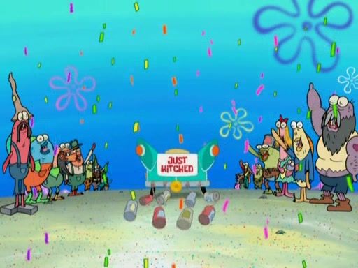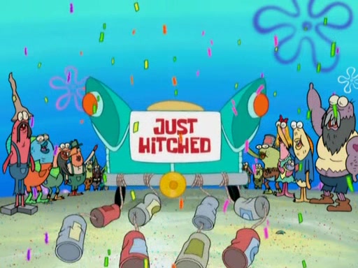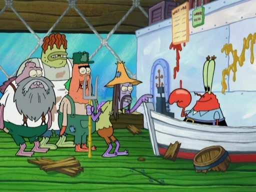 Meanwhile, at the Krusty Krab, Mr. Krabs and Squidward lightly chat, SpongeBob and Patrick burst through the door and the trenchbillies follow them. The trenchbillies destroy the Krusty Krab out of anger. Mr. Krabs nervously asks them for their orders, they all order something to eat. Mr. Krabs says that Ma Angler, who is eating a lot of Krabby Patties, will make Customer of the Week. One of the trenchbillies sees Mr. Krabs making "goo-goo eyes at the Ma Angler" and as the episode ends, Mr. Krabs is forced to get "hitched" (married) to Ma Angler.