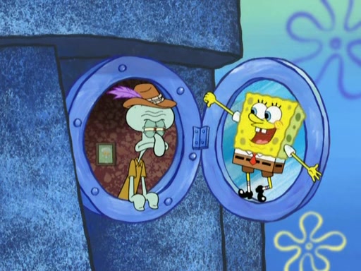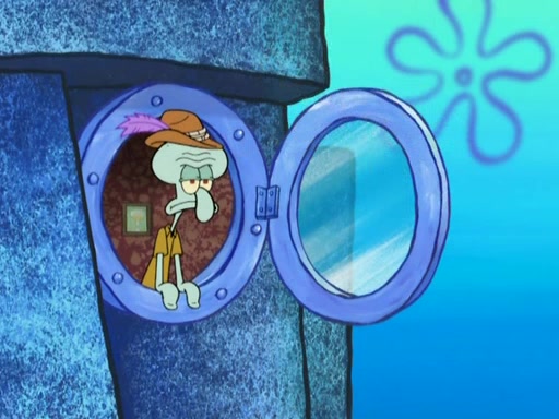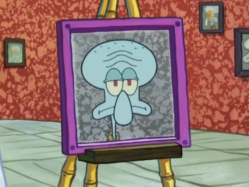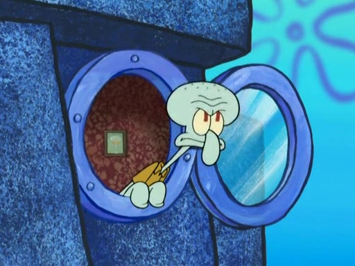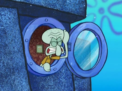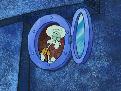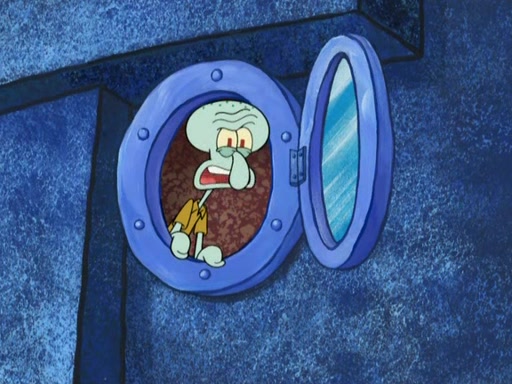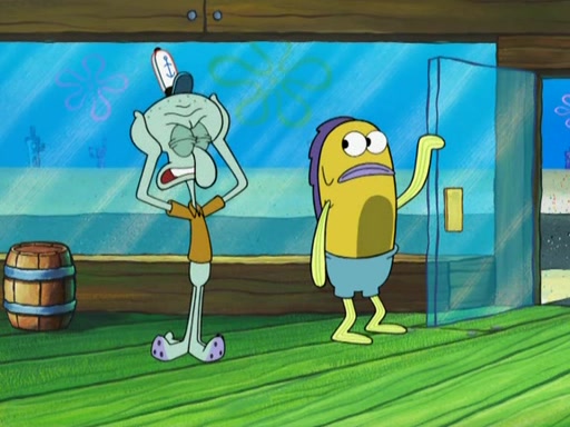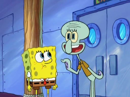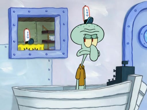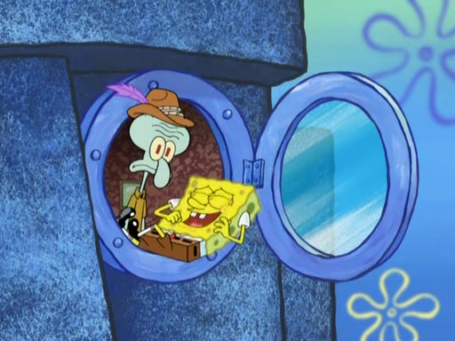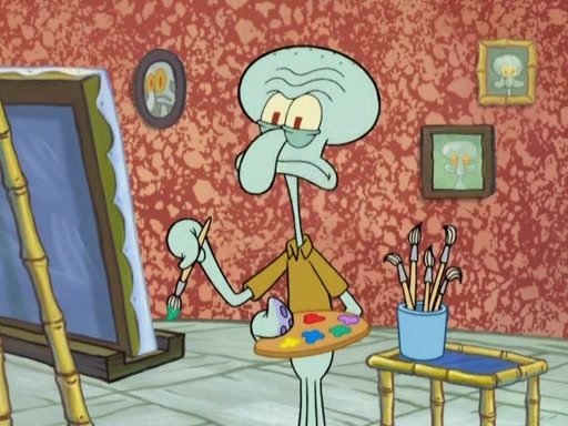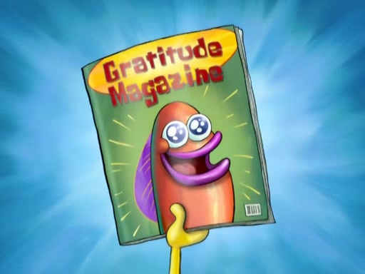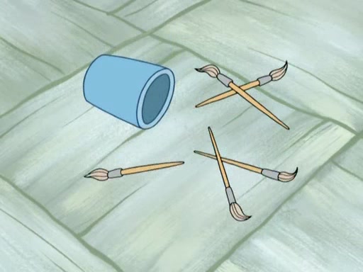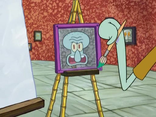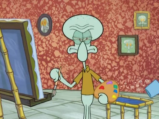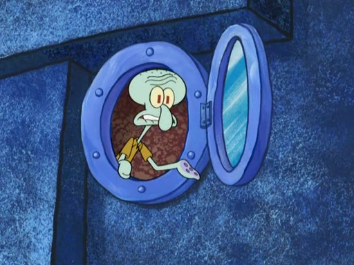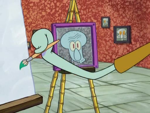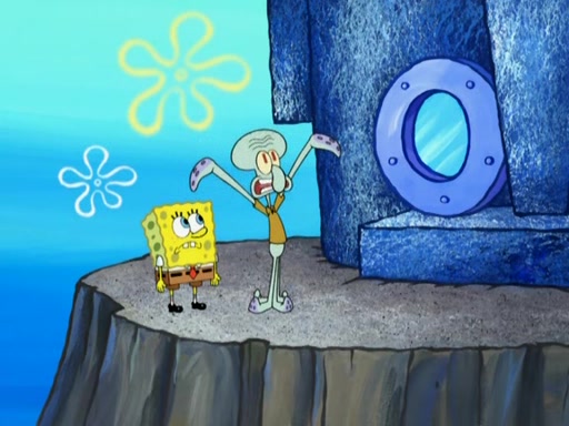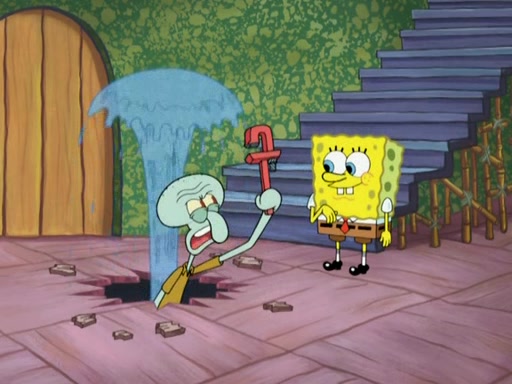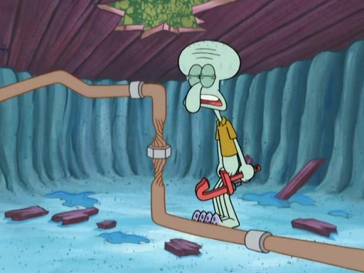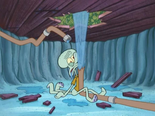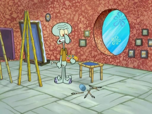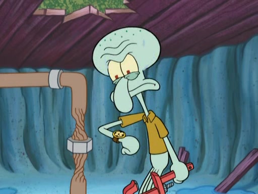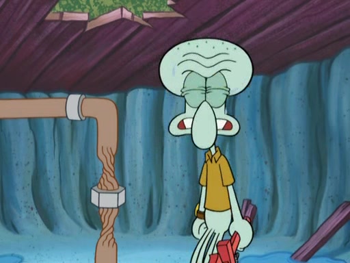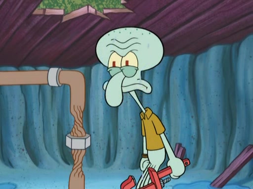 Squidward attempts to make a self-portrait when he is interrupted by a song that SpongeBob is singing about how he has an "attitude of gratitude." After Squidward tells SpongeBob to stop, he slips on some spilled paintbrushes, falls down the stairs and through the floor, breaks a plumage pipe, resulting in spewing water. When SpongeBob offers to help, Squidward denies that he needs help and tells SpongeBob not to help him ever again. He tightens the pipe so much that the water can't get through. Squidward then walks off grumpily as he's late for work.