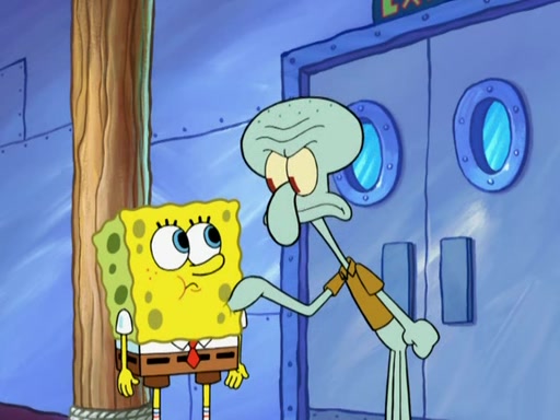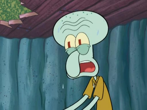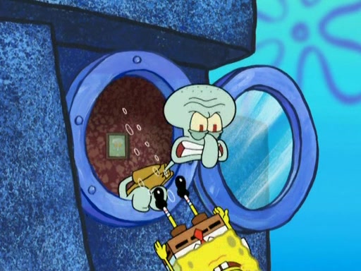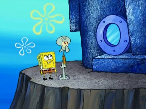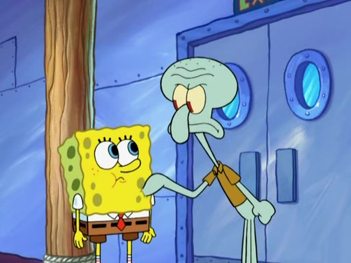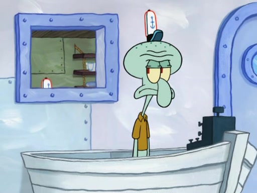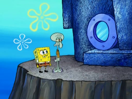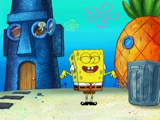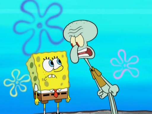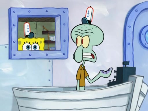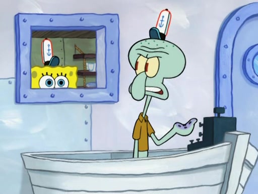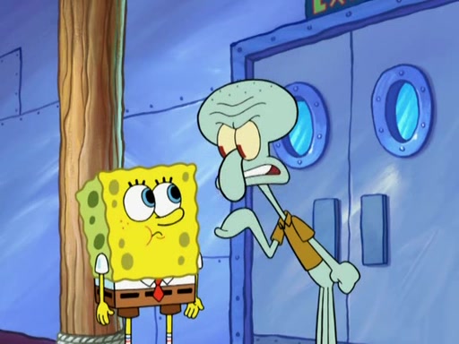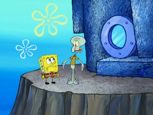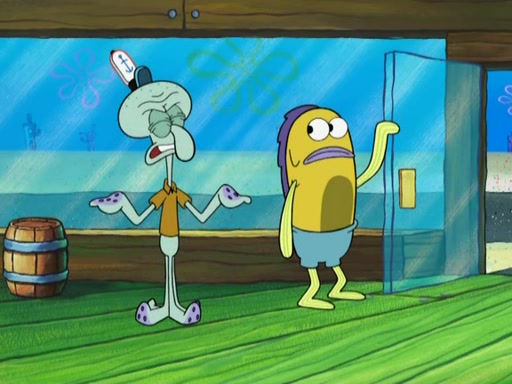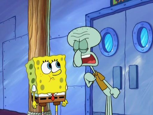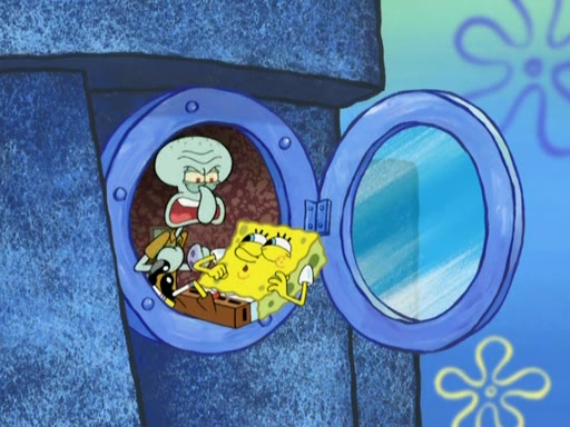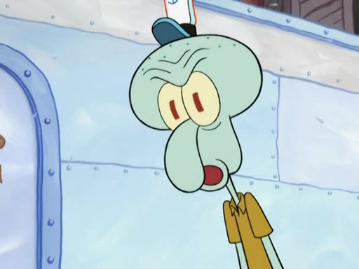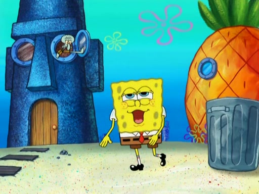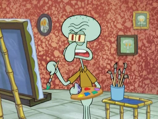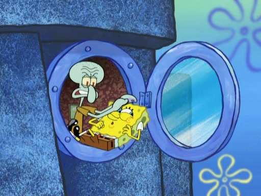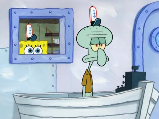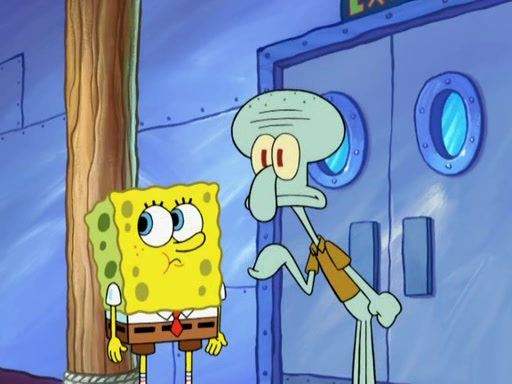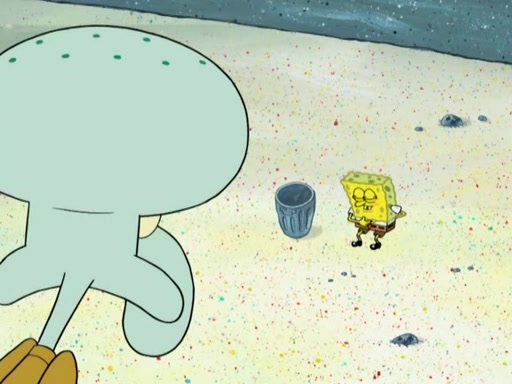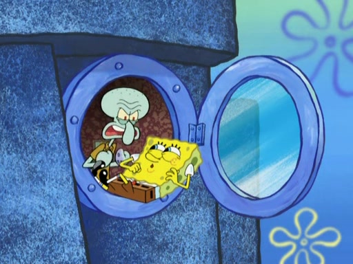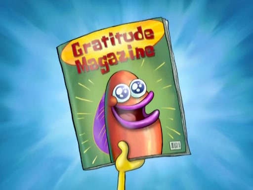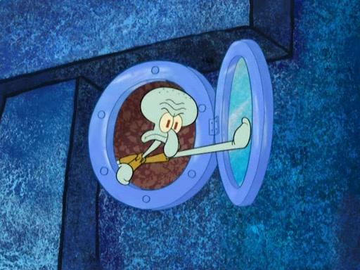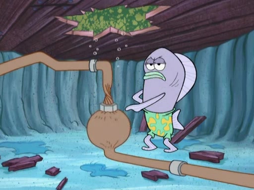 Squidward attempts to make a self-portrait when he is interrupted by a song that SpongeBob is singing about how he has an "attitude of gratitude." After Squidward tells SpongeBob to stop, he slips on some spilled paintbrushes, falls down the stairs and through the floor, breaks a plumage pipe, resulting in spewing water. When SpongeBob offers to help, Squidward denies that he needs help and tells SpongeBob not to help him ever again. He tightens the pipe so much that the water can't get through. Squidward then walks off grumpily as he's late for work.