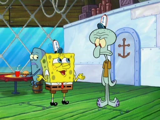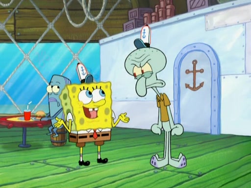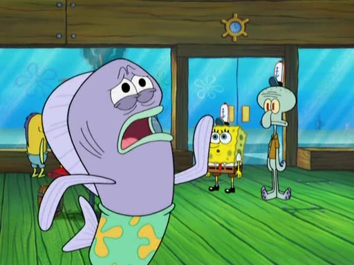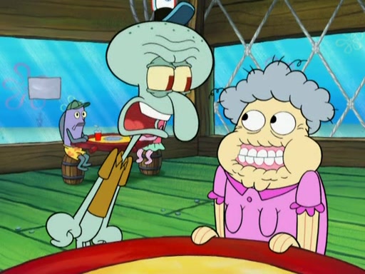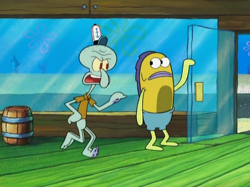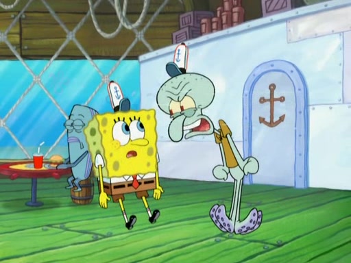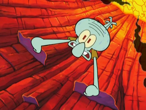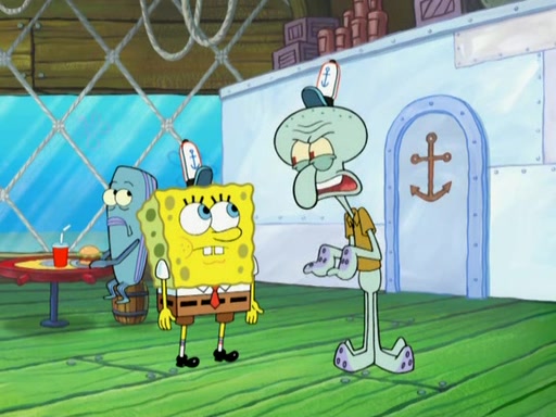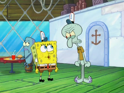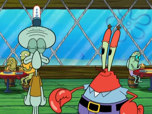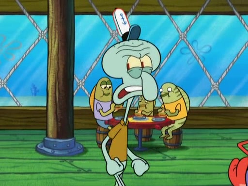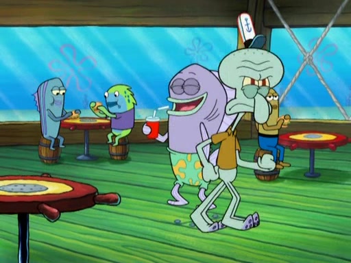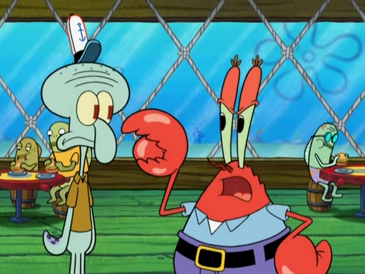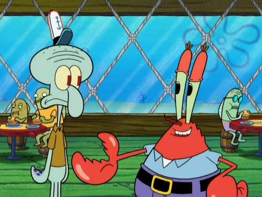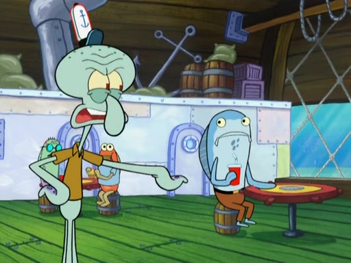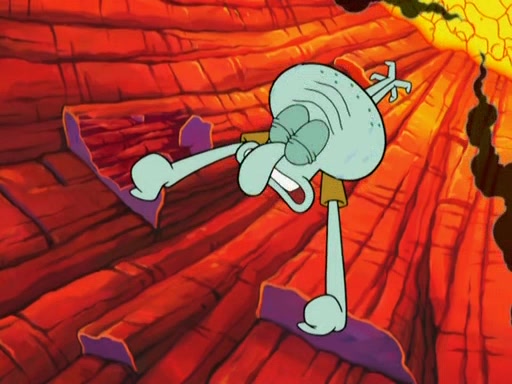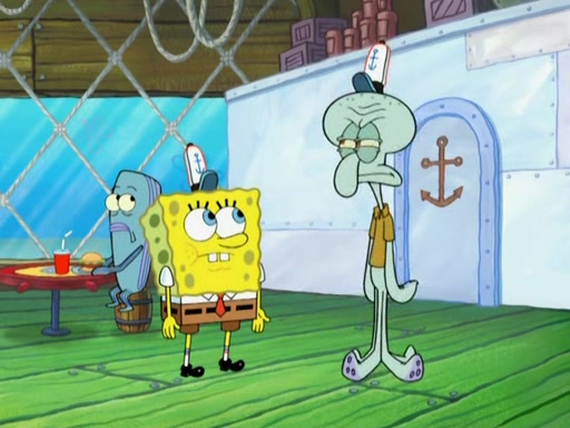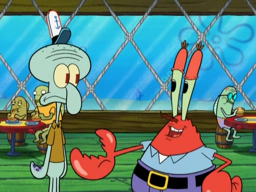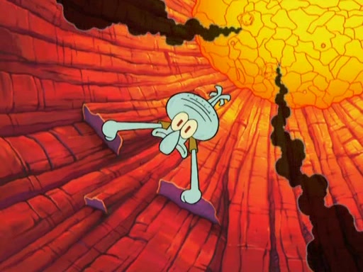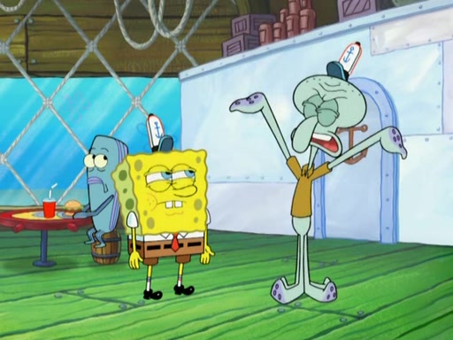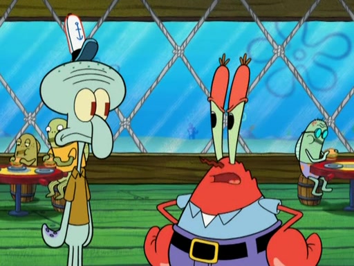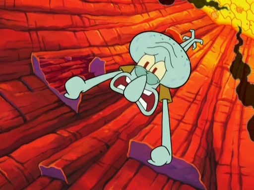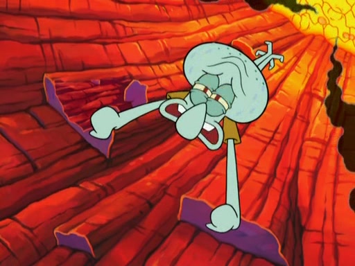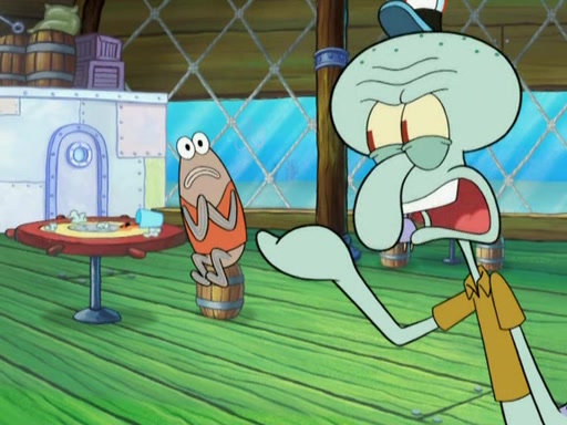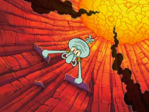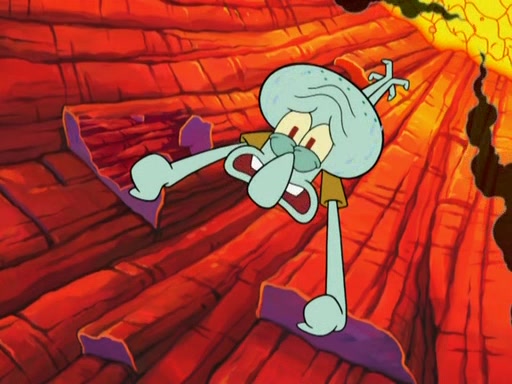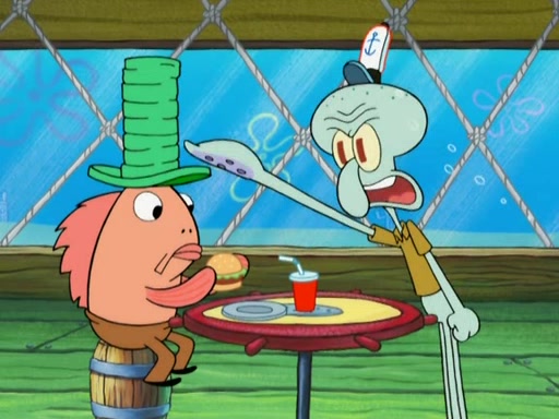 At the Krusty Krab, Squidward says "Pardon me!" to a purple fish while entering, then walks to the ounter and tells SpongeBob to stop staring at him. He then says he doesn't have time to count them when a fish tries to buy a Krabby Patty for $3 with a huge pile of pennies, comments at a blue fish eating a Krabby Patty tapping his foot on the floor, gets mad with Nat Peterson for holding the door, thinks people are leaving "trash" on the table, insults a frail woman's clattering dentures, and a red fish's tall hat. He even scolds a blue fish for taking too long to eat and another for taking too long in the bathroom. When SpongeBob passes by still singing about his attitude of gratitude, Squidward scolds him to stop. SpongeBob asks whether he has an "attitude of gratitude," but Squidward says that he is the most miserable person in Bikini Bottom and doubts it can get worse. Immediately afterwards, a previously dormant volcano erupts. Everybody in the Krusty Krab evacuates because it is falling to pieces. Mr. Krabs sees no point in trying to run away and demands Squidward's and SpongeBob's life essence after the cash register is destroyed until someone points out the shelter.