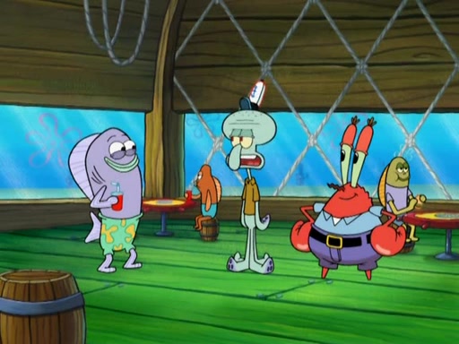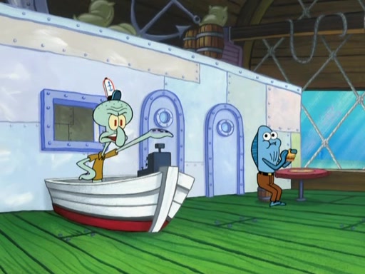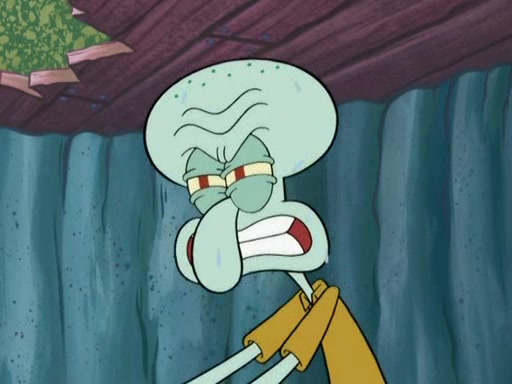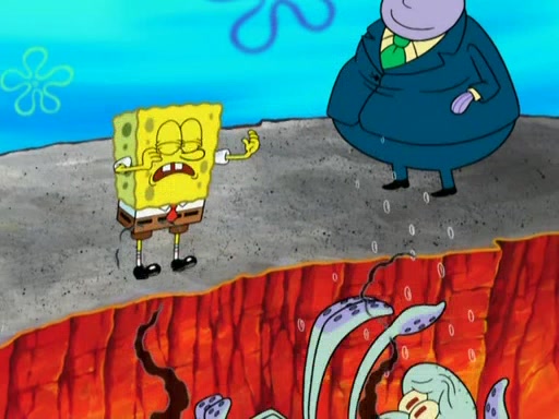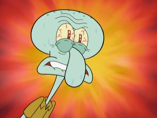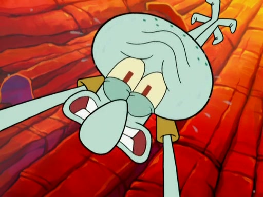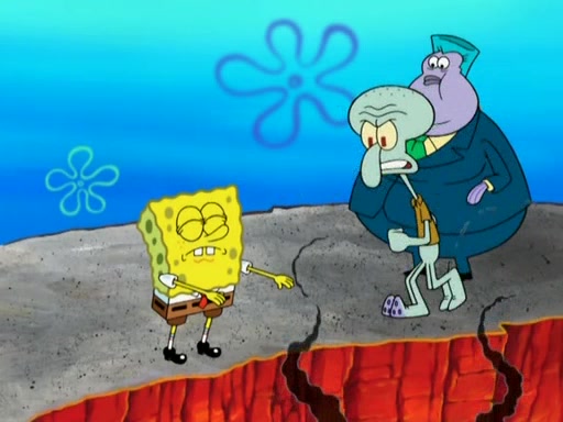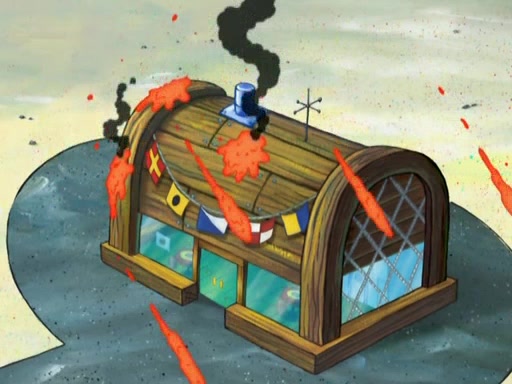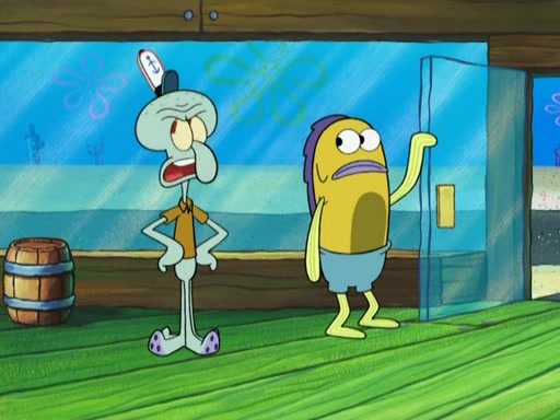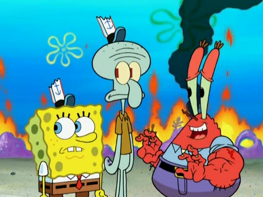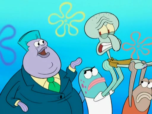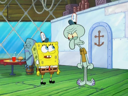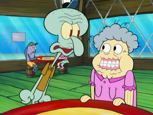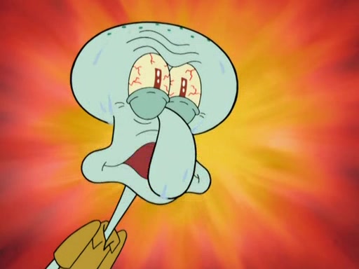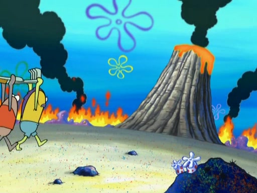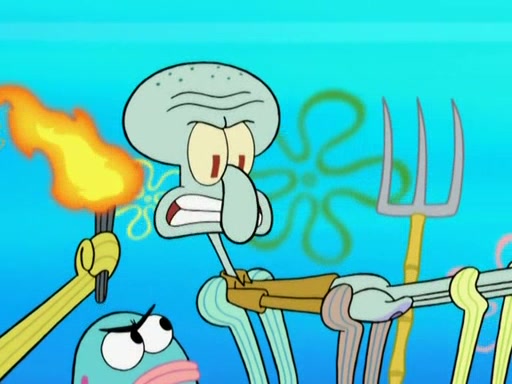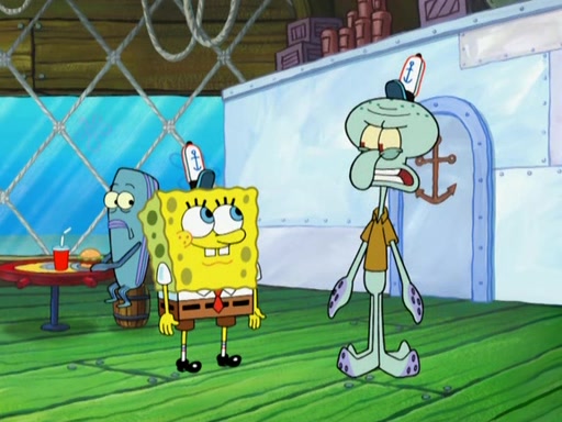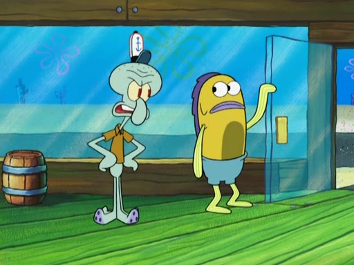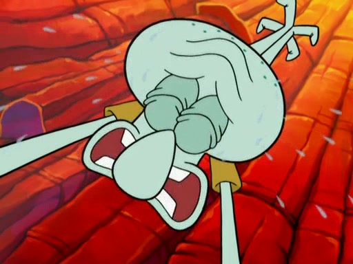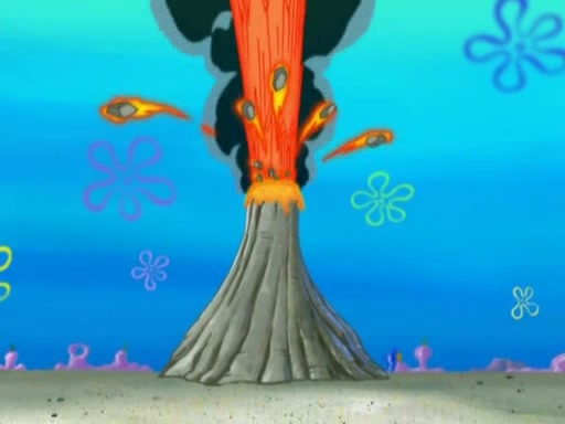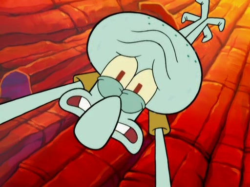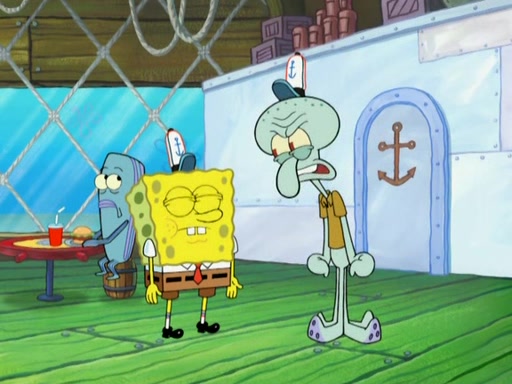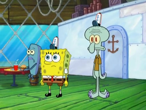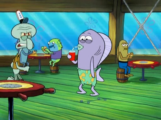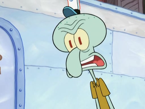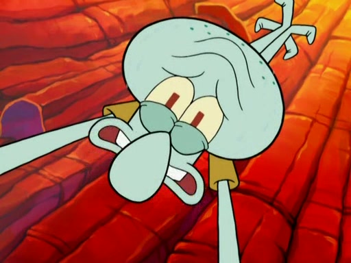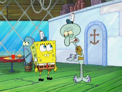 At the Krusty Krab, Squidward says "Pardon me!" to a purple fish while entering, then walks to the ounter and tells SpongeBob to stop staring at him. He then says he doesn't have time to count them when a fish tries to buy a Krabby Patty for $3 with a huge pile of pennies, comments at a blue fish eating a Krabby Patty tapping his foot on the floor, gets mad with Nat Peterson for holding the door, thinks people are leaving "trash" on the table, insults a frail woman's clattering dentures, and a red fish's tall hat. He even scolds a blue fish for taking too long to eat and another for taking too long in the bathroom. When SpongeBob passes by still singing about his attitude of gratitude, Squidward scolds him to stop. SpongeBob asks whether he has an "attitude of gratitude," but Squidward says that he is the most miserable person in Bikini Bottom and doubts it can get worse. Immediately afterwards, a previously dormant volcano erupts. Everybody in the Krusty Krab evacuates because it is falling to pieces. Mr. Krabs sees no point in trying to run away and demands Squidward's and SpongeBob's life essence after the cash register is destroyed until someone points out the shelter.