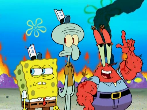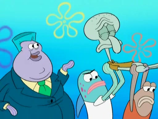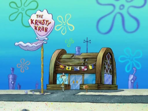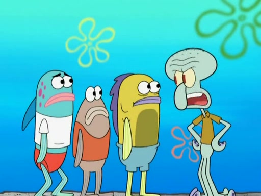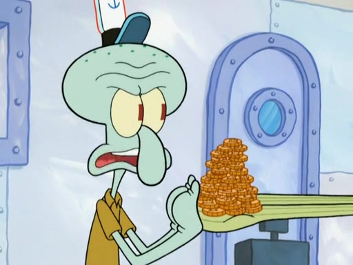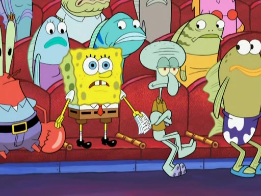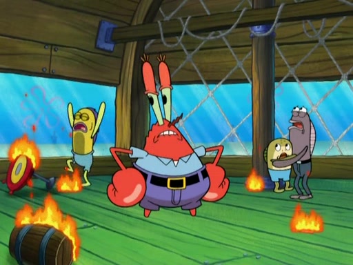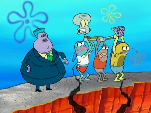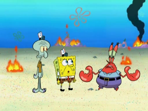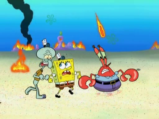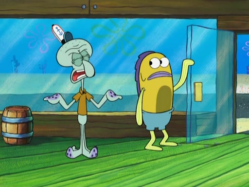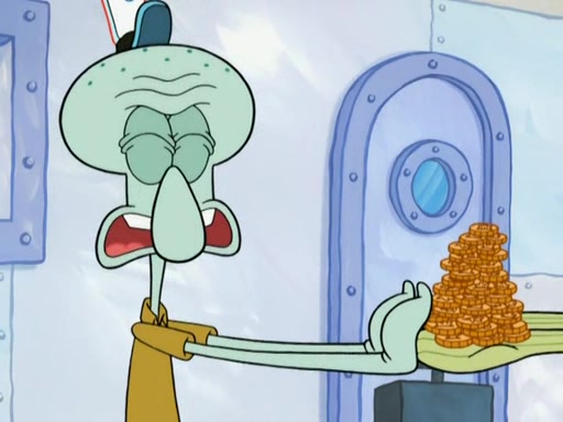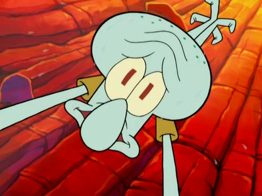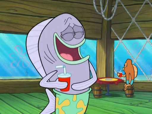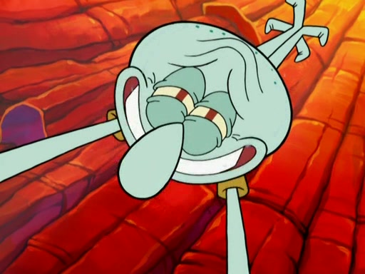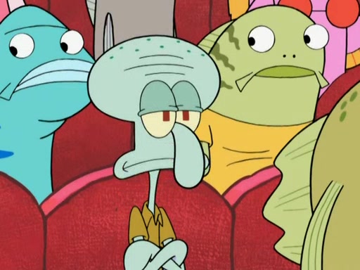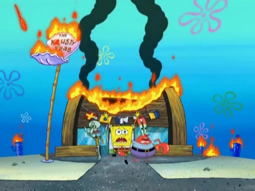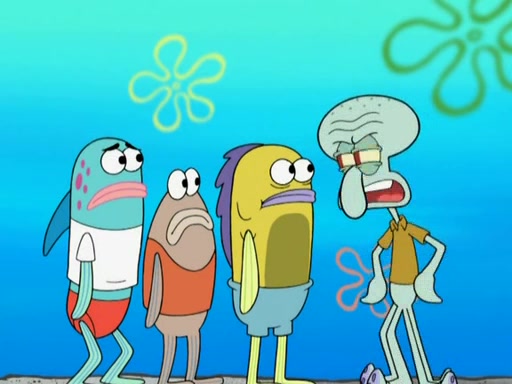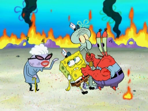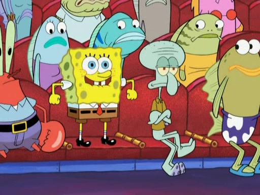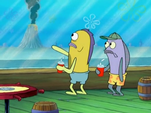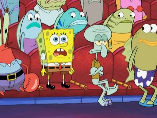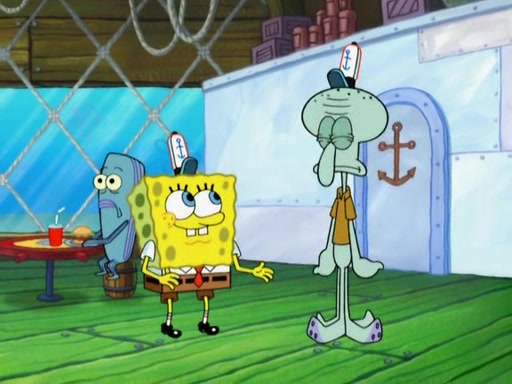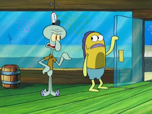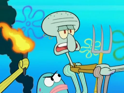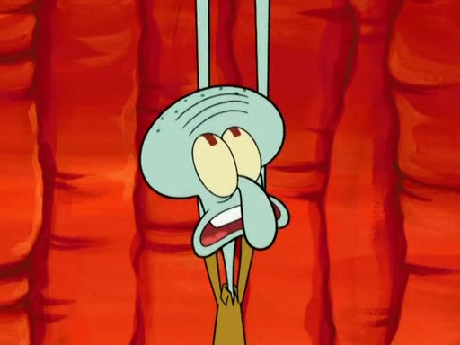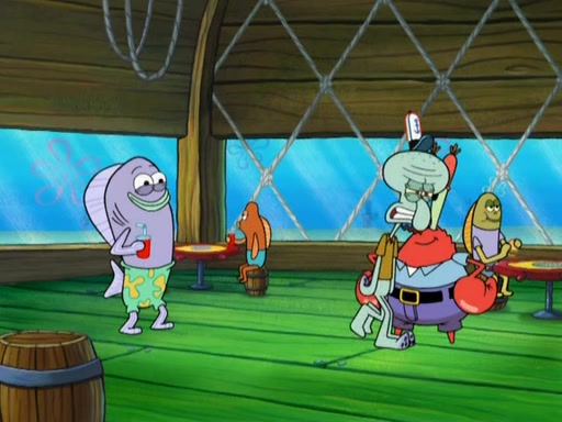 At the Krusty Krab, Squidward says "Pardon me!" to a purple fish while entering, then walks to the ounter and tells SpongeBob to stop staring at him. He then says he doesn't have time to count them when a fish tries to buy a Krabby Patty for $3 with a huge pile of pennies, comments at a blue fish eating a Krabby Patty tapping his foot on the floor, gets mad with Nat Peterson for holding the door, thinks people are leaving "trash" on the table, insults a frail woman's clattering dentures, and a red fish's tall hat. He even scolds a blue fish for taking too long to eat and another for taking too long in the bathroom. When SpongeBob passes by still singing about his attitude of gratitude, Squidward scolds him to stop. SpongeBob asks whether he has an "attitude of gratitude," but Squidward says that he is the most miserable person in Bikini Bottom and doubts it can get worse. Immediately afterwards, a previously dormant volcano erupts. Everybody in the Krusty Krab evacuates because it is falling to pieces. Mr. Krabs sees no point in trying to run away and demands Squidward's and SpongeBob's life essence after the cash register is destroyed until someone points out the shelter.