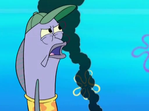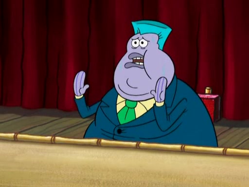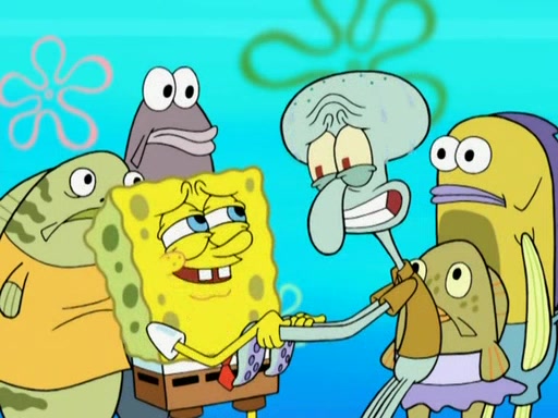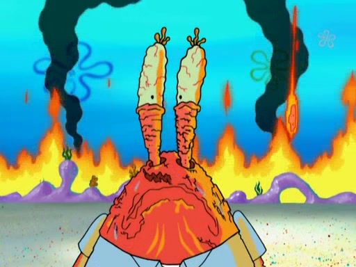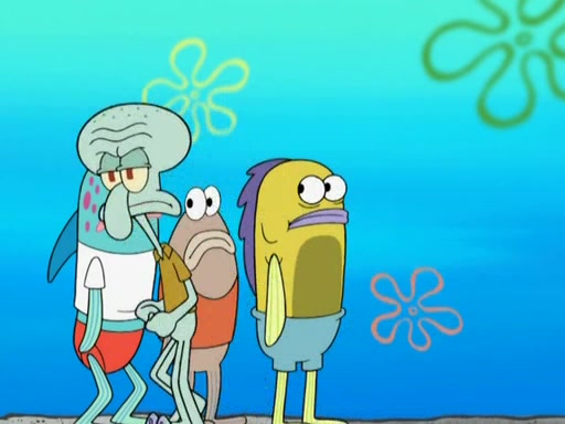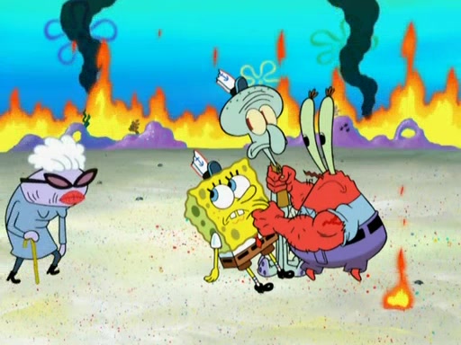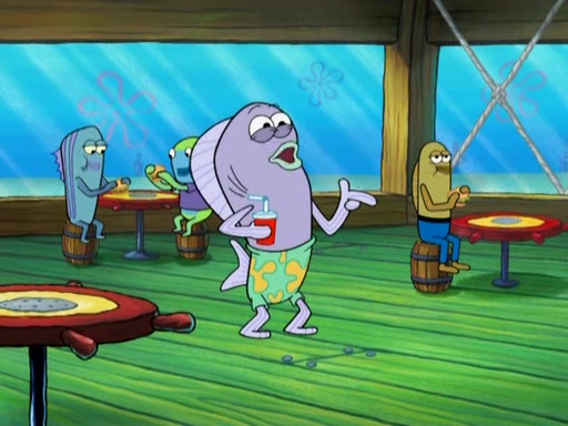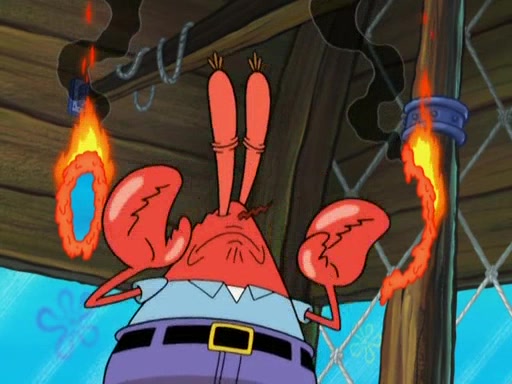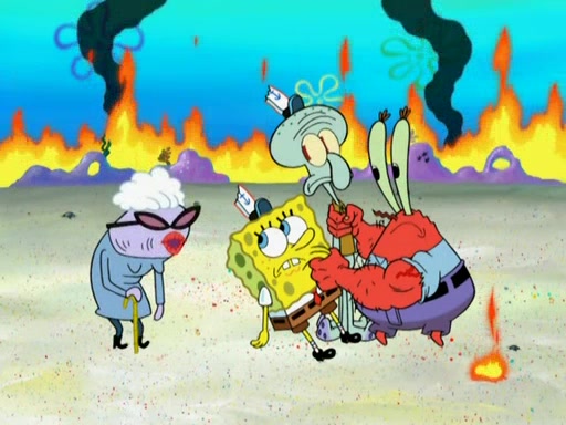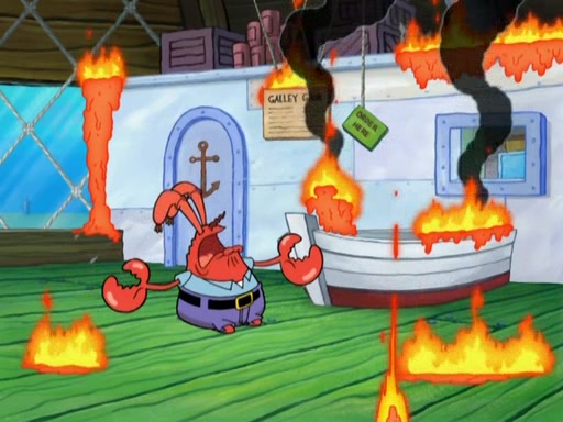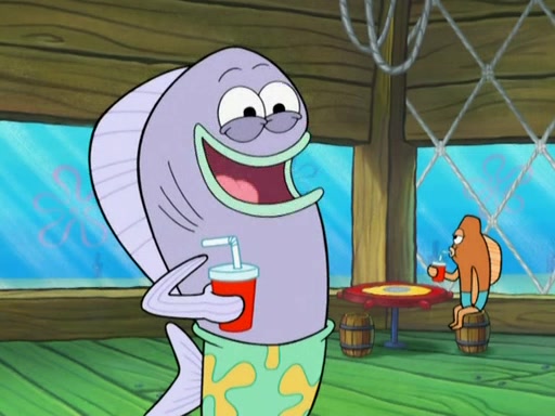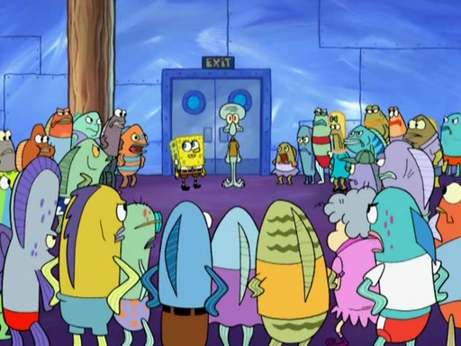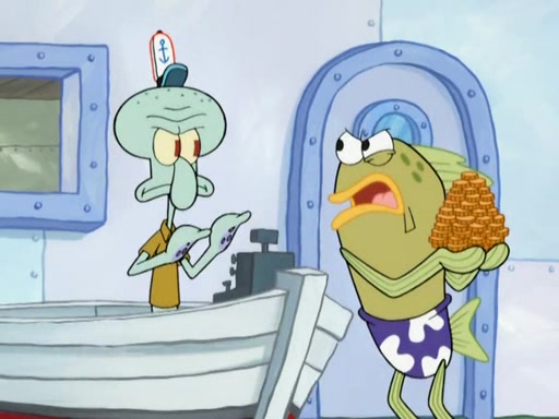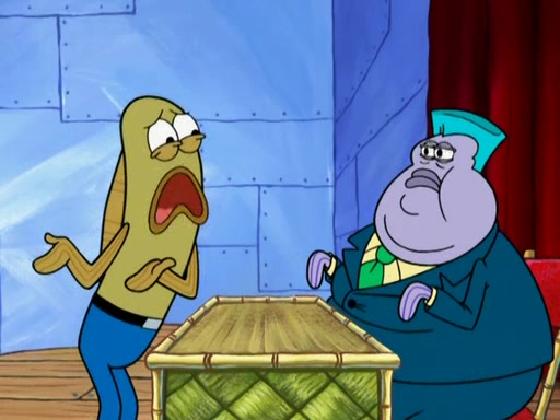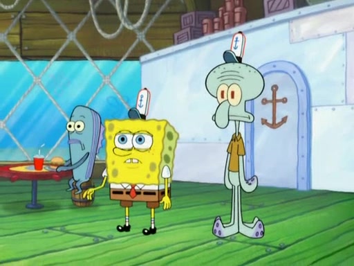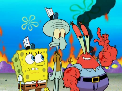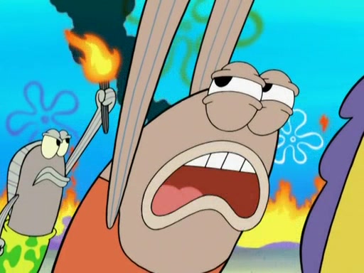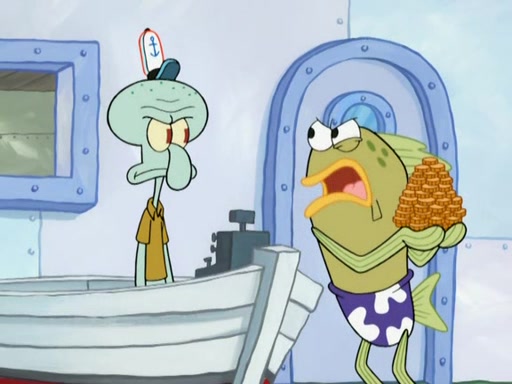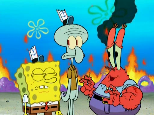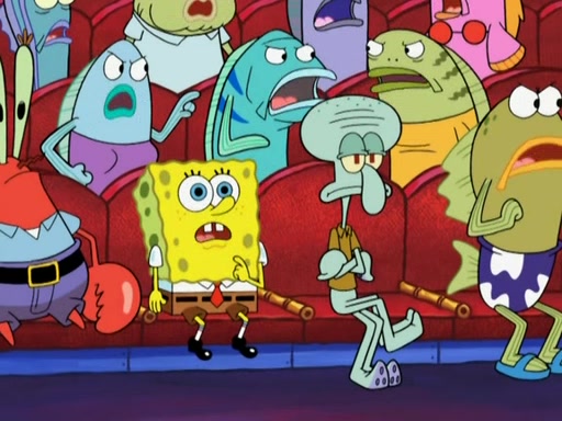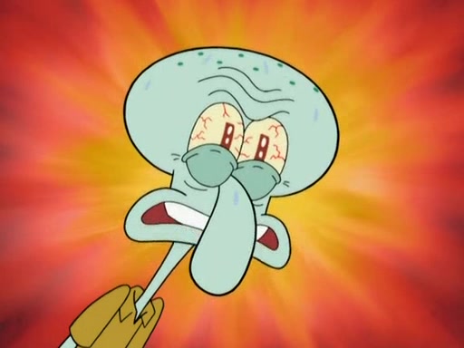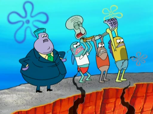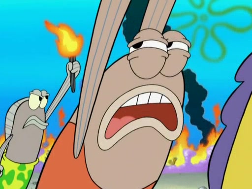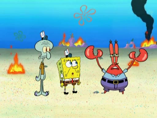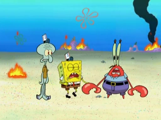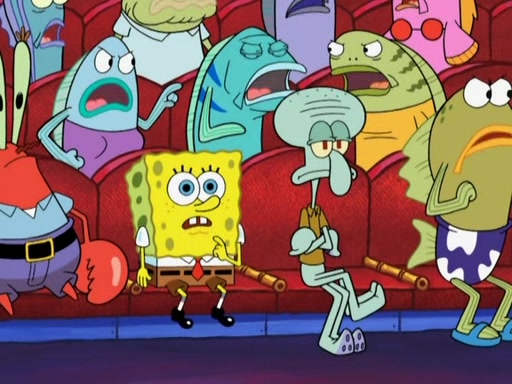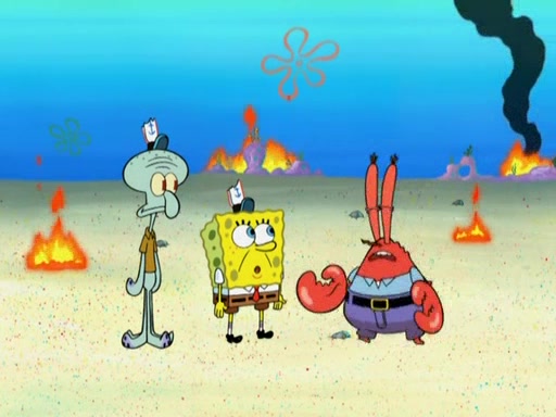 At the Krusty Krab, Squidward says "Pardon me!" to a purple fish while entering, then walks to the ounter and tells SpongeBob to stop staring at him. He then says he doesn't have time to count them when a fish tries to buy a Krabby Patty for $3 with a huge pile of pennies, comments at a blue fish eating a Krabby Patty tapping his foot on the floor, gets mad with Nat Peterson for holding the door, thinks people are leaving "trash" on the table, insults a frail woman's clattering dentures, and a red fish's tall hat. He even scolds a blue fish for taking too long to eat and another for taking too long in the bathroom. When SpongeBob passes by still singing about his attitude of gratitude, Squidward scolds him to stop. SpongeBob asks whether he has an "attitude of gratitude," but Squidward says that he is the most miserable person in Bikini Bottom and doubts it can get worse. Immediately afterwards, a previously dormant volcano erupts. Everybody in the Krusty Krab evacuates because it is falling to pieces. Mr. Krabs sees no point in trying to run away and demands Squidward's and SpongeBob's life essence after the cash register is destroyed until someone points out the shelter.