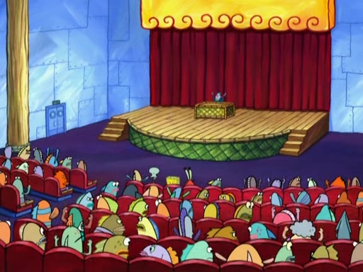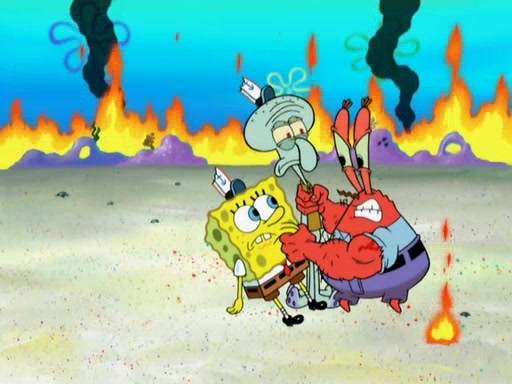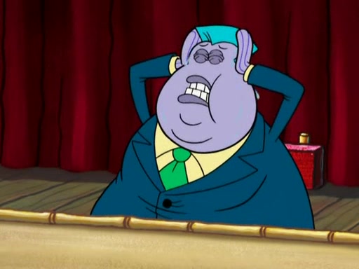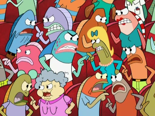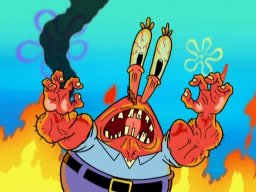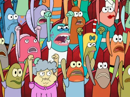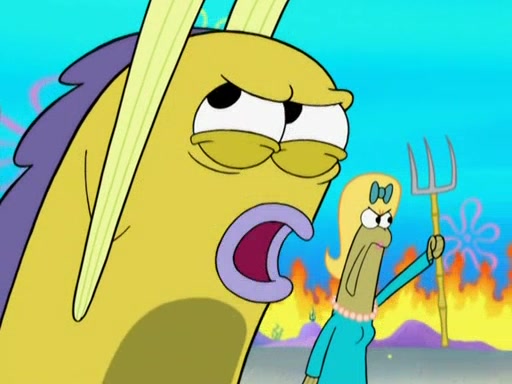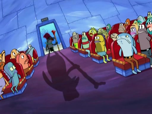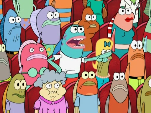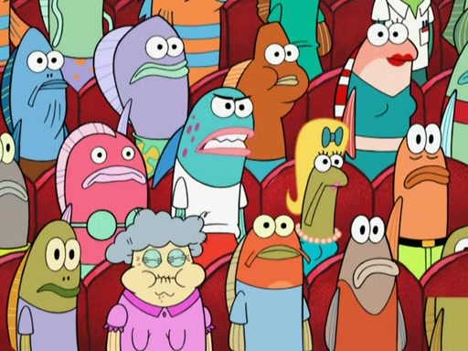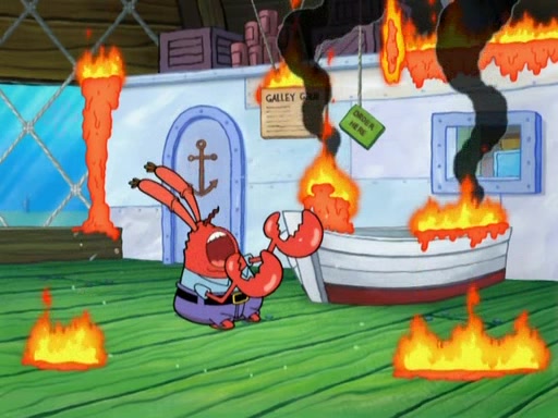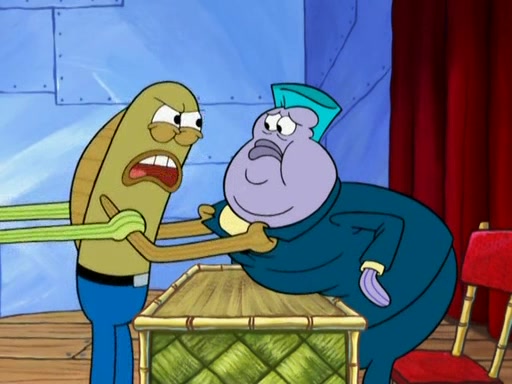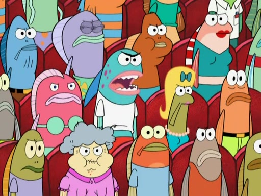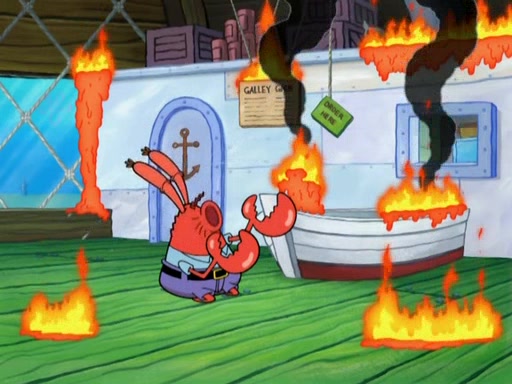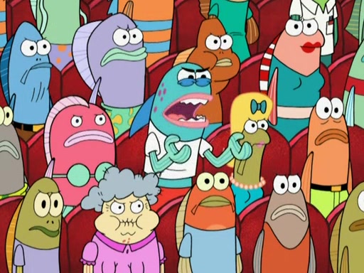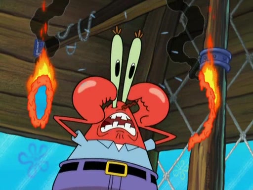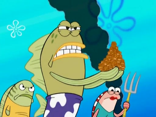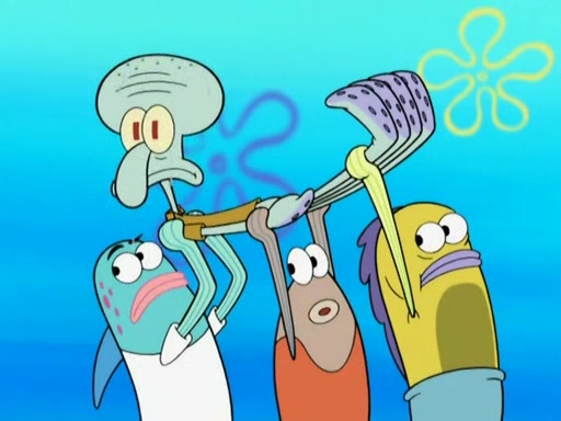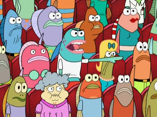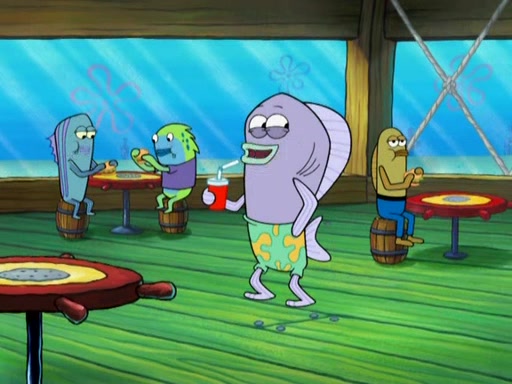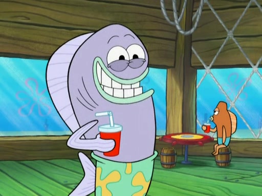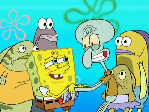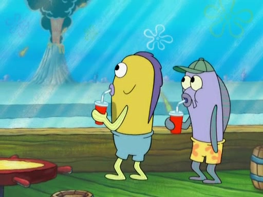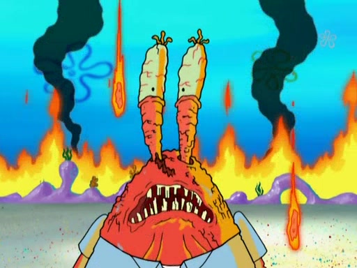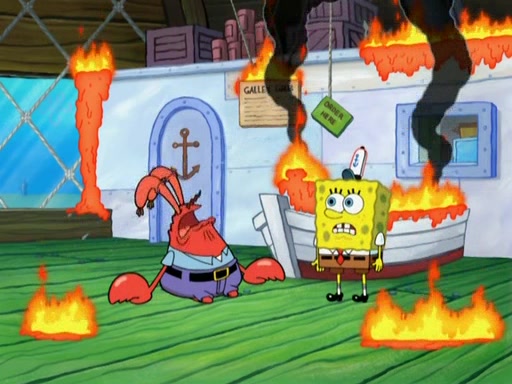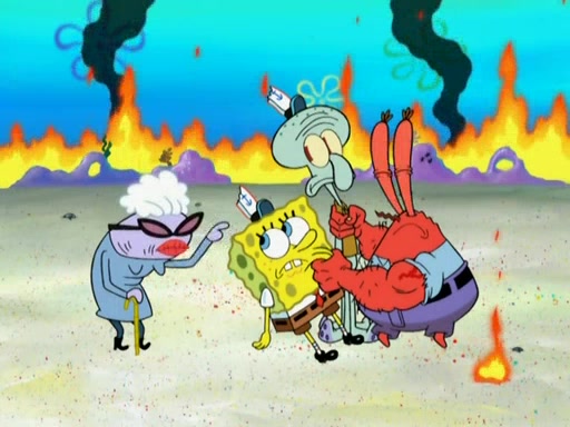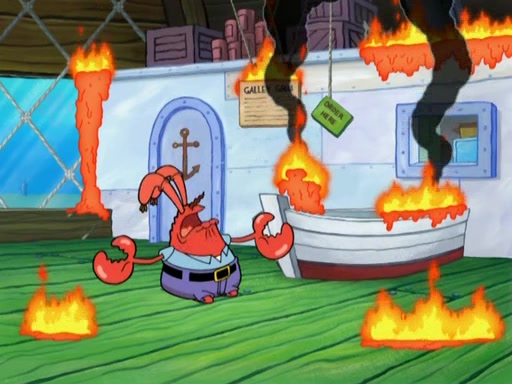 At the Krusty Krab, Squidward says "Pardon me!" to a purple fish while entering, then walks to the ounter and tells SpongeBob to stop staring at him. He then says he doesn't have time to count them when a fish tries to buy a Krabby Patty for $3 with a huge pile of pennies, comments at a blue fish eating a Krabby Patty tapping his foot on the floor, gets mad with Nat Peterson for holding the door, thinks people are leaving "trash" on the table, insults a frail woman's clattering dentures, and a red fish's tall hat. He even scolds a blue fish for taking too long to eat and another for taking too long in the bathroom. When SpongeBob passes by still singing about his attitude of gratitude, Squidward scolds him to stop. SpongeBob asks whether he has an "attitude of gratitude," but Squidward says that he is the most miserable person in Bikini Bottom and doubts it can get worse. Immediately afterwards, a previously dormant volcano erupts. Everybody in the Krusty Krab evacuates because it is falling to pieces. Mr. Krabs sees no point in trying to run away and demands Squidward's and SpongeBob's life essence after the cash register is destroyed until someone points out the shelter.