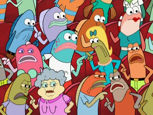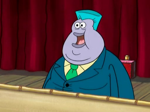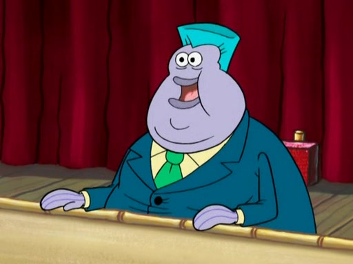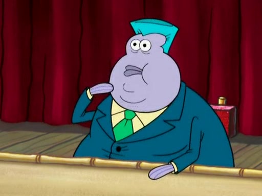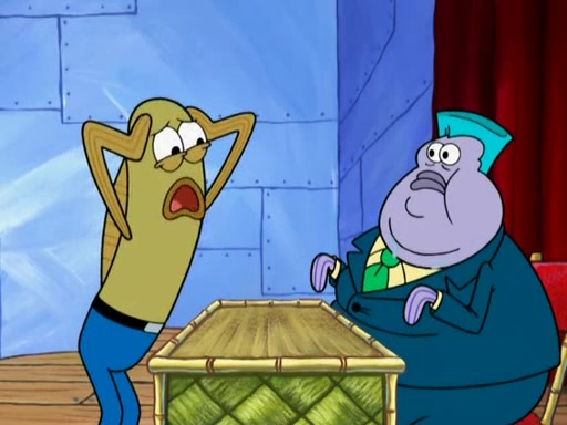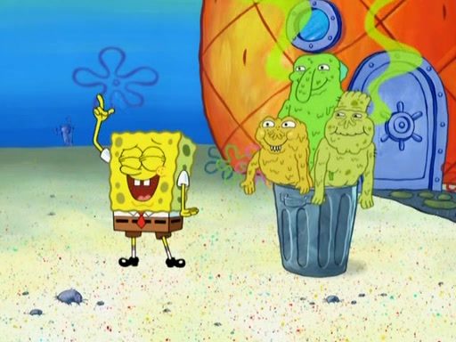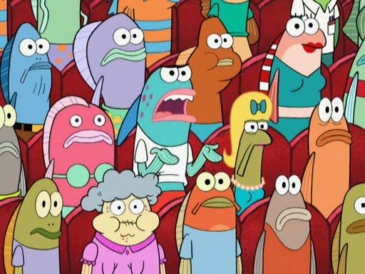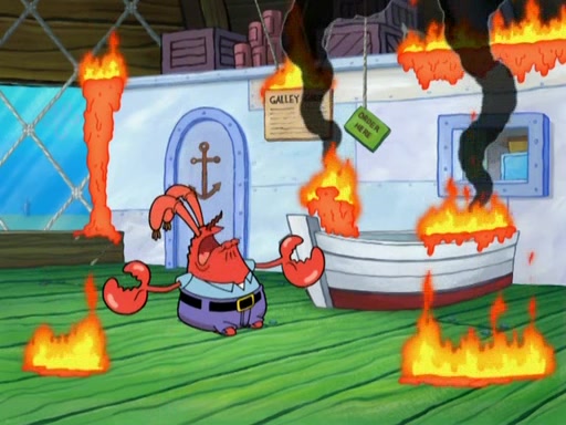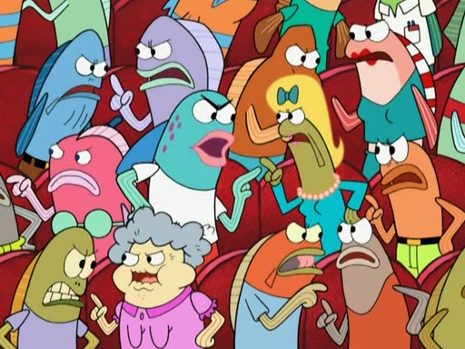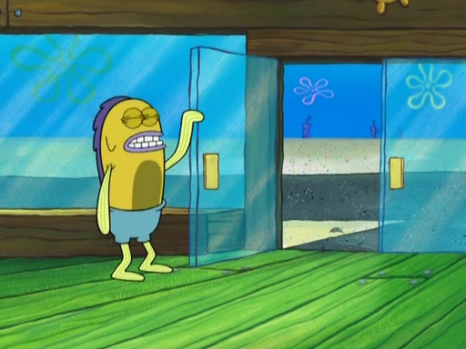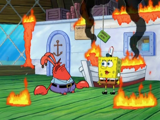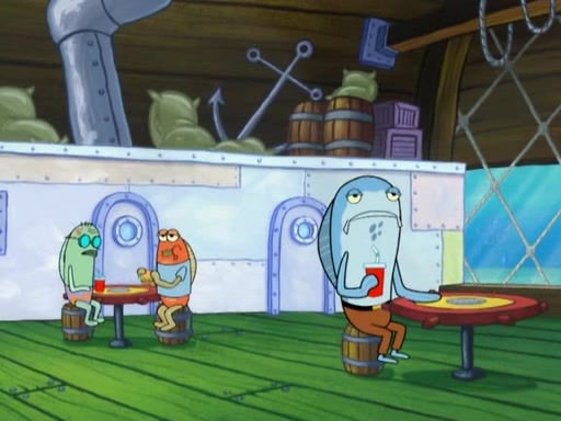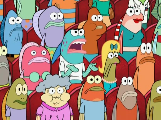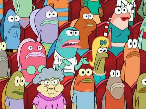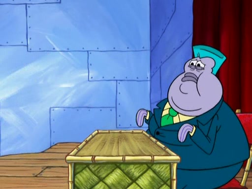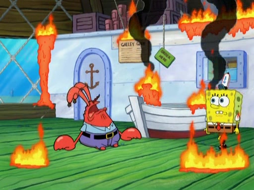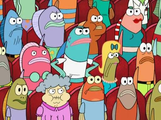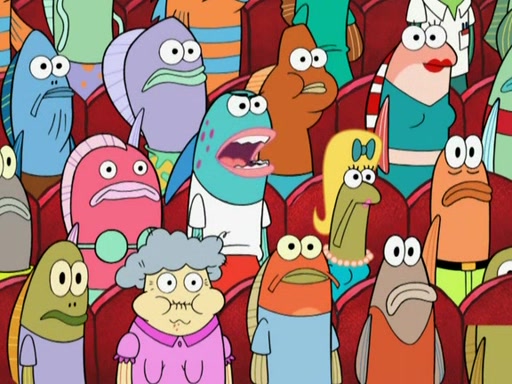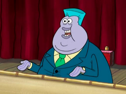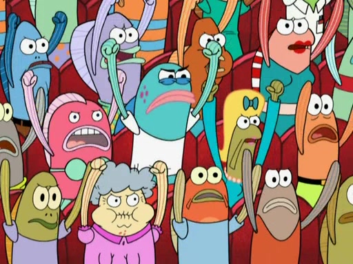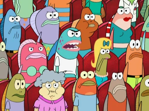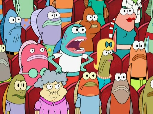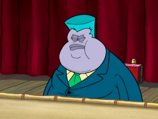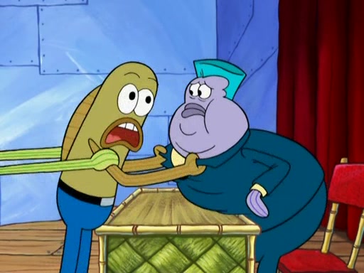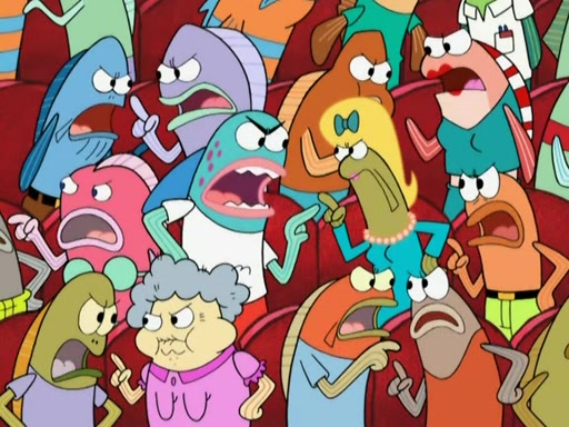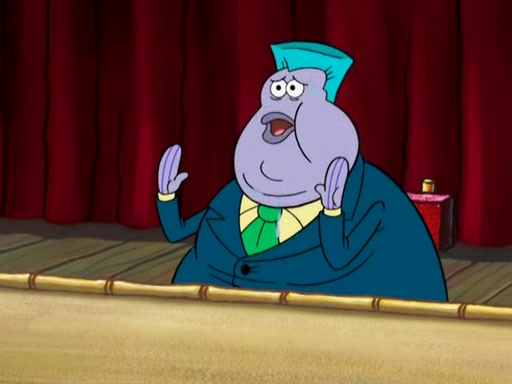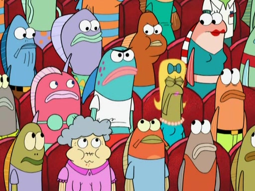 At the Krusty Krab, Squidward says "Pardon me!" to a purple fish while entering, then walks to the ounter and tells SpongeBob to stop staring at him. He then says he doesn't have time to count them when a fish tries to buy a Krabby Patty for $3 with a huge pile of pennies, comments at a blue fish eating a Krabby Patty tapping his foot on the floor, gets mad with Nat Peterson for holding the door, thinks people are leaving "trash" on the table, insults a frail woman's clattering dentures, and a red fish's tall hat. He even scolds a blue fish for taking too long to eat and another for taking too long in the bathroom. When SpongeBob passes by still singing about his attitude of gratitude, Squidward scolds him to stop. SpongeBob asks whether he has an "attitude of gratitude," but Squidward says that he is the most miserable person in Bikini Bottom and doubts it can get worse. Immediately afterwards, a previously dormant volcano erupts. Everybody in the Krusty Krab evacuates because it is falling to pieces. Mr. Krabs sees no point in trying to run away and demands Squidward's and SpongeBob's life essence after the cash register is destroyed until someone points out the shelter.