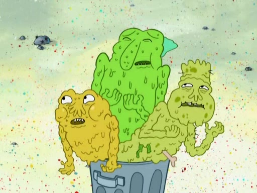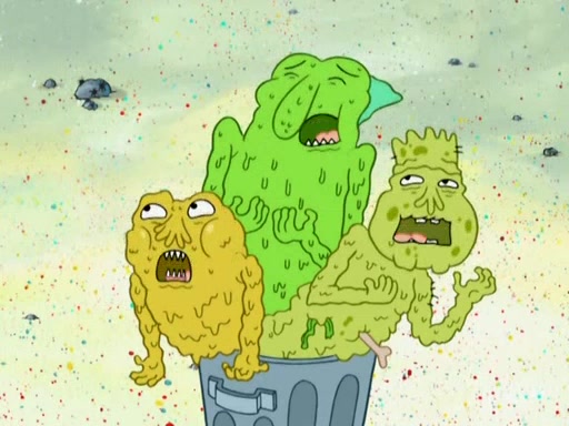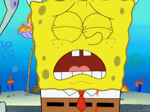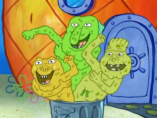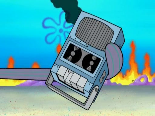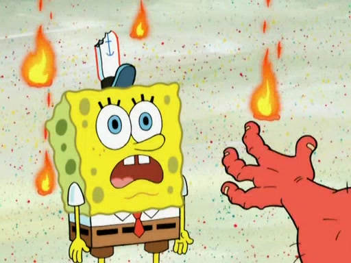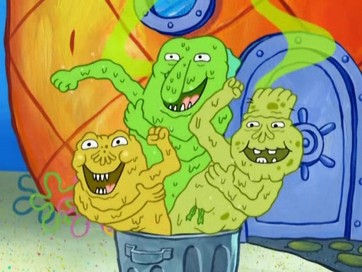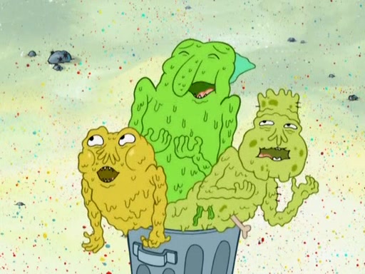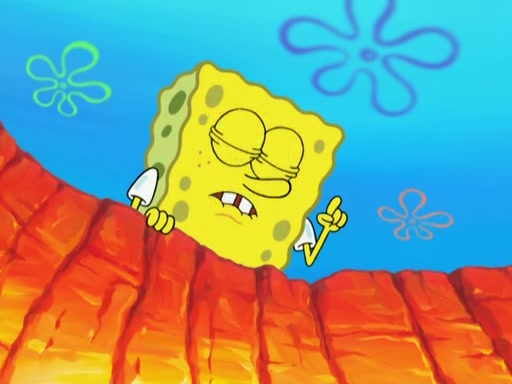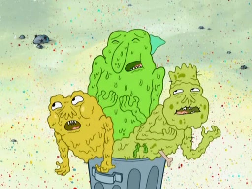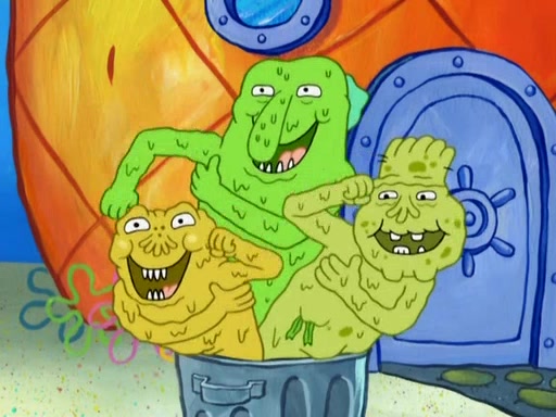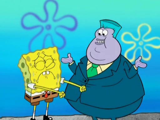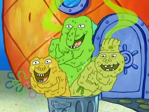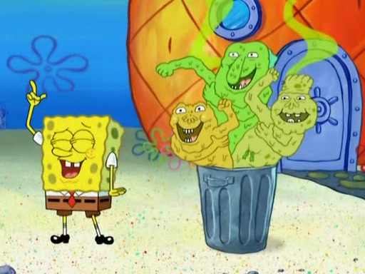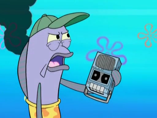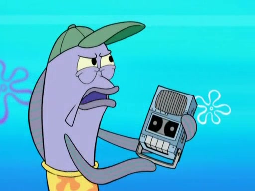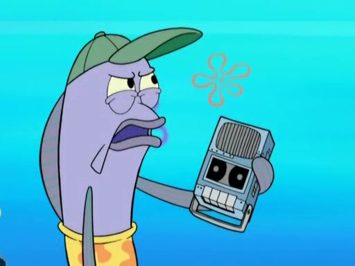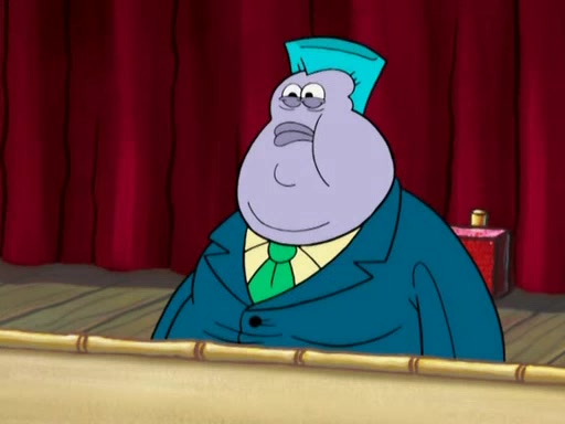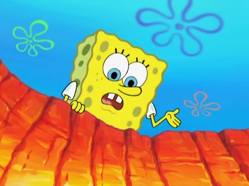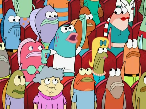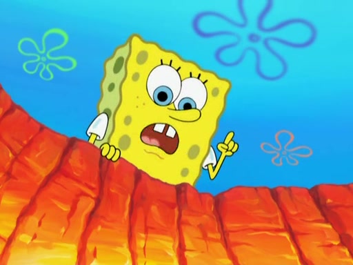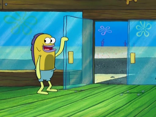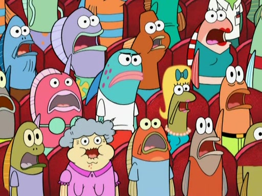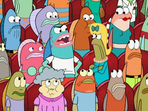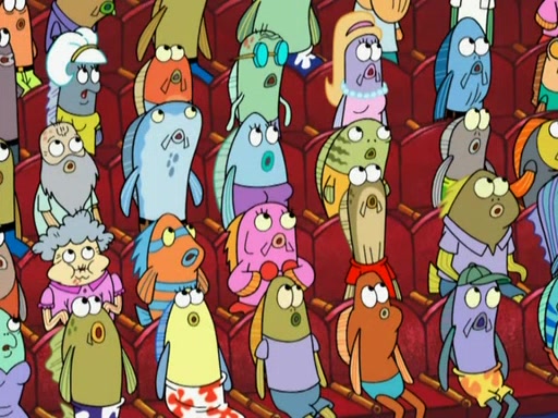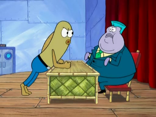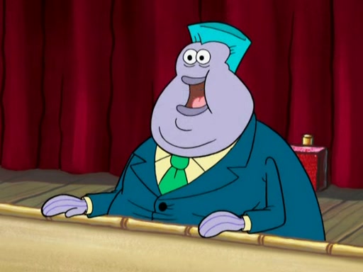 At the Krusty Krab, Squidward says "Pardon me!" to a purple fish while entering, then walks to the ounter and tells SpongeBob to stop staring at him. He then says he doesn't have time to count them when a fish tries to buy a Krabby Patty for $3 with a huge pile of pennies, comments at a blue fish eating a Krabby Patty tapping his foot on the floor, gets mad with Nat Peterson for holding the door, thinks people are leaving "trash" on the table, insults a frail woman's clattering dentures, and a red fish's tall hat. He even scolds a blue fish for taking too long to eat and another for taking too long in the bathroom. When SpongeBob passes by still singing about his attitude of gratitude, Squidward scolds him to stop. SpongeBob asks whether he has an "attitude of gratitude," but Squidward says that he is the most miserable person in Bikini Bottom and doubts it can get worse. Immediately afterwards, a previously dormant volcano erupts. Everybody in the Krusty Krab evacuates because it is falling to pieces. Mr. Krabs sees no point in trying to run away and demands Squidward's and SpongeBob's life essence after the cash register is destroyed until someone points out the shelter.