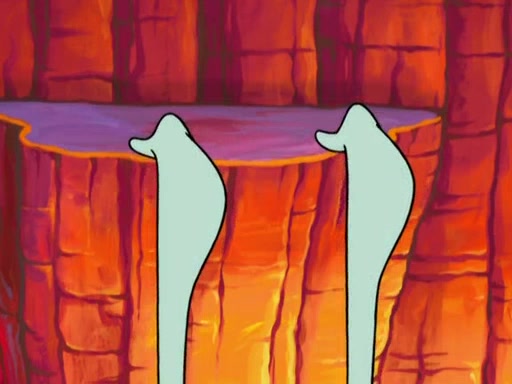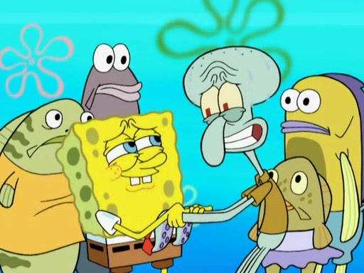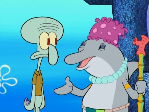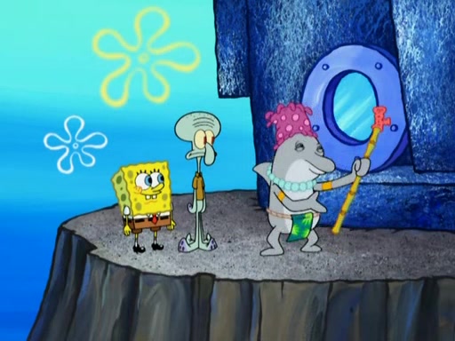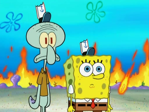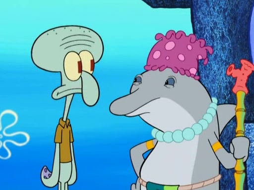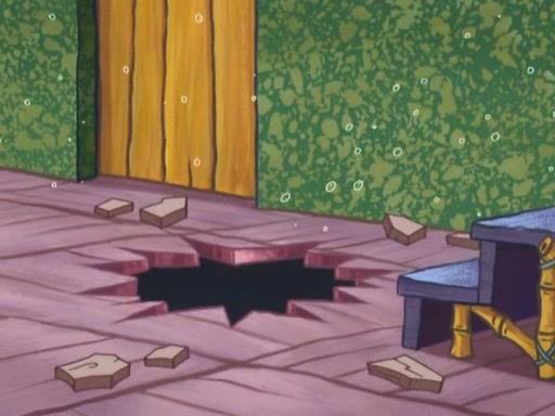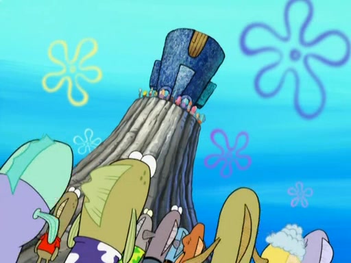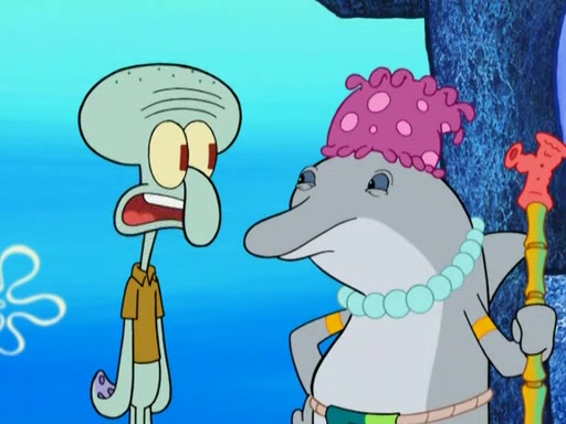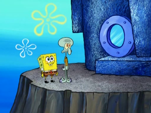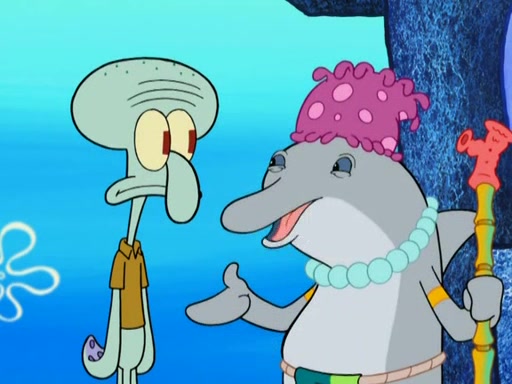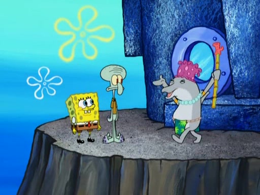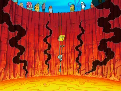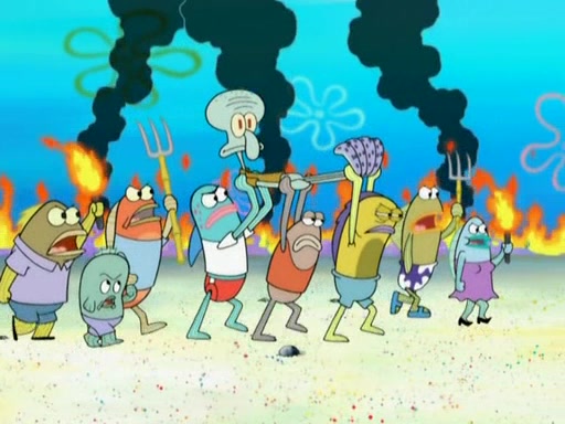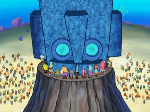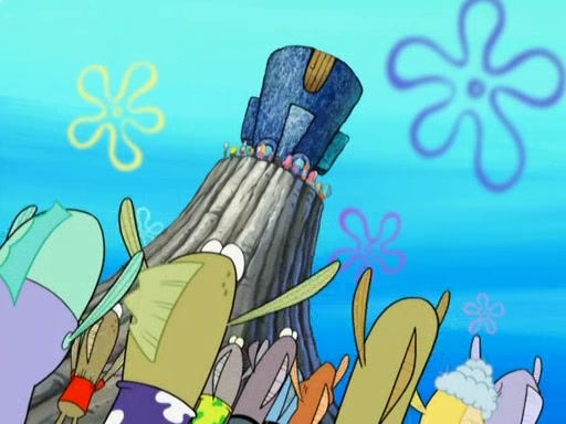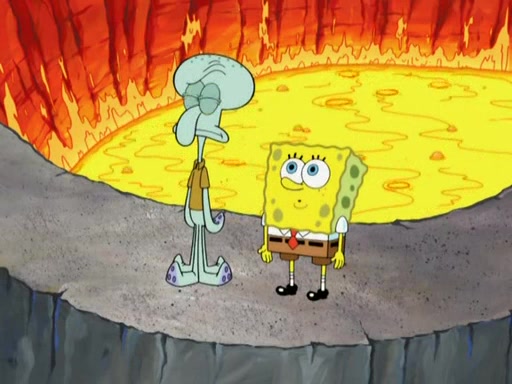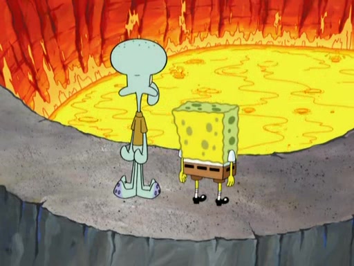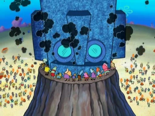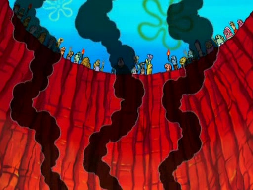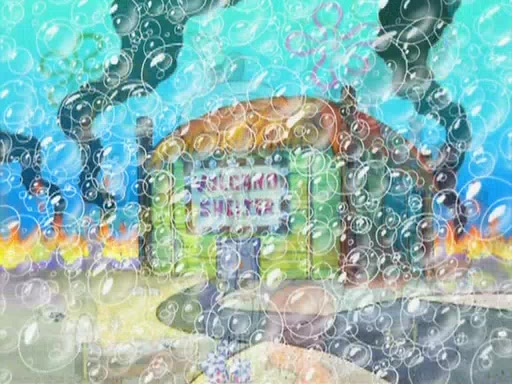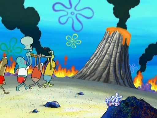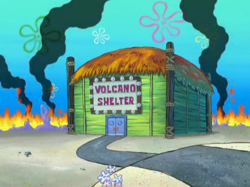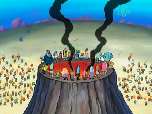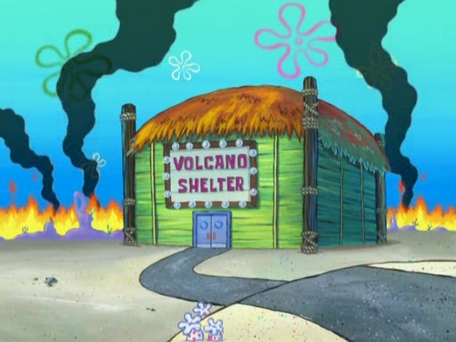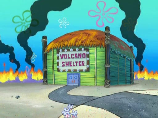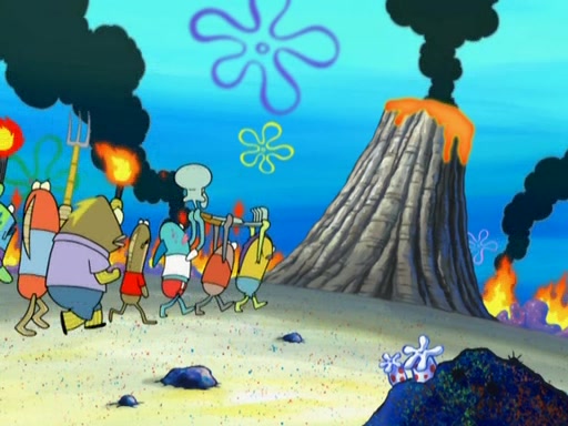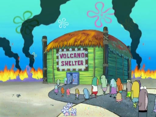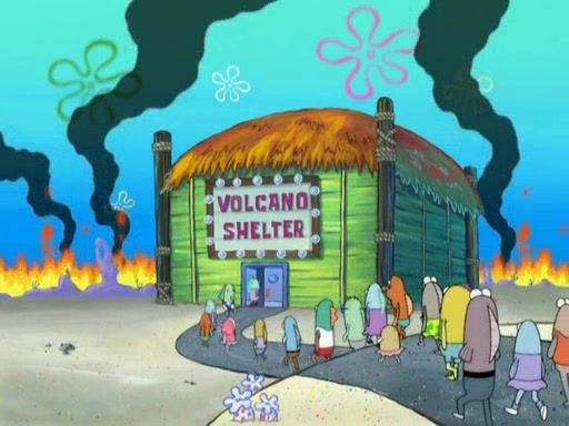 In the shelter, the mayor is trying to calm everyone, but they won't stop worrying. When the mayor also thinks that Bikini Bottom is doomed, a mysterious dolphin warrior comes in and says that they must sacrifice the most miserable person. When Squidward goes towards the door, SpongeBob says that they must find the most miserable person, but Squidward mocks him. They then realize Squidward is the most miserable person, so they attempt to sacrifice him. Before they throw him in the volcano alive, SpongeBob offers to be thrown in because he made Squidward miserable. Squidward accidentally falls off a ledge and asks SpongeBob to help him. When SpongeBob reminds him of his promise, Squidward takes it back and SpongeBob saves him. Meanwhile, the pipe at Squidward's house has built up so much water that it sends the house flying, and it falls into the volcano. The dolphin then says that he was going to say that the most miserable person's HOUSE must be sacrificed, and the people are once again calmed; except for Squidward, who now has no roof to sleep under. SpongeBob then lets Squidward sleep under his pineapple.