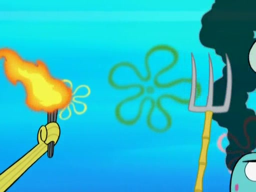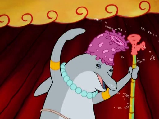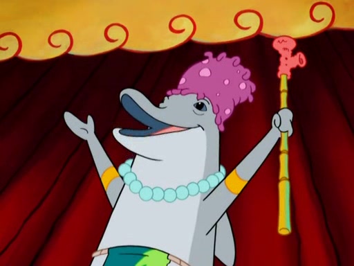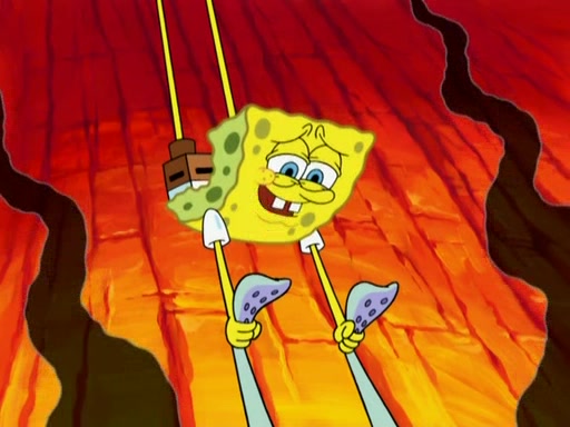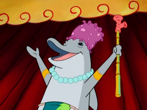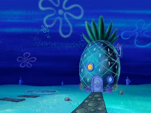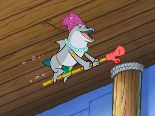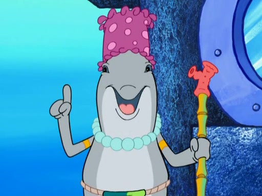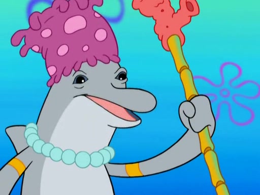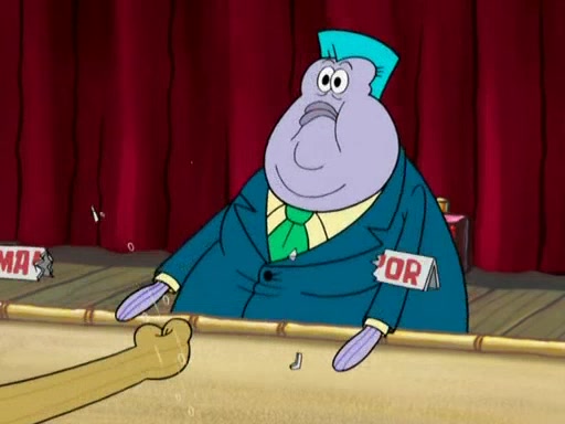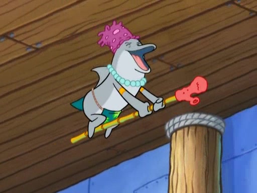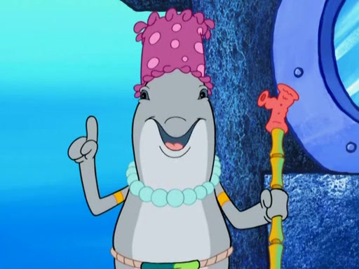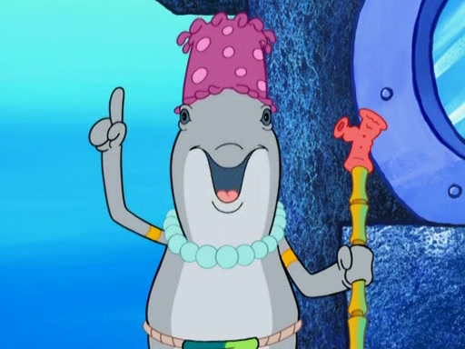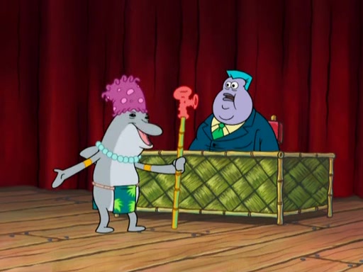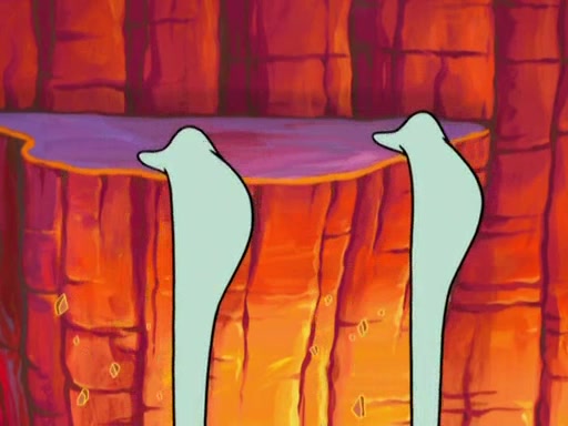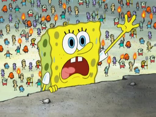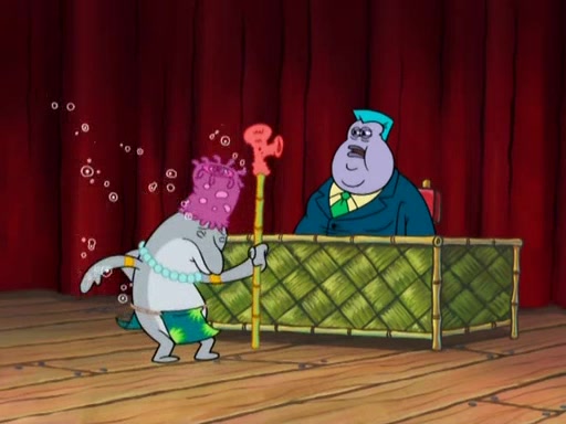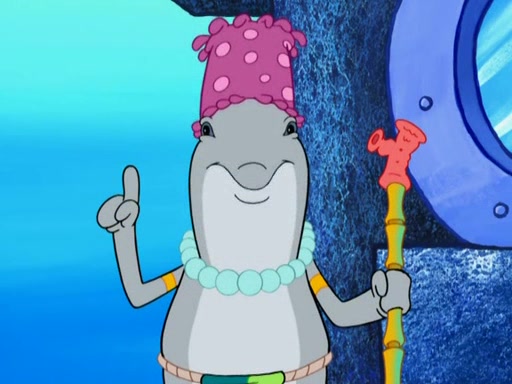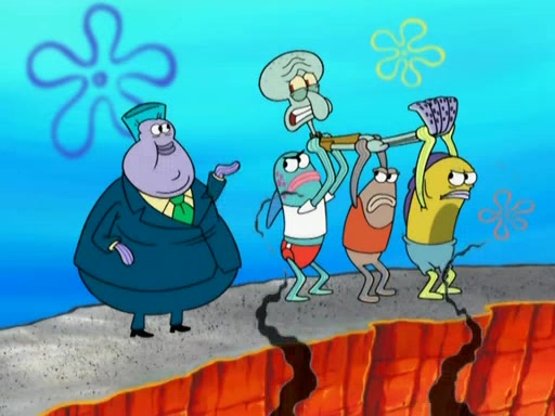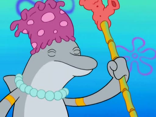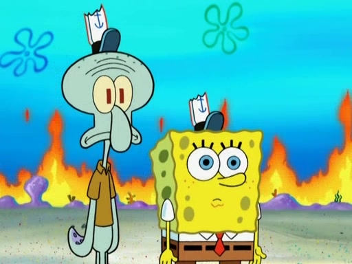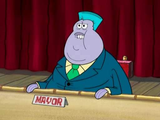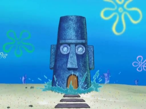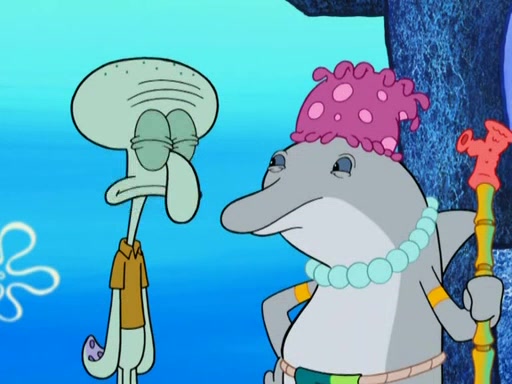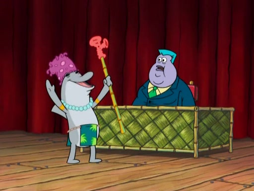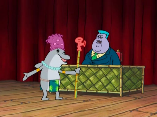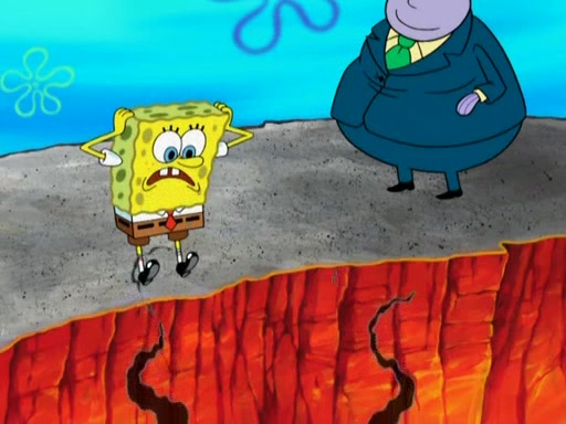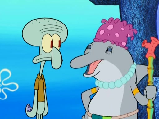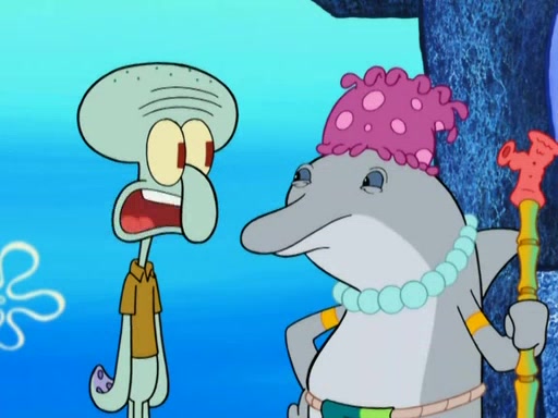 In the shelter, the mayor is trying to calm everyone, but they won't stop worrying. When the mayor also thinks that Bikini Bottom is doomed, a mysterious dolphin warrior comes in and says that they must sacrifice the most miserable person. When Squidward goes towards the door, SpongeBob says that they must find the most miserable person, but Squidward mocks him. They then realize Squidward is the most miserable person, so they attempt to sacrifice him. Before they throw him in the volcano alive, SpongeBob offers to be thrown in because he made Squidward miserable. Squidward accidentally falls off a ledge and asks SpongeBob to help him. When SpongeBob reminds him of his promise, Squidward takes it back and SpongeBob saves him. Meanwhile, the pipe at Squidward's house has built up so much water that it sends the house flying, and it falls into the volcano. The dolphin then says that he was going to say that the most miserable person's HOUSE must be sacrificed, and the people are once again calmed; except for Squidward, who now has no roof to sleep under. SpongeBob then lets Squidward sleep under his pineapple.