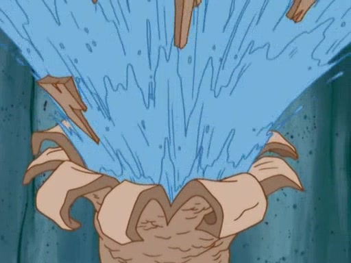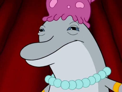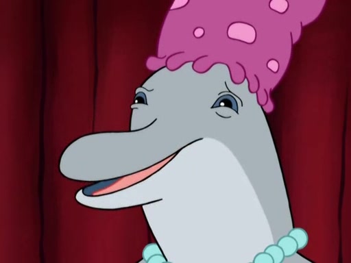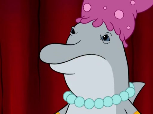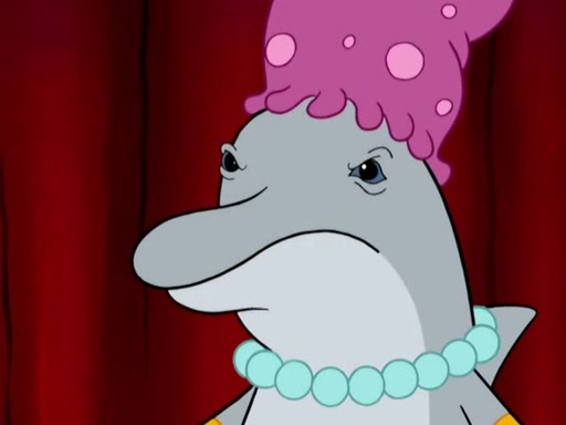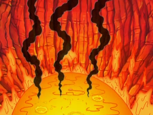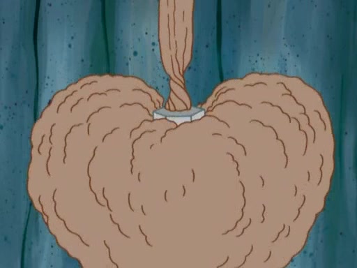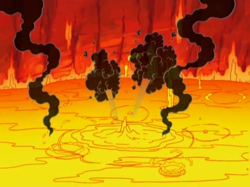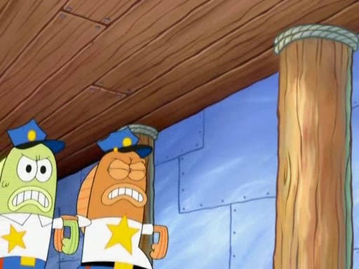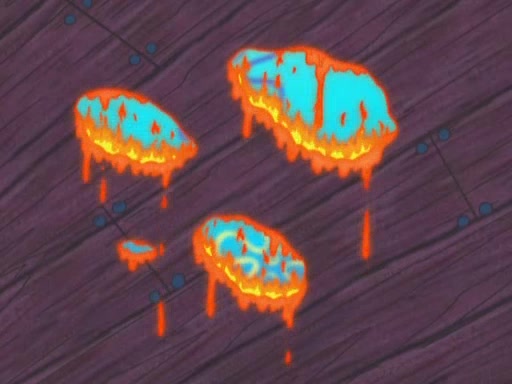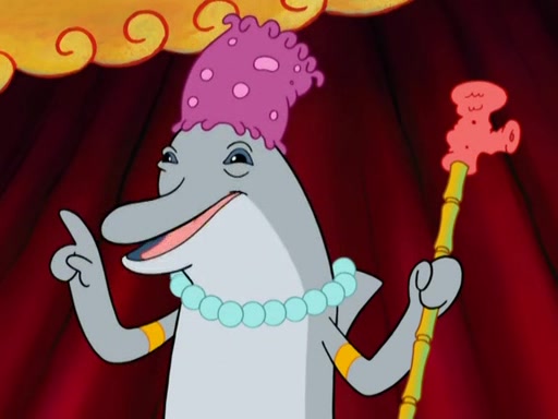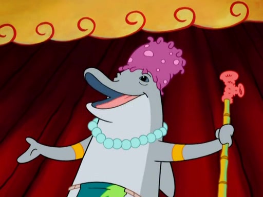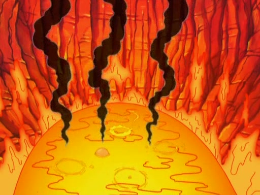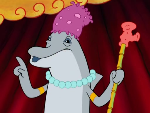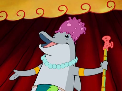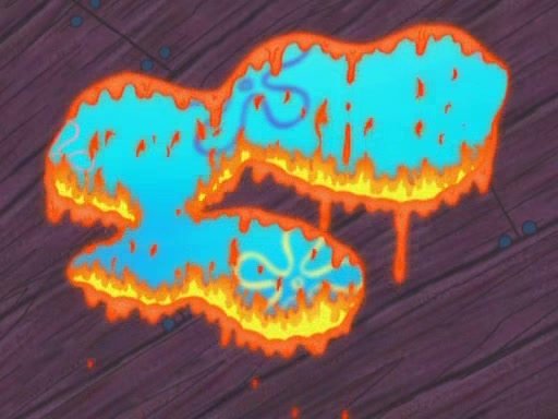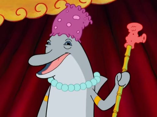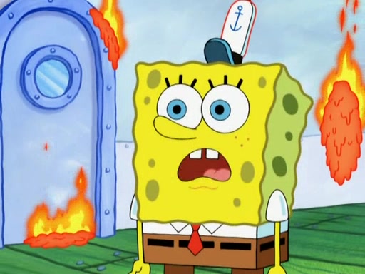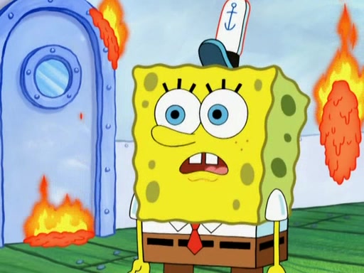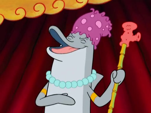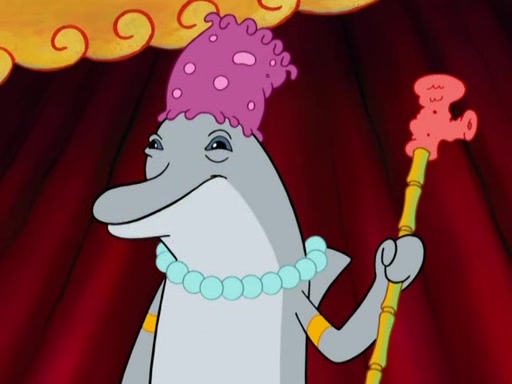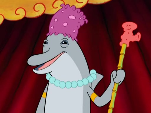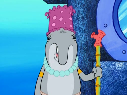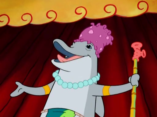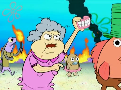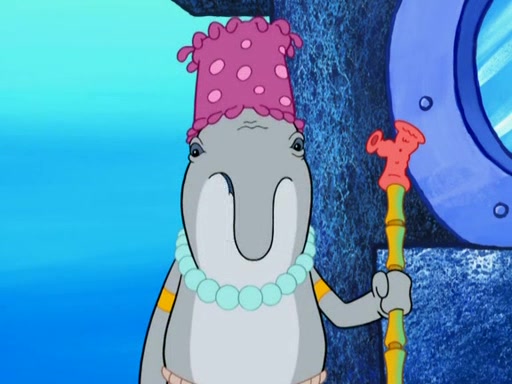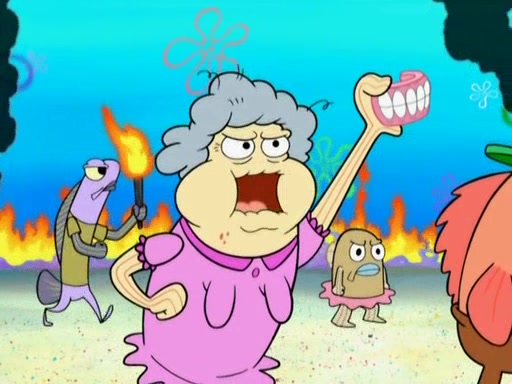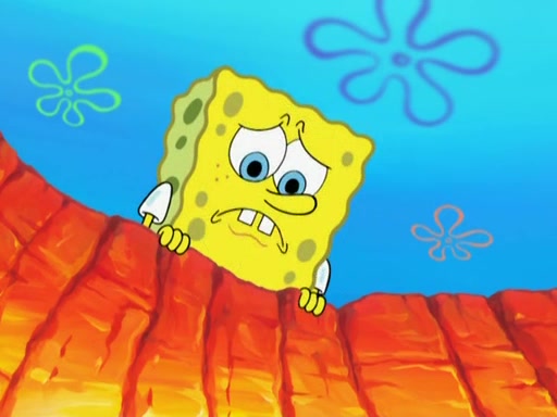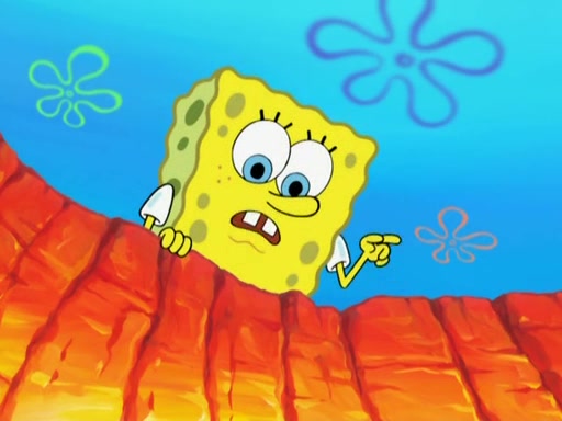 In the shelter, the mayor is trying to calm everyone, but they won't stop worrying. When the mayor also thinks that Bikini Bottom is doomed, a mysterious dolphin warrior comes in and says that they must sacrifice the most miserable person. When Squidward goes towards the door, SpongeBob says that they must find the most miserable person, but Squidward mocks him. They then realize Squidward is the most miserable person, so they attempt to sacrifice him. Before they throw him in the volcano alive, SpongeBob offers to be thrown in because he made Squidward miserable. Squidward accidentally falls off a ledge and asks SpongeBob to help him. When SpongeBob reminds him of his promise, Squidward takes it back and SpongeBob saves him. Meanwhile, the pipe at Squidward's house has built up so much water that it sends the house flying, and it falls into the volcano. The dolphin then says that he was going to say that the most miserable person's HOUSE must be sacrificed, and the people are once again calmed; except for Squidward, who now has no roof to sleep under. SpongeBob then lets Squidward sleep under his pineapple.