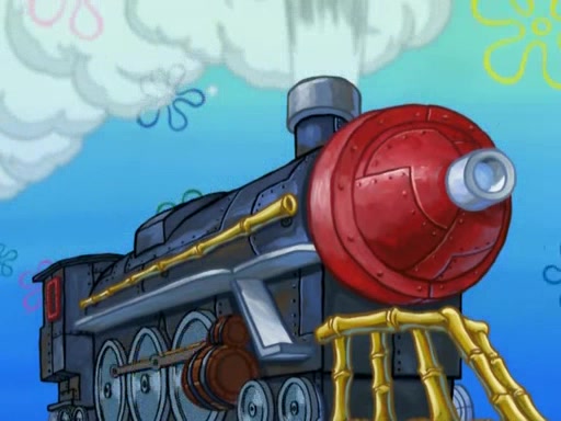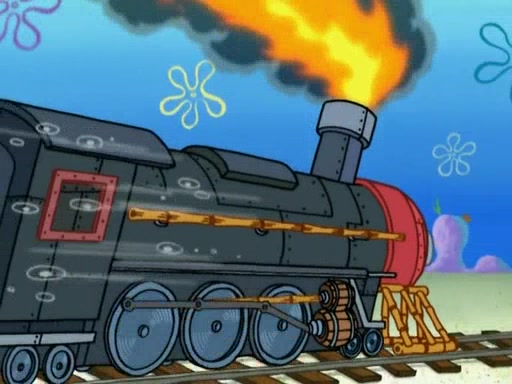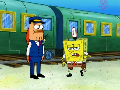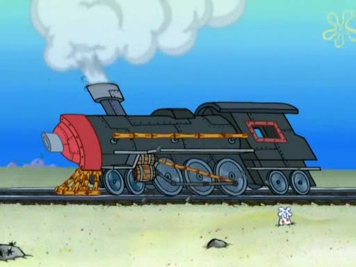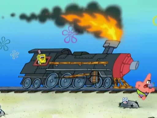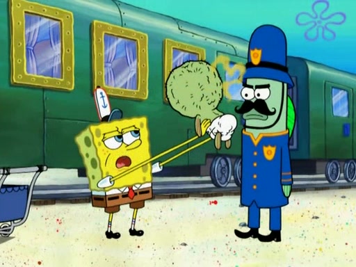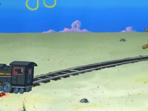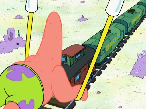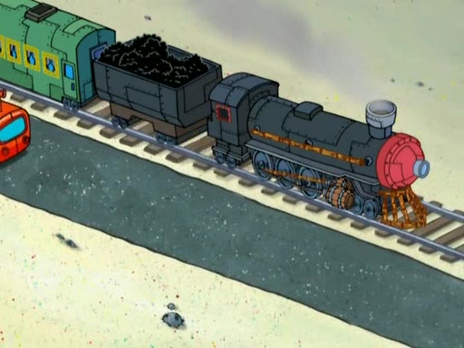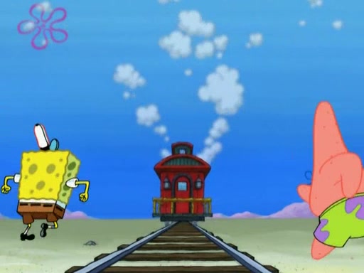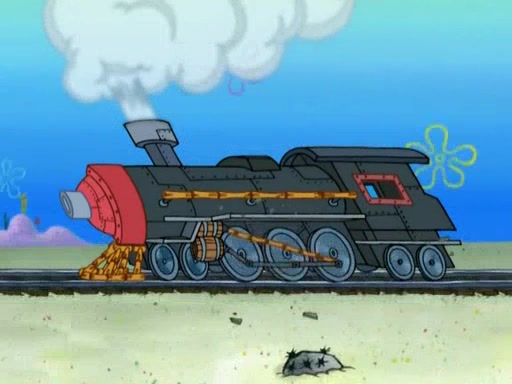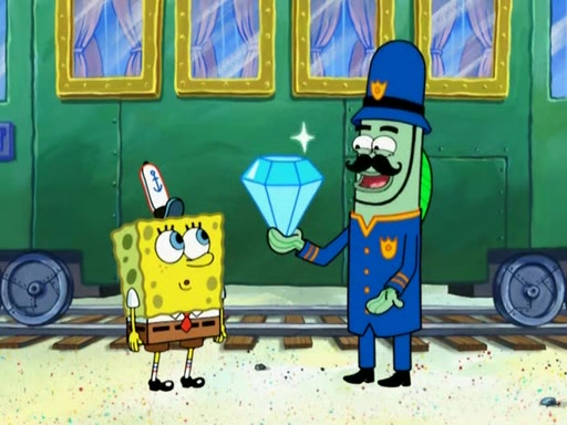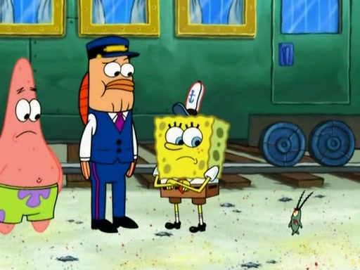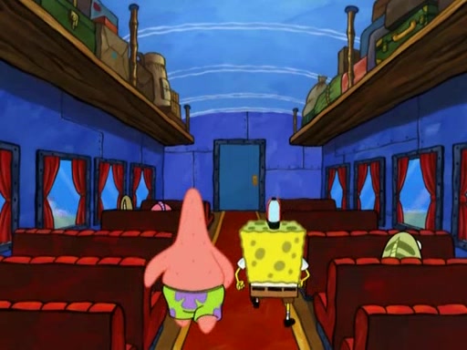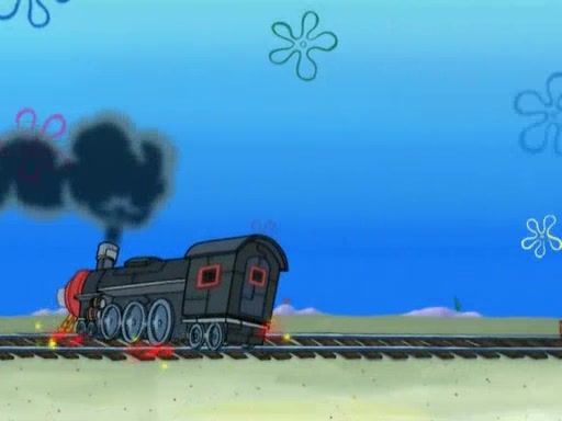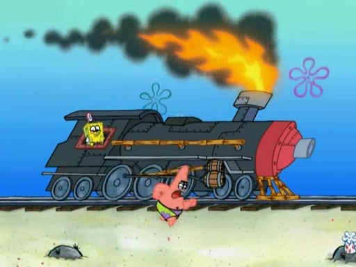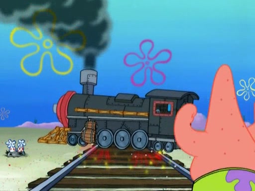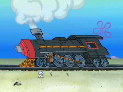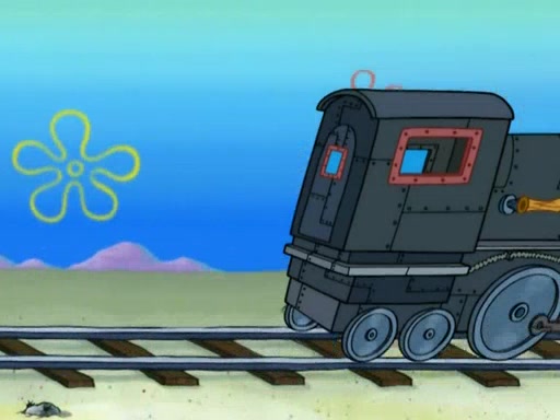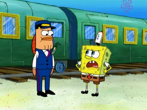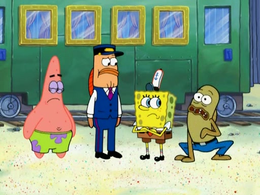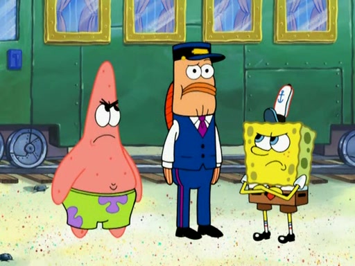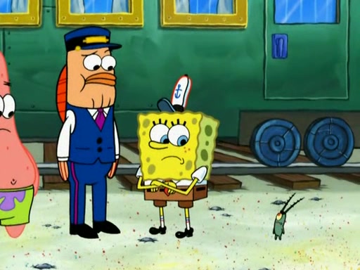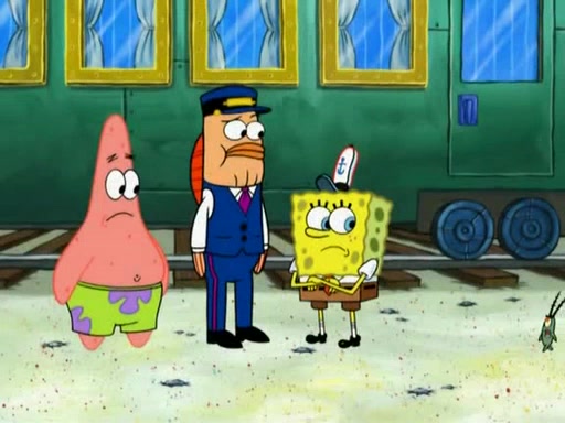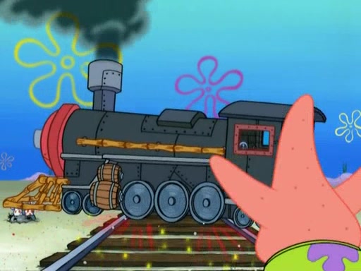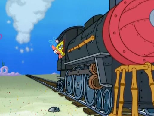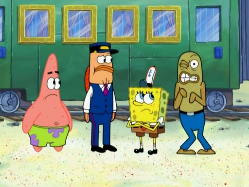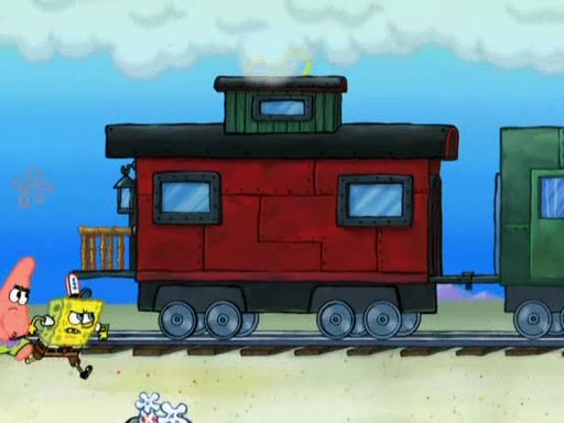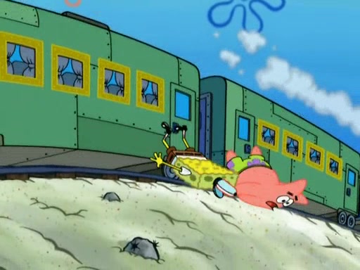 SpongeBob goes into the Krusty Krab freezer to find that the Krusty Krab has run out of Krabby Patties. He and Mr. Krabs try to make more, but cannot remember the recipe. Mr. Krabs gives SpongeBob the key to the vault in which the recipe is hidden, and he and Patrick board a train to the bank for the safety deposit box. Sometime during the ride, the key to the box is stolen and SpongeBob and Patrick must find the thief. Just then, Plankton walks up and Patrick searches him, but finds him clean. The duo stops the train to find the suspect responsible for stealing the key. A nanny and her baby were searched, only to find a stolen jewel that was stolen by triplets. The next suspect, the butler, was revealed to be a thief named Orin J. Ruffy who stole $75,000 worth of ham sandwiches. SpongeBob cried hopelessly but soon found Patrick having the key; in fact, he found it while he cleaned SpongeBob's shorts. They went back into the train and were on their way to the bank. Eventually, Plankton bats them out of a window and the best friends must chase the train. It is revealed that Plankton has the key. SpongeBob morphs himself into a hang glider and he and Patrick fly back onto the train to pursue him. Once they return, SpongeBob and Patrick chase Plankton. But, Plankton disconnects the cars of the train, leaving SpongeBob and Patrick in the front car. SpongeBob and Patrick try to stop the train but Patrick stupidly breaks the brake (of the train) causing the train to go out of control. He made several weird, futile attempts to stop the train, one of which is to put a heavy object on the tracks. This only caused the train to flip and move forward while some of the wheels were off the track. The two manage to bring all wheels back in place when they stopped in front of a retirement home. Then, Patrick stupidly breaks the throttle, which he thought said "BREAK." Meanwhile, Plankton was caught trying to steal the formula by Mr. Krabs. However, he still escapes with it, but the train comes into the bank and stops Plankton before he could leave. Plankton's plan failed again, while Mr. Krabs had to pay the damage to the bank with his bank account. 75 years later, Elderly SpongeBob finishes the story of the "Great Train Caper." His grandson responds with a cheer in excitement over his video game.