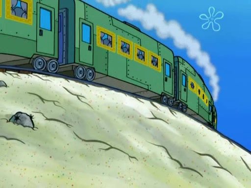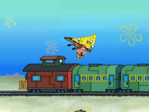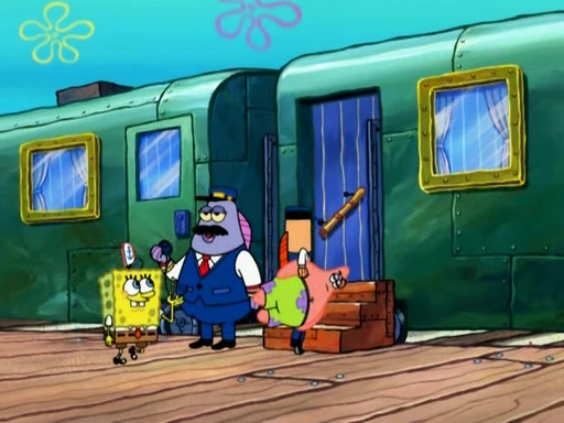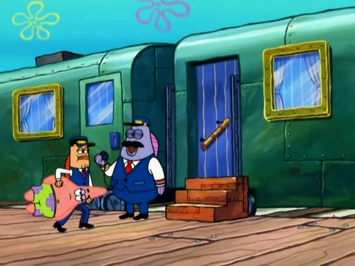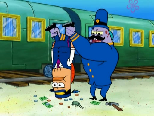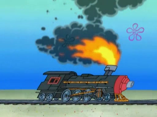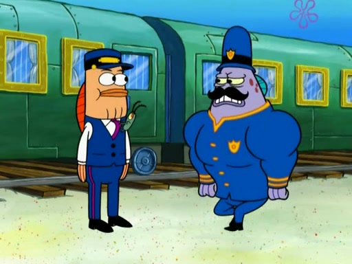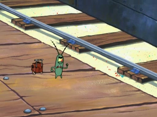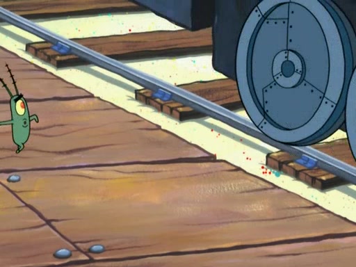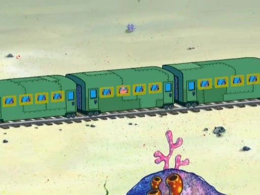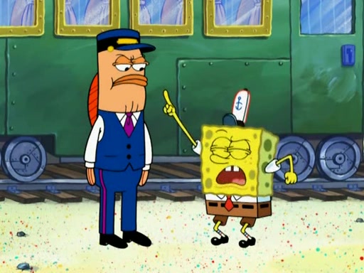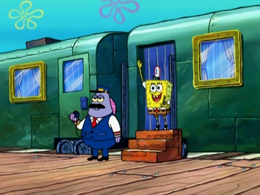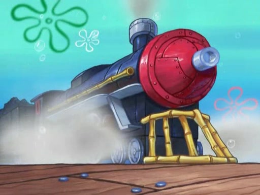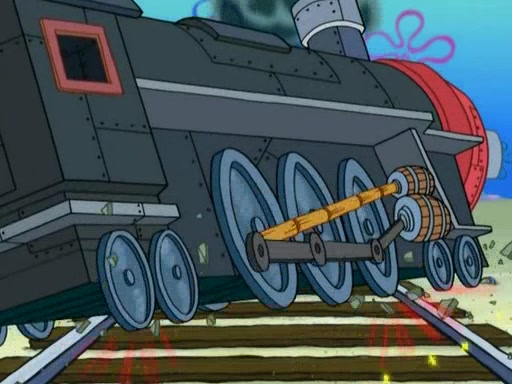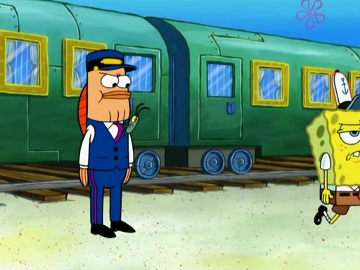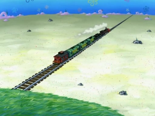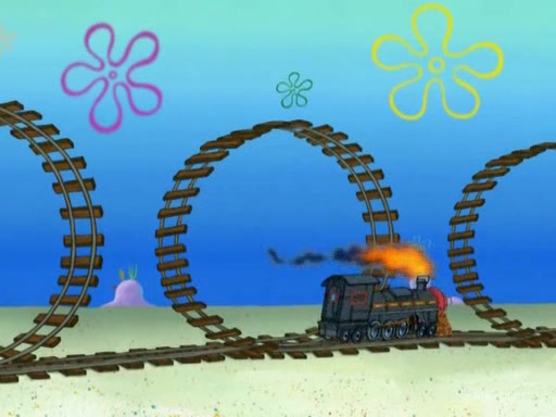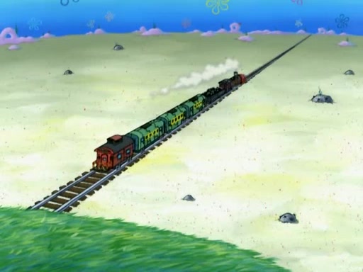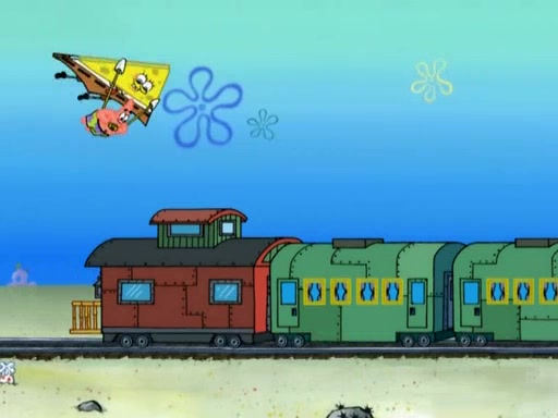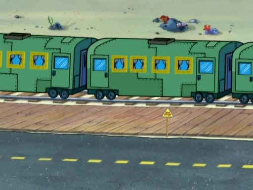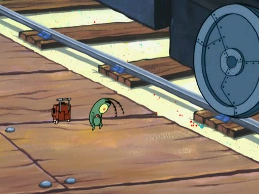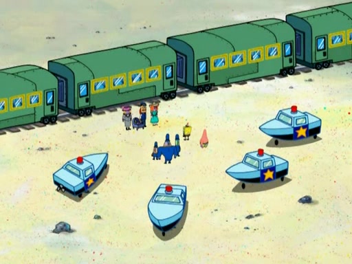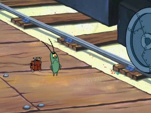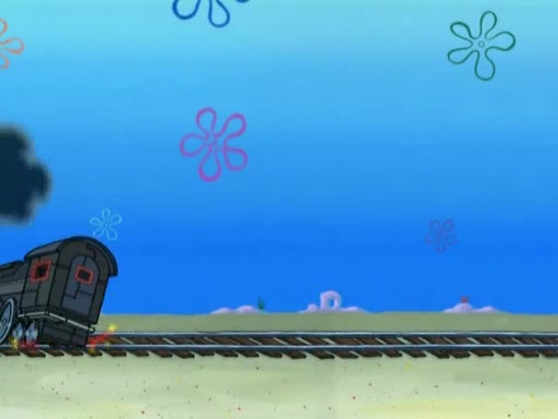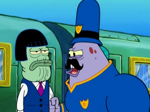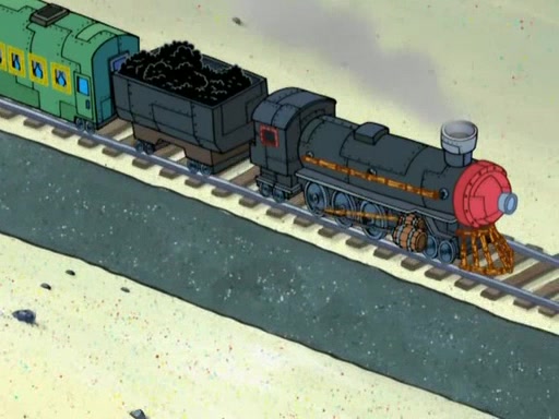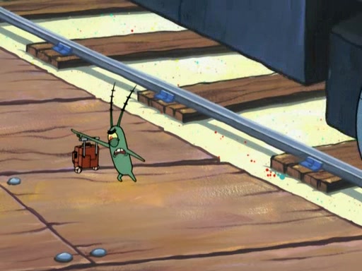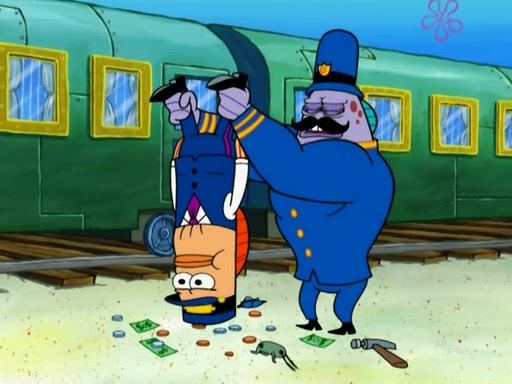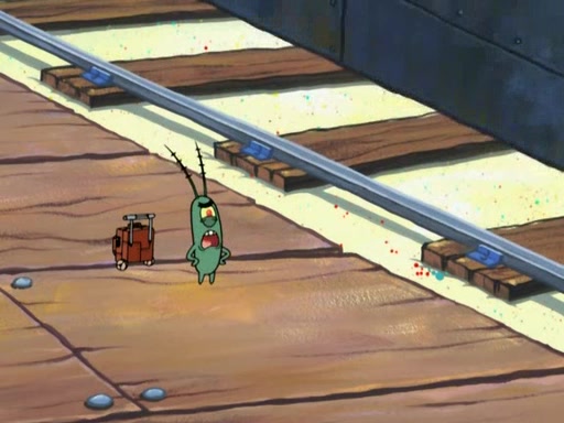 SpongeBob goes into the Krusty Krab freezer to find that the Krusty Krab has run out of Krabby Patties. He and Mr. Krabs try to make more, but cannot remember the recipe. Mr. Krabs gives SpongeBob the key to the vault in which the recipe is hidden, and he and Patrick board a train to the bank for the safety deposit box. Sometime during the ride, the key to the box is stolen and SpongeBob and Patrick must find the thief. Just then, Plankton walks up and Patrick searches him, but finds him clean. The duo stops the train to find the suspect responsible for stealing the key. A nanny and her baby were searched, only to find a stolen jewel that was stolen by triplets. The next suspect, the butler, was revealed to be a thief named Orin J. Ruffy who stole $75,000 worth of ham sandwiches. SpongeBob cried hopelessly but soon found Patrick having the key; in fact, he found it while he cleaned SpongeBob's shorts. They went back into the train and were on their way to the bank. Eventually, Plankton bats them out of a window and the best friends must chase the train. It is revealed that Plankton has the key. SpongeBob morphs himself into a hang glider and he and Patrick fly back onto the train to pursue him. Once they return, SpongeBob and Patrick chase Plankton. But, Plankton disconnects the cars of the train, leaving SpongeBob and Patrick in the front car. SpongeBob and Patrick try to stop the train but Patrick stupidly breaks the brake (of the train) causing the train to go out of control. He made several weird, futile attempts to stop the train, one of which is to put a heavy object on the tracks. This only caused the train to flip and move forward while some of the wheels were off the track. The two manage to bring all wheels back in place when they stopped in front of a retirement home. Then, Patrick stupidly breaks the throttle, which he thought said "BREAK." Meanwhile, Plankton was caught trying to steal the formula by Mr. Krabs. However, he still escapes with it, but the train comes into the bank and stops Plankton before he could leave. Plankton's plan failed again, while Mr. Krabs had to pay the damage to the bank with his bank account. 75 years later, Elderly SpongeBob finishes the story of the "Great Train Caper." His grandson responds with a cheer in excitement over his video game.