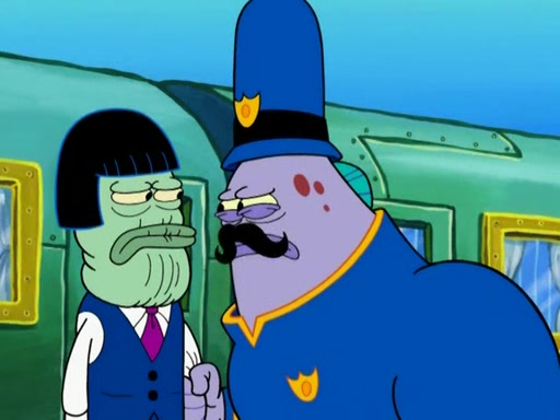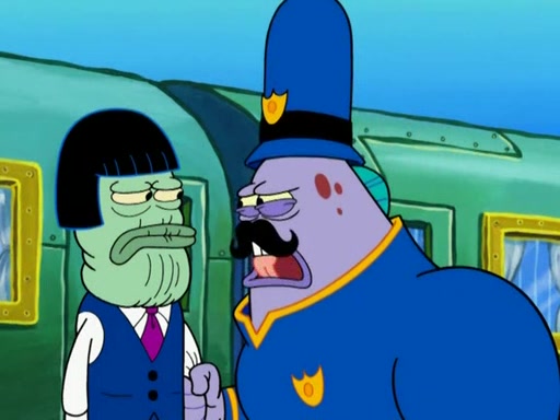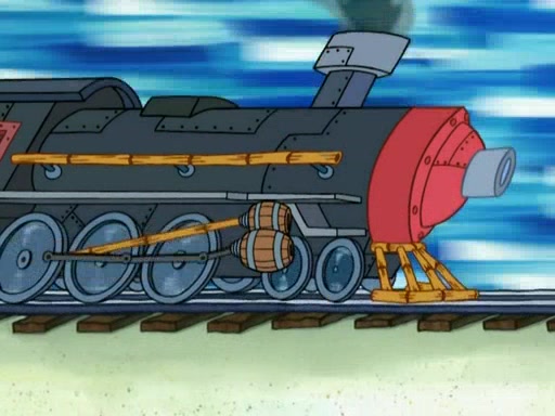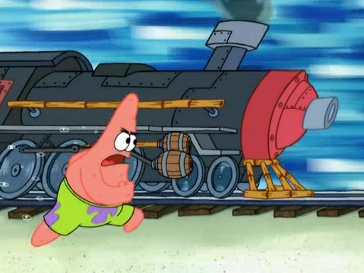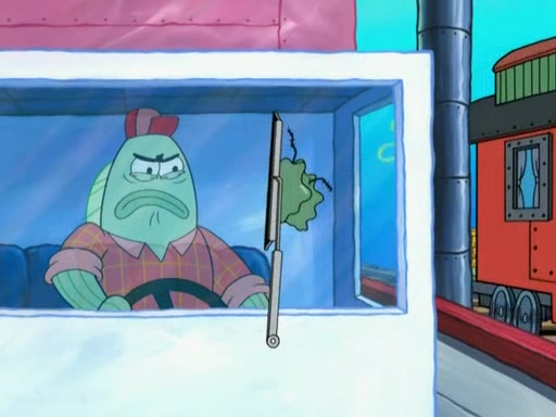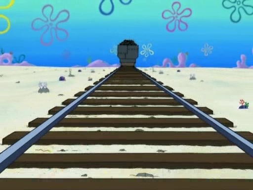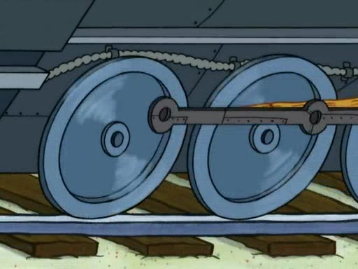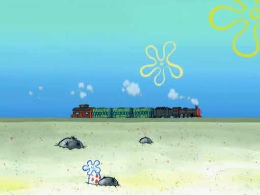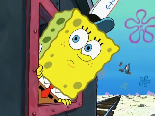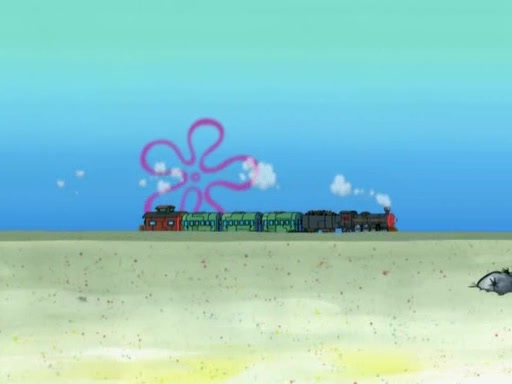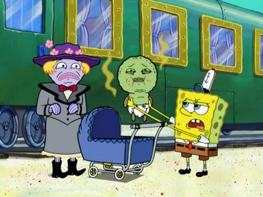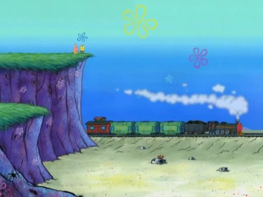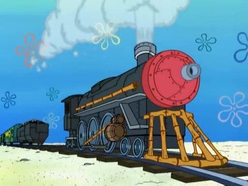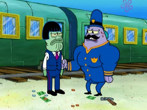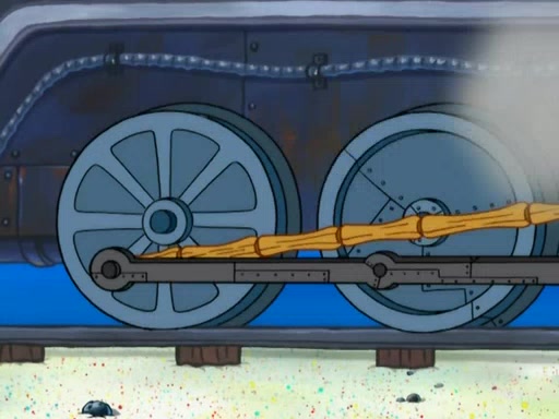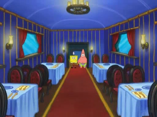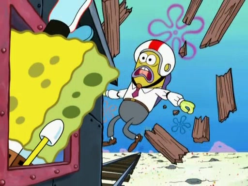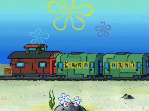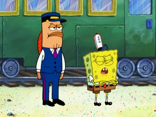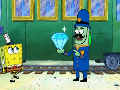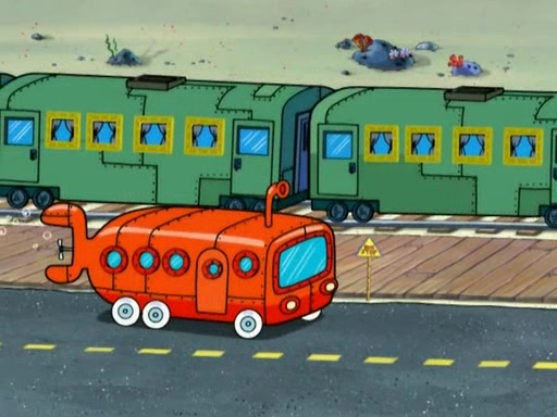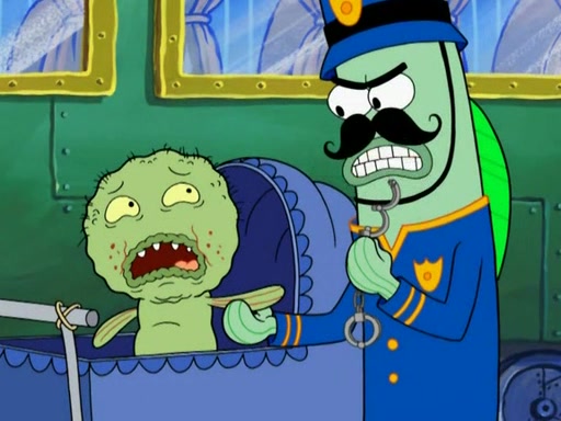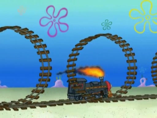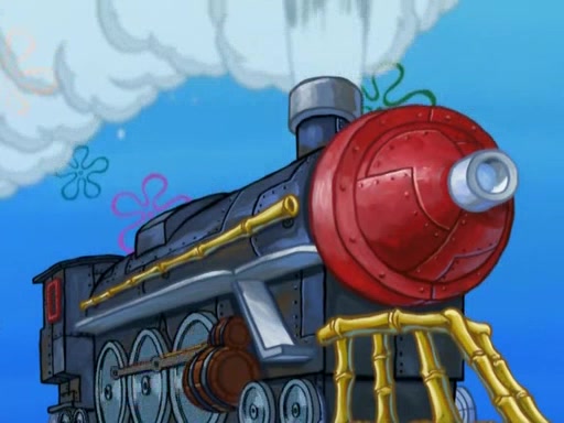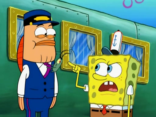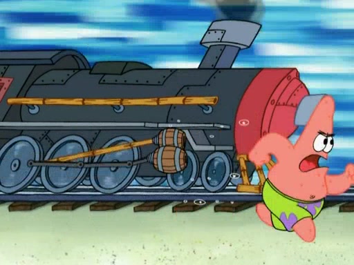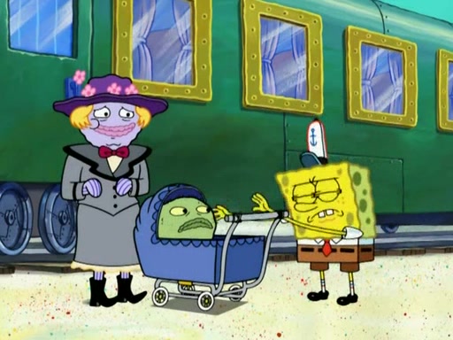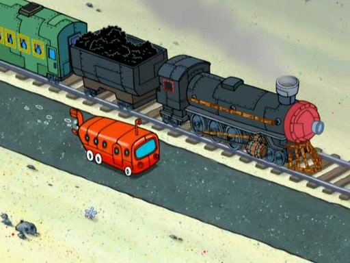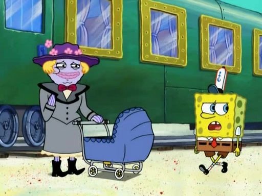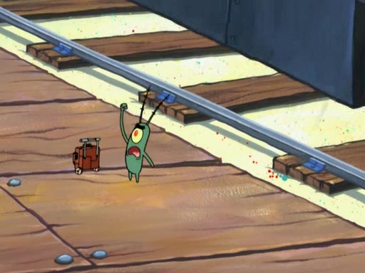 SpongeBob goes into the Krusty Krab freezer to find that the Krusty Krab has run out of Krabby Patties. He and Mr. Krabs try to make more, but cannot remember the recipe. Mr. Krabs gives SpongeBob the key to the vault in which the recipe is hidden, and he and Patrick board a train to the bank for the safety deposit box. Sometime during the ride, the key to the box is stolen and SpongeBob and Patrick must find the thief. Just then, Plankton walks up and Patrick searches him, but finds him clean. The duo stops the train to find the suspect responsible for stealing the key. A nanny and her baby were searched, only to find a stolen jewel that was stolen by triplets. The next suspect, the butler, was revealed to be a thief named Orin J. Ruffy who stole $75,000 worth of ham sandwiches. SpongeBob cried hopelessly but soon found Patrick having the key; in fact, he found it while he cleaned SpongeBob's shorts. They went back into the train and were on their way to the bank. Eventually, Plankton bats them out of a window and the best friends must chase the train. It is revealed that Plankton has the key. SpongeBob morphs himself into a hang glider and he and Patrick fly back onto the train to pursue him. Once they return, SpongeBob and Patrick chase Plankton. But, Plankton disconnects the cars of the train, leaving SpongeBob and Patrick in the front car. SpongeBob and Patrick try to stop the train but Patrick stupidly breaks the brake (of the train) causing the train to go out of control. He made several weird, futile attempts to stop the train, one of which is to put a heavy object on the tracks. This only caused the train to flip and move forward while some of the wheels were off the track. The two manage to bring all wheels back in place when they stopped in front of a retirement home. Then, Patrick stupidly breaks the throttle, which he thought said "BREAK." Meanwhile, Plankton was caught trying to steal the formula by Mr. Krabs. However, he still escapes with it, but the train comes into the bank and stops Plankton before he could leave. Plankton's plan failed again, while Mr. Krabs had to pay the damage to the bank with his bank account. 75 years later, Elderly SpongeBob finishes the story of the "Great Train Caper." His grandson responds with a cheer in excitement over his video game.