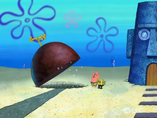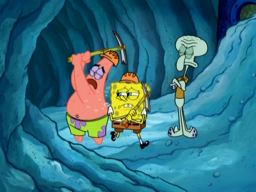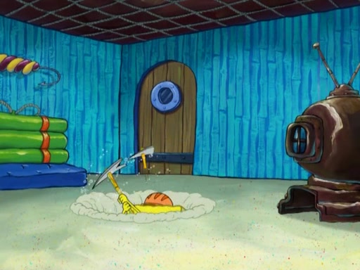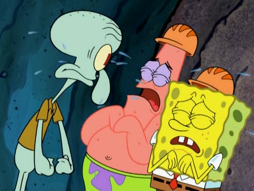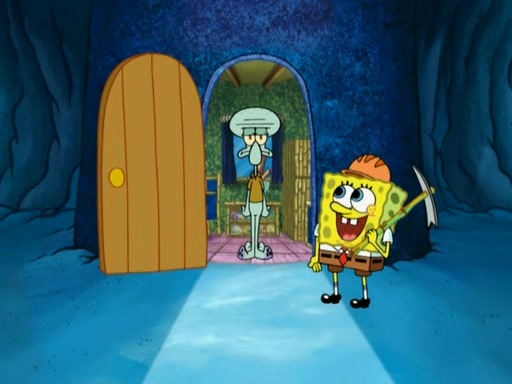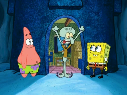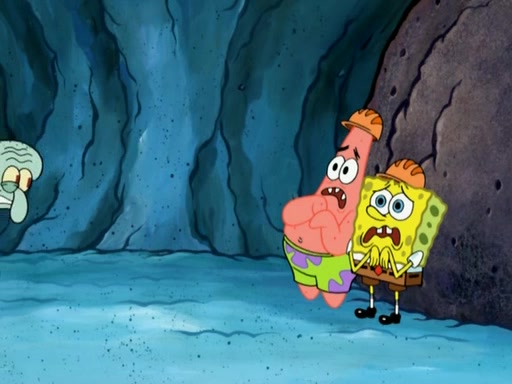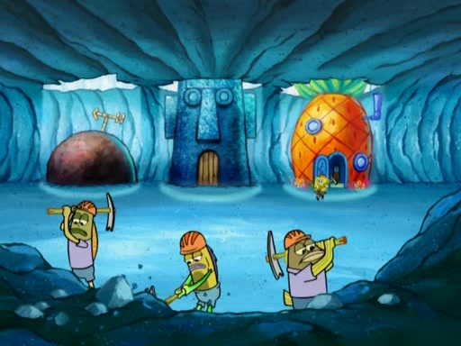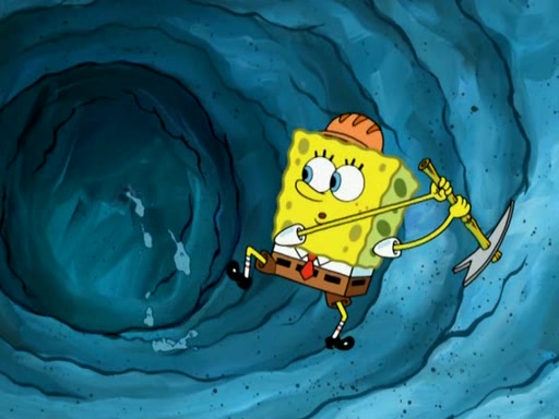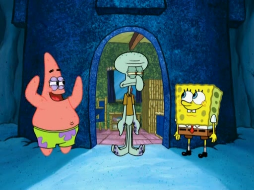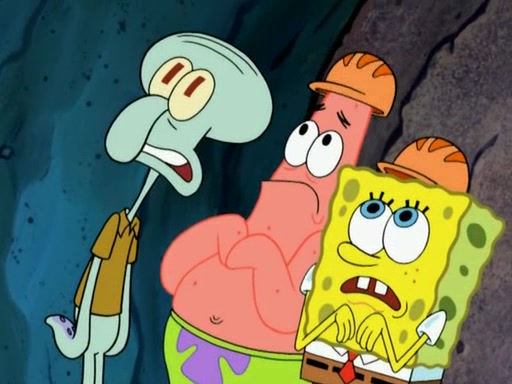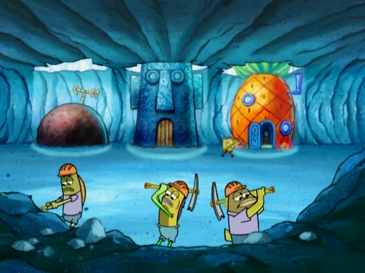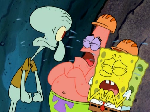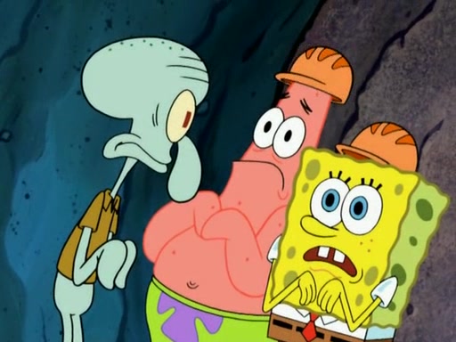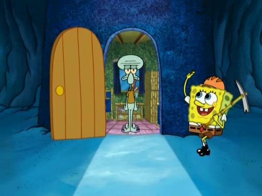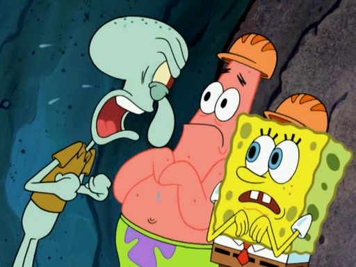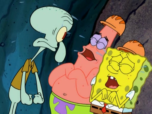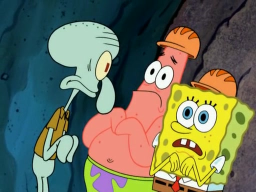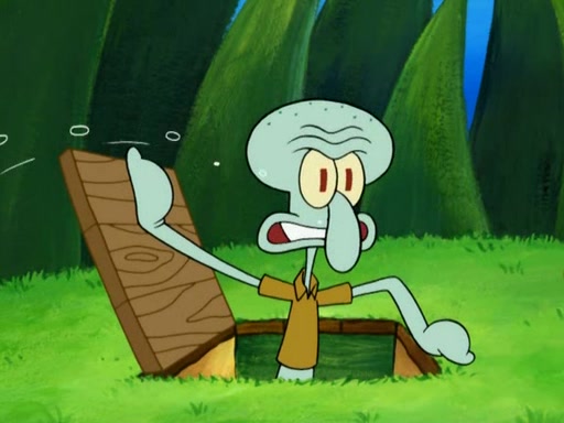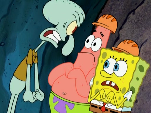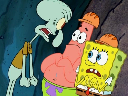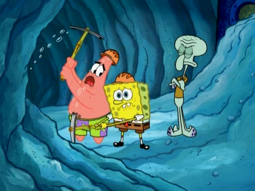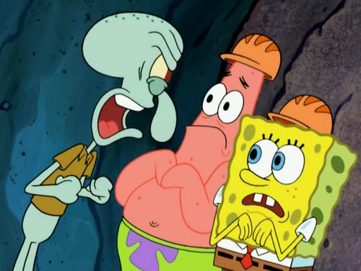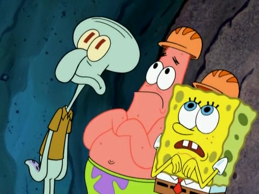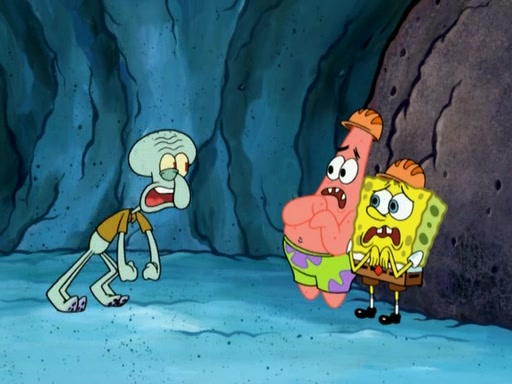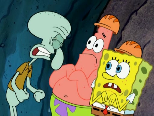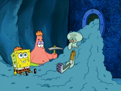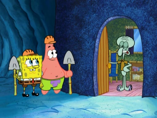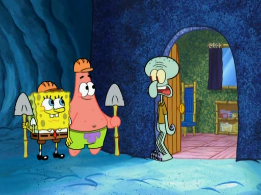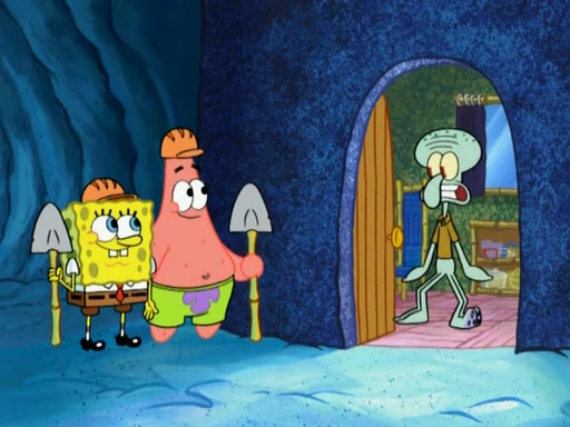 They eventually meet up and start playing. Squidward can hear them playing, so he goes outside, but they are not in his yard. He looks in Patrick's house, but they are not there. He looks all around SpongeBob's house, but they are not there. He can't find them anywhere and eventually, that sends Squidward into a rage as he believes SpongeBob and Patrick have finally become ghosts, so he shouts "WHERE ARE THEY?!" and starts jumping up and down. This causes the roots underground to wiggle, and SpongeBob and Patrick think they are dancing. So they start dancing. This sinks Squidward's house and Squidward finally realizes that they've been underground the whole time and enters his house through the roof hatch. Squidward comes out of his house and makes SpongeBob and Patrick dig it back out while he relaxes, but Patrick accidentally breaks Squidward's window and SpongeBob accidentally lets all the dirt flood Squidward and SpongeBob out of the house and Squidward threatens SpongeBob and Patrick if they don't obey Squidward and dig out his house by the count of 3, Squidward will turn them into chum. SpongeBob and Patrick dig more, but when Squidward reaches 3, they start running away in panic from Squidward, digging more tunnels. As they are doing this, SpongeBob and Patrick sink all the buildings in Bikini Bottom, including their own houses, downtown, and even The Krusty Krab. Plankton then realizes that The Chum Bucket is the only restaurant in town, but it sinks too. After a whole lot of digging, SpongeBob and Patrick come to a rock, and a furious Squidward corners towards them. After he yells at them, all of Bikini Bottom sinks underground. Sometime later, SpongeBob, Squidward, and the other Bikini Bottomites are digging out Bikini Bottom. The episode ends with SpongeBob saying "Another beautiful day under Bikini Bottom," and Squidward putting on a mining helmet, and saying "I hate neighbours."