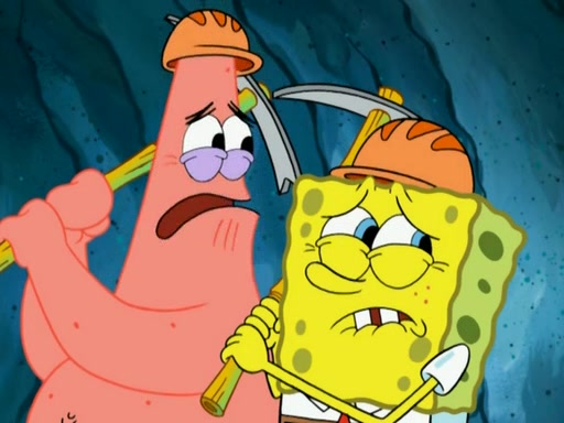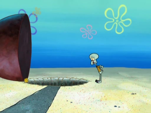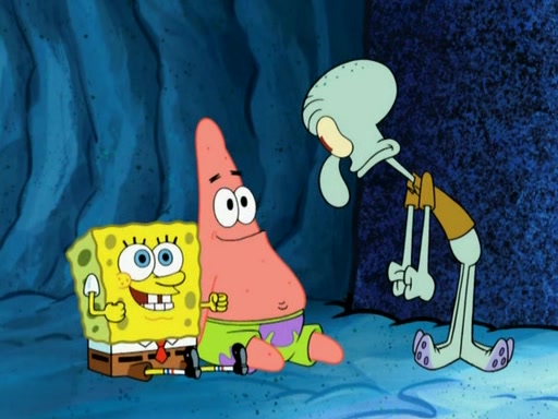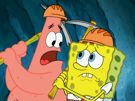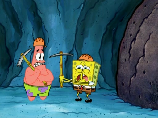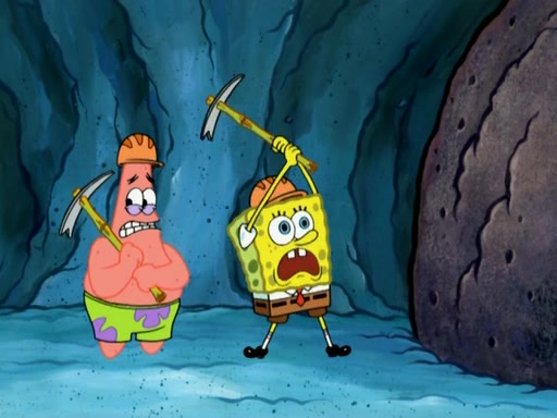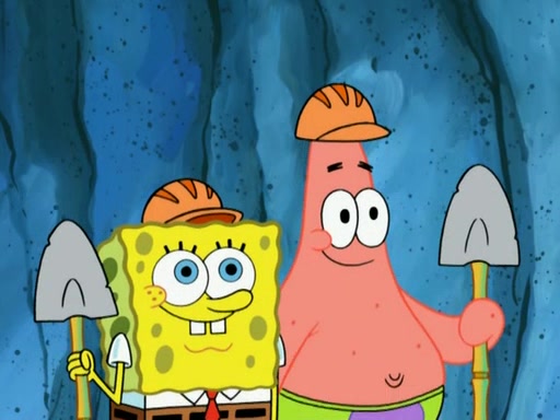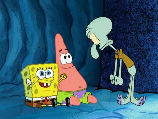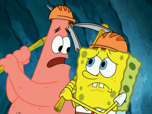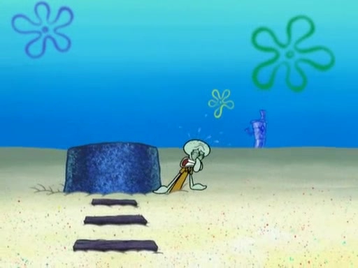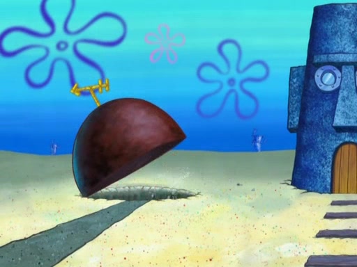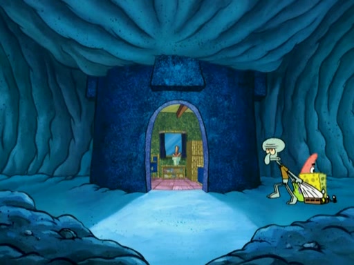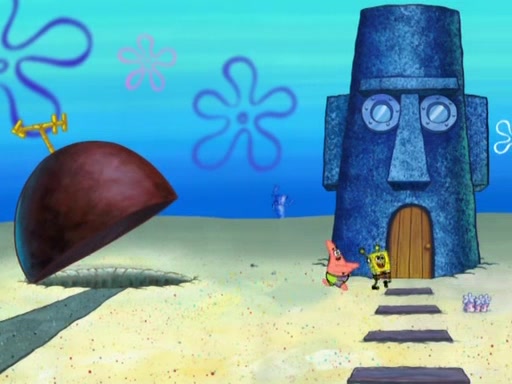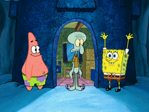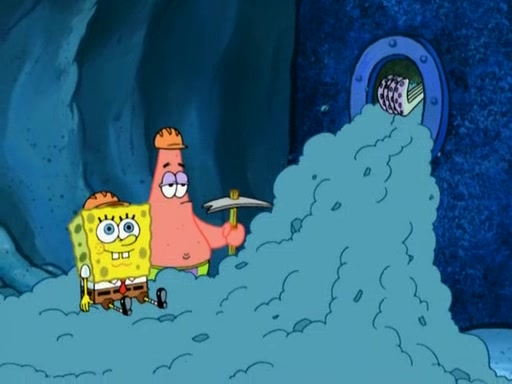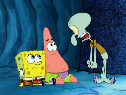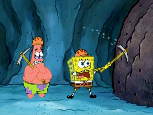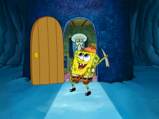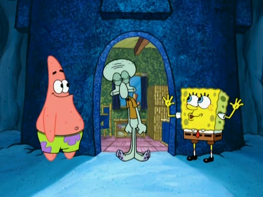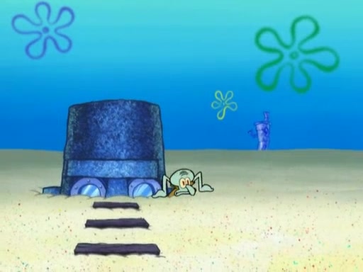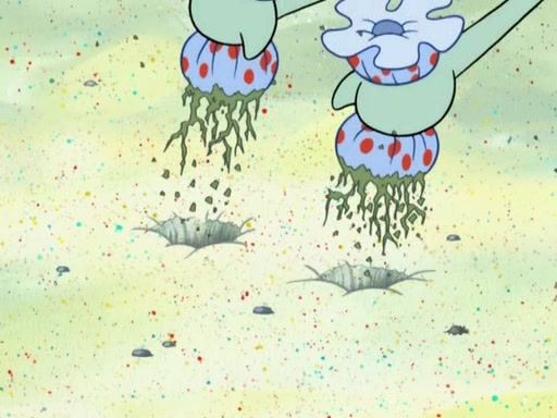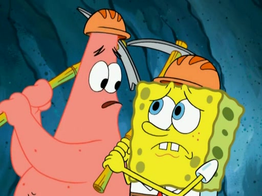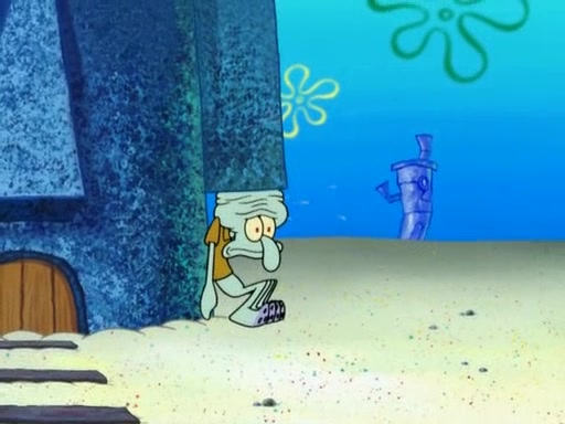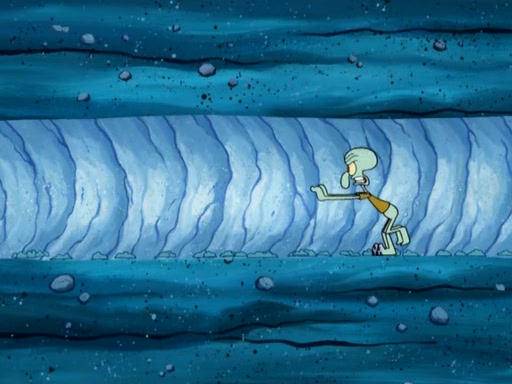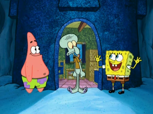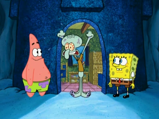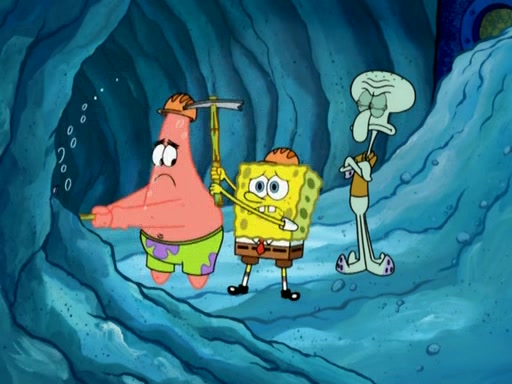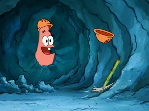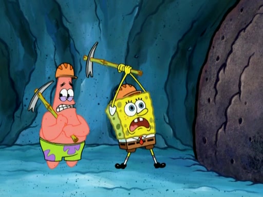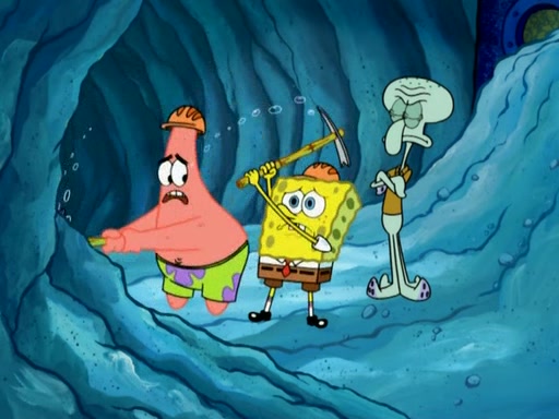 They eventually meet up and start playing. Squidward can hear them playing, so he goes outside, but they are not in his yard. He looks in Patrick's house, but they are not there. He looks all around SpongeBob's house, but they are not there. He can't find them anywhere and eventually, that sends Squidward into a rage as he believes SpongeBob and Patrick have finally become ghosts, so he shouts "WHERE ARE THEY?!" and starts jumping up and down. This causes the roots underground to wiggle, and SpongeBob and Patrick think they are dancing. So they start dancing. This sinks Squidward's house and Squidward finally realizes that they've been underground the whole time and enters his house through the roof hatch. Squidward comes out of his house and makes SpongeBob and Patrick dig it back out while he relaxes, but Patrick accidentally breaks Squidward's window and SpongeBob accidentally lets all the dirt flood Squidward and SpongeBob out of the house and Squidward threatens SpongeBob and Patrick if they don't obey Squidward and dig out his house by the count of 3, Squidward will turn them into chum. SpongeBob and Patrick dig more, but when Squidward reaches 3, they start running away in panic from Squidward, digging more tunnels. As they are doing this, SpongeBob and Patrick sink all the buildings in Bikini Bottom, including their own houses, downtown, and even The Krusty Krab. Plankton then realizes that The Chum Bucket is the only restaurant in town, but it sinks too. After a whole lot of digging, SpongeBob and Patrick come to a rock, and a furious Squidward corners towards them. After he yells at them, all of Bikini Bottom sinks underground. Sometime later, SpongeBob, Squidward, and the other Bikini Bottomites are digging out Bikini Bottom. The episode ends with SpongeBob saying "Another beautiful day under Bikini Bottom," and Squidward putting on a mining helmet, and saying "I hate neighbours."