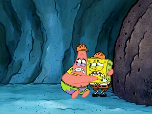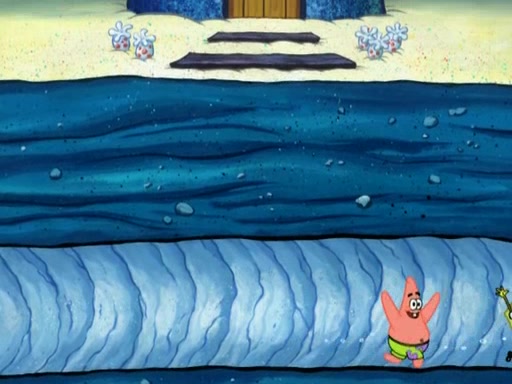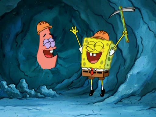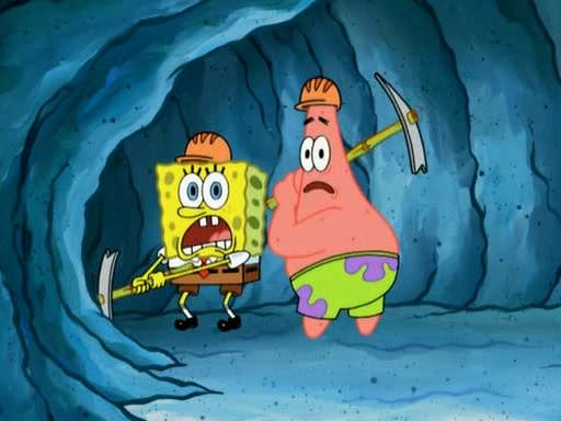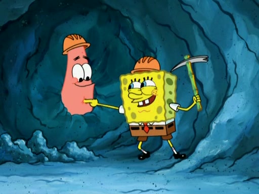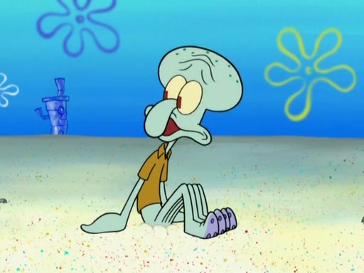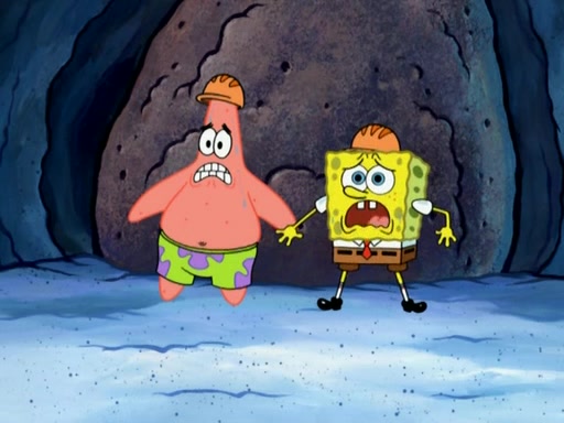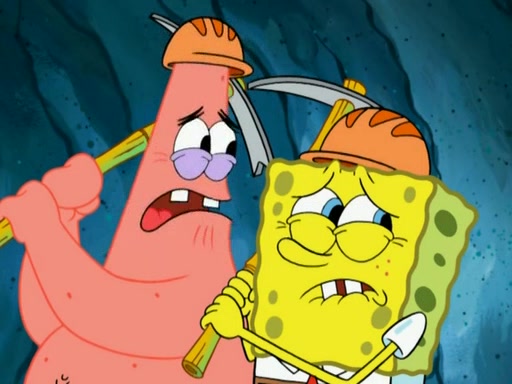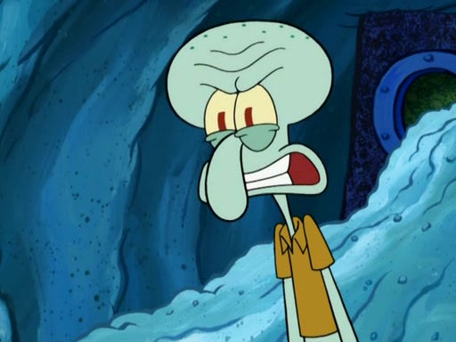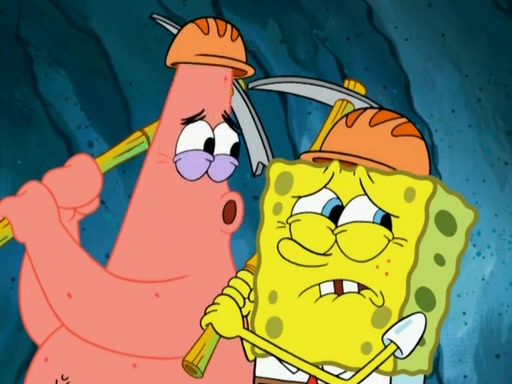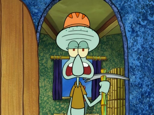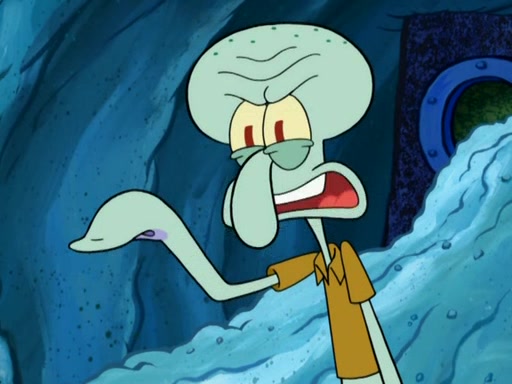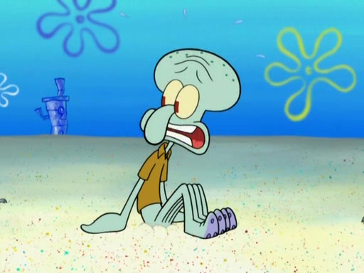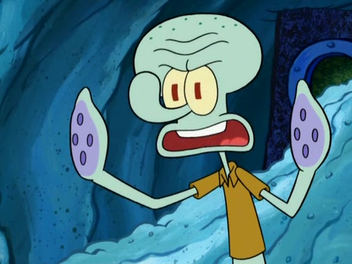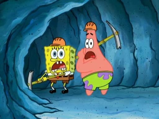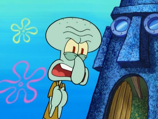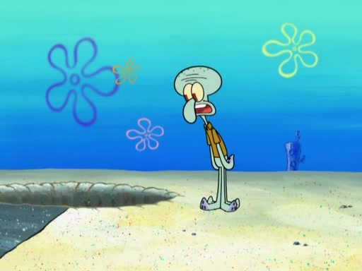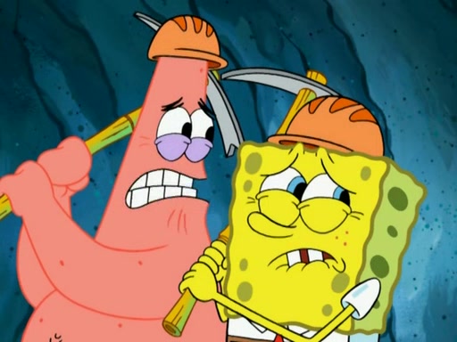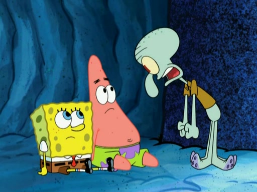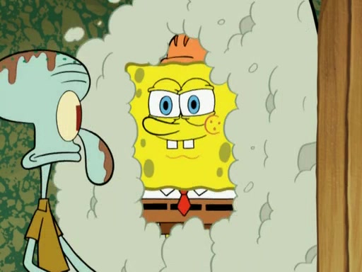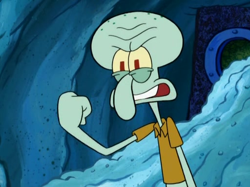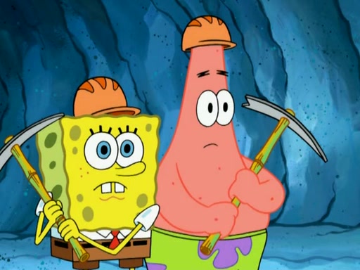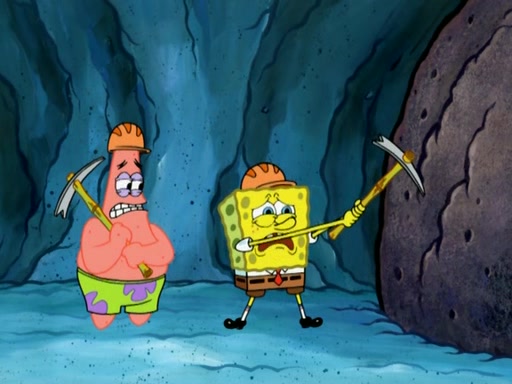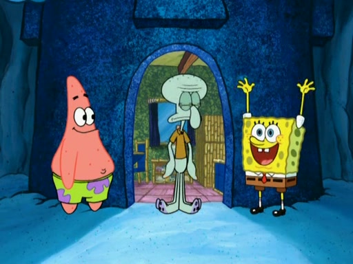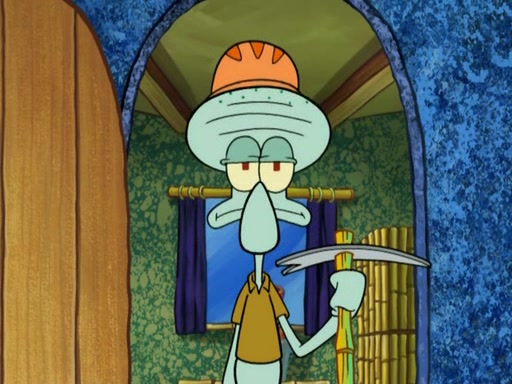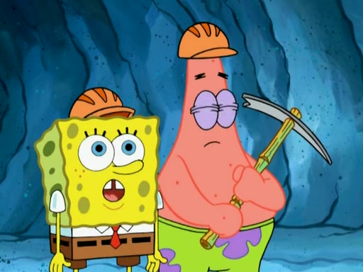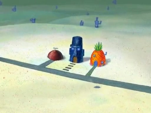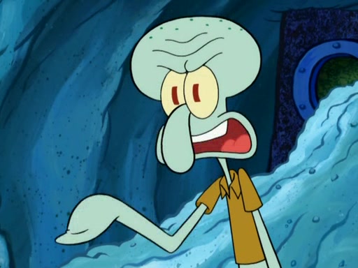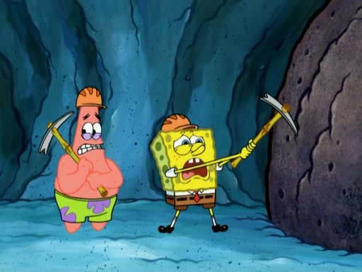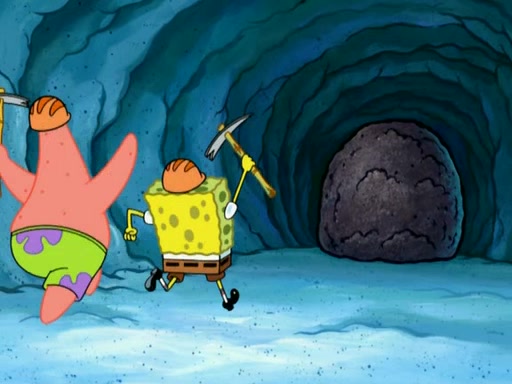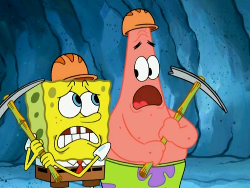 They eventually meet up and start playing. Squidward can hear them playing, so he goes outside, but they are not in his yard. He looks in Patrick's house, but they are not there. He looks all around SpongeBob's house, but they are not there. He can't find them anywhere and eventually, that sends Squidward into a rage as he believes SpongeBob and Patrick have finally become ghosts, so he shouts "WHERE ARE THEY?!" and starts jumping up and down. This causes the roots underground to wiggle, and SpongeBob and Patrick think they are dancing. So they start dancing. This sinks Squidward's house and Squidward finally realizes that they've been underground the whole time and enters his house through the roof hatch. Squidward comes out of his house and makes SpongeBob and Patrick dig it back out while he relaxes, but Patrick accidentally breaks Squidward's window and SpongeBob accidentally lets all the dirt flood Squidward and SpongeBob out of the house and Squidward threatens SpongeBob and Patrick if they don't obey Squidward and dig out his house by the count of 3, Squidward will turn them into chum. SpongeBob and Patrick dig more, but when Squidward reaches 3, they start running away in panic from Squidward, digging more tunnels. As they are doing this, SpongeBob and Patrick sink all the buildings in Bikini Bottom, including their own houses, downtown, and even The Krusty Krab. Plankton then realizes that The Chum Bucket is the only restaurant in town, but it sinks too. After a whole lot of digging, SpongeBob and Patrick come to a rock, and a furious Squidward corners towards them. After he yells at them, all of Bikini Bottom sinks underground. Sometime later, SpongeBob, Squidward, and the other Bikini Bottomites are digging out Bikini Bottom. The episode ends with SpongeBob saying "Another beautiful day under Bikini Bottom," and Squidward putting on a mining helmet, and saying "I hate neighbours."