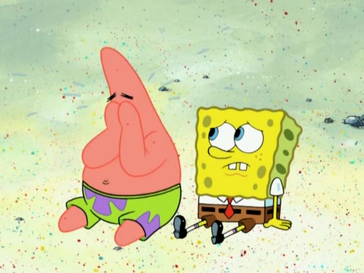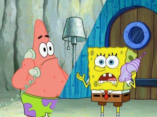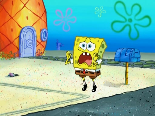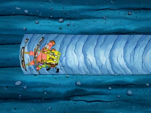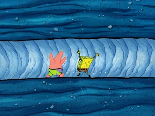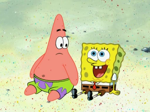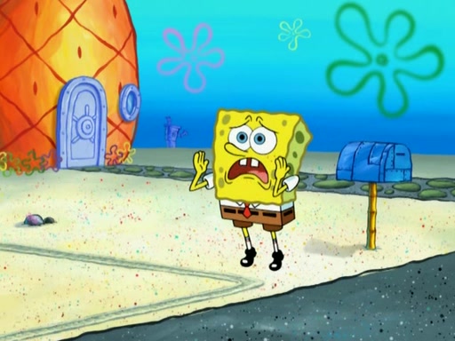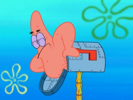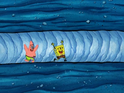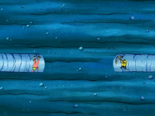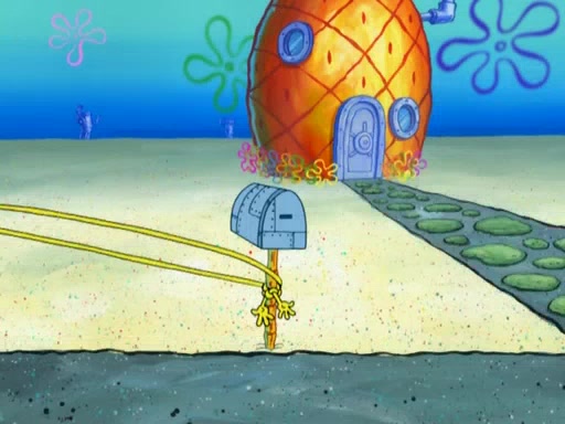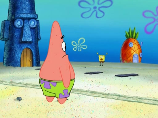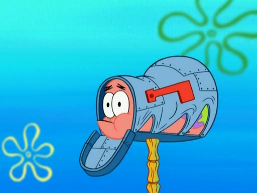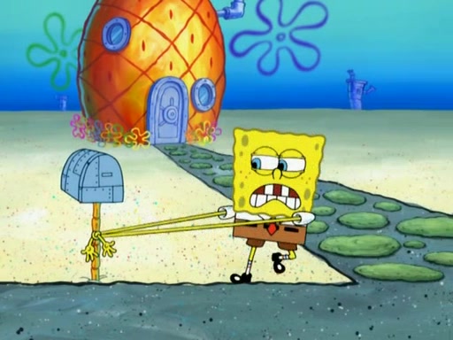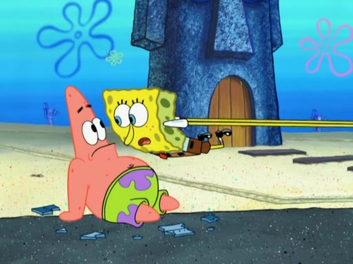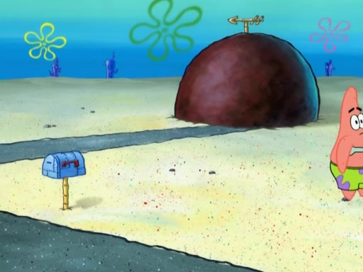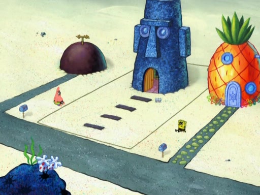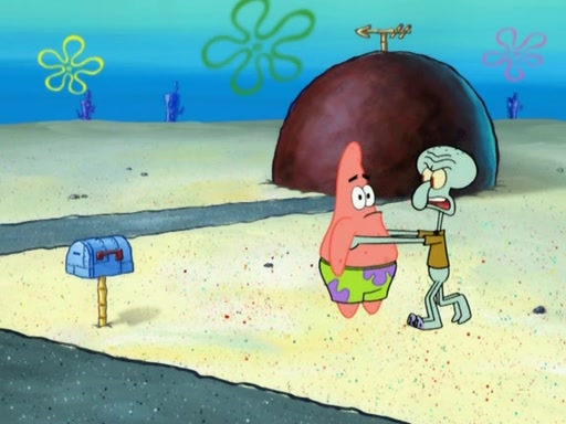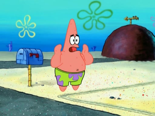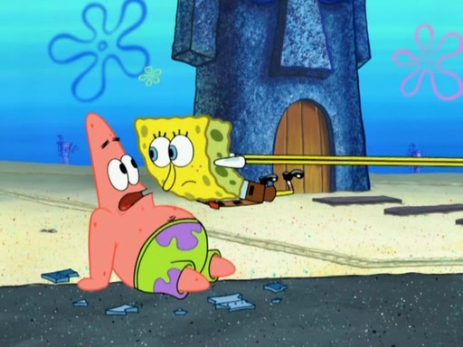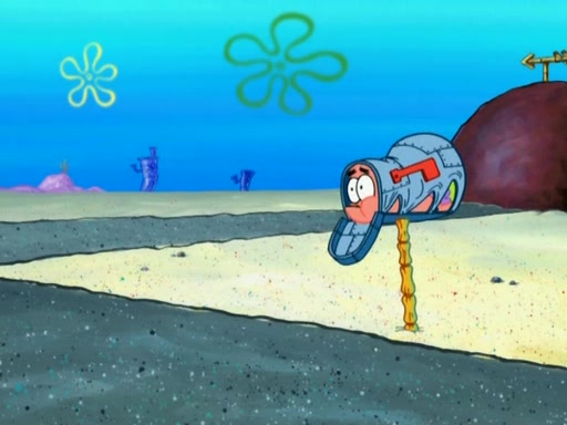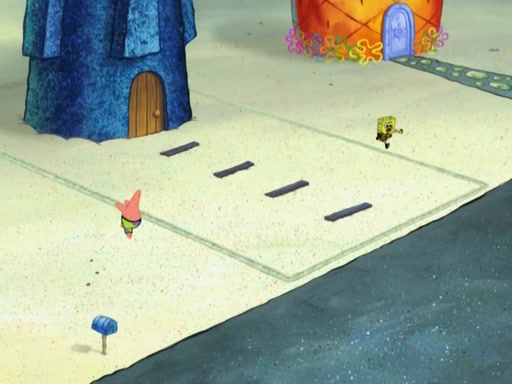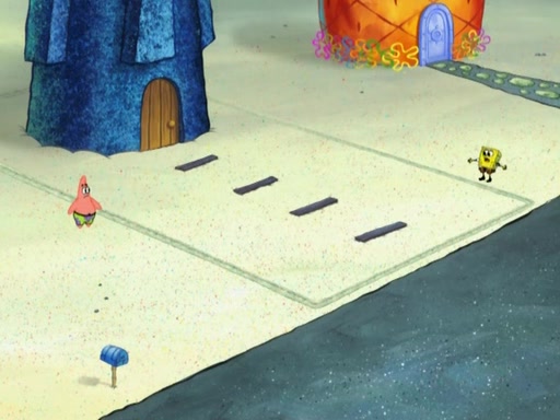 They panic and think that they will never see each other again. SpongeBob tries to walk across the road, but the traffic is terrible, and now wants Patrick to do something. Patrick now tries to squeeze himself into the mailbox in order to get to SpongeBob's house, but the mailbox breaks and explodes. SpongeBob now wants Patrick to sit tight, and ties himself to the mailbox, and now slingshots himself over to Patrick but it doesn't work. SpongeBob now has an idea, and wants Patrick to see so they think to dig a tunnel underneath their houses.