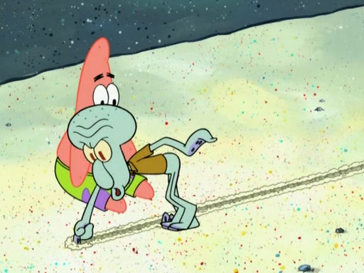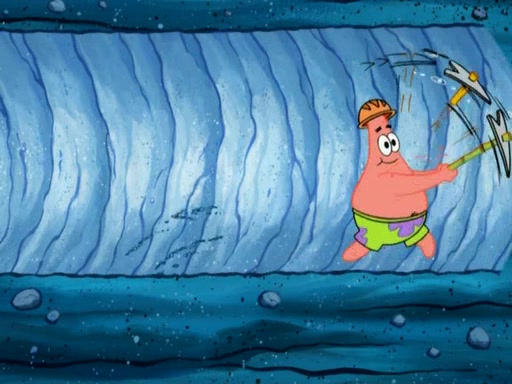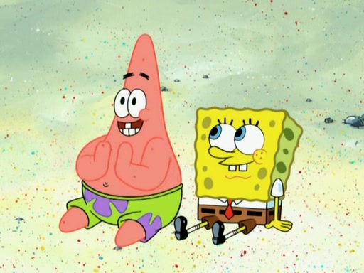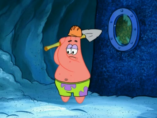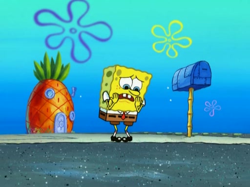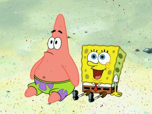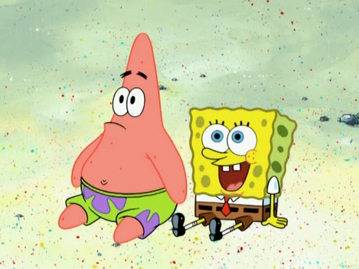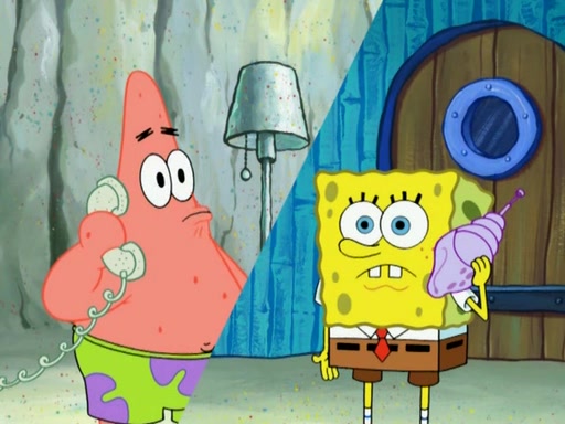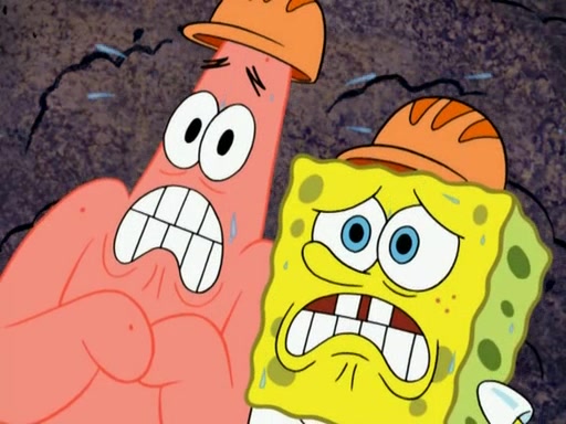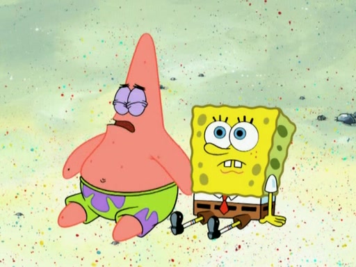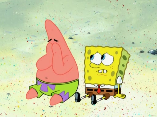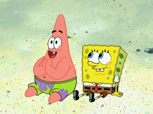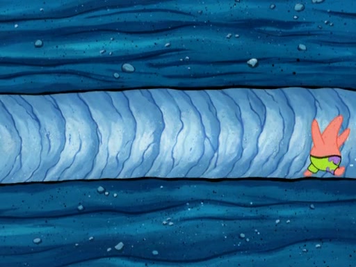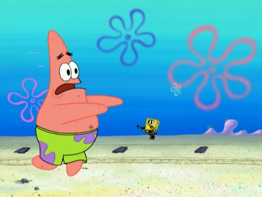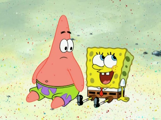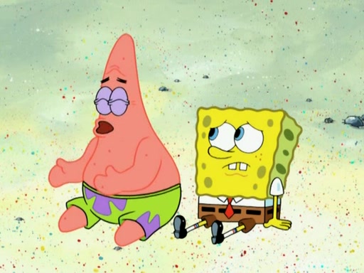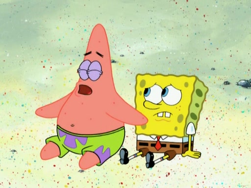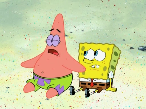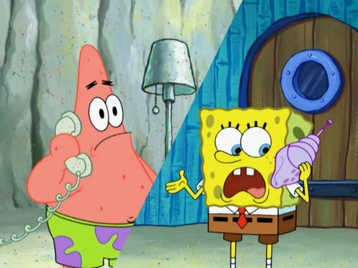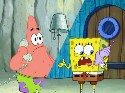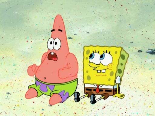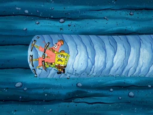 They panic and think that they will never see each other again. SpongeBob tries to walk across the road, but the traffic is terrible, and now wants Patrick to do something. Patrick now tries to squeeze himself into the mailbox in order to get to SpongeBob's house, but the mailbox breaks and explodes. SpongeBob now wants Patrick to sit tight, and ties himself to the mailbox, and now slingshots himself over to Patrick but it doesn't work. SpongeBob now has an idea, and wants Patrick to see so they think to dig a tunnel underneath their houses.