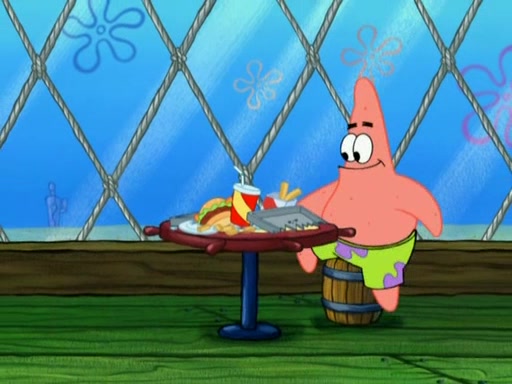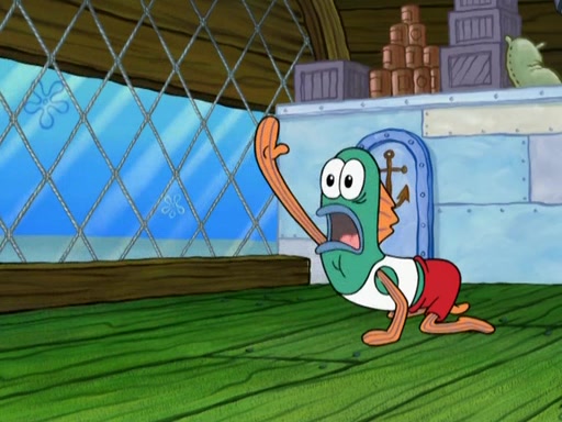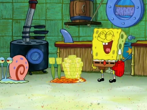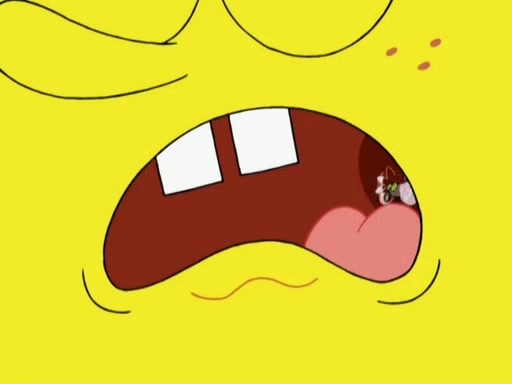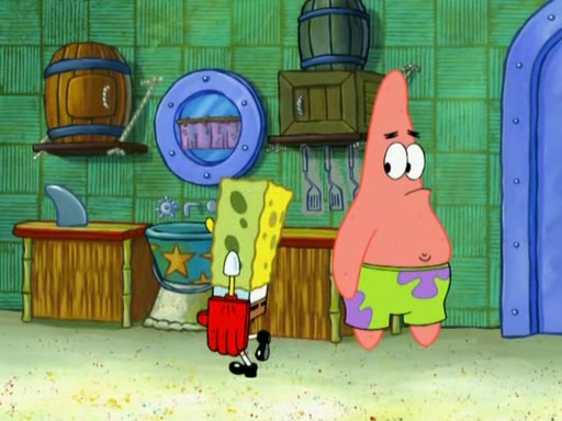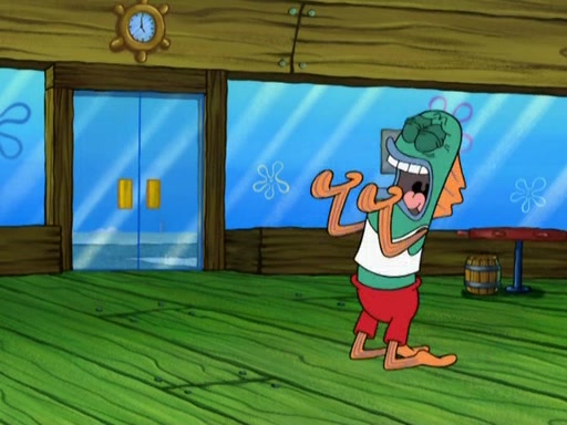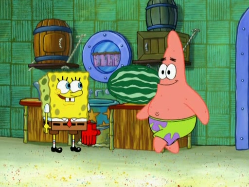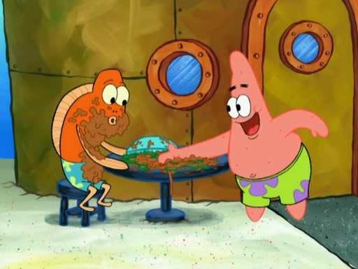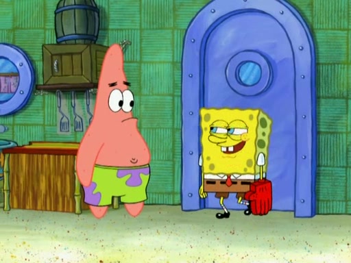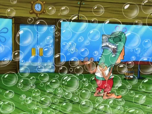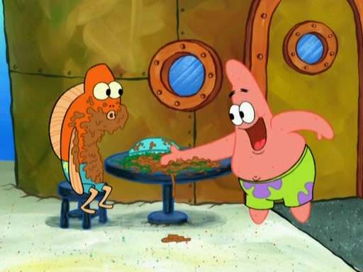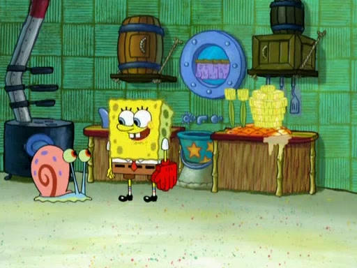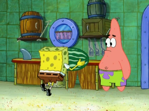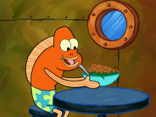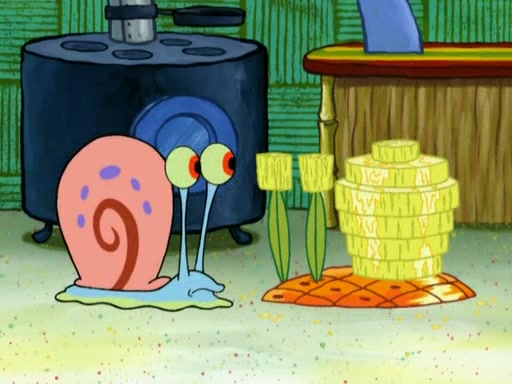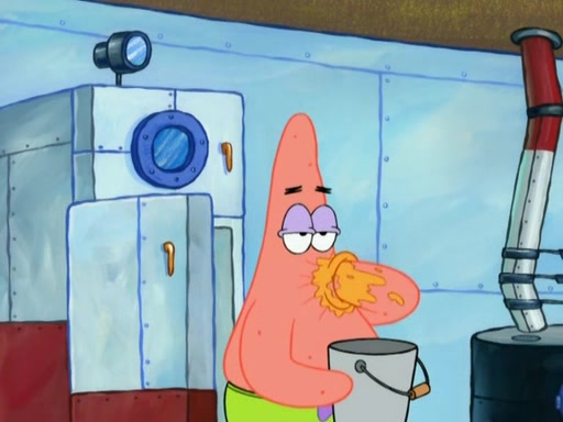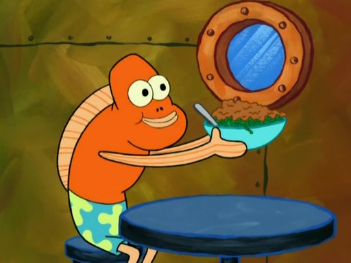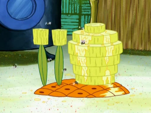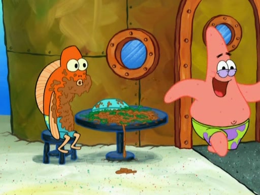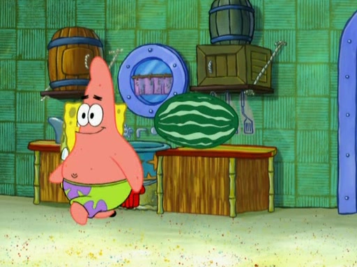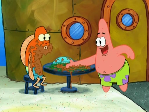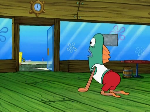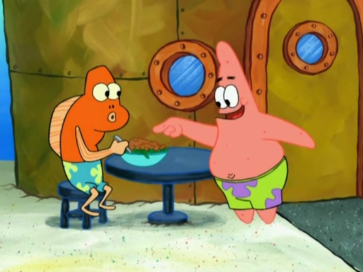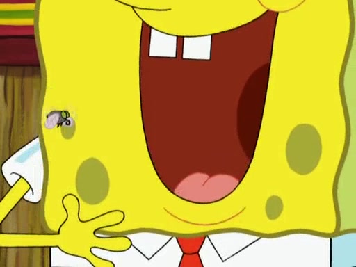 SpongeBob is in his kitchen, karate-chopping a pineapple to look like Gary. He puts it on the floor, so Gary is eye-level with it. It attracts flies and one flies into SpongeBob's mouth and he begins to choke. Patrick walks in and asks for some cheese before realizing SpongeBob's choking. Once it becomes clear to him, he punches SpongeBob. SpongeBob flies across the room and lands against the wall and the fly leaves his mouth. He offers anything in return and gives Patrick the cheese.