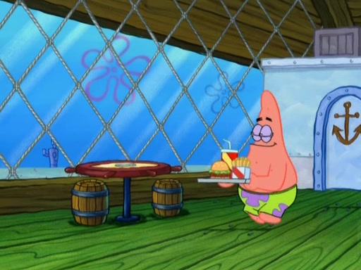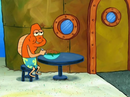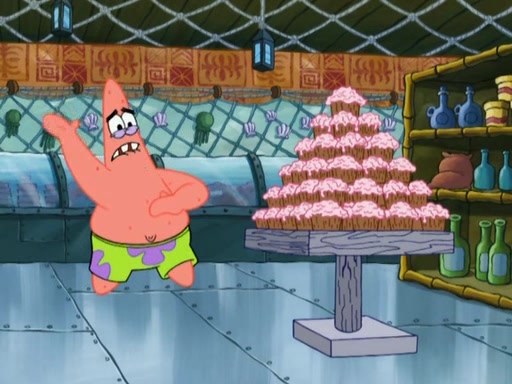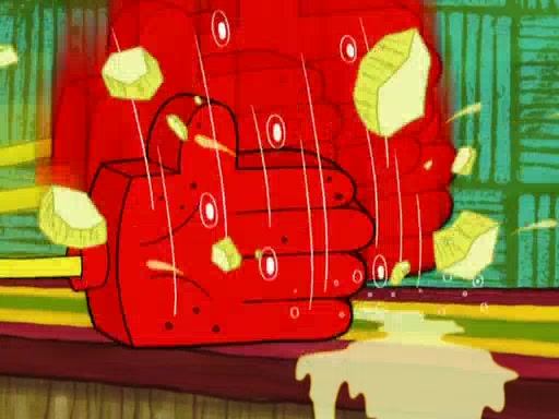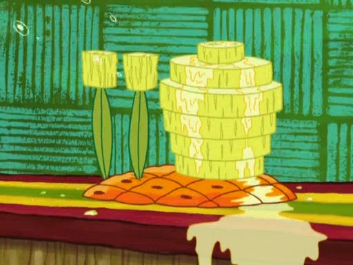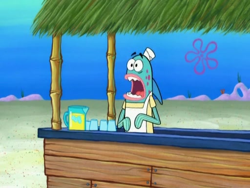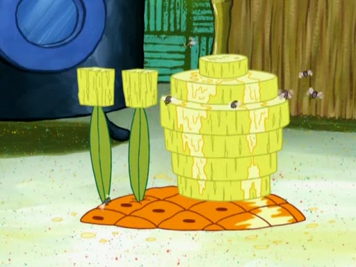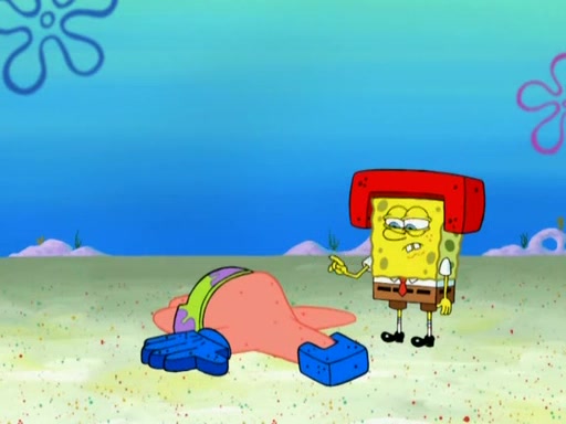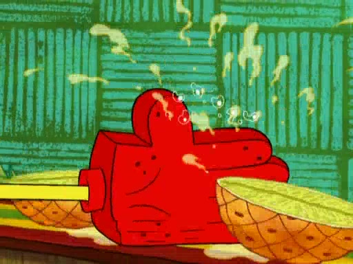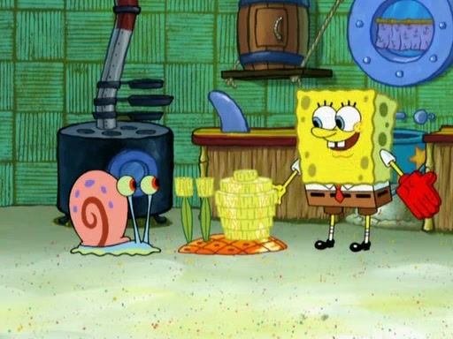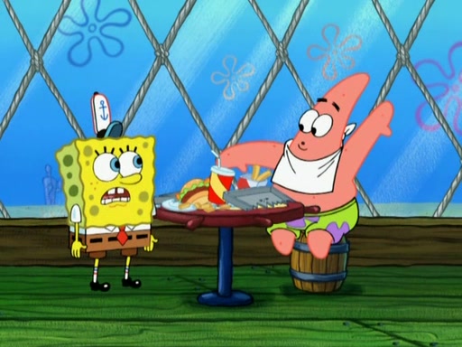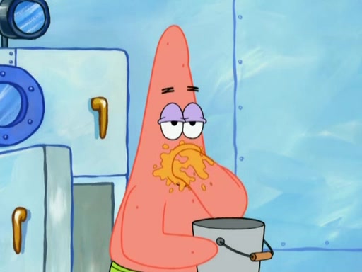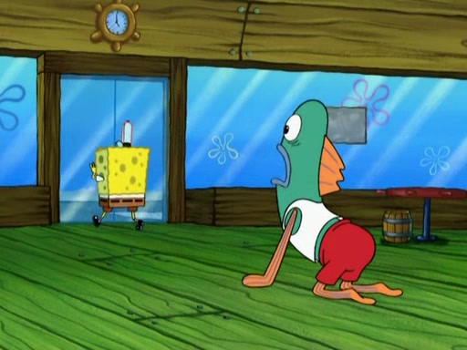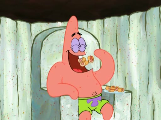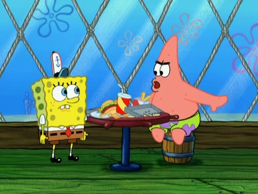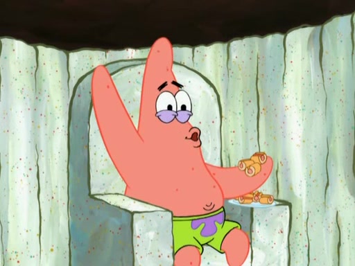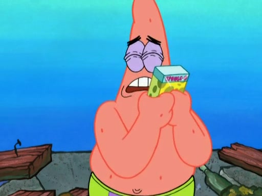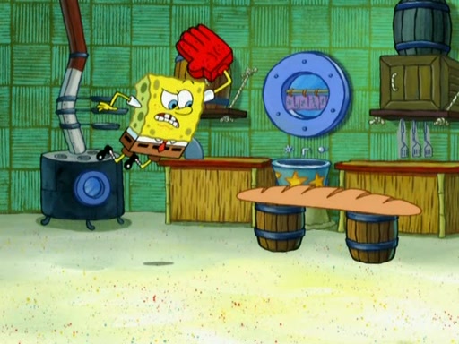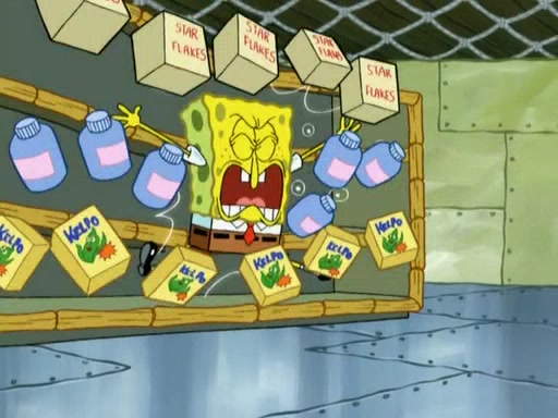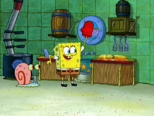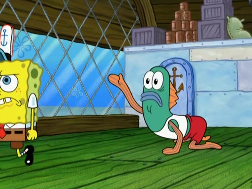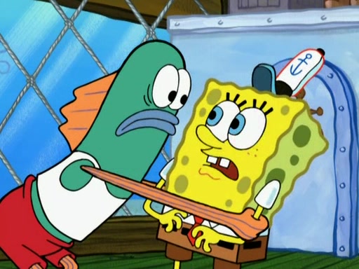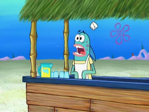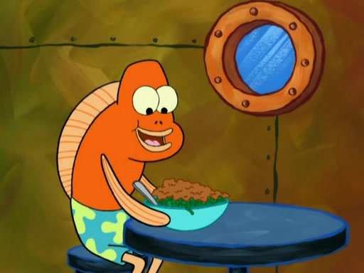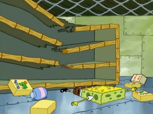 SpongeBob is in his kitchen, karate-chopping a pineapple to look like Gary. He puts it on the floor, so Gary is eye-level with it. It attracts flies and one flies into SpongeBob's mouth and he begins to choke. Patrick walks in and asks for some cheese before realizing SpongeBob's choking. Once it becomes clear to him, he punches SpongeBob. SpongeBob flies across the room and lands against the wall and the fly leaves his mouth. He offers anything in return and gives Patrick the cheese.