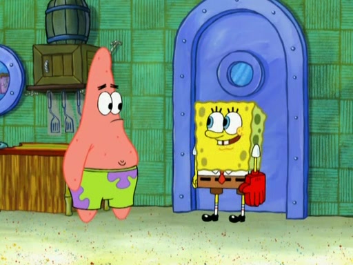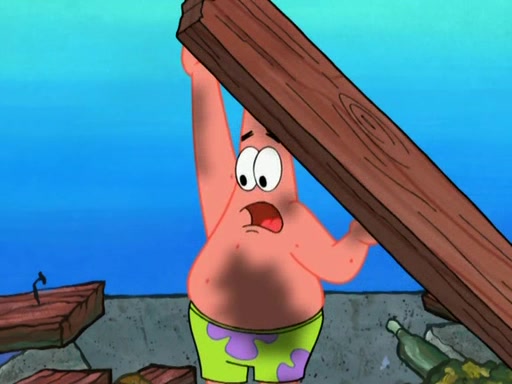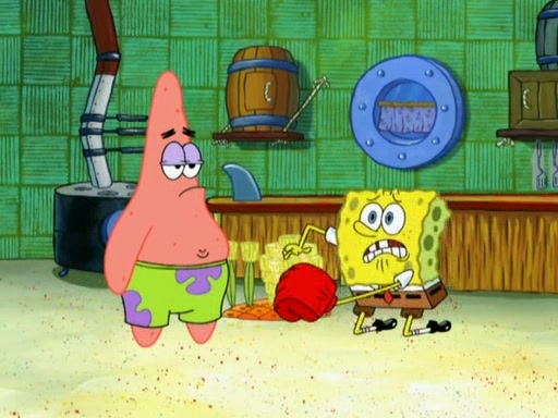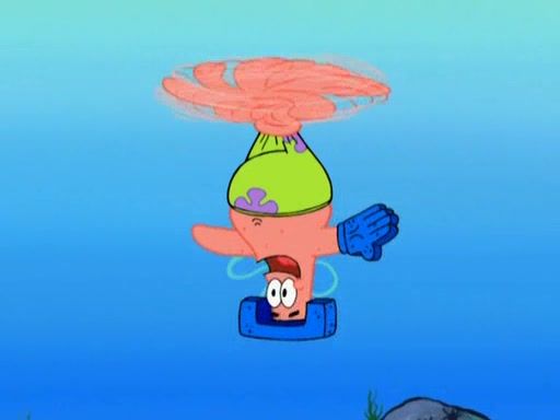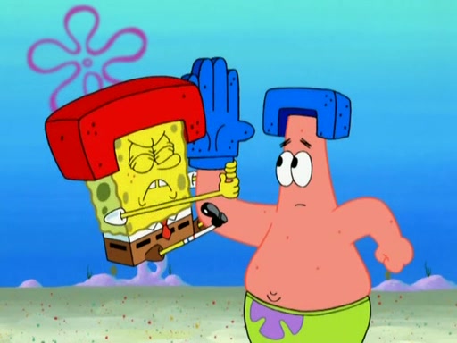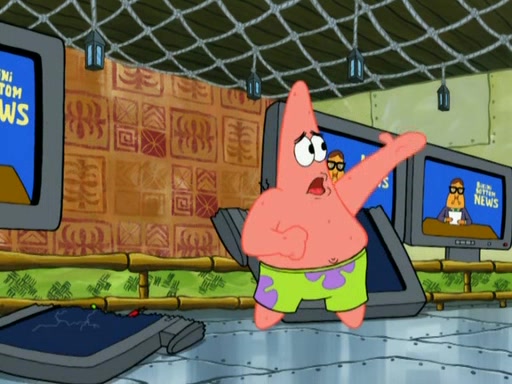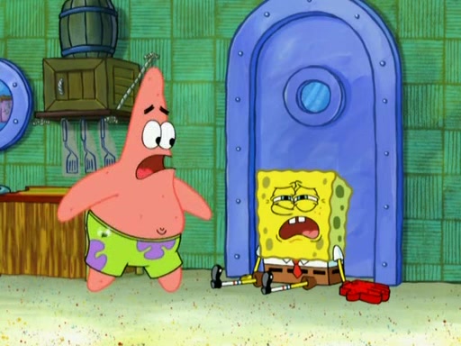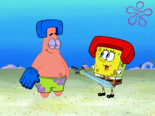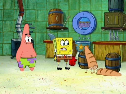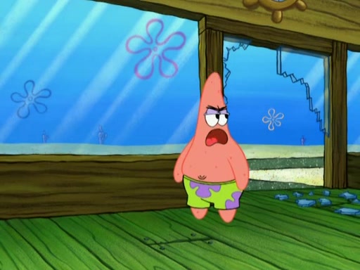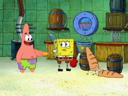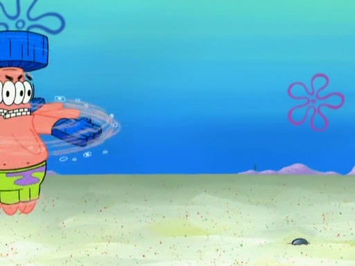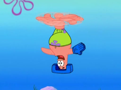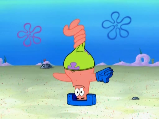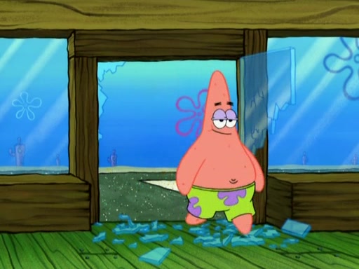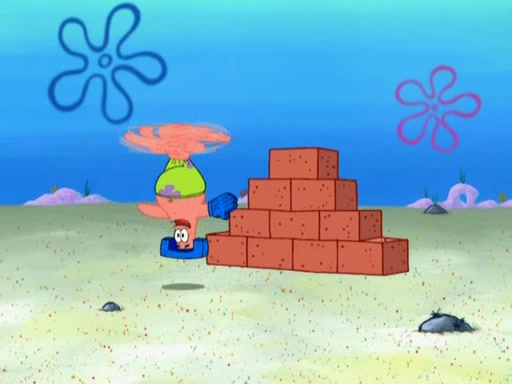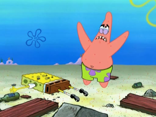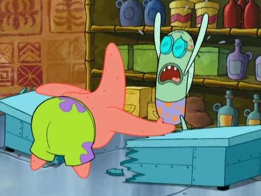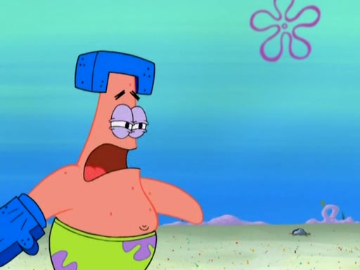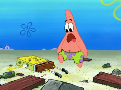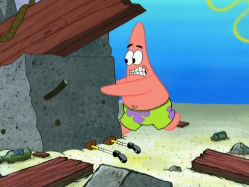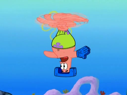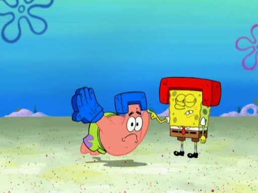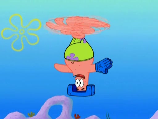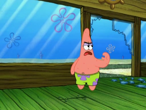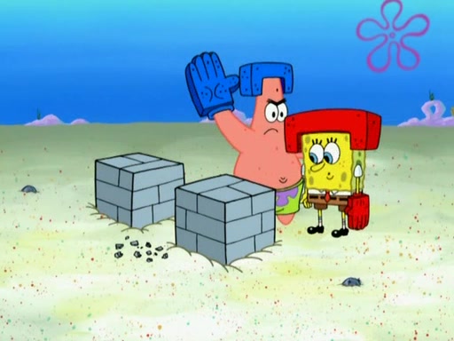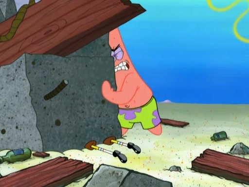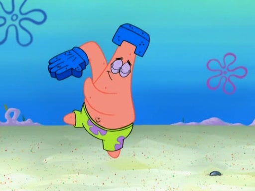 Patrick decides that he wants to learn Karate. SpongeBob is skeptical but gives in since that was the deal. He tries to teach Patrick the "reverse whirlpool," and then to fly into a brick wall and destroy it. Patrick succeeds in this but ends up unable to stop flying and destroys a lemonade stand. Next, SpongeBob tries to teach Patrick a move where he spins around on one foot. Patrick then starts spinning uncontrollably. SpongeBob gives up, and Patrick perfectly karate-chops a cinder block in half out of anger. He chops a steel sword and a boat as practice and then almost chops Baby Rechid. SpongeBob stops and warns him not to chop any living organisms or their property. He reminds him that "with power comes responsibility," but has to go to work and leaves Patrick, who starts chopping everything from arcade games to spinach.