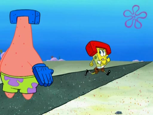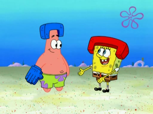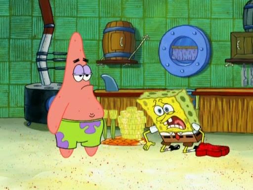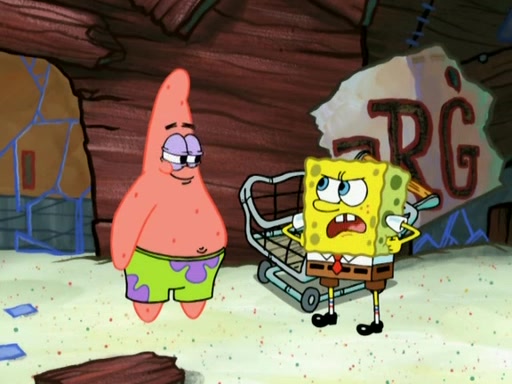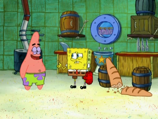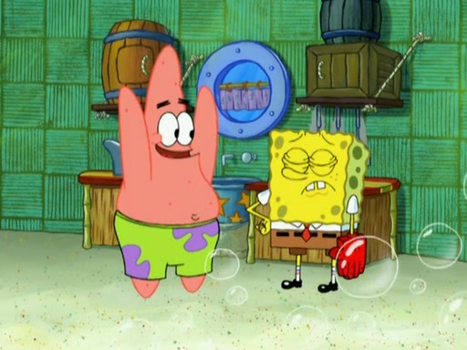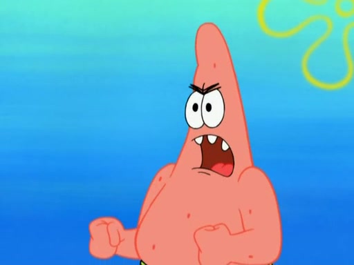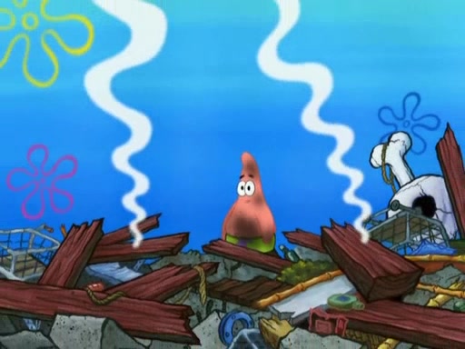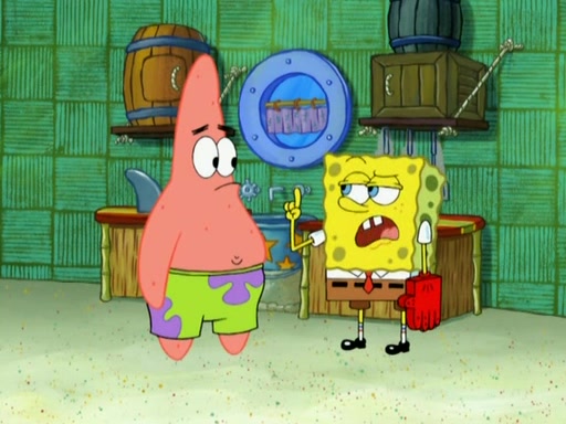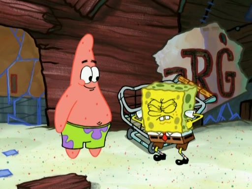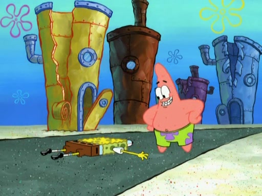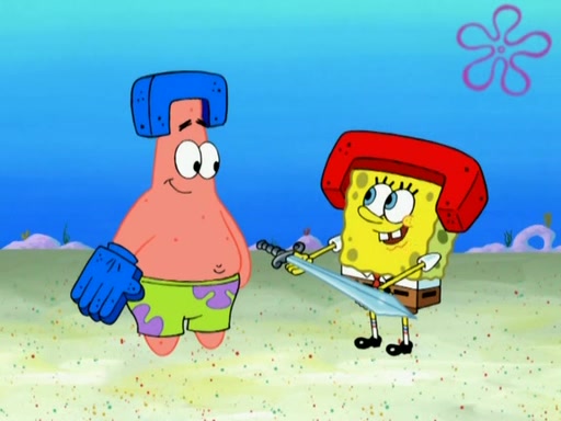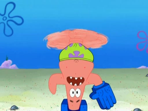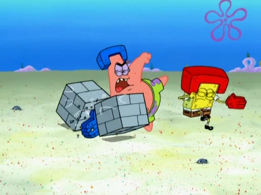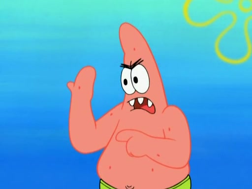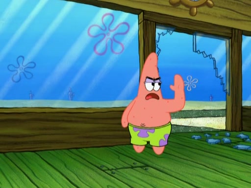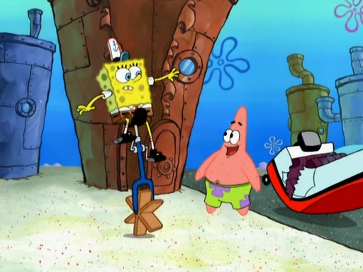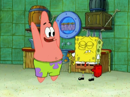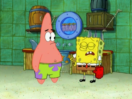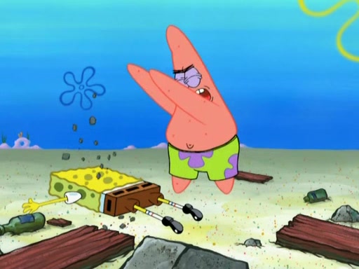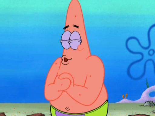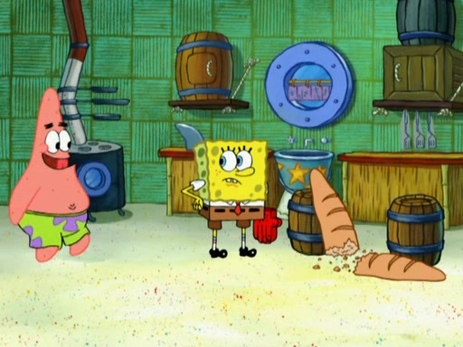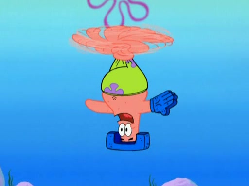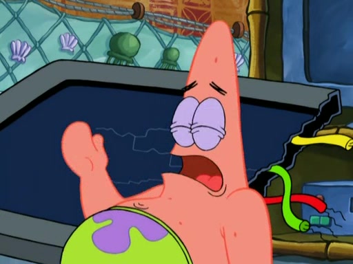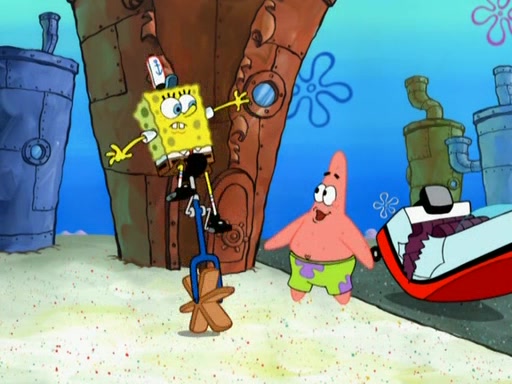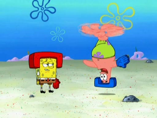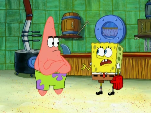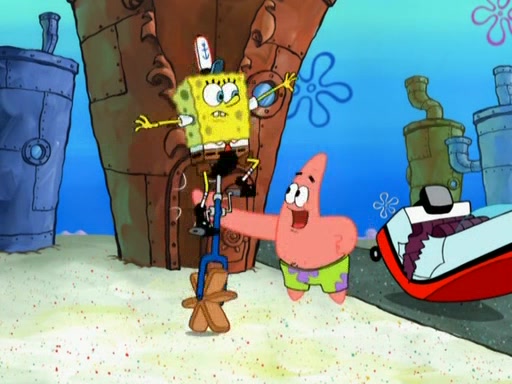 Patrick decides that he wants to learn Karate. SpongeBob is skeptical but gives in since that was the deal. He tries to teach Patrick the "reverse whirlpool," and then to fly into a brick wall and destroy it. Patrick succeeds in this but ends up unable to stop flying and destroys a lemonade stand. Next, SpongeBob tries to teach Patrick a move where he spins around on one foot. Patrick then starts spinning uncontrollably. SpongeBob gives up, and Patrick perfectly karate-chops a cinder block in half out of anger. He chops a steel sword and a boat as practice and then almost chops Baby Rechid. SpongeBob stops and warns him not to chop any living organisms or their property. He reminds him that "with power comes responsibility," but has to go to work and leaves Patrick, who starts chopping everything from arcade games to spinach.