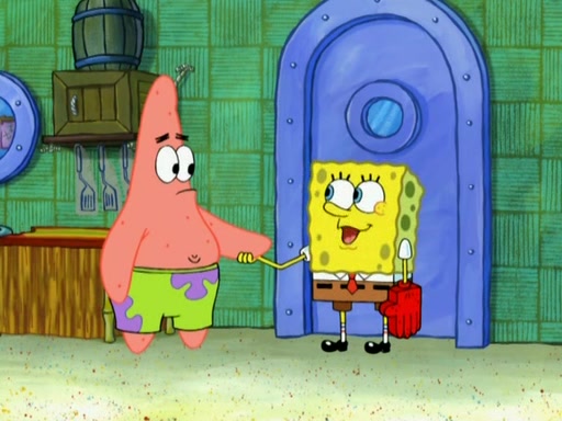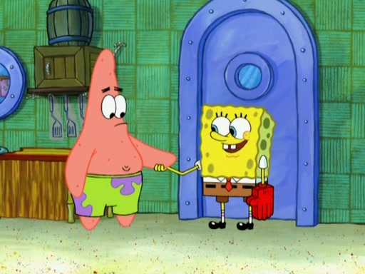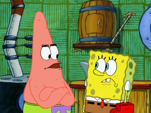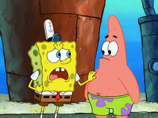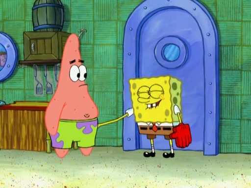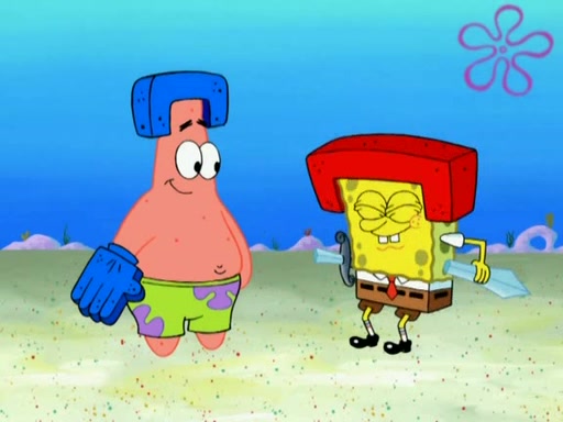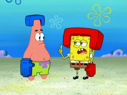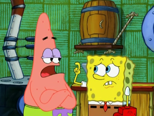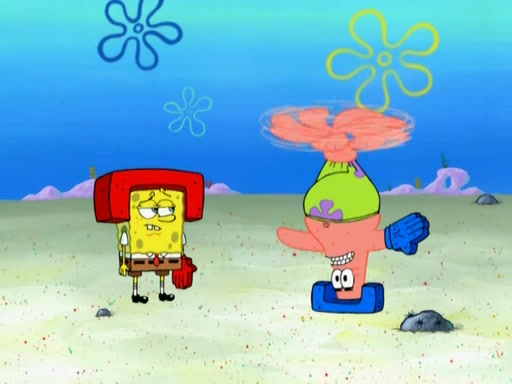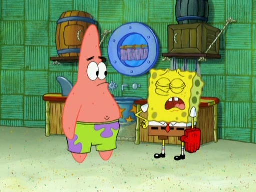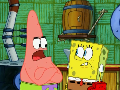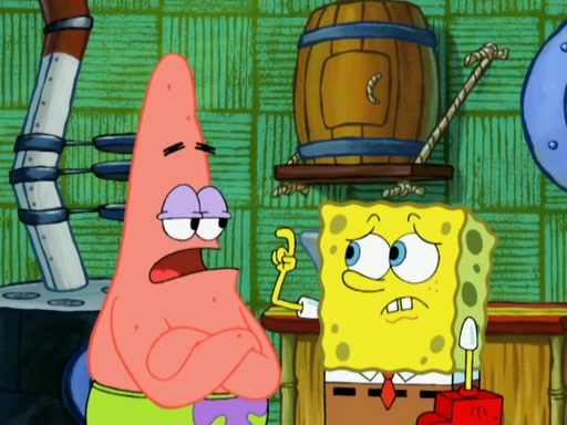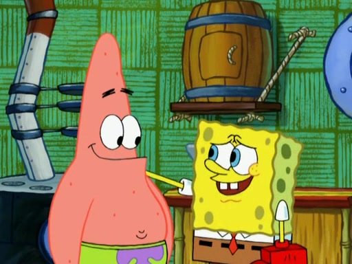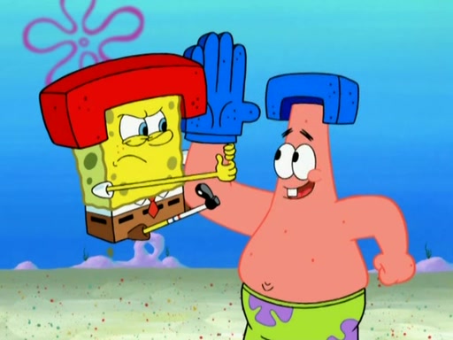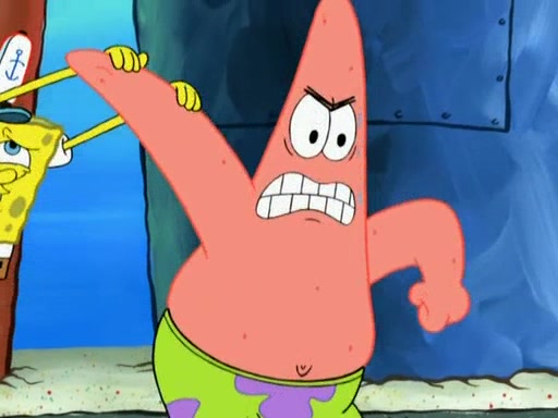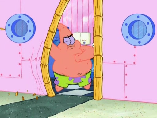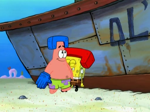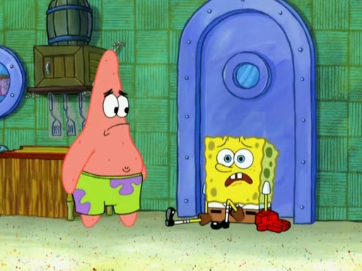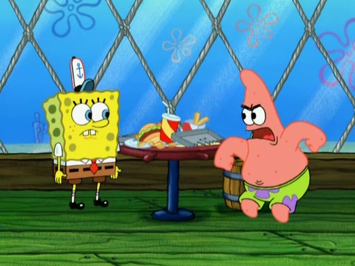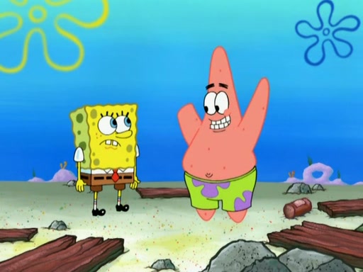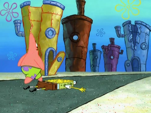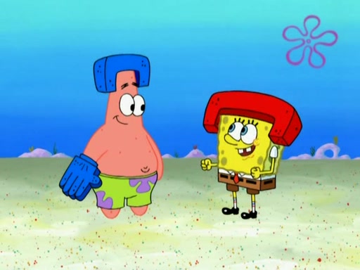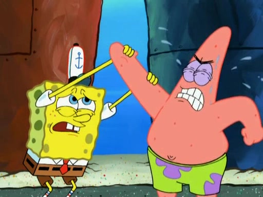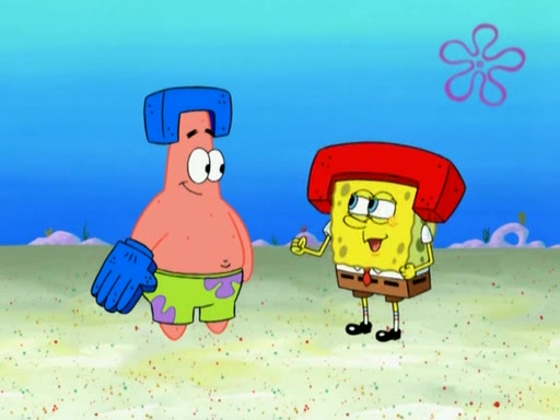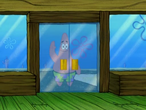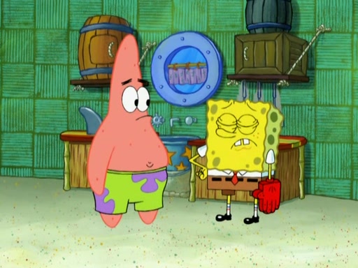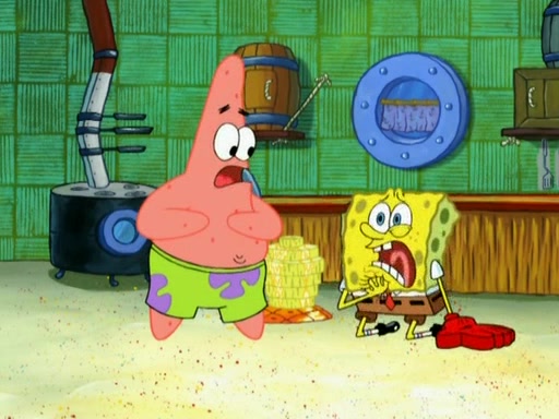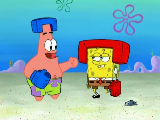 Patrick decides that he wants to learn Karate. SpongeBob is skeptical but gives in since that was the deal. He tries to teach Patrick the "reverse whirlpool," and then to fly into a brick wall and destroy it. Patrick succeeds in this but ends up unable to stop flying and destroys a lemonade stand. Next, SpongeBob tries to teach Patrick a move where he spins around on one foot. Patrick then starts spinning uncontrollably. SpongeBob gives up, and Patrick perfectly karate-chops a cinder block in half out of anger. He chops a steel sword and a boat as practice and then almost chops Baby Rechid. SpongeBob stops and warns him not to chop any living organisms or their property. He reminds him that "with power comes responsibility," but has to go to work and leaves Patrick, who starts chopping everything from arcade games to spinach.