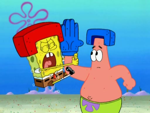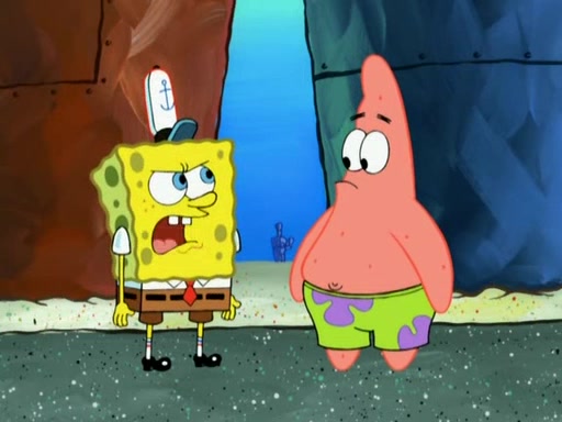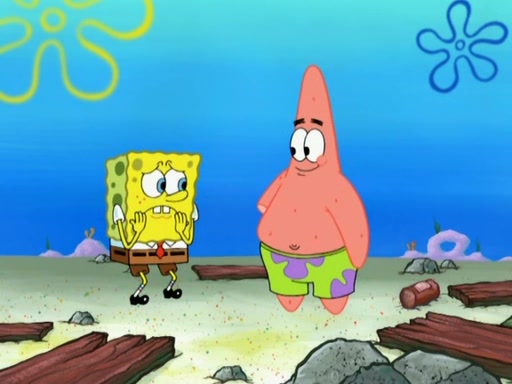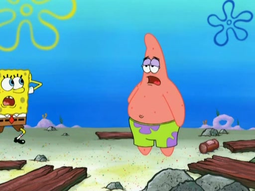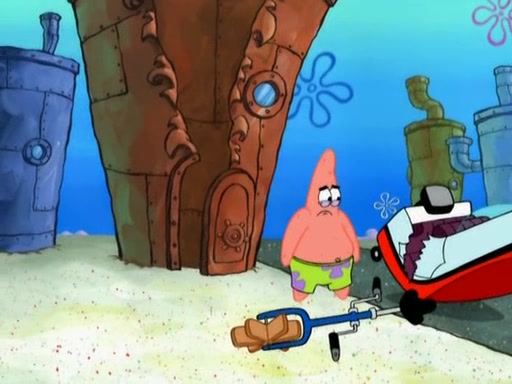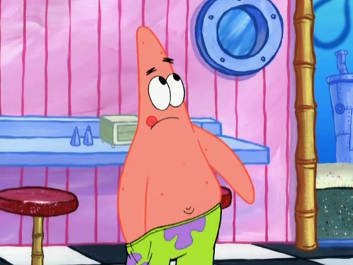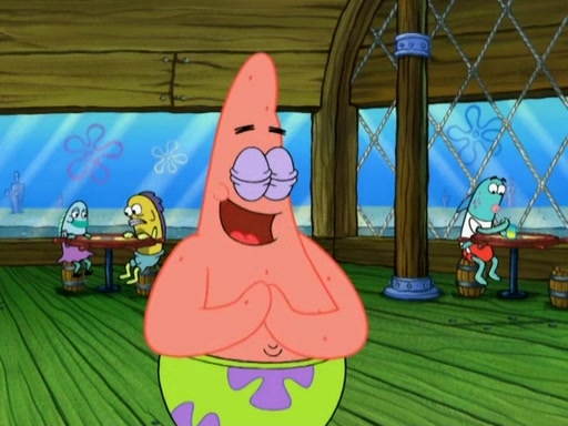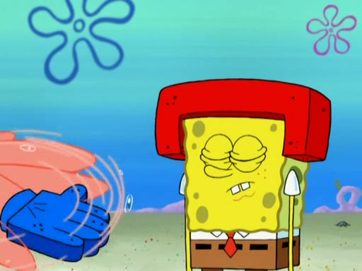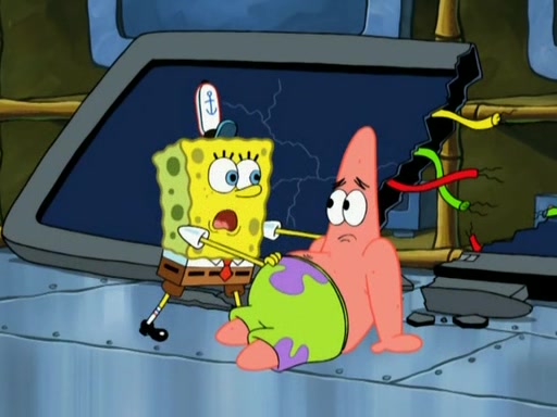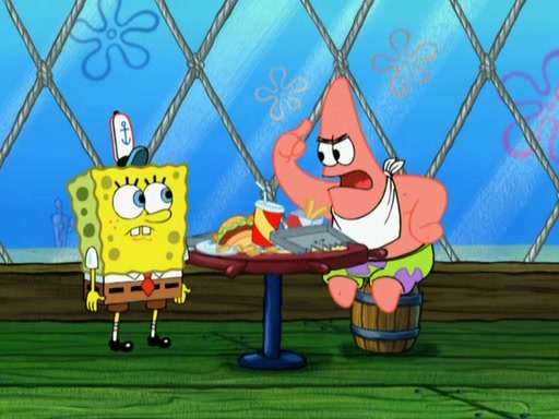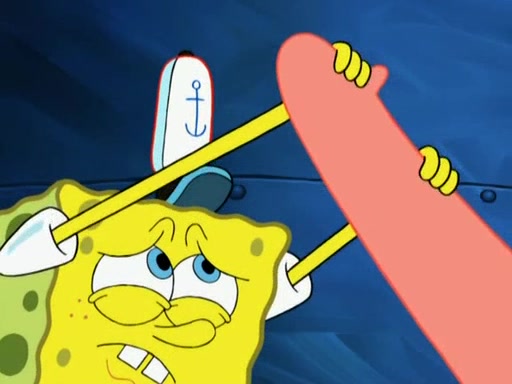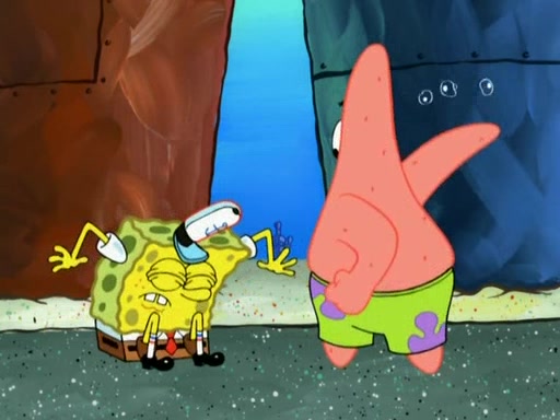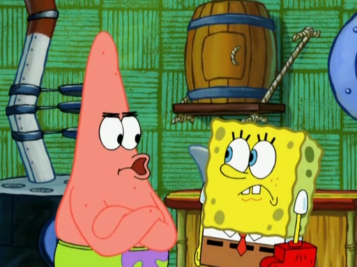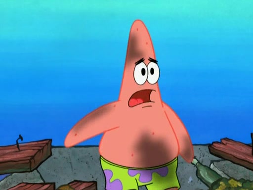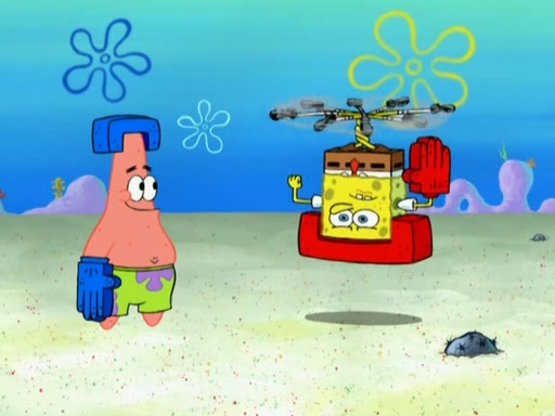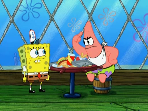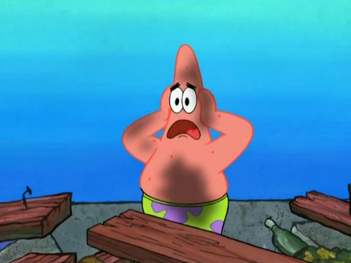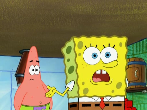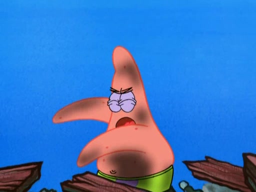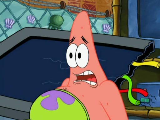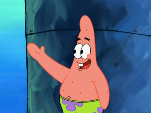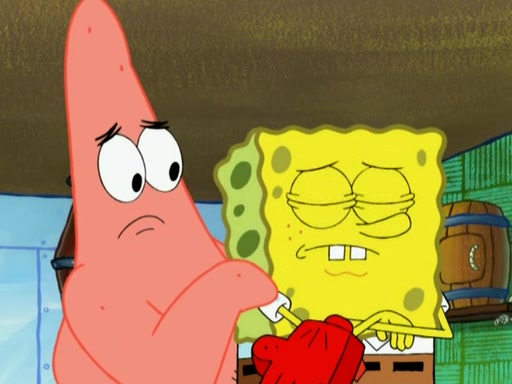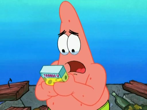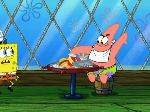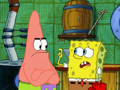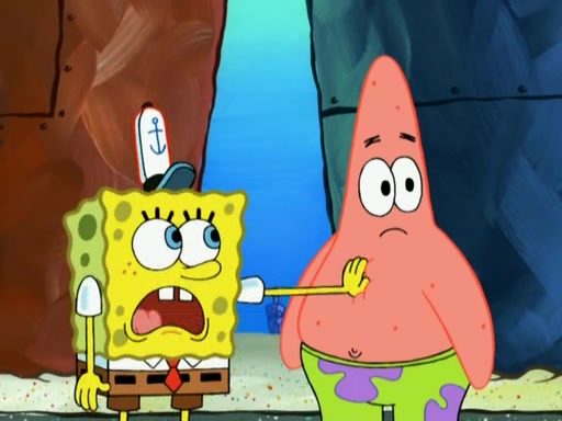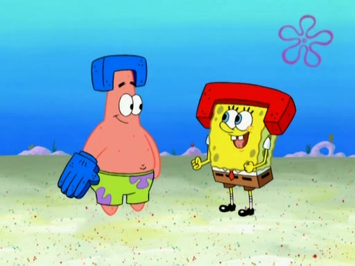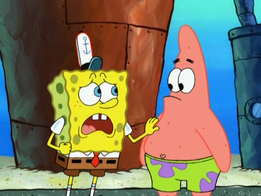 Patrick decides that he wants to learn Karate. SpongeBob is skeptical but gives in since that was the deal. He tries to teach Patrick the "reverse whirlpool," and then to fly into a brick wall and destroy it. Patrick succeeds in this but ends up unable to stop flying and destroys a lemonade stand. Next, SpongeBob tries to teach Patrick a move where he spins around on one foot. Patrick then starts spinning uncontrollably. SpongeBob gives up, and Patrick perfectly karate-chops a cinder block in half out of anger. He chops a steel sword and a boat as practice and then almost chops Baby Rechid. SpongeBob stops and warns him not to chop any living organisms or their property. He reminds him that "with power comes responsibility," but has to go to work and leaves Patrick, who starts chopping everything from arcade games to spinach.