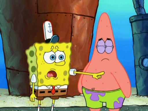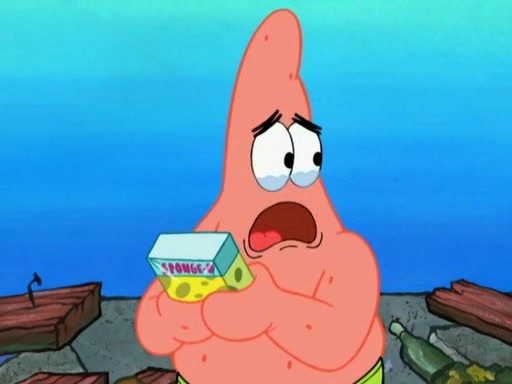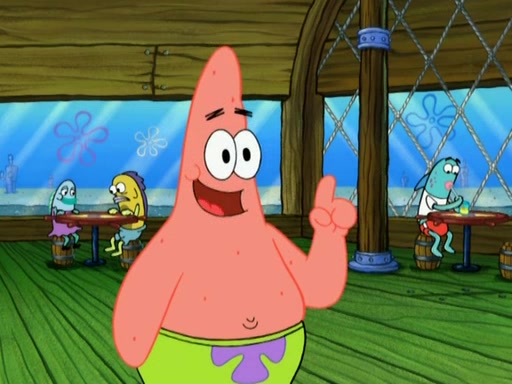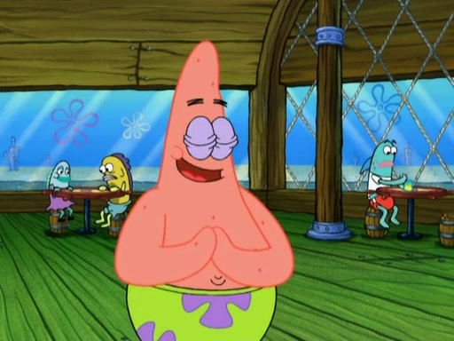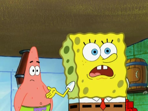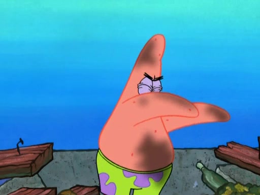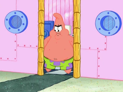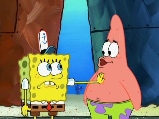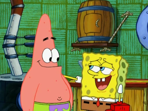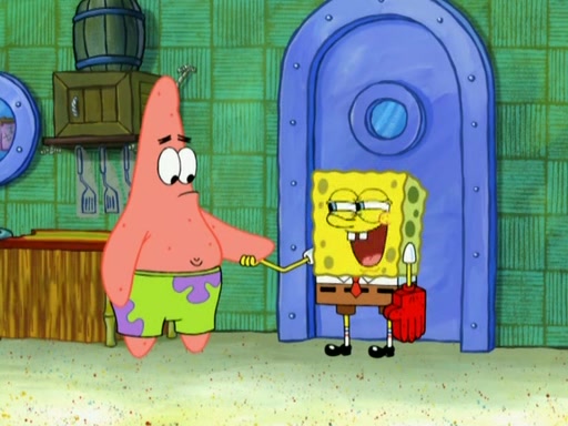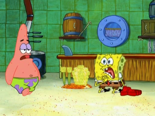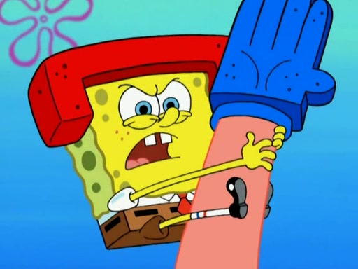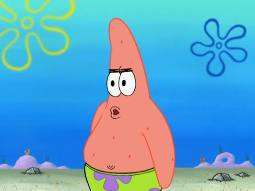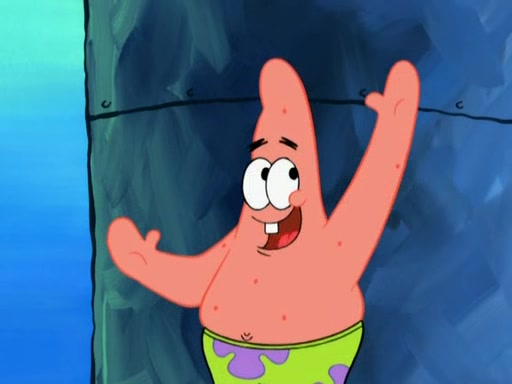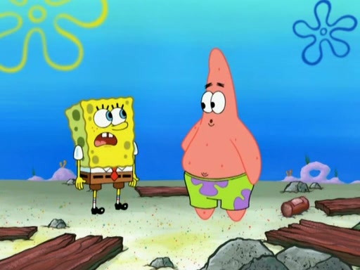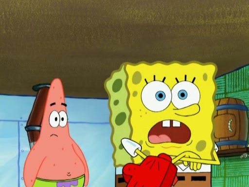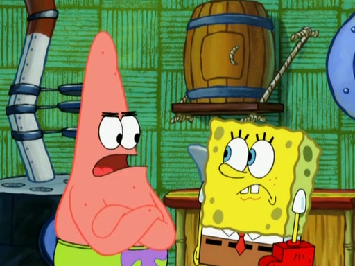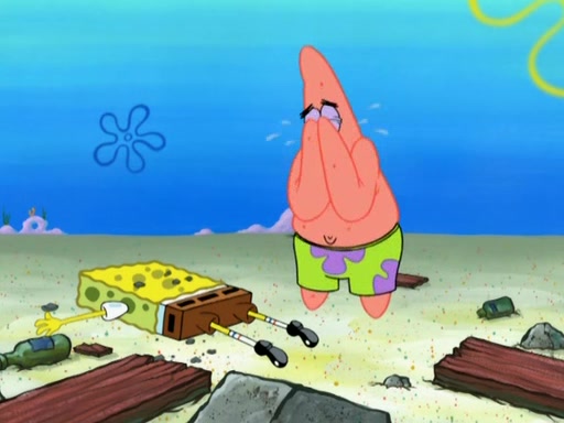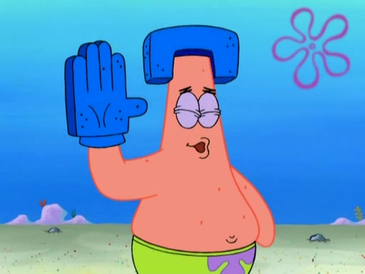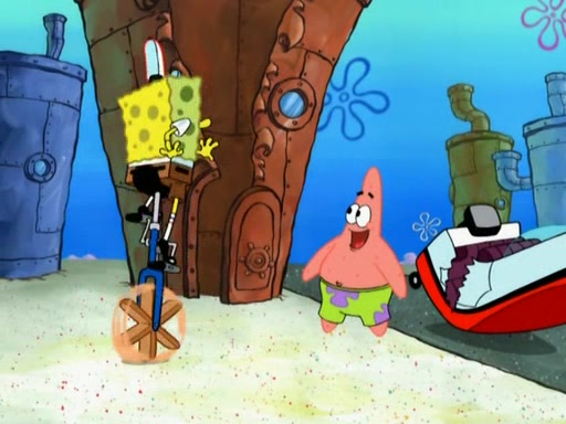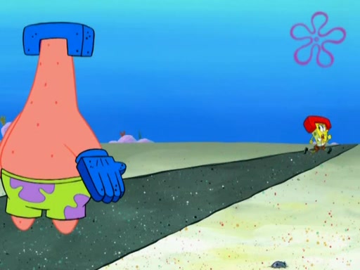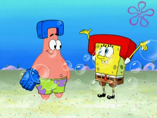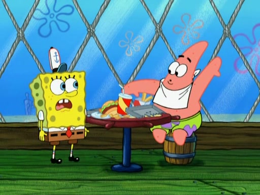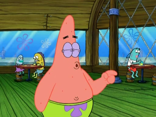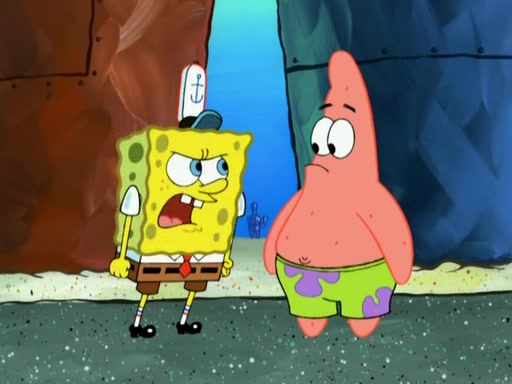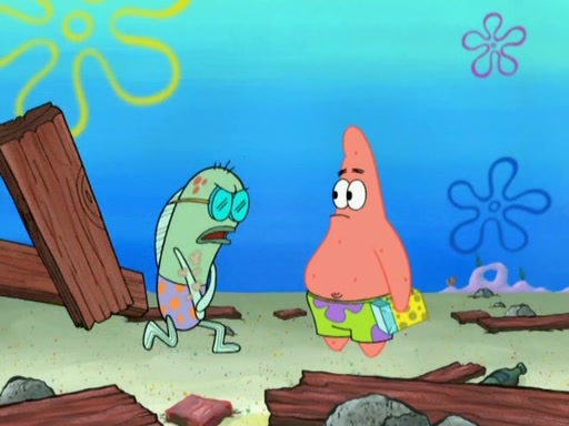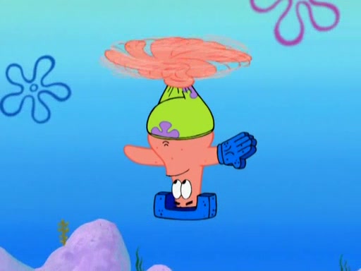 Patrick decides that he wants to learn Karate. SpongeBob is skeptical but gives in since that was the deal. He tries to teach Patrick the "reverse whirlpool," and then to fly into a brick wall and destroy it. Patrick succeeds in this but ends up unable to stop flying and destroys a lemonade stand. Next, SpongeBob tries to teach Patrick a move where he spins around on one foot. Patrick then starts spinning uncontrollably. SpongeBob gives up, and Patrick perfectly karate-chops a cinder block in half out of anger. He chops a steel sword and a boat as practice and then almost chops Baby Rechid. SpongeBob stops and warns him not to chop any living organisms or their property. He reminds him that "with power comes responsibility," but has to go to work and leaves Patrick, who starts chopping everything from arcade games to spinach.