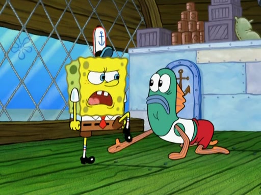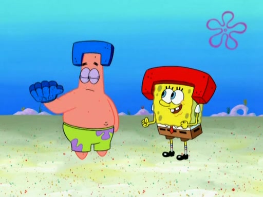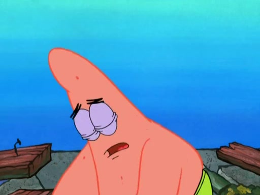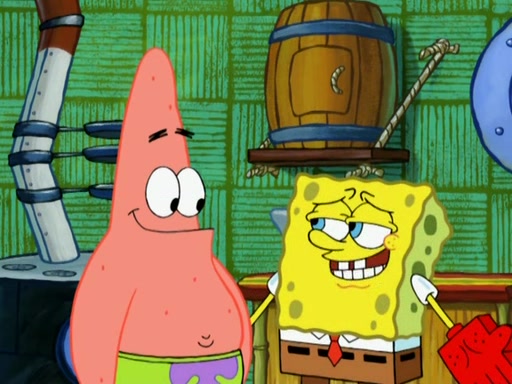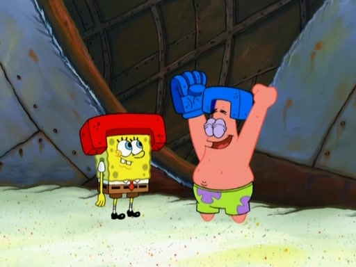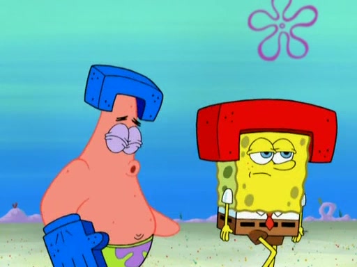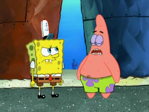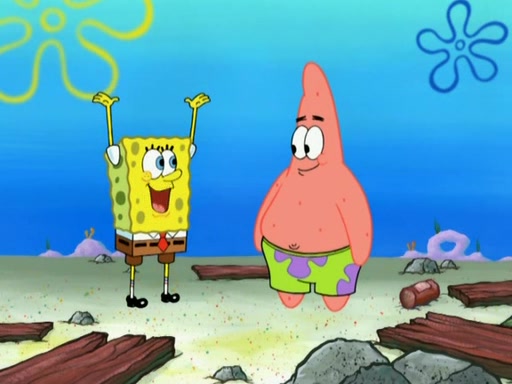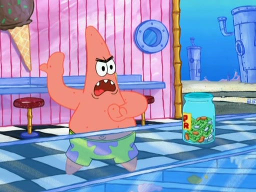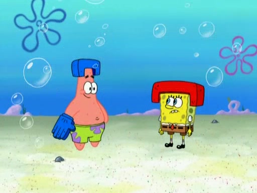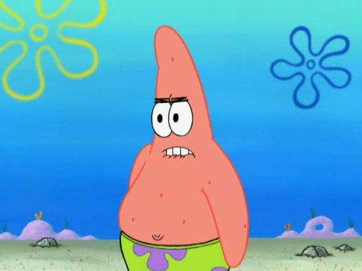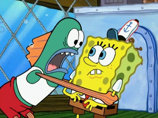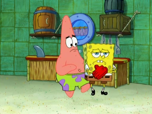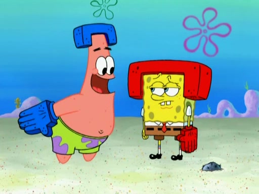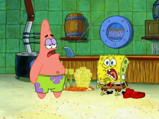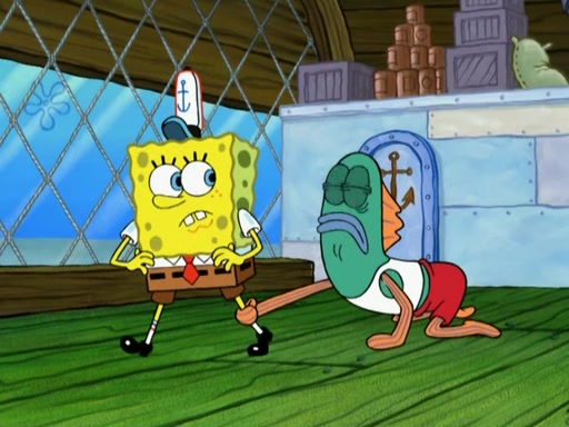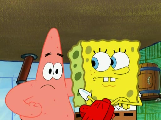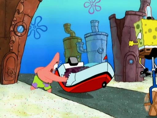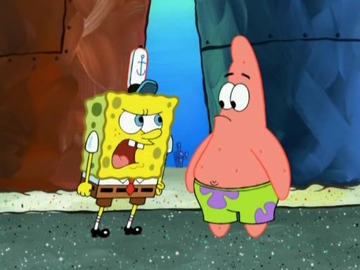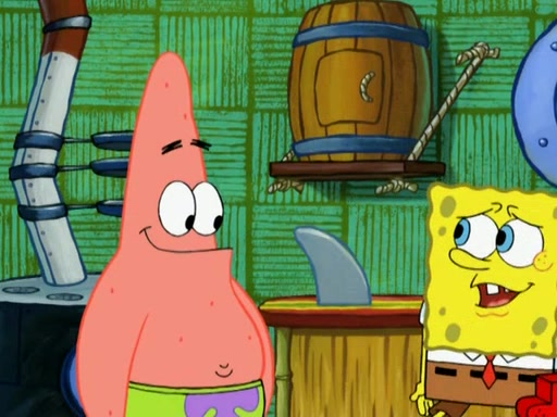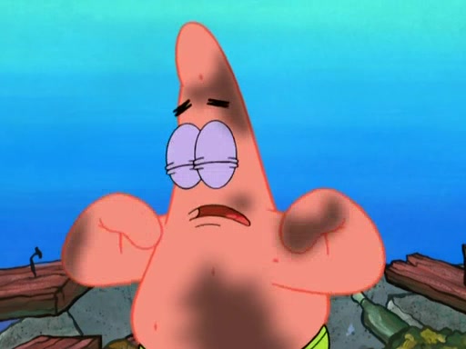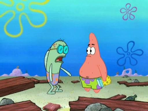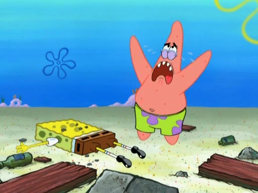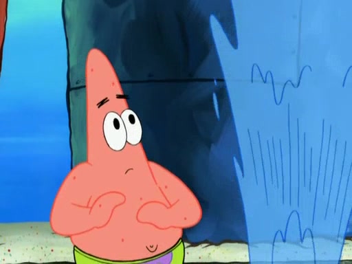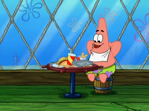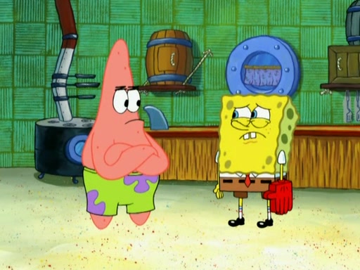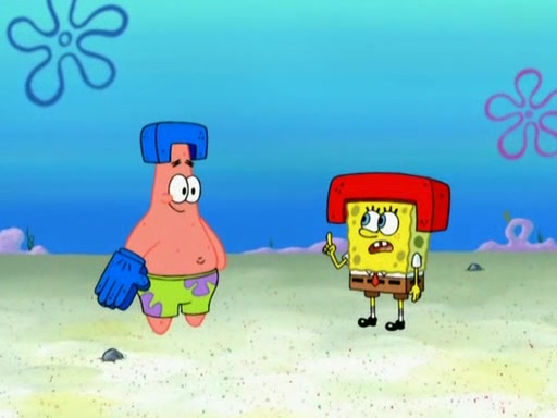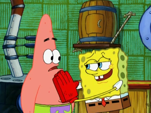 Patrick decides that he wants to learn Karate. SpongeBob is skeptical but gives in since that was the deal. He tries to teach Patrick the "reverse whirlpool," and then to fly into a brick wall and destroy it. Patrick succeeds in this but ends up unable to stop flying and destroys a lemonade stand. Next, SpongeBob tries to teach Patrick a move where he spins around on one foot. Patrick then starts spinning uncontrollably. SpongeBob gives up, and Patrick perfectly karate-chops a cinder block in half out of anger. He chops a steel sword and a boat as practice and then almost chops Baby Rechid. SpongeBob stops and warns him not to chop any living organisms or their property. He reminds him that "with power comes responsibility," but has to go to work and leaves Patrick, who starts chopping everything from arcade games to spinach.