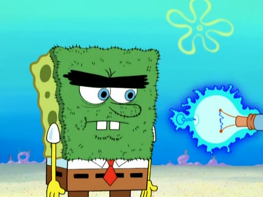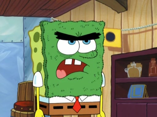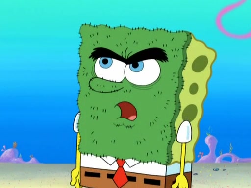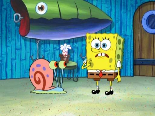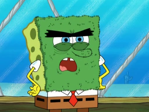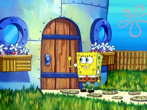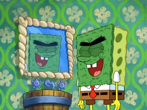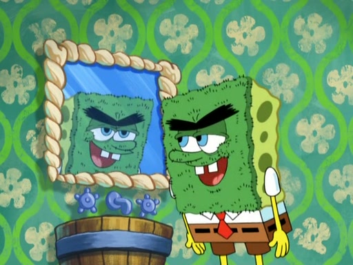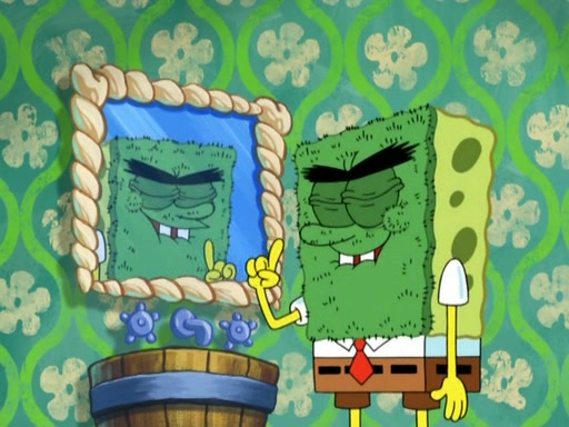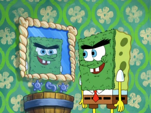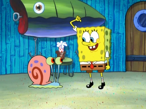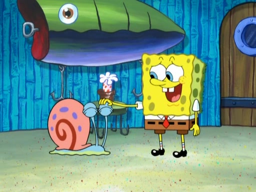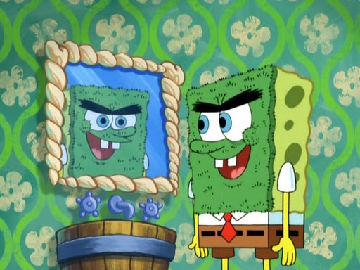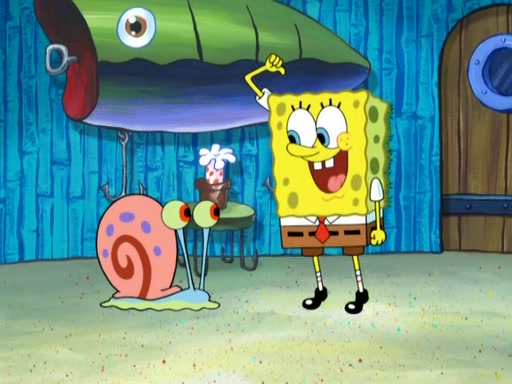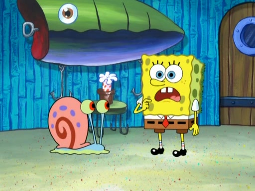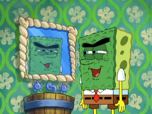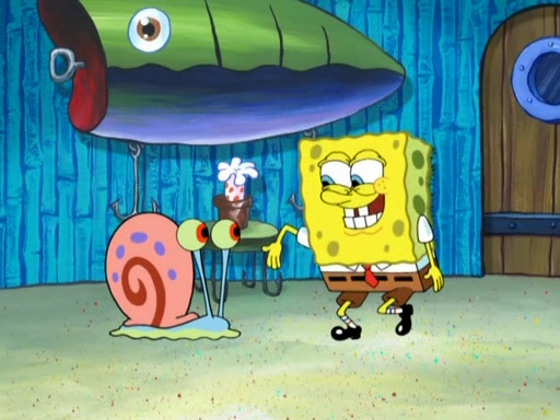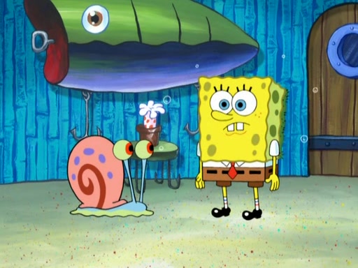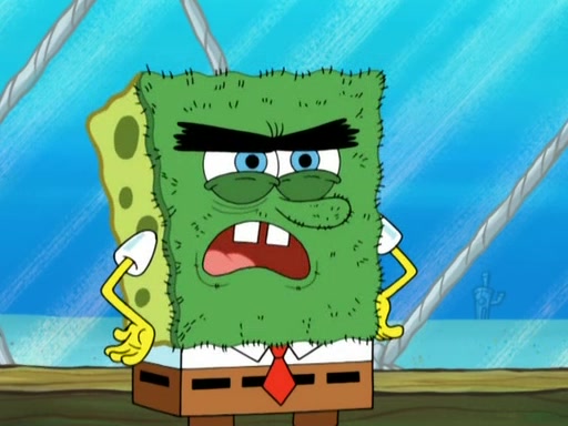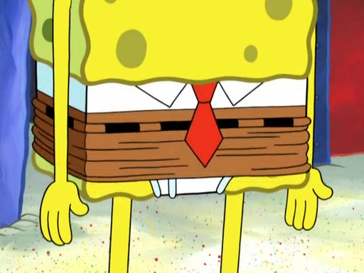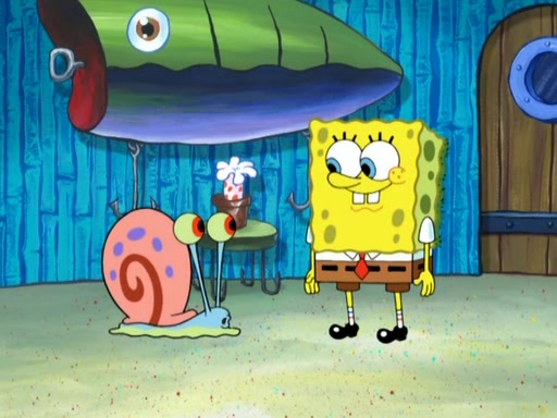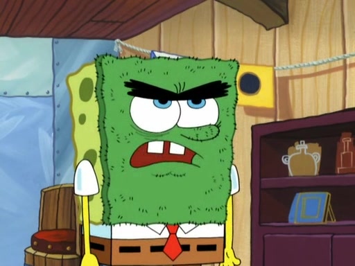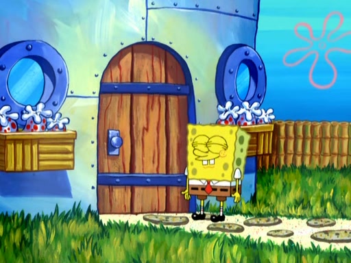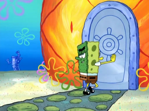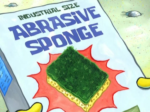 Later, he is shown at his house crying to Gary about how he can't say no to anything anyone asks him. Gary then goes to a catalog and orders something for SpongeBob, it arrives and it shows that the package was a thing called 'abrasive sponge" which is an abrasive side designed for doormat sponges to stick on their back, and the abrasive side will help them be more touch. SpongeBob feels this is perfect for his situation, so he sticks it on his back. The abrasive side makes a cruel remark at Gary which SpongeBob is unaware of, so he happily tells Gary he'll see him later.