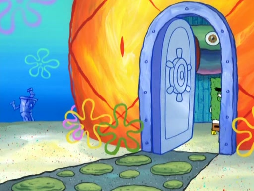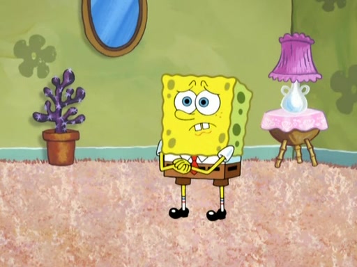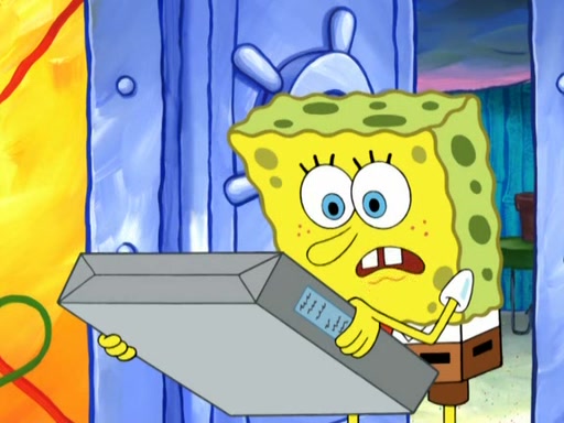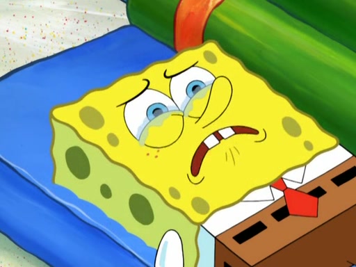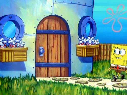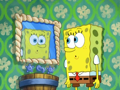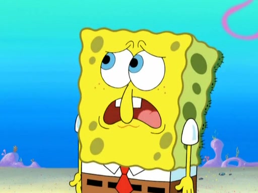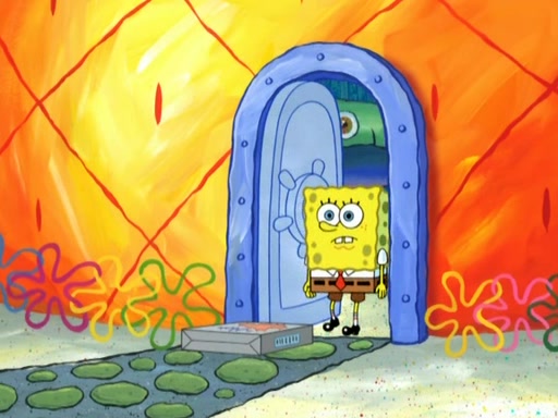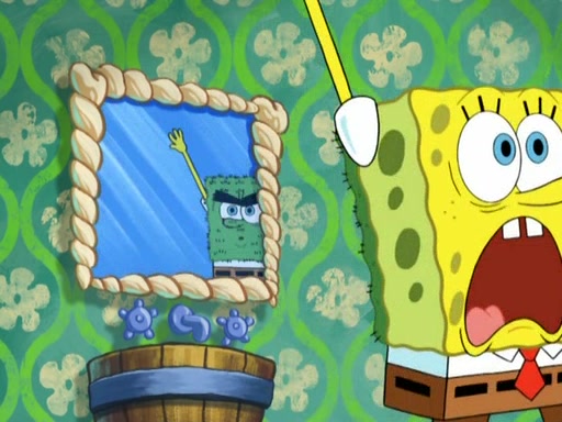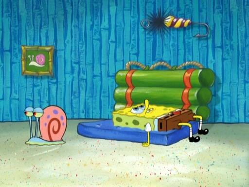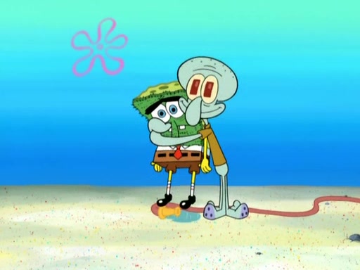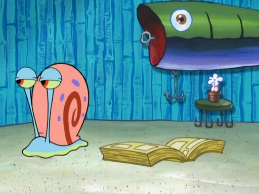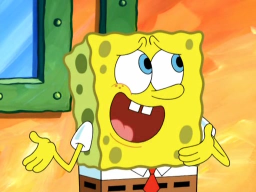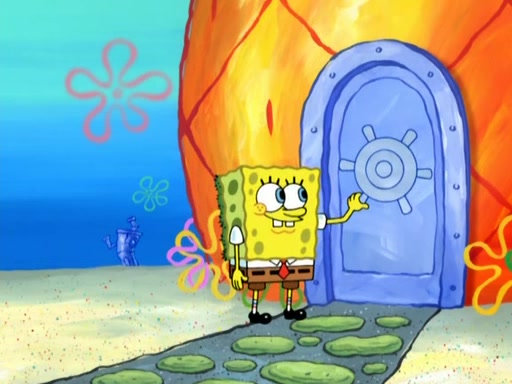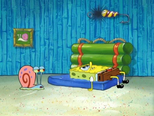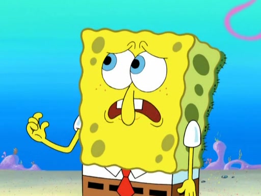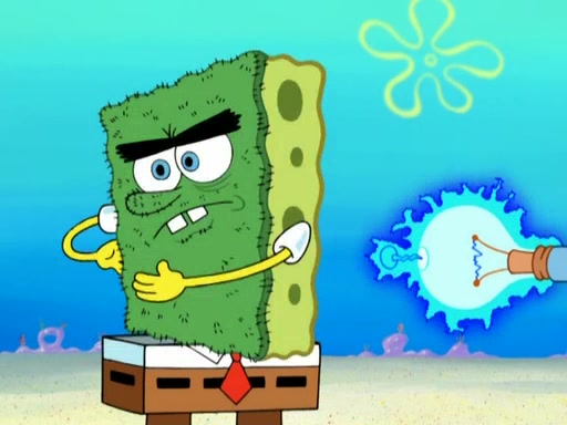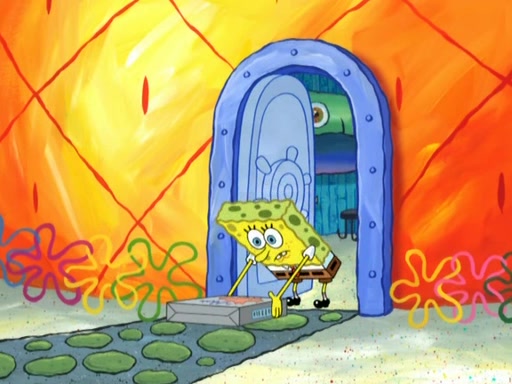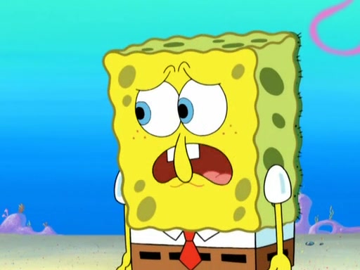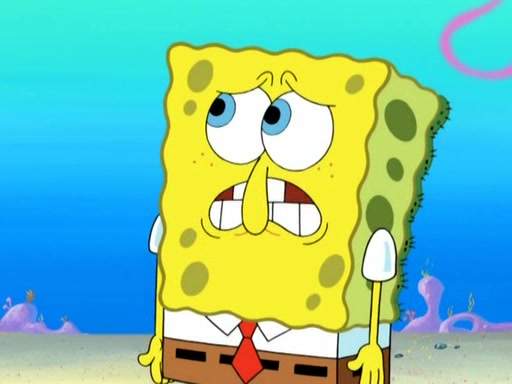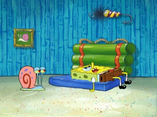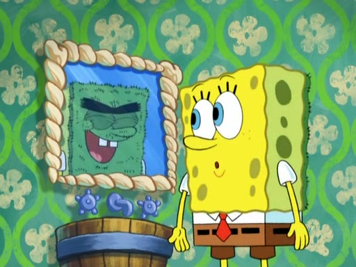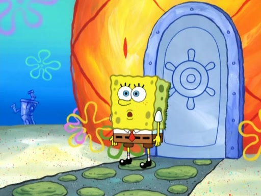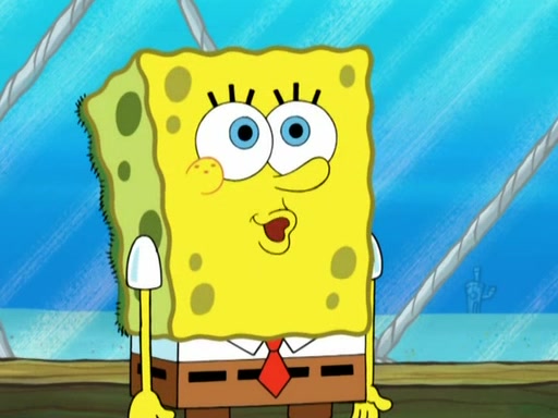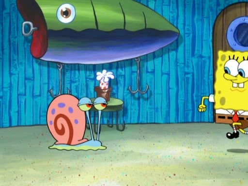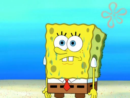 Later, he is shown at his house crying to Gary about how he can't say no to anything anyone asks him. Gary then goes to a catalog and orders something for SpongeBob, it arrives and it shows that the package was a thing called 'abrasive sponge" which is an abrasive side designed for doormat sponges to stick on their back, and the abrasive side will help them be more touch. SpongeBob feels this is perfect for his situation, so he sticks it on his back. The abrasive side makes a cruel remark at Gary which SpongeBob is unaware of, so he happily tells Gary he'll see him later.