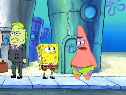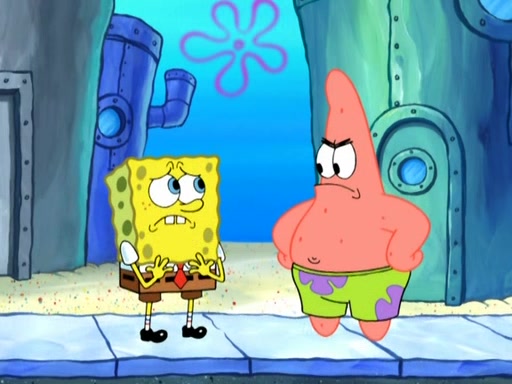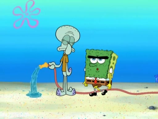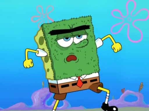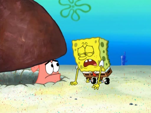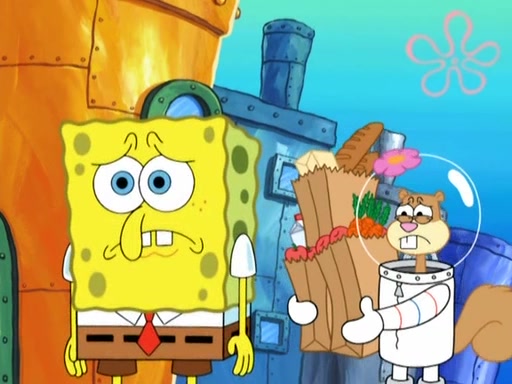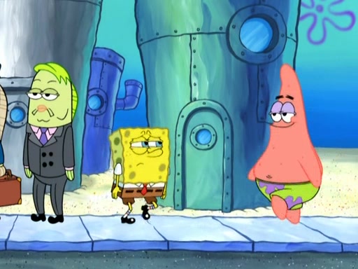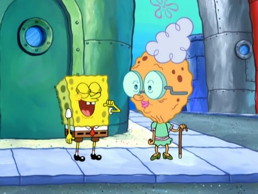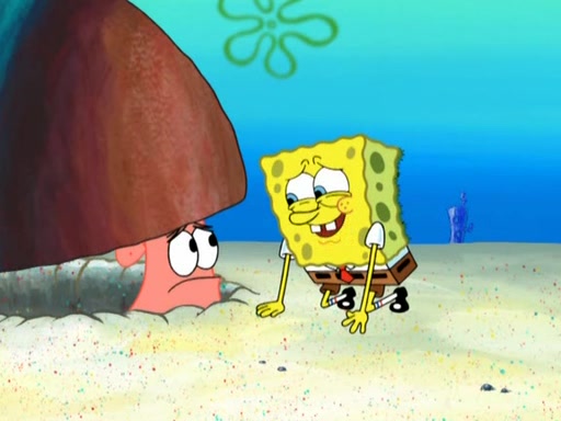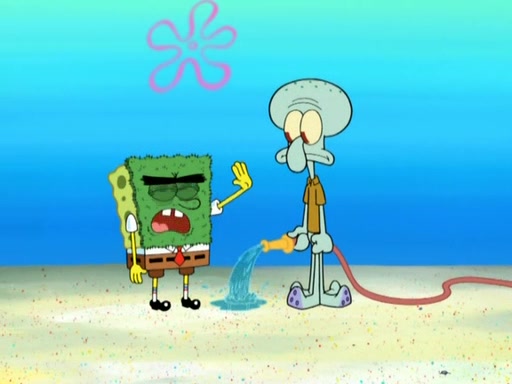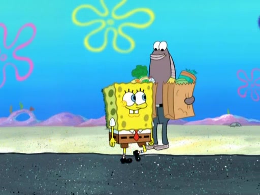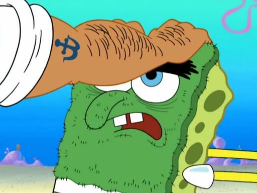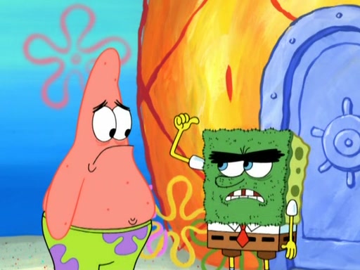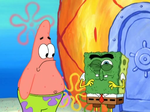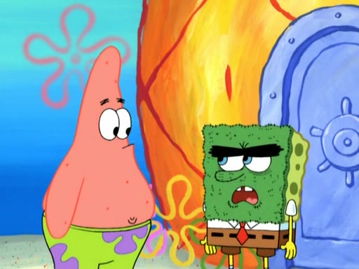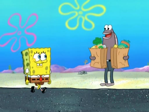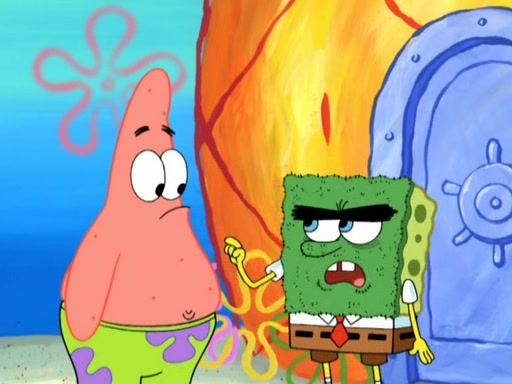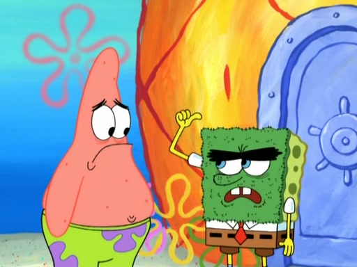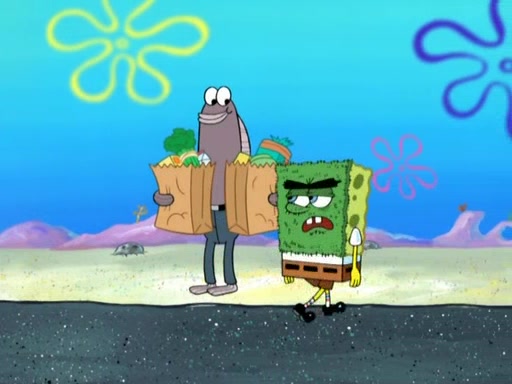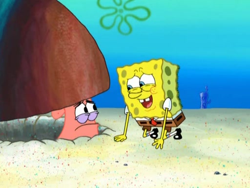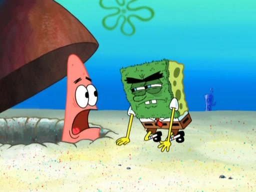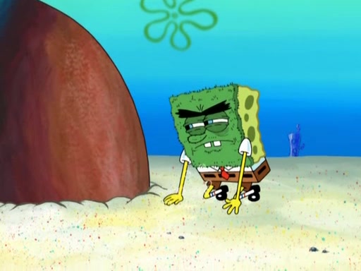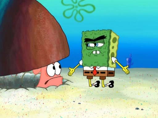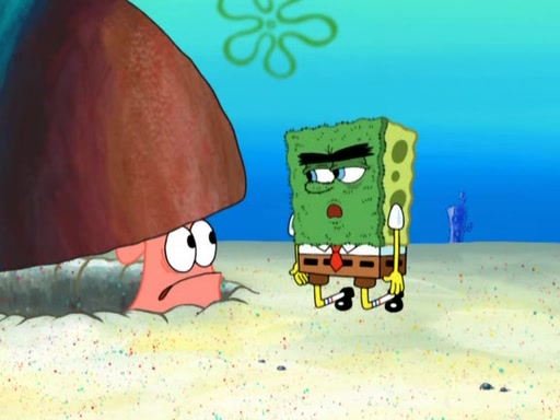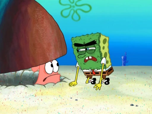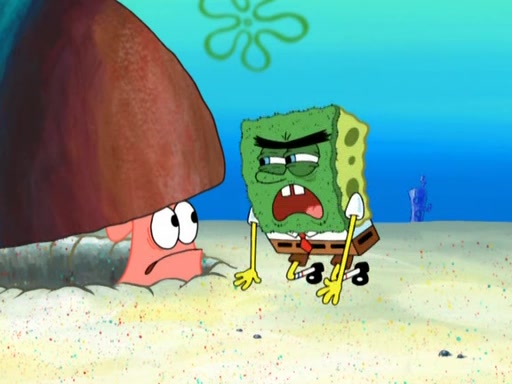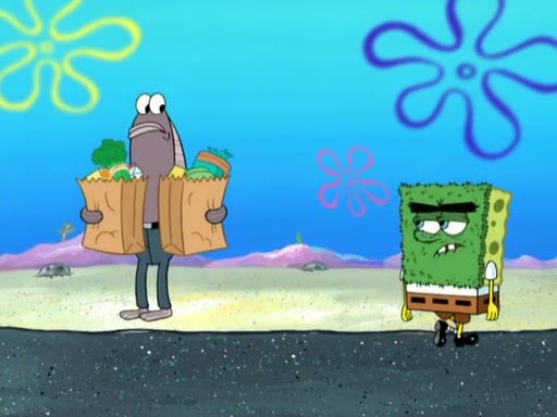 He goes out and Pilar asks him to carry his groceries for him. His body switches 180 degrees, showing the abrasive side, and says "Carry it yourself, fish-face" for SpongeBob. He does the same for Larry who asked him to help him put sun lotion on, Grandma who asked for help crossing the street, and Sandy who asked him to help her with a science invention. All of them getting harsh words thrown at them from SpongeBob's abrasive side leave, either baffled, hurt, or in Sandy's case, baffled, hurt, and physically damaged.